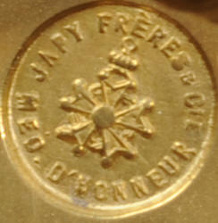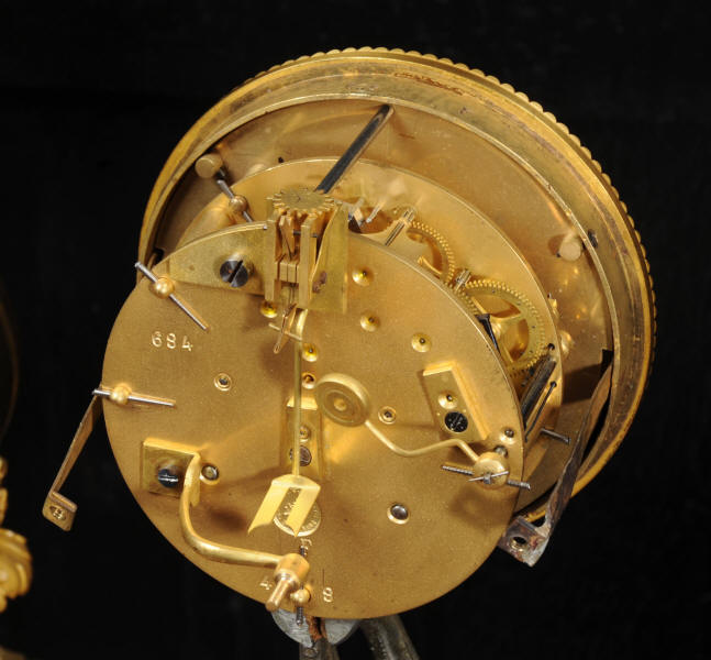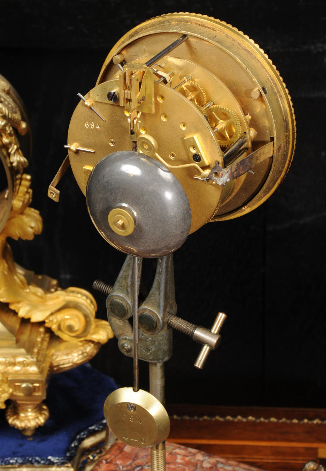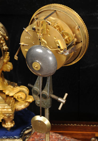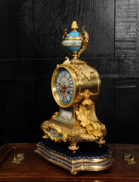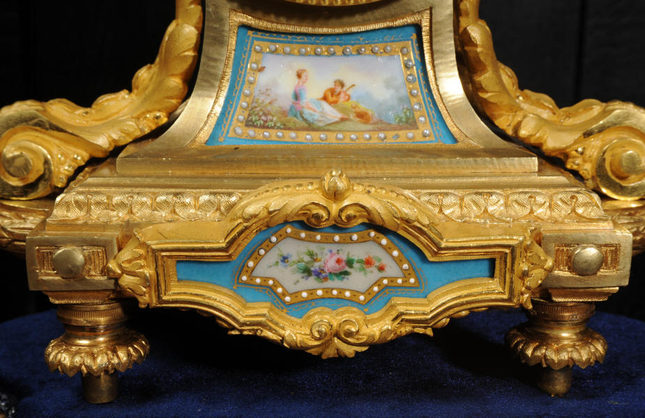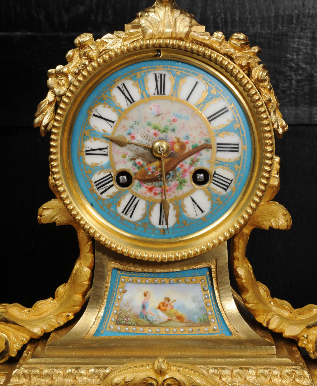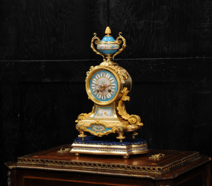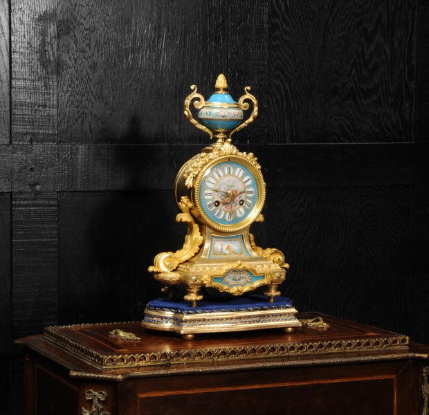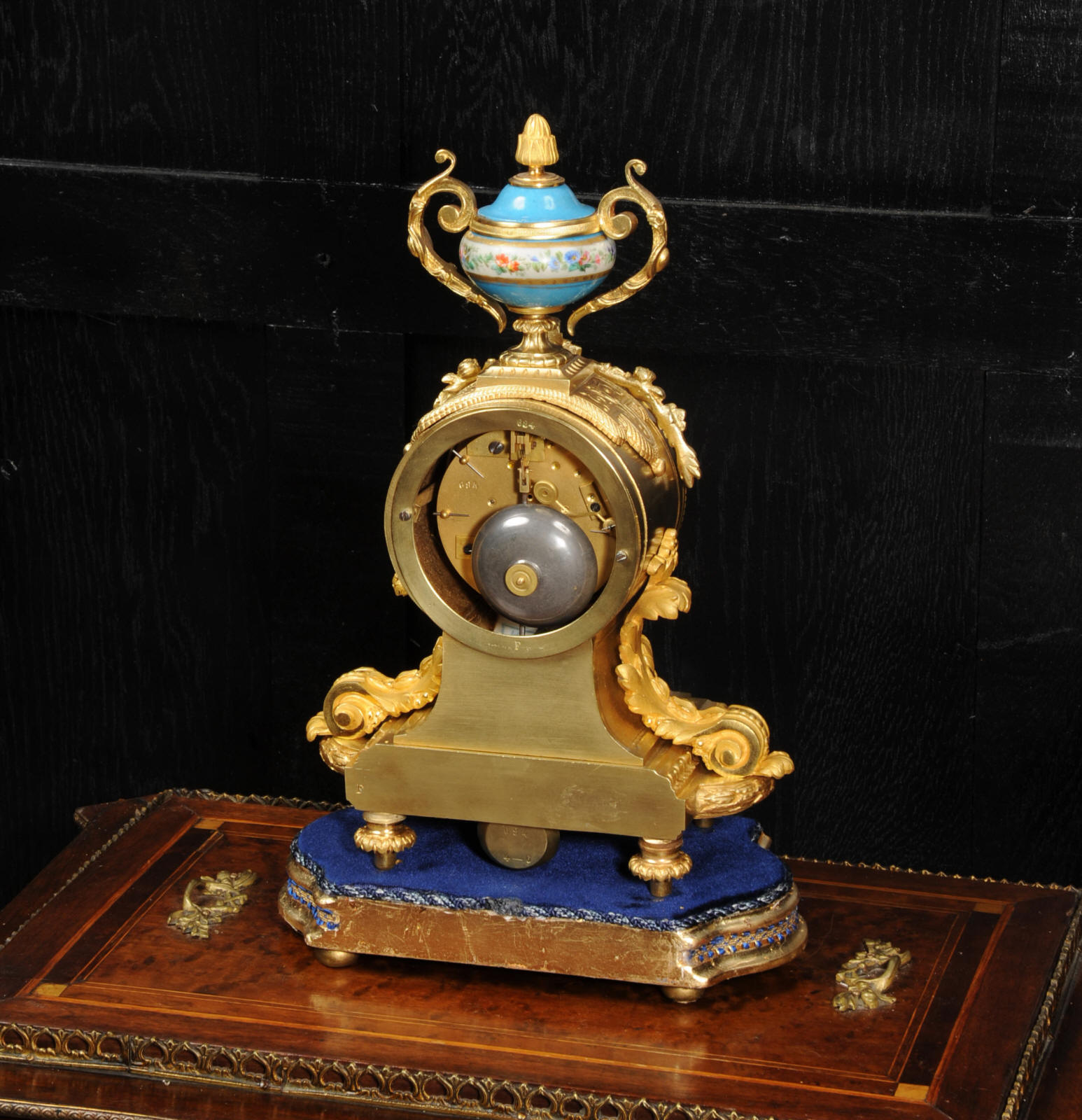 The lower porcelain panel is painted with floral swag and the dial is decorated with musical motifs and roses, allegorical of love. The clock is complete with it's original gesso base. Please note that this style of clock does not have a glazed bezel or a rear door. The French movement is of very high quality as one would expect of Japy Freres. It has the Japy Freres 'Medaille d'Honneur' mark on the movement backplate. It is in excellent clean and running condition having been fully serviced by our clockmaker. Pendulum is original. It runs for 8 days on one wind and strikes the hours and halves on a bell. Click the video clip below to hear the bell and watch the clock running! Condition of the case is excellent with a clean and bright finish, there is some very minor wear to the original gilding and some occasional discolouration. The porcelain is in excellent condition with no damage and the vast majority of the over-glaze gilt decoration present. There are losses to the red and white applied 'jewels'. Gesso base is in good condition with wear to the high spots. The blue fabric has been replaced quite recently. This is a fine and very decorative clock to add to your collection.
