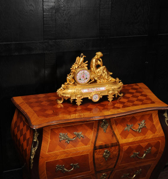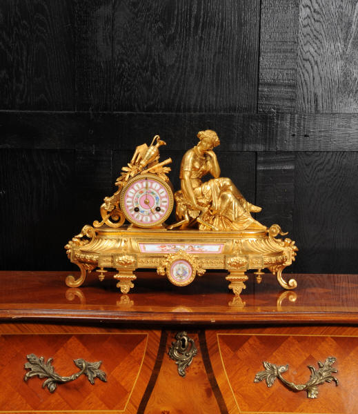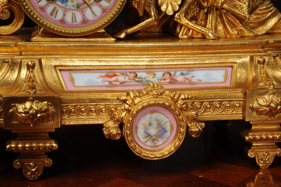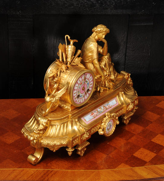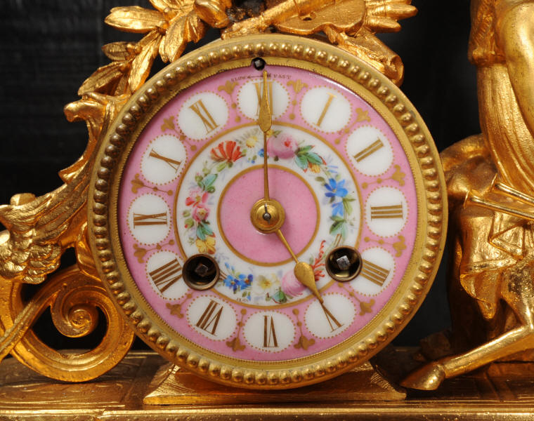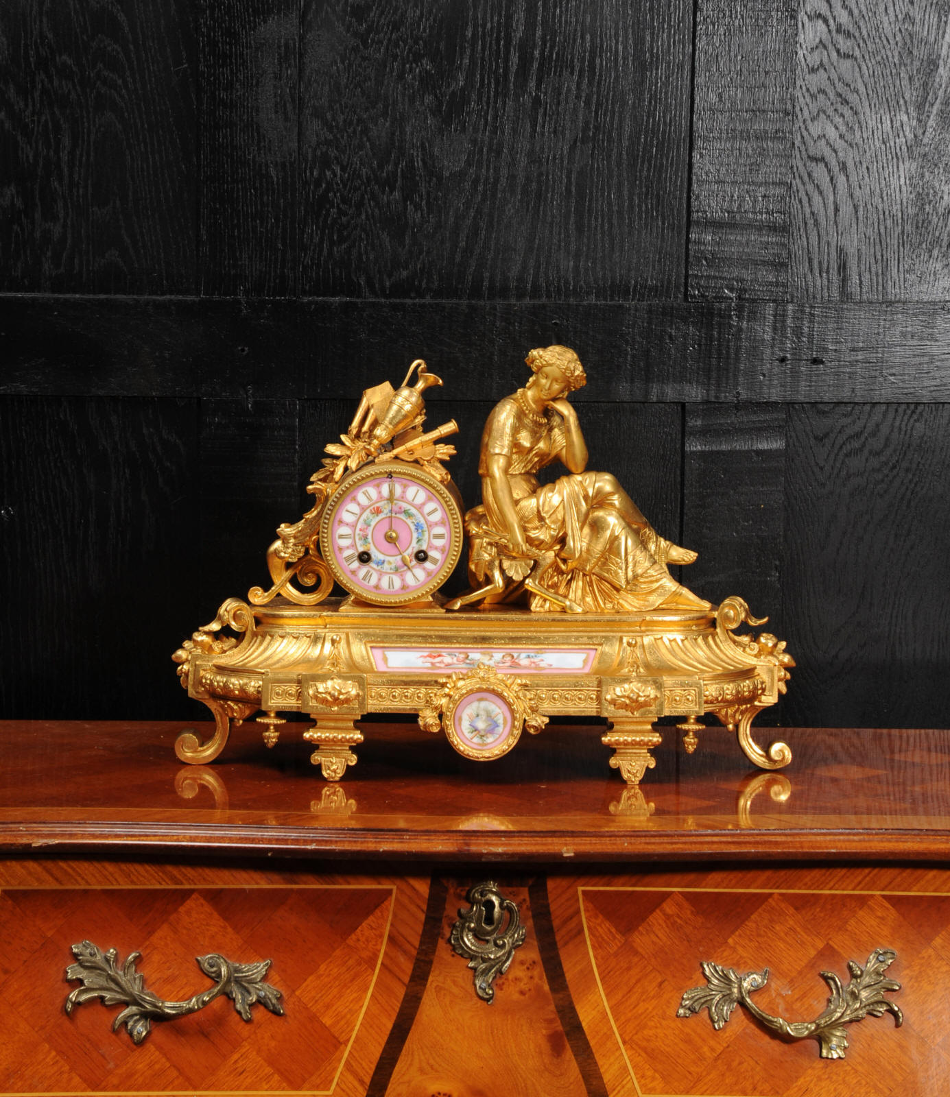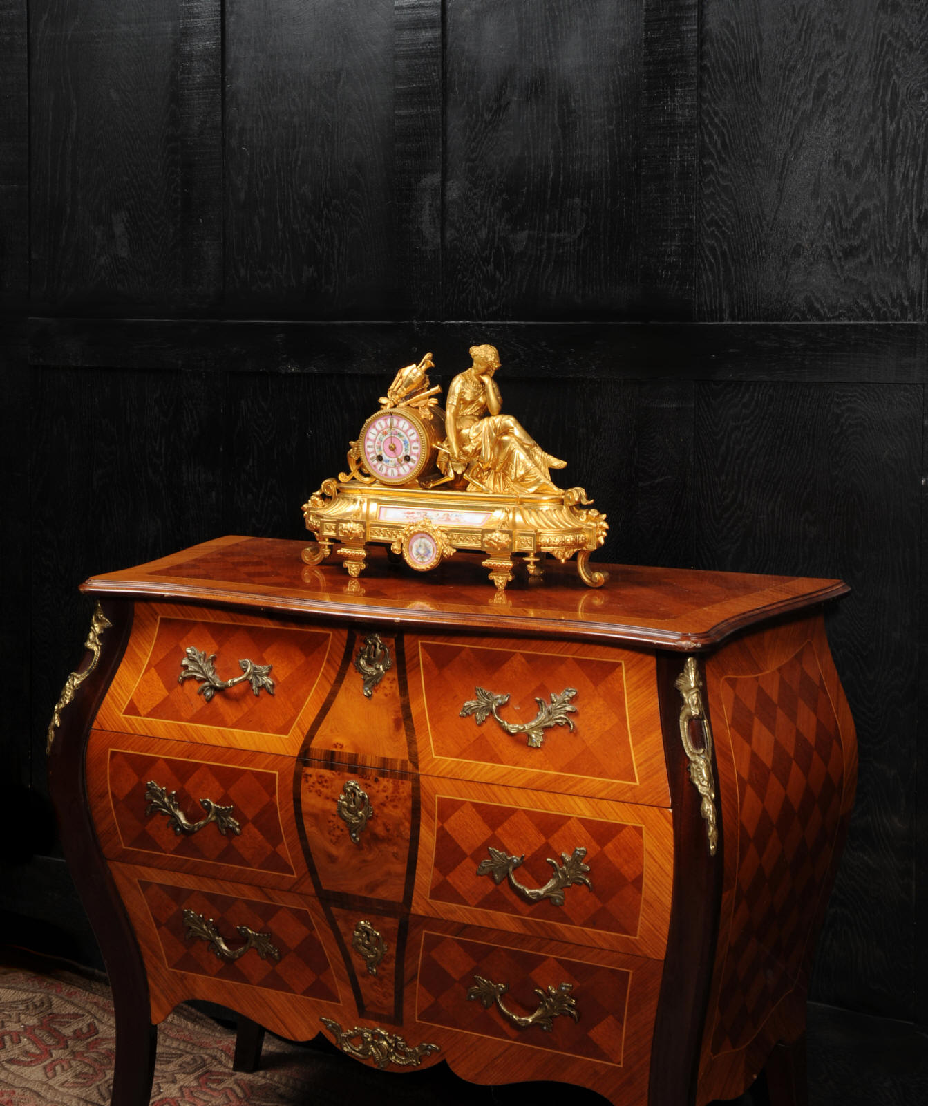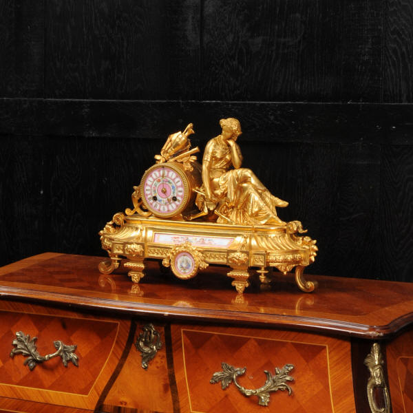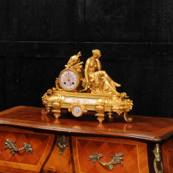 The dial is also porcelain, finely painted with a floral swag. It is complete with its original gilded hands and is signed for Henri Marc. Please note that this design of clock does not have a glazed bezel or a rear door. The French movement is by Japy Freres and is of the maker's usual high quality. It is in excellent clean and running condition having been fully overhauled by our clockmaker. Pendulum is a replacement. It runs for 8 days and strikes the hours and halves on a bell. Click the video below to hear the bell and watch the clock running! Condition of the case is excellent, the original gilding is beautifully clean and bright with some slight wear, discolouration and tarnish. The rear of the case has been repaired in the past but does not detract. The porcelain is in excellent condition with no damage and only very slight wear to the over-glaze gilt decoration.