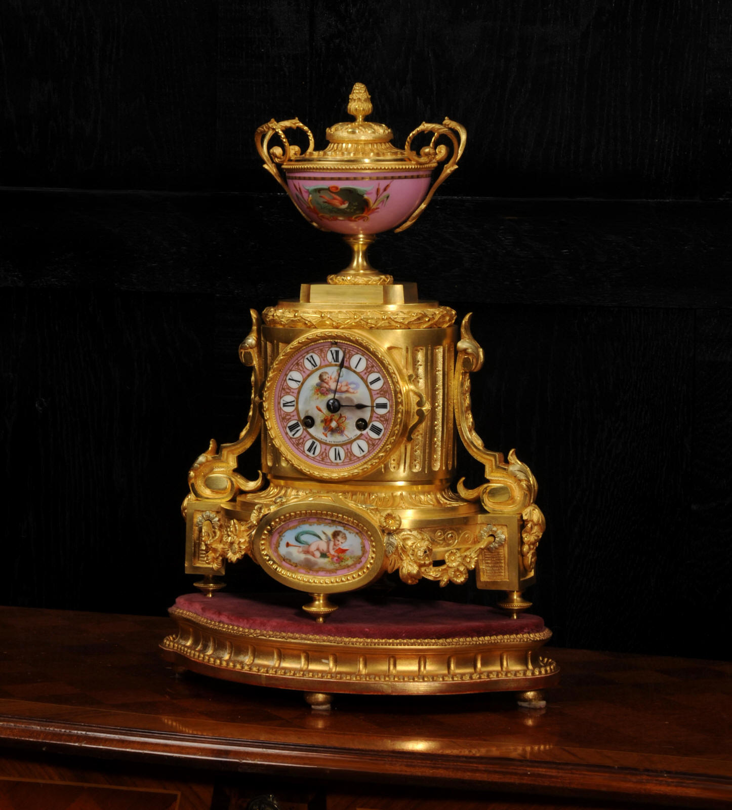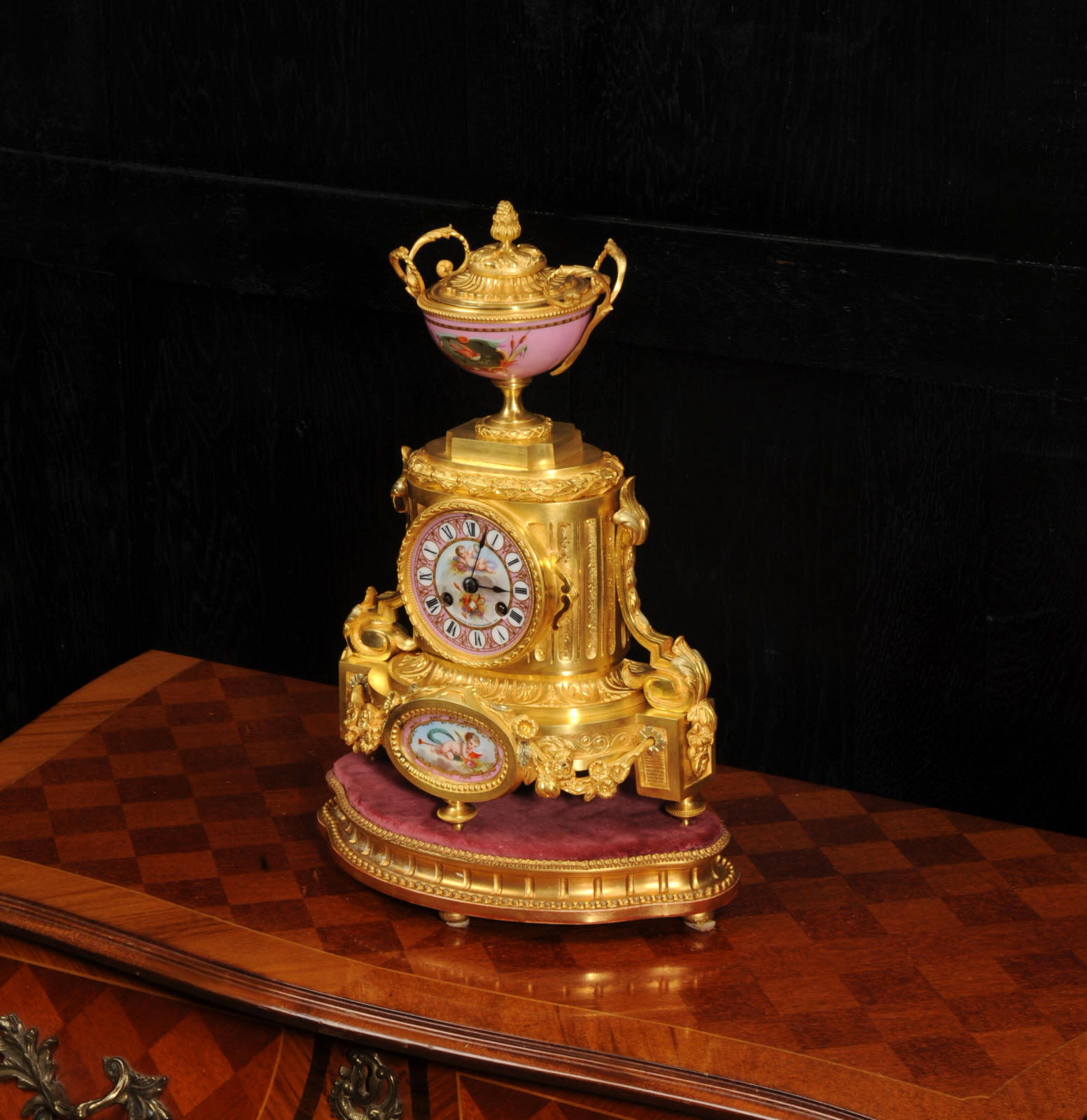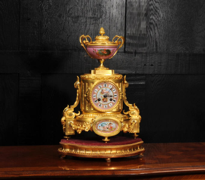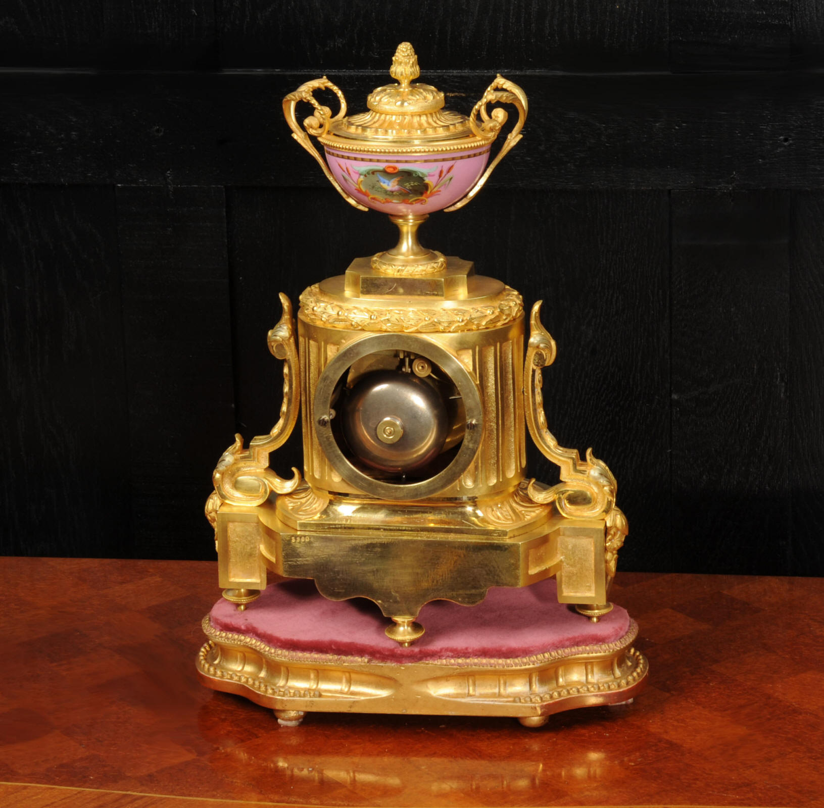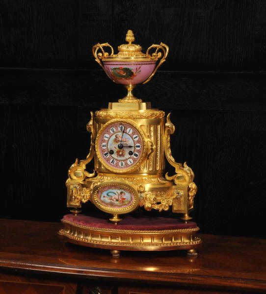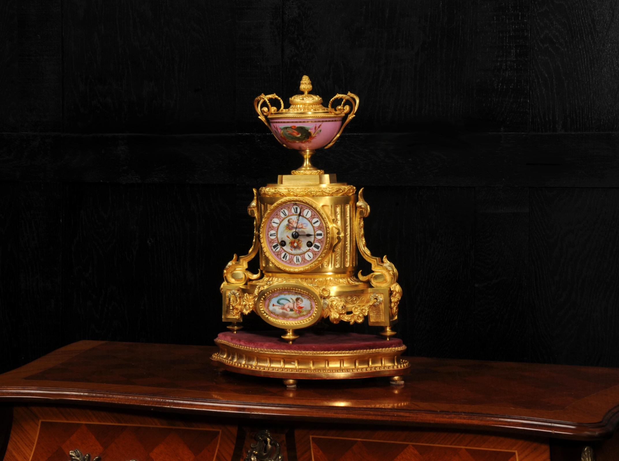 The large urn to the top is finely painted to both sides with exotic birds. The dial is complete with it's original finely cut and blued steel hands. Please note that this style of clock does not have a glass bezel or a rear door to the case. The clock is complete with its original gesso base. The French movement is by Achille Brocot and is of superb quality. It is in excellent clean and running condition having been fully overhauled by our clockmaker. It is fitted with a dead-beat escapement and rack striking. Pendulum is and old replacement. It runs for 8 days and strikes the hours and halves on a bell. Condition of the case is excellent, the original gilding is beautifully clean and bright with slight wear to the high spots in places. The porcelain is also excellent with no damage and only very minor wear to the over-glaze gilt decoration. We have replaced the fabric on the gesso base with fresh. Achille Brocot was a member of the renowned Brocot clockmaking family, the eldest son of Louis Gabriel Brocot. He was treasurer to La Société des Horlogers in Paris and was awarded First Class Medal at the 1855 Paris Exhibition - Tardy, Dictionnaire des Horlogers.
