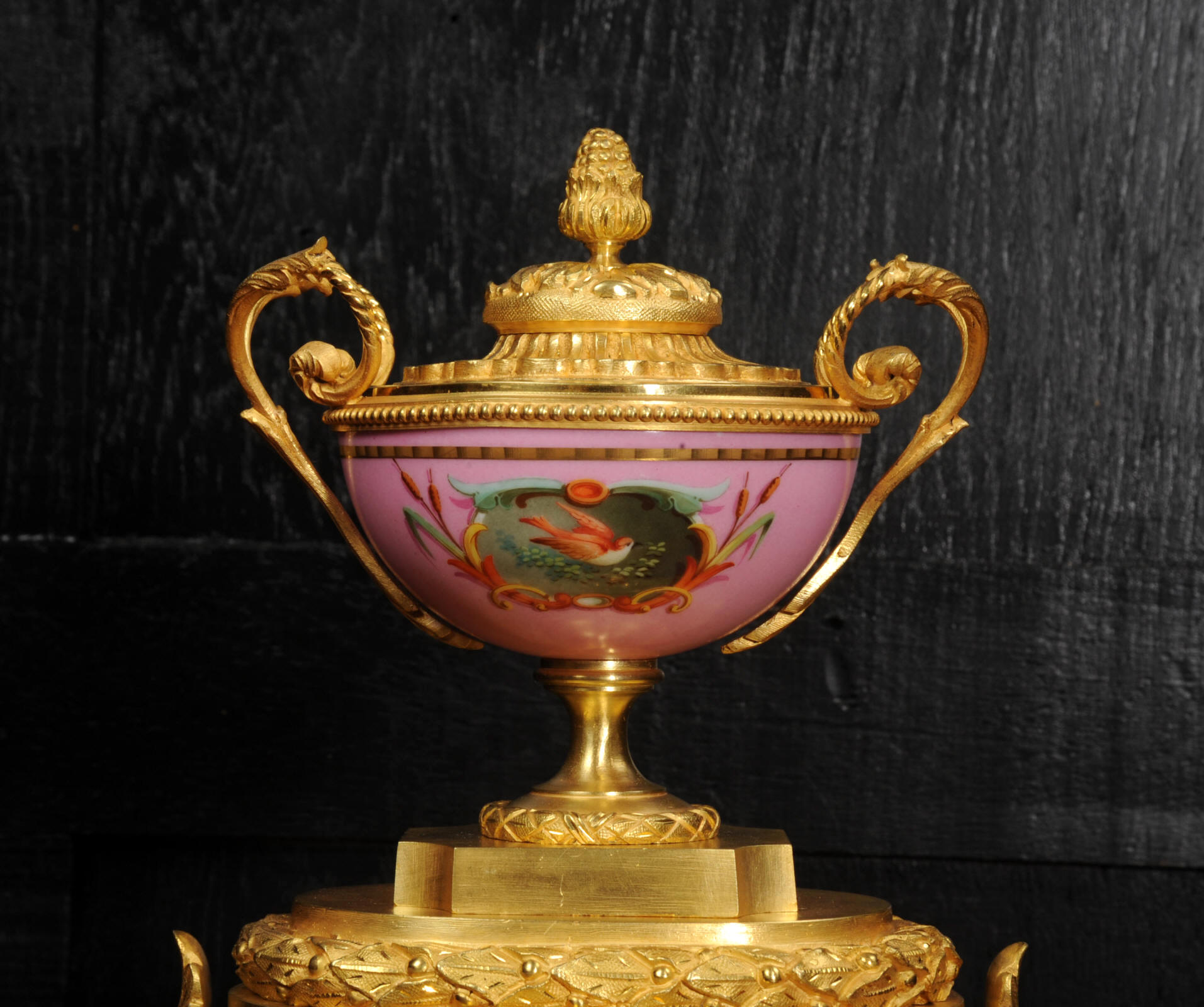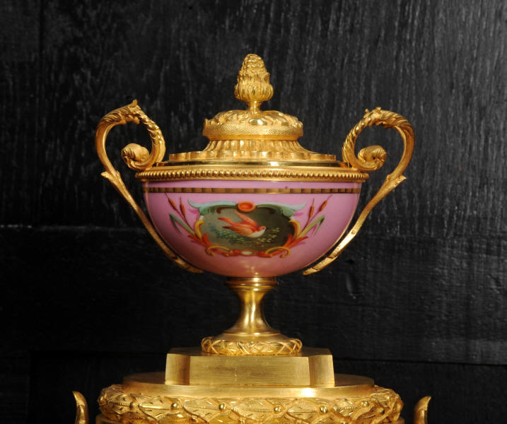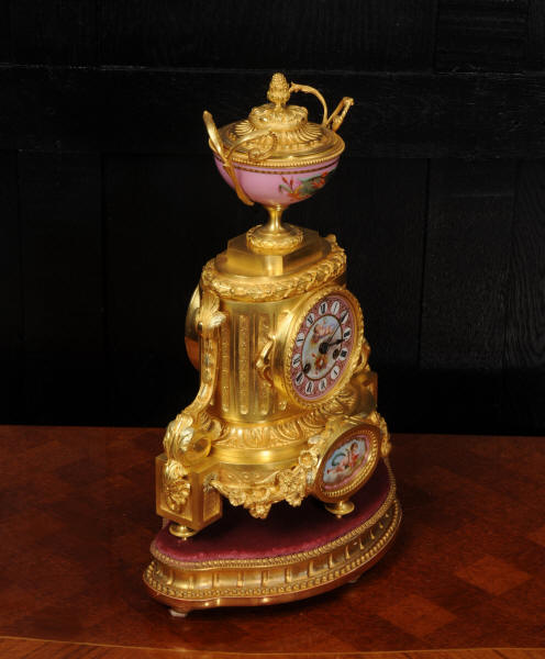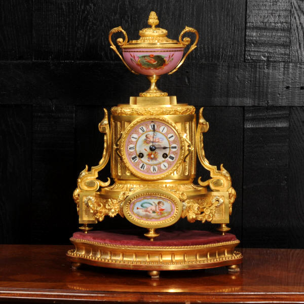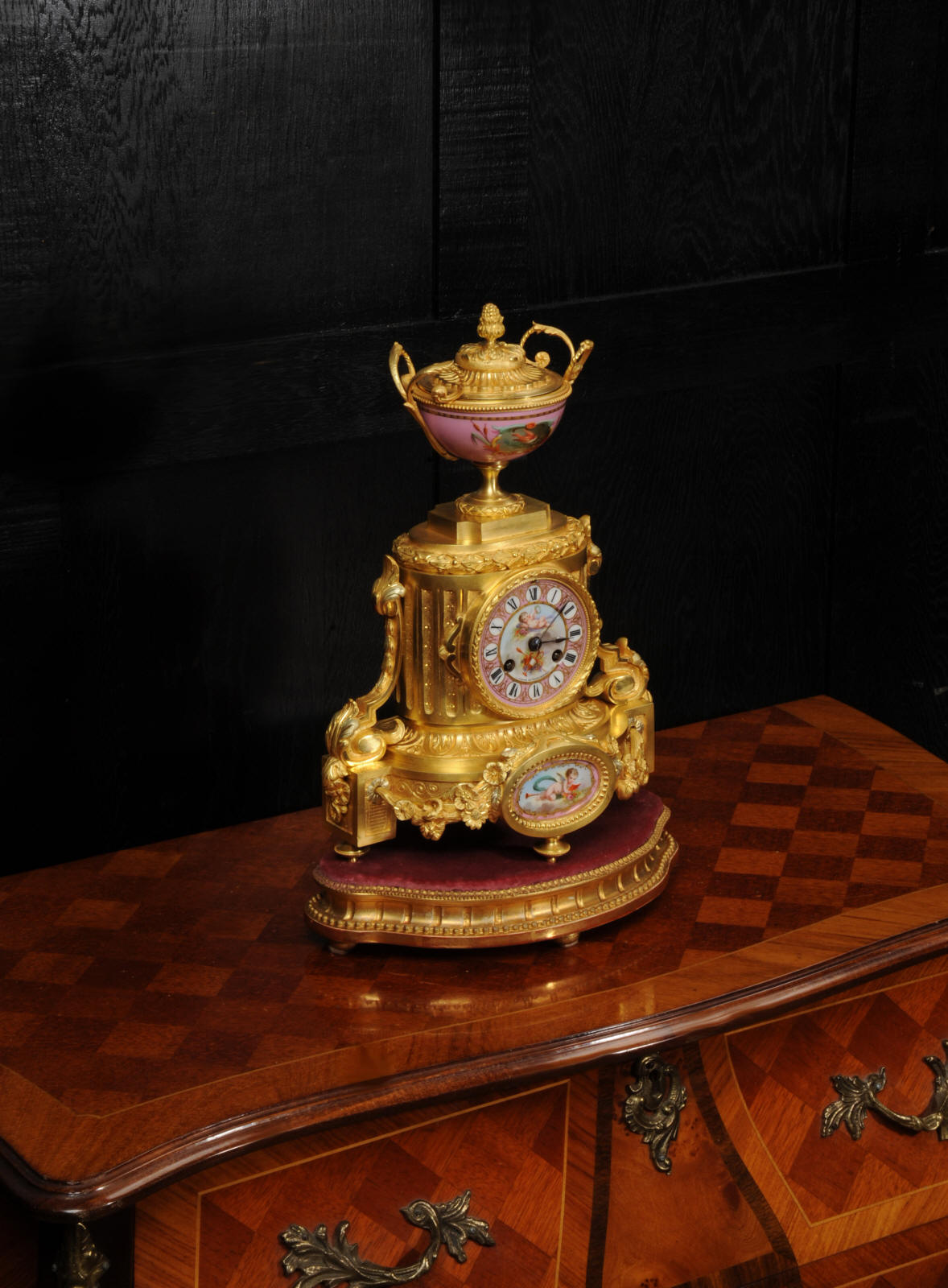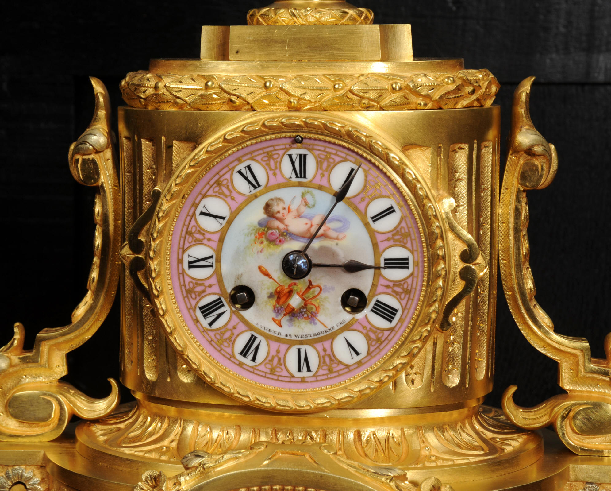The large urn to the top is finely painted to both sides with exotic birds. The dial is complete with it's original finely cut and blued steel hands. Please note that this style of clock does not have a glass bezel or a rear door to the case. The clock is complete with its original gesso base. The French movement is by Achille Brocot and is of superb quality. It is in excellent clean and running condition having been fully overhauled by our clockmaker. It is fitted with a dead-beat escapement and rack striking. Pendulum is and old replacement. It runs for 8 days and strikes the hours and halves on a bell. Condition of the case is excellent, the original gilding is beautifully clean and bright with slight wear to the high spots in places. The porcelain is also excellent with no damage and only very minor wear to the over-glaze gilt decoration. We have replaced the fabric on the gesso base with fresh. Achille Brocot was a member of the renowned Brocot clockmaking family, the eldest son of Louis Gabriel Brocot. He was treasurer to La Société des Horlogers in Paris and was awarded First Class Medal at the 1855 Paris Exhibition - Tardy, Dictionnaire des Horlogers.