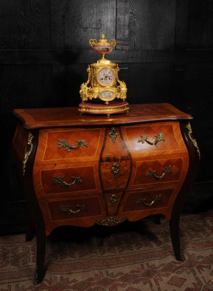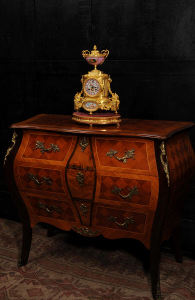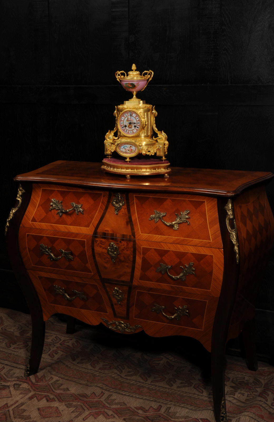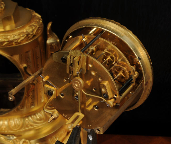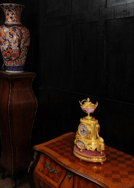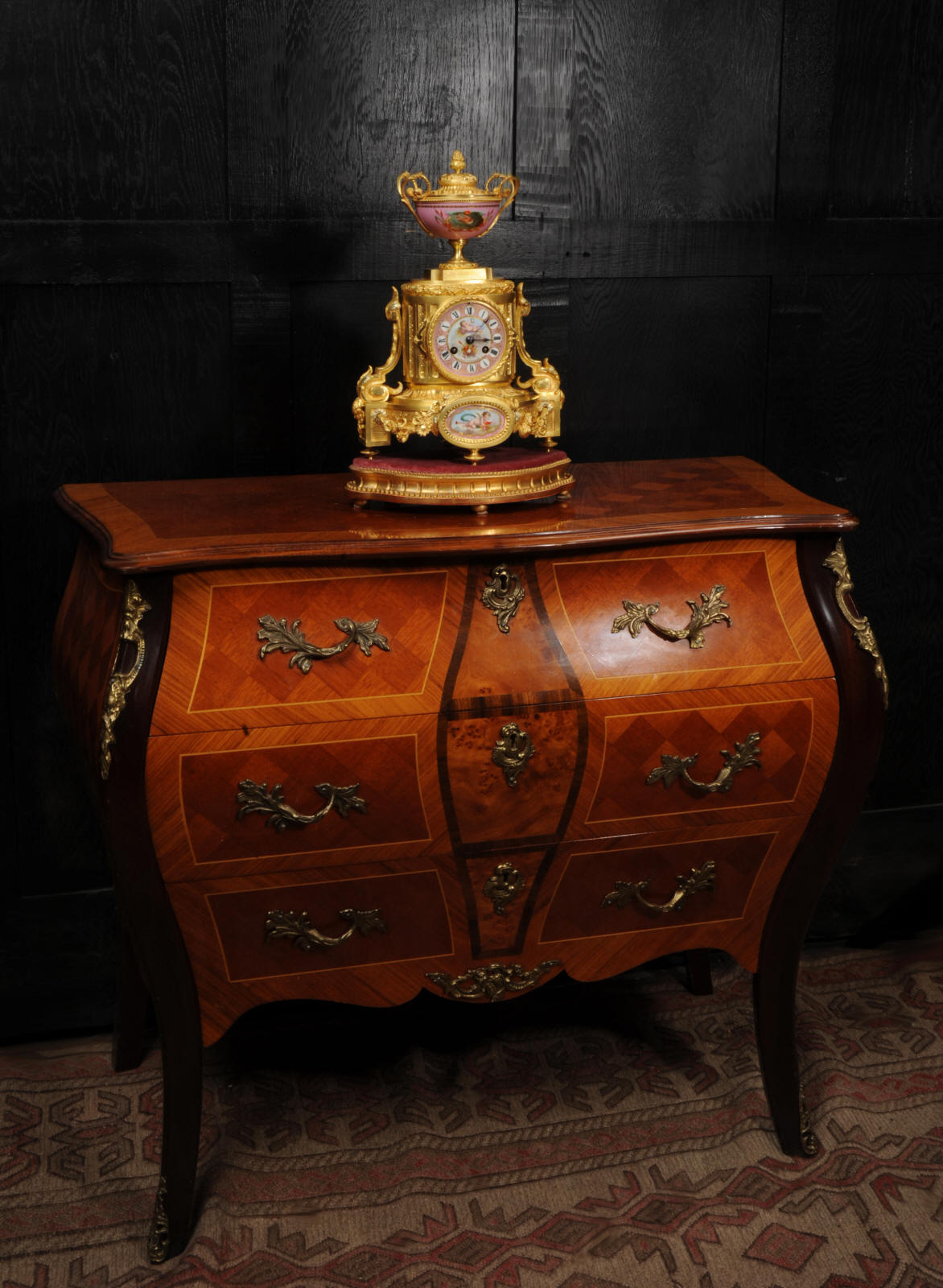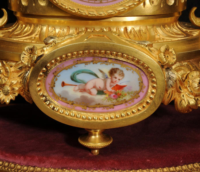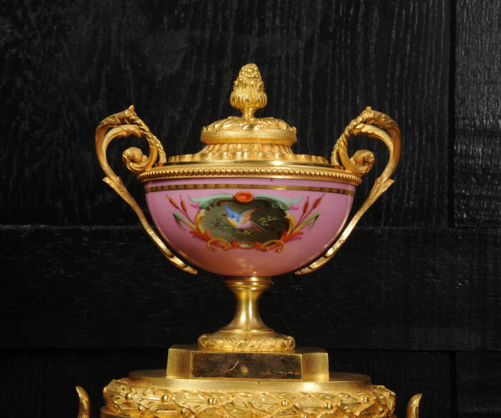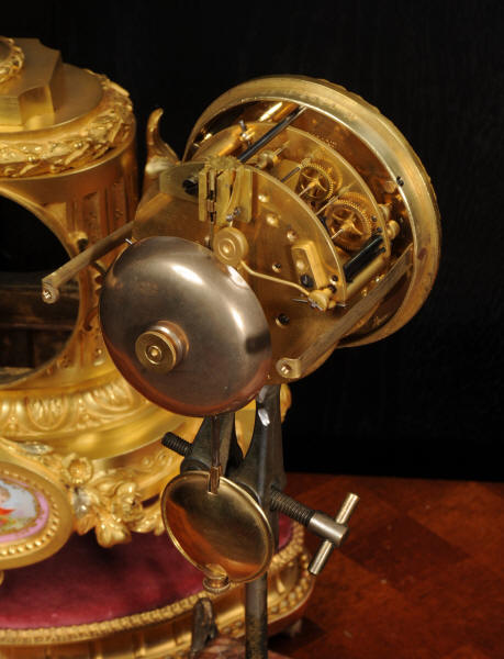 The large urn to the top is finely painted to both sides with exotic birds. The dial is complete with it's original finely cut and blued steel hands. Please note that this style of clock does not have a glass bezel or a rear door to the case. The clock is complete with its original gesso base. The French movement is by Achille Brocot and is of superb quality. It is in excellent clean and running condition having been fully overhauled by our clockmaker. It is fitted with a dead-beat escapement and rack striking. Pendulum is and old replacement. It runs for 8 days and strikes the hours and halves on a bell. Condition of the case is excellent, the original gilding is beautifully clean and bright with slight wear to the high spots in places. The porcelain is also excellent with no damage and only very minor wear to the over-glaze gilt decoration. We have replaced the fabric on the gesso base with fresh. Achille Brocot was a member of the renowned Brocot clockmaking family, the eldest son of Louis Gabriel Brocot. He was treasurer to La Société des Horlogers in Paris and was awarded First Class Medal at the 1855 Paris Exhibition - Tardy, Dictionnaire des Horlogers.
