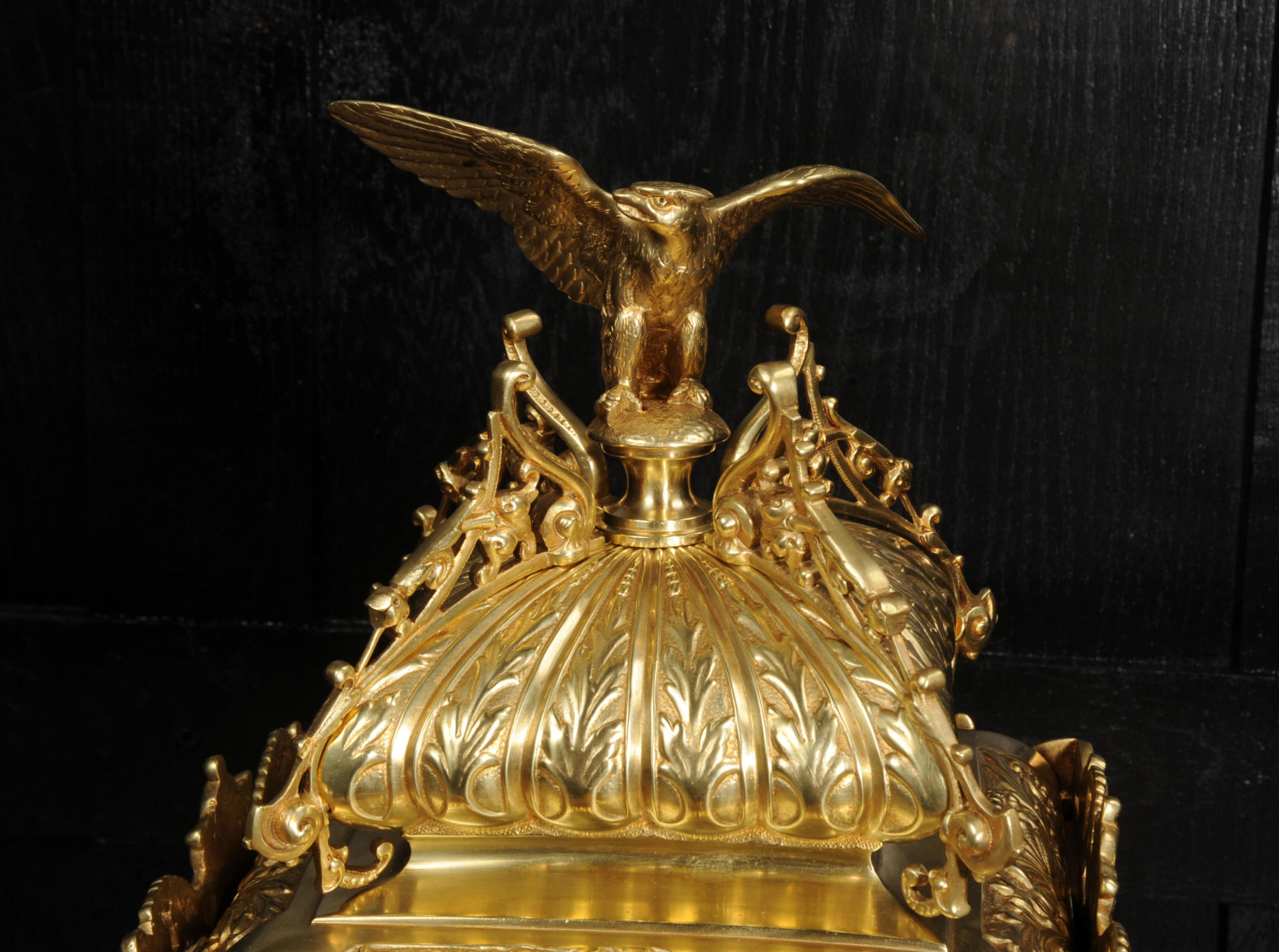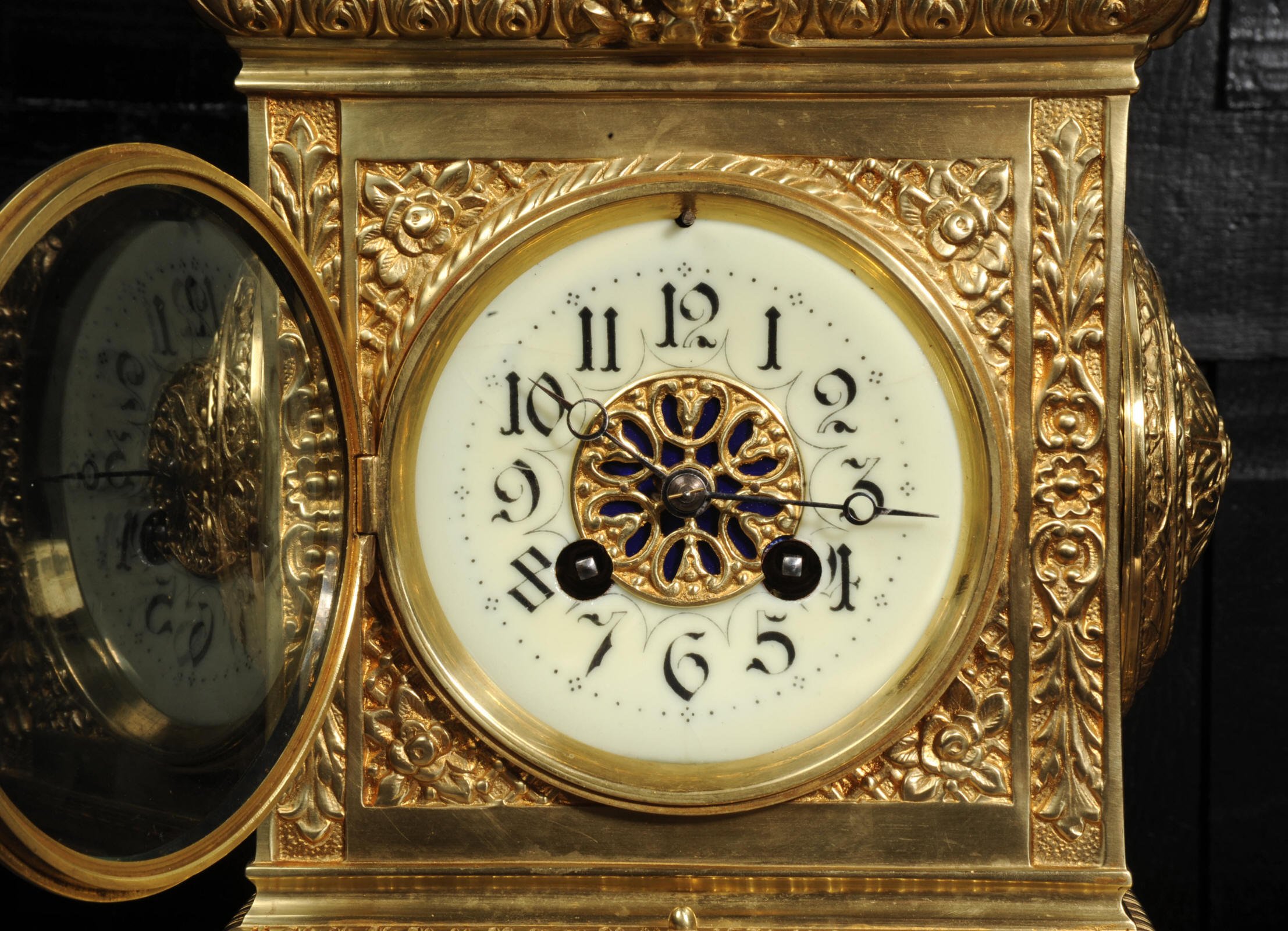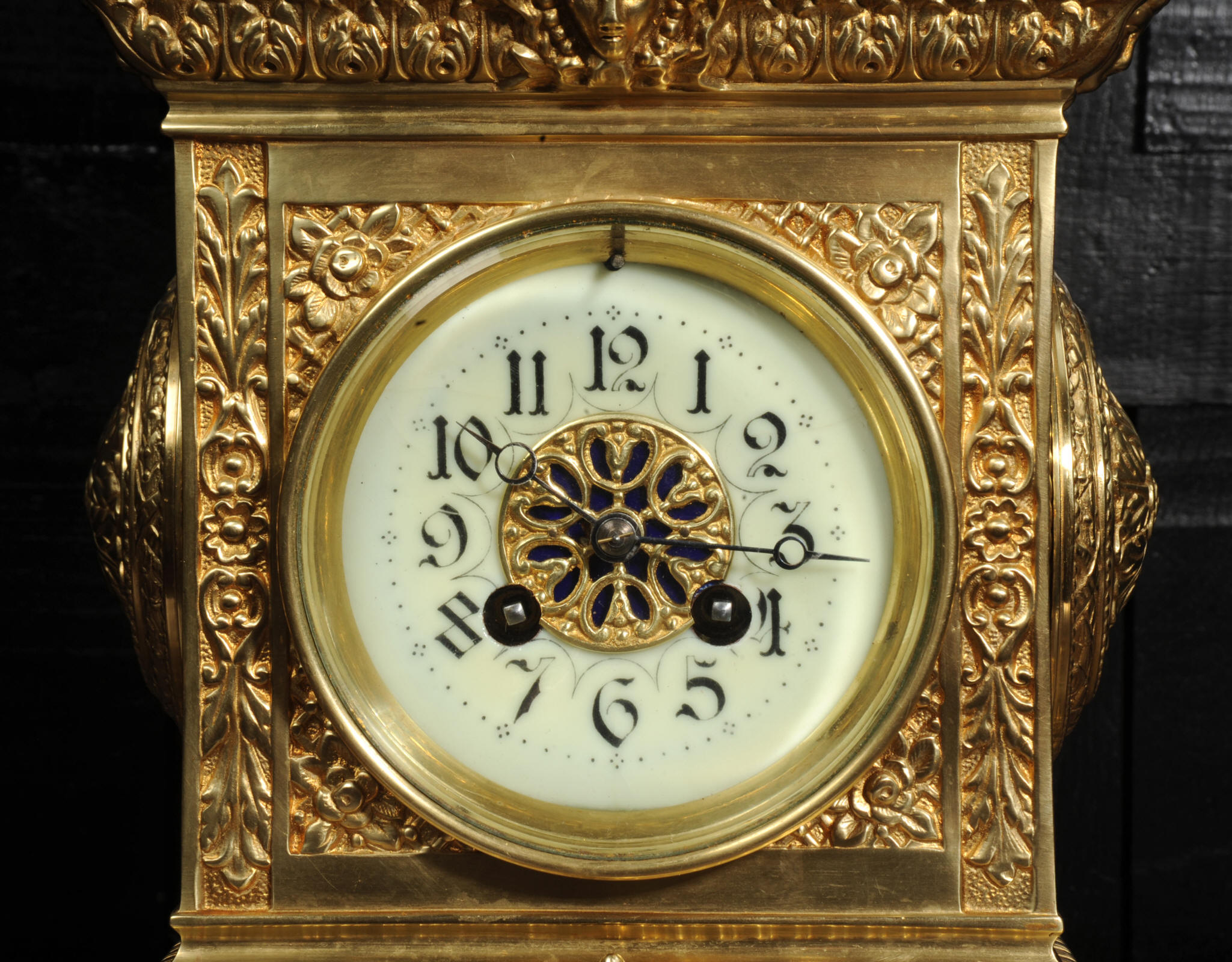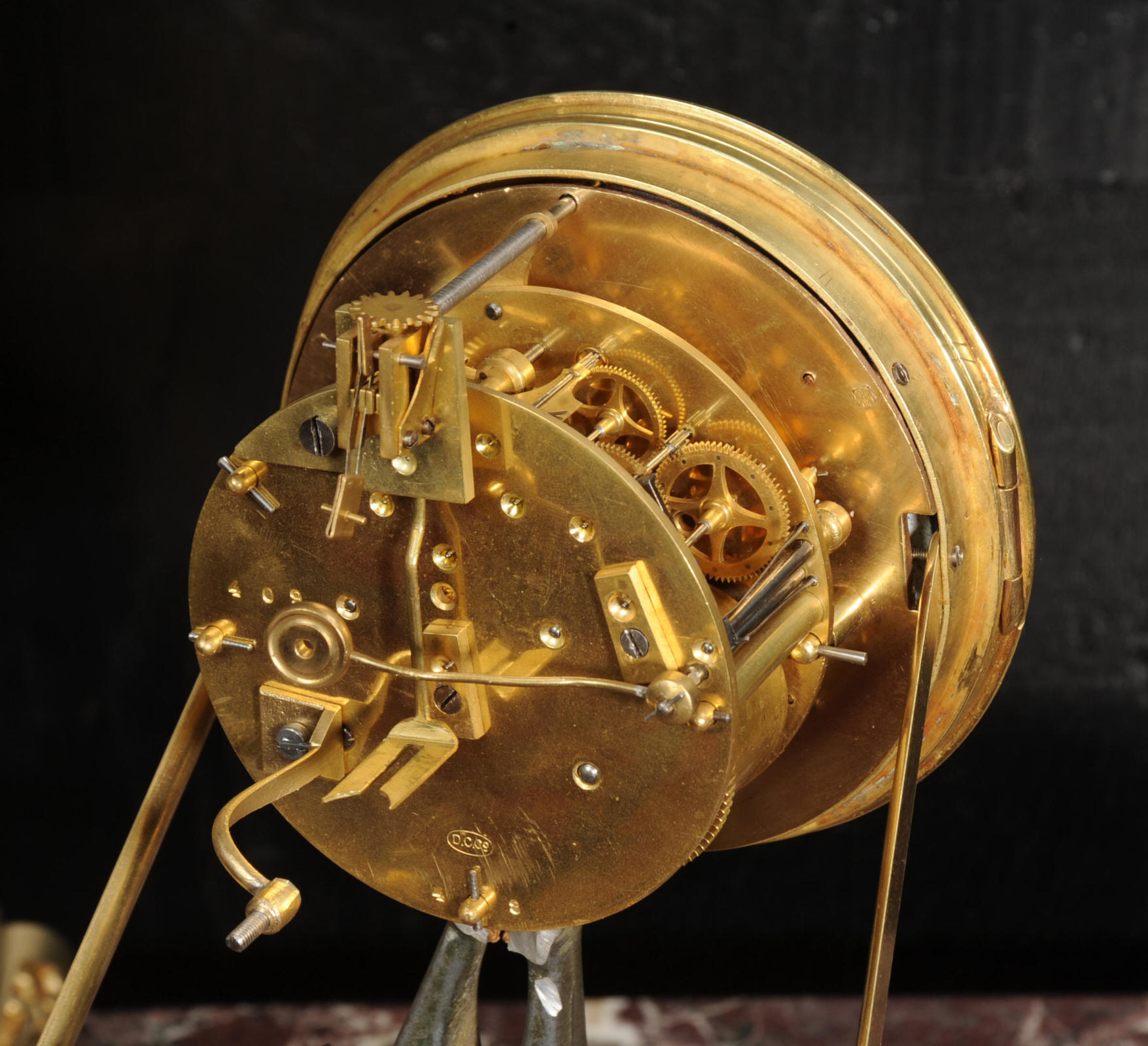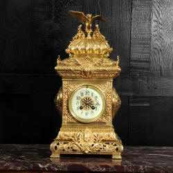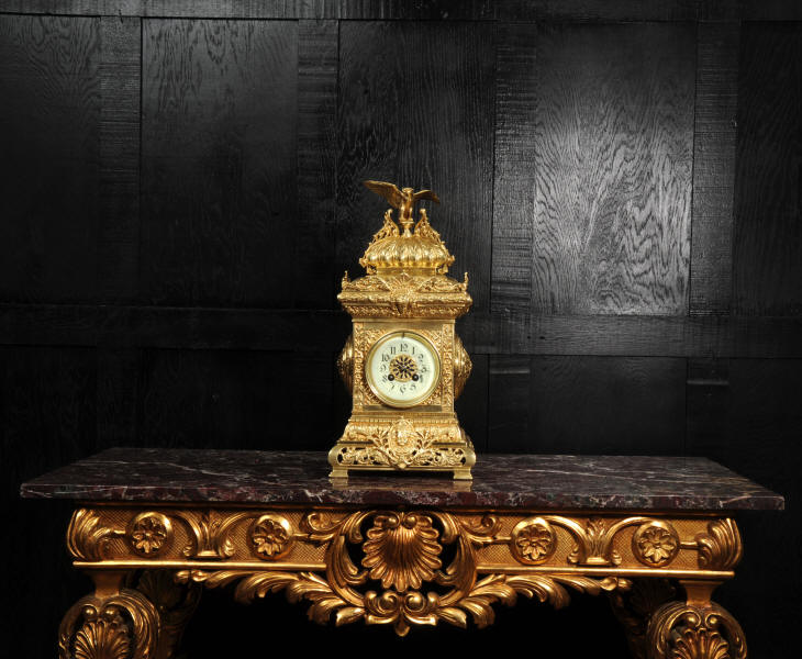 The dial porcelain enamel on copper with a blue center with gilt bronze fret work and blued steel hands. The French movement is of high quality and is in excellent clean and running condition having been fully overhauled by our clockmaker. Pendulum is a replacement. It runs for 8 days and strikes the hours and halves on a bell. Click the video below to hear the bell and watch the clock running. Condition of the case is excellent, the original gilding is beautifully clean and bright with just some slight wear and discolouration. The dial is also very good with just come hairlining near the ten o'clock.