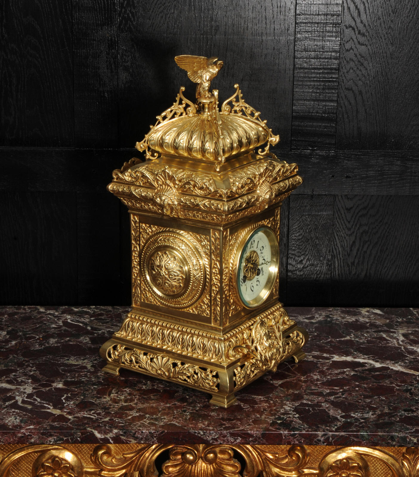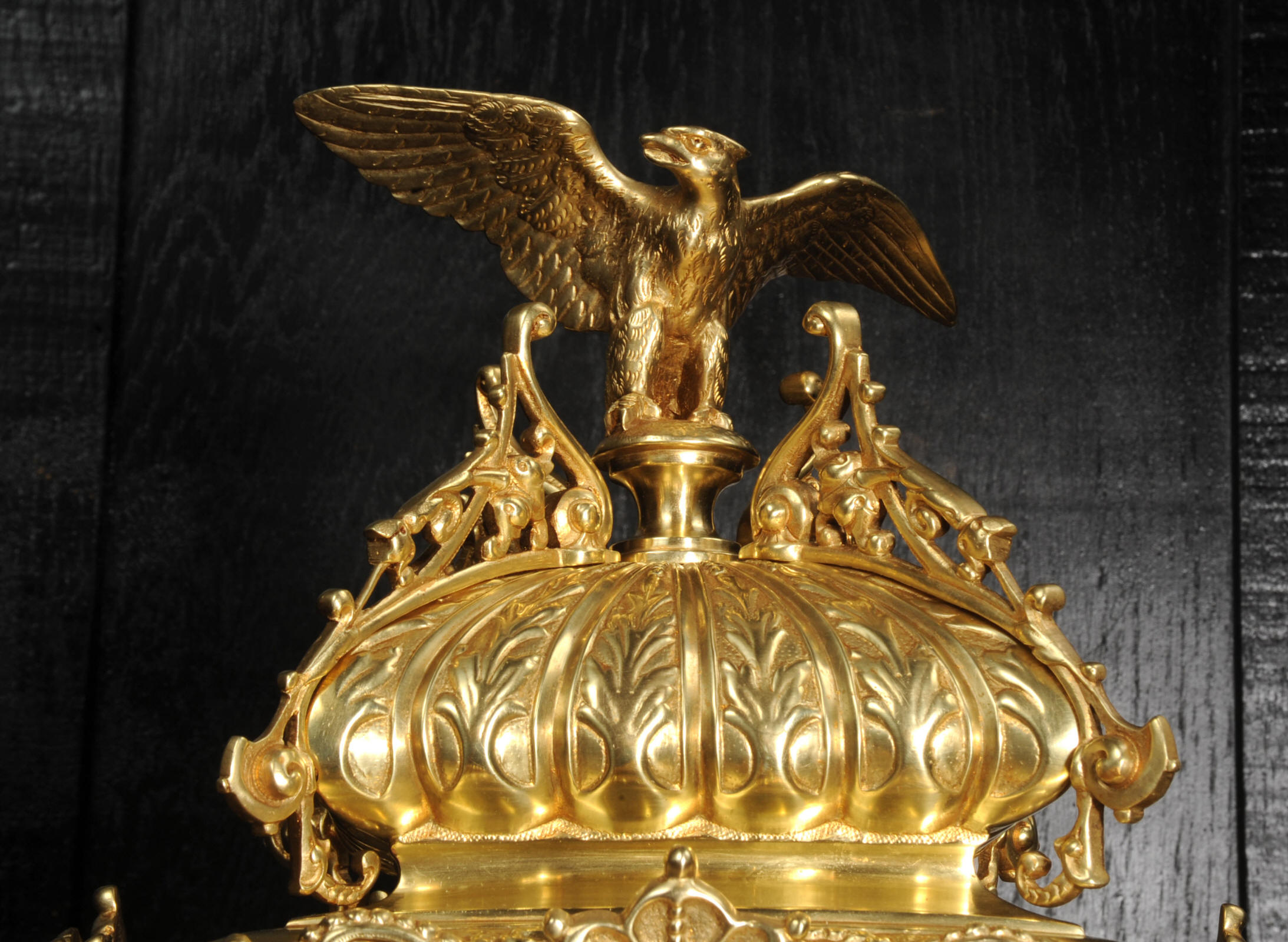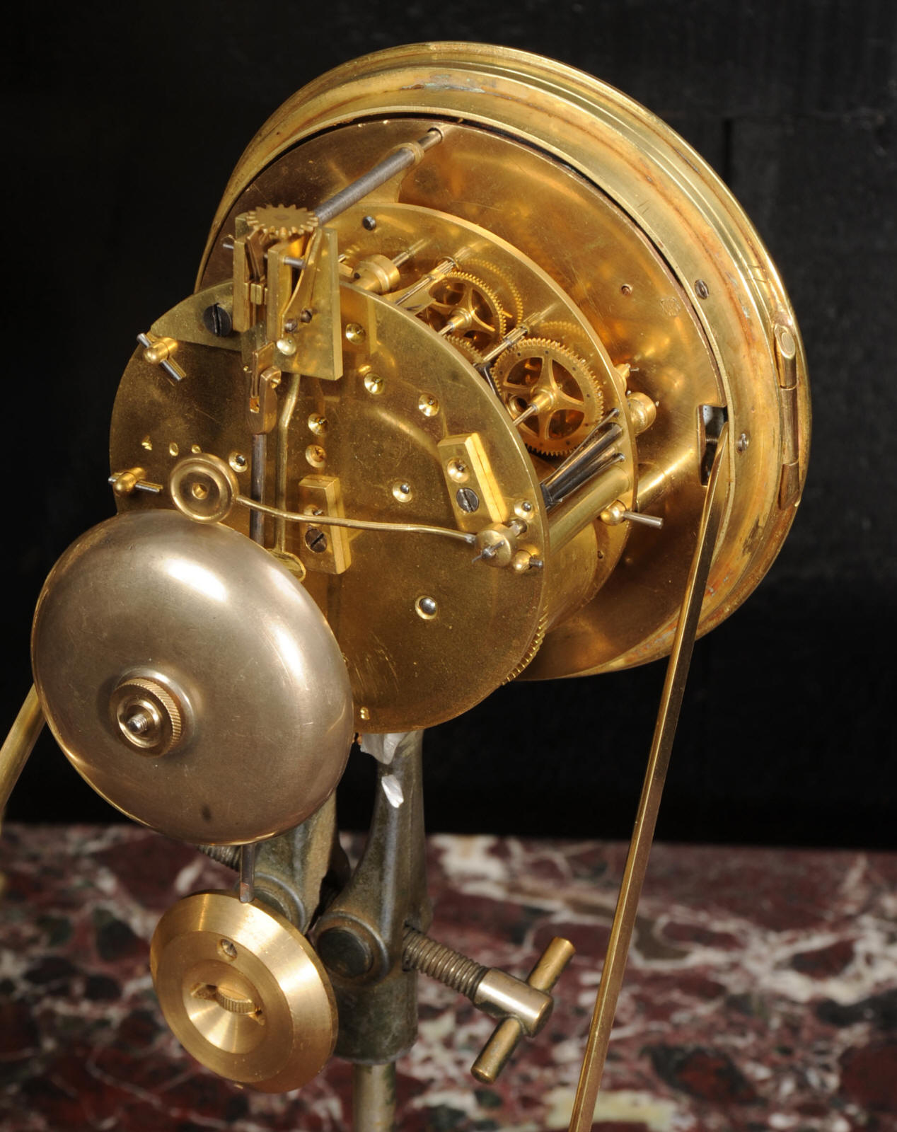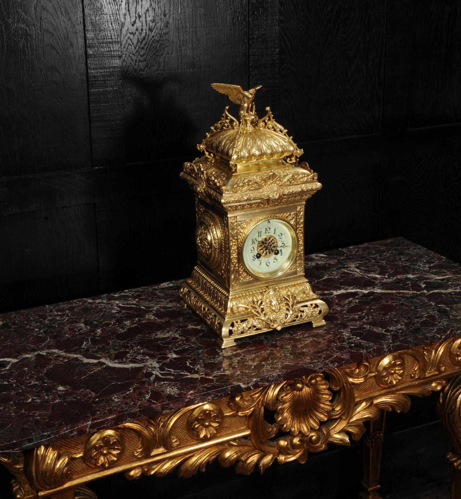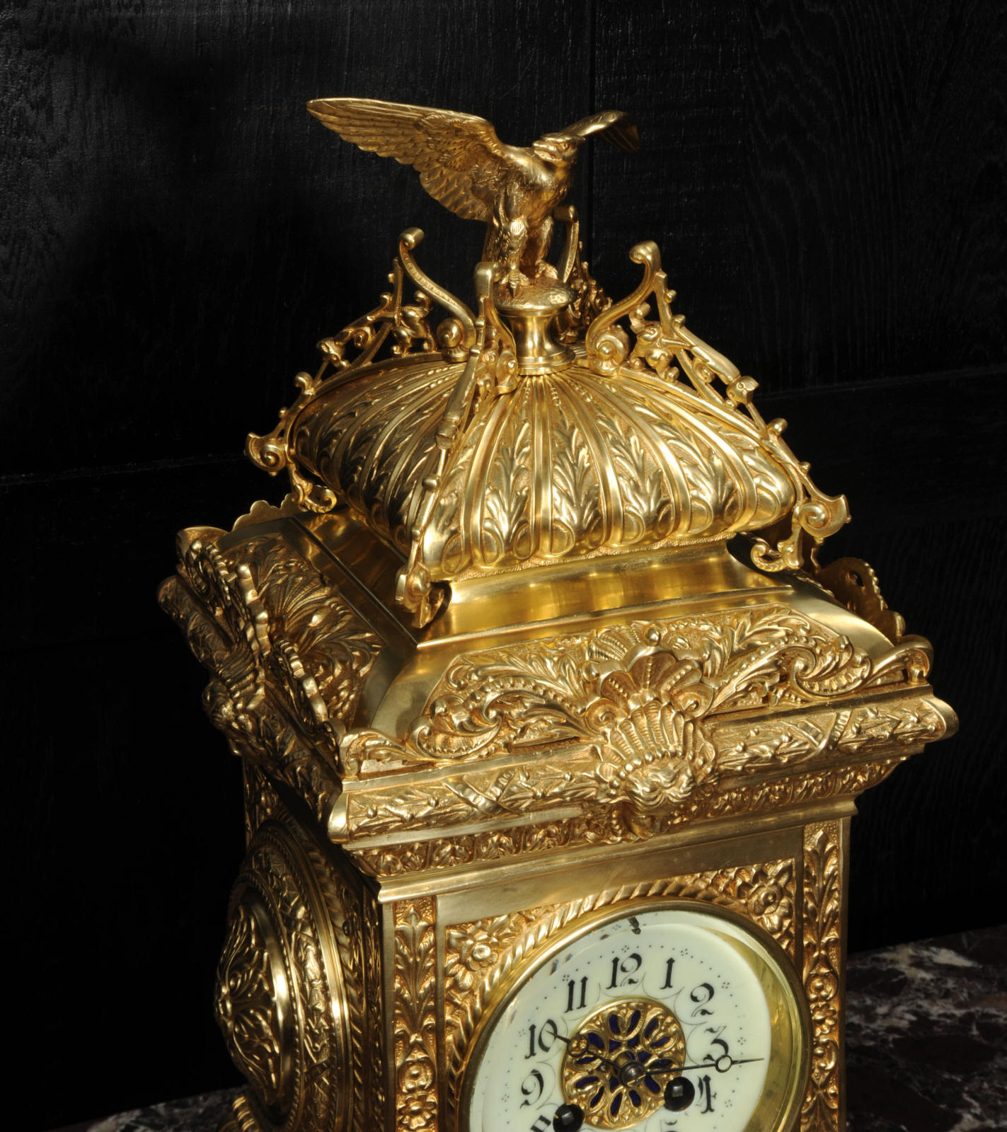 The dial porcelain enamel on copper with a blue center with gilt bronze fret work and blued steel hands. The French movement is of high quality and is in excellent clean and running condition having been fully overhauled by our clockmaker. Pendulum is a replacement. It runs for 8 days and strikes the hours and halves on a bell. Click the video below to hear the bell and watch the clock running. Condition of the case is excellent, the original gilding is beautifully clean and bright with just some slight wear and discolouration. The dial is also very good with just come hairlining near the ten o'clock.