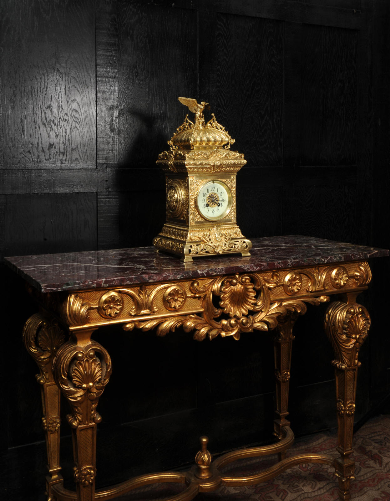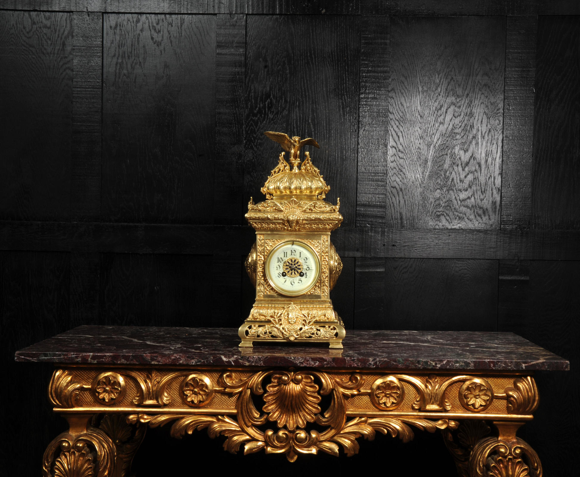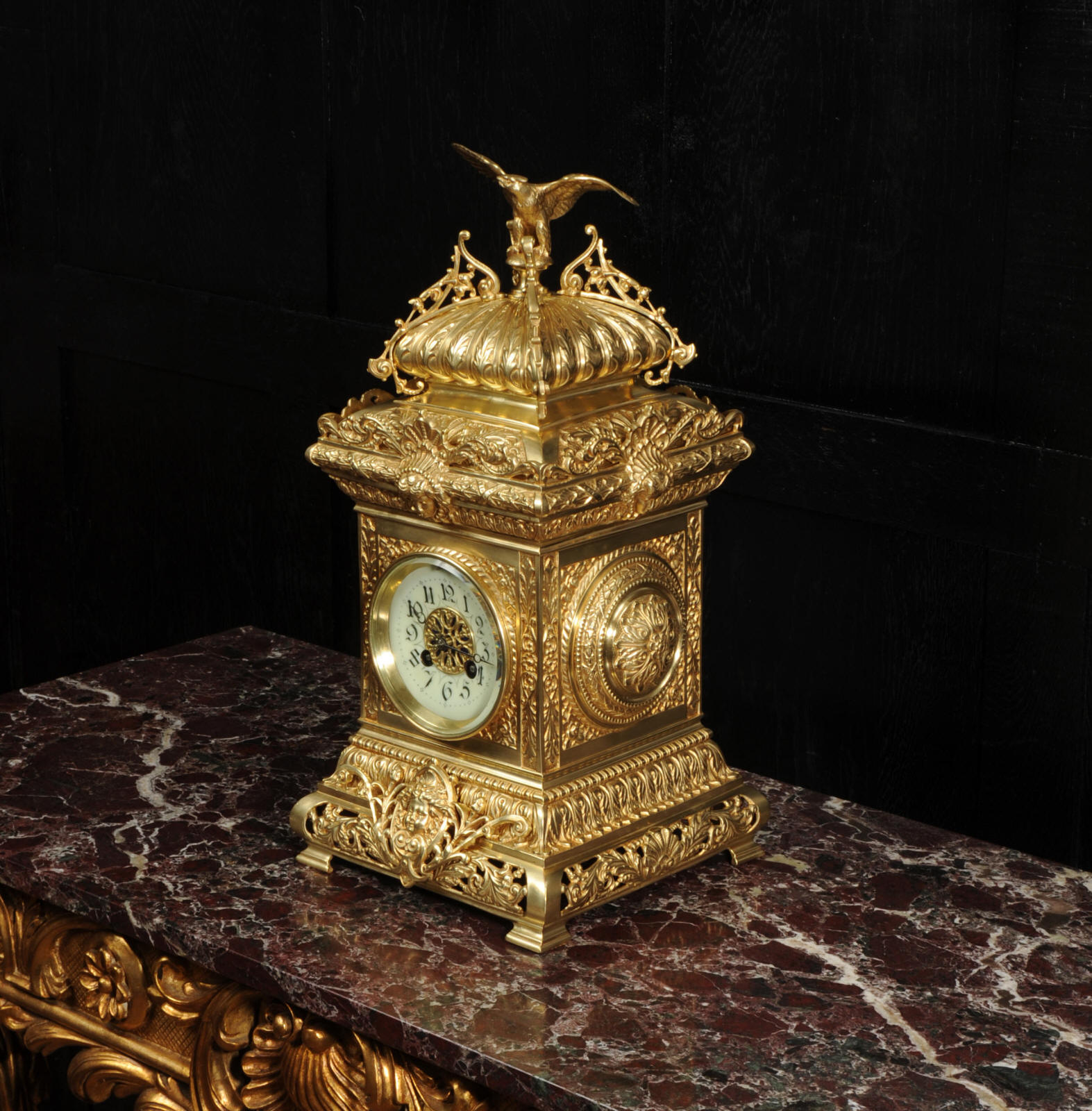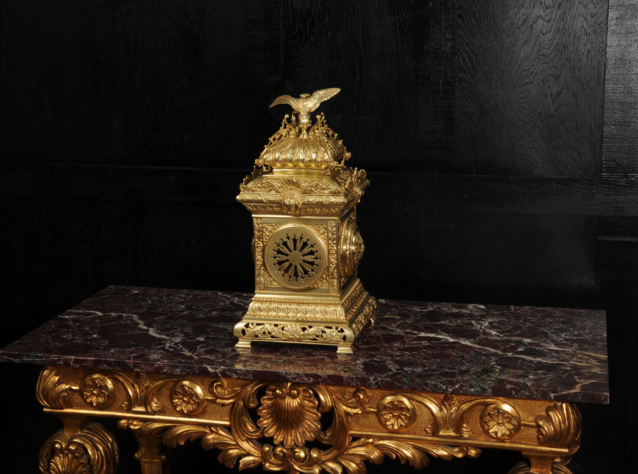 The dial porcelain enamel on copper with a blue center with gilt bronze fret work and blued steel hands. The French movement is of high quality and is in excellent clean and running condition having been fully overhauled by our clockmaker. Pendulum is a replacement. It runs for 8 days and strikes the hours and halves on a bell. Click the video below to hear the bell and watch the clock running. Condition of the case is excellent, the original gilding is beautifully clean and bright with just some slight wear and discolouration. The dial is also very good with just come hairlining near the ten o'clock.