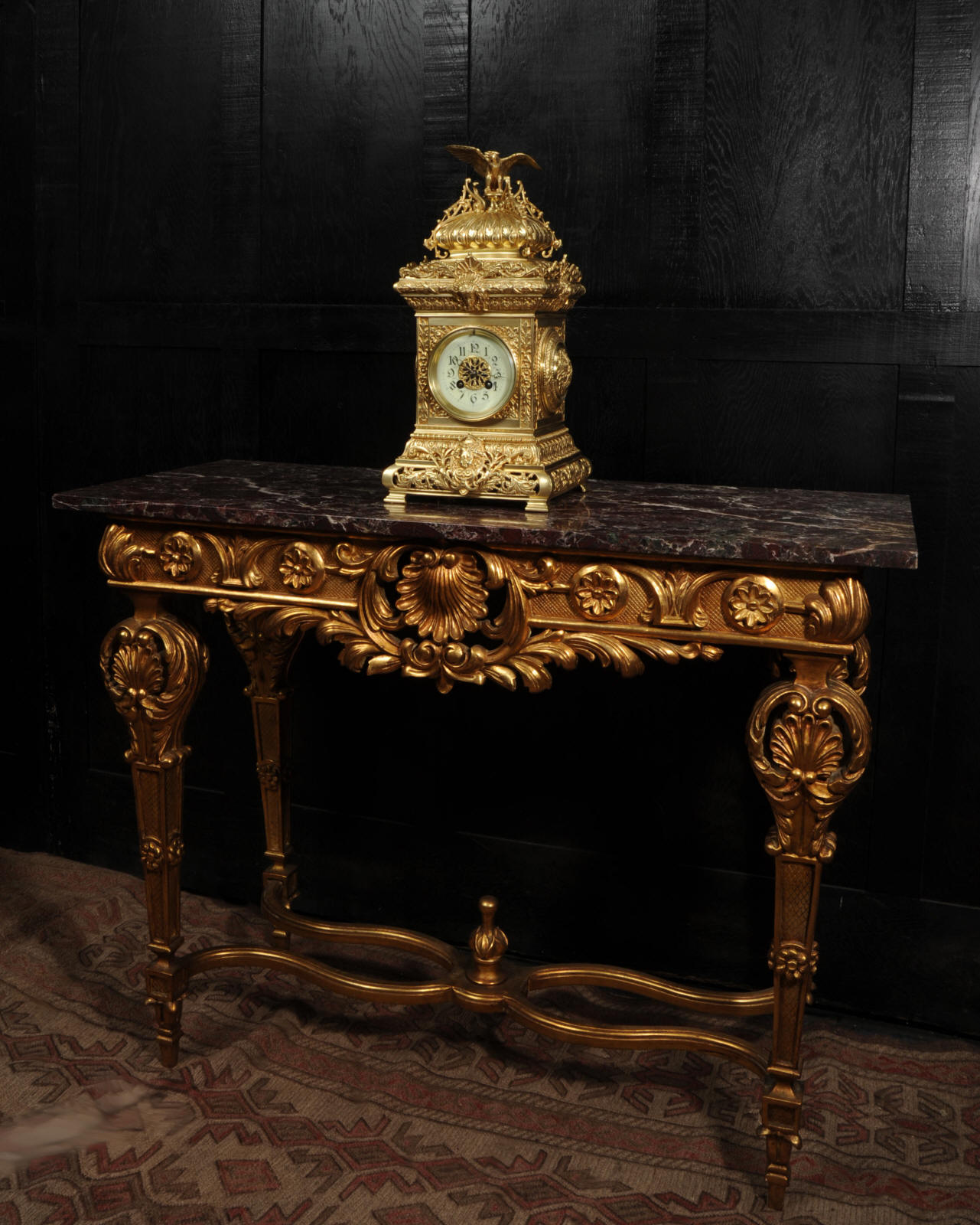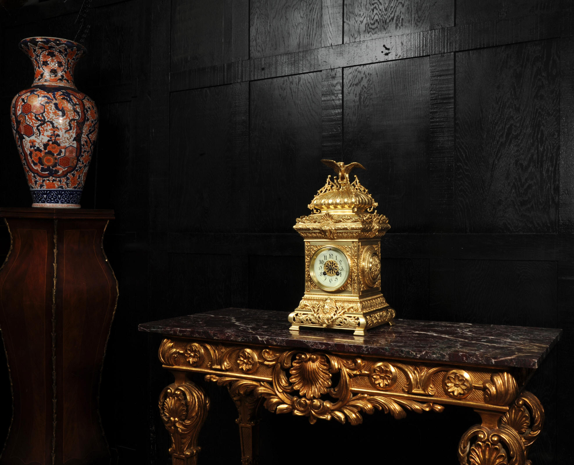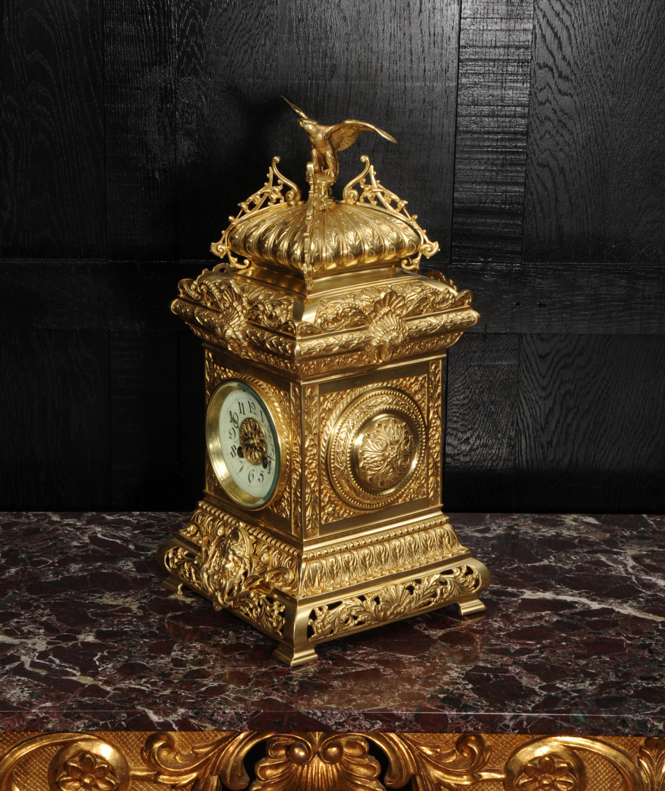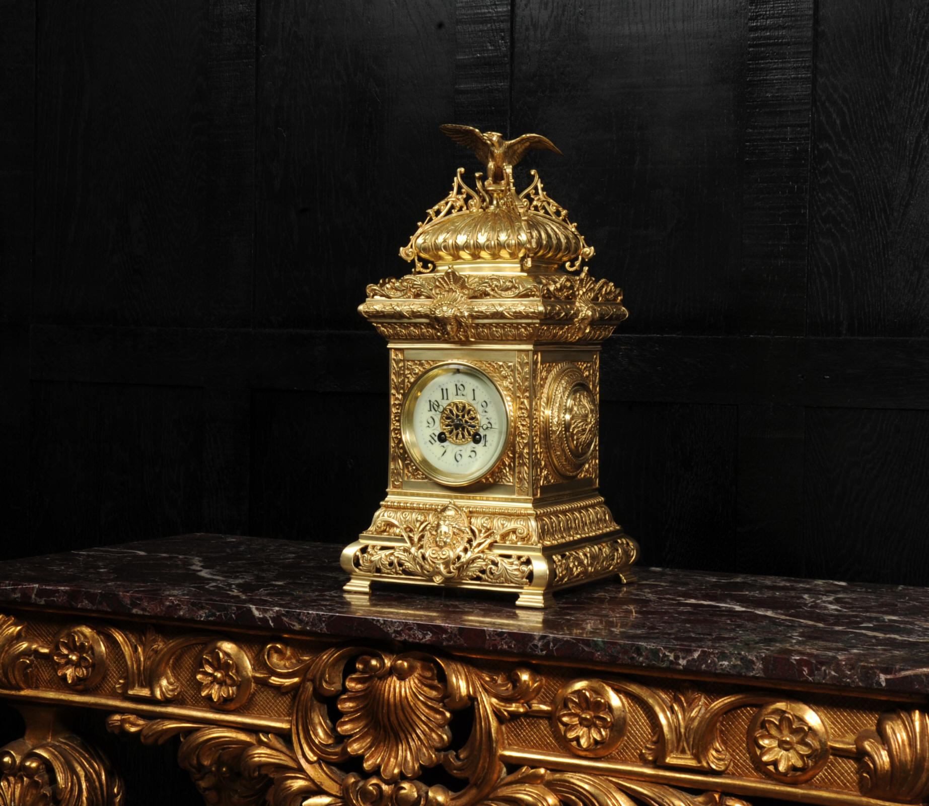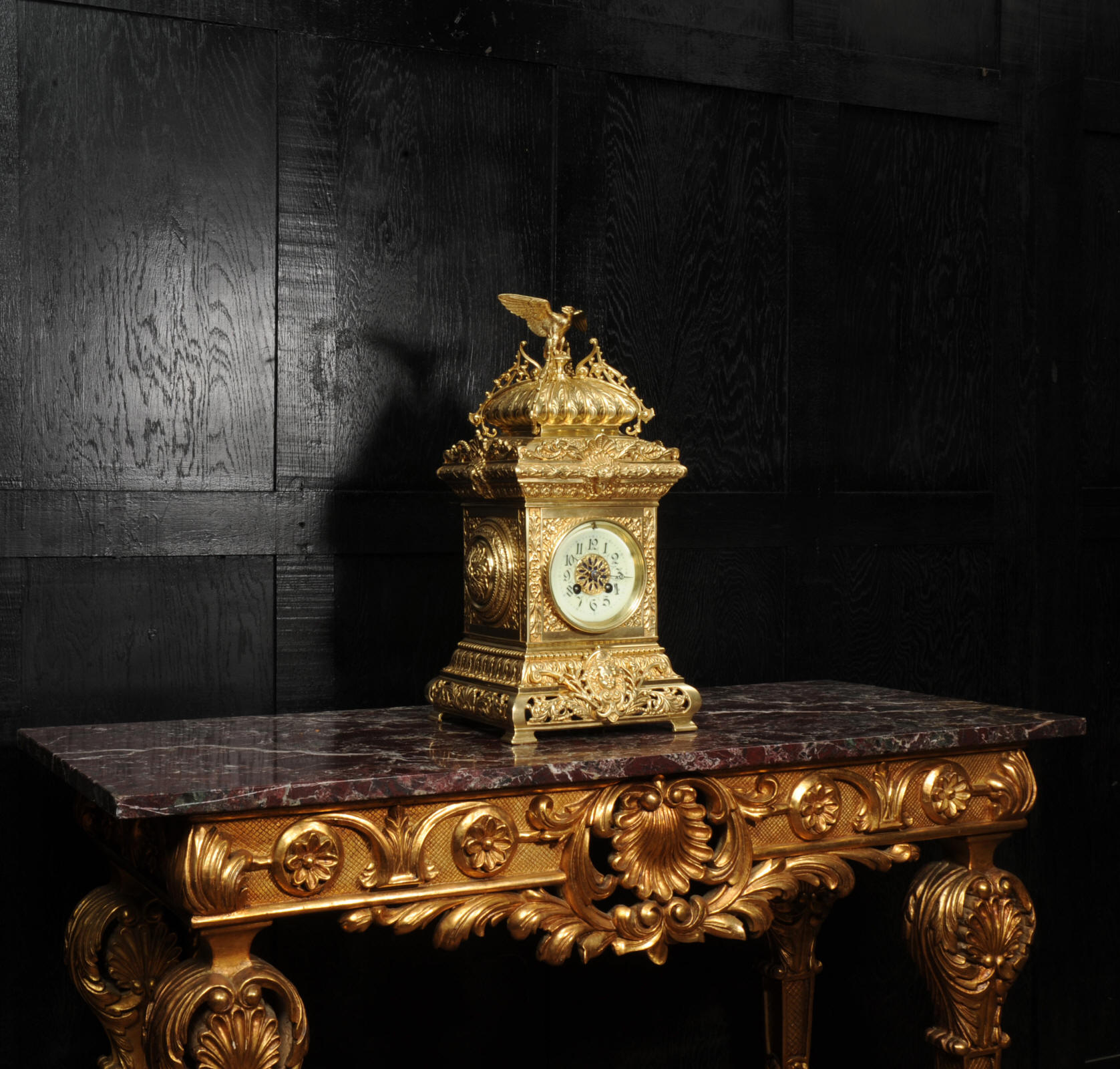 The dial porcelain enamel on copper with a blue center with gilt bronze fret work and blued steel hands. The French movement is of high quality and is in excellent clean and running condition having been fully overhauled by our clockmaker. Pendulum is a replacement. It runs for 8 days and strikes the hours and halves on a bell. Click the video below to hear the bell and watch the clock running. Condition of the case is excellent, the original gilding is beautifully clean and bright with just some slight wear and discolouration. The dial is also very good with just come hairlining near the ten o'clock.
