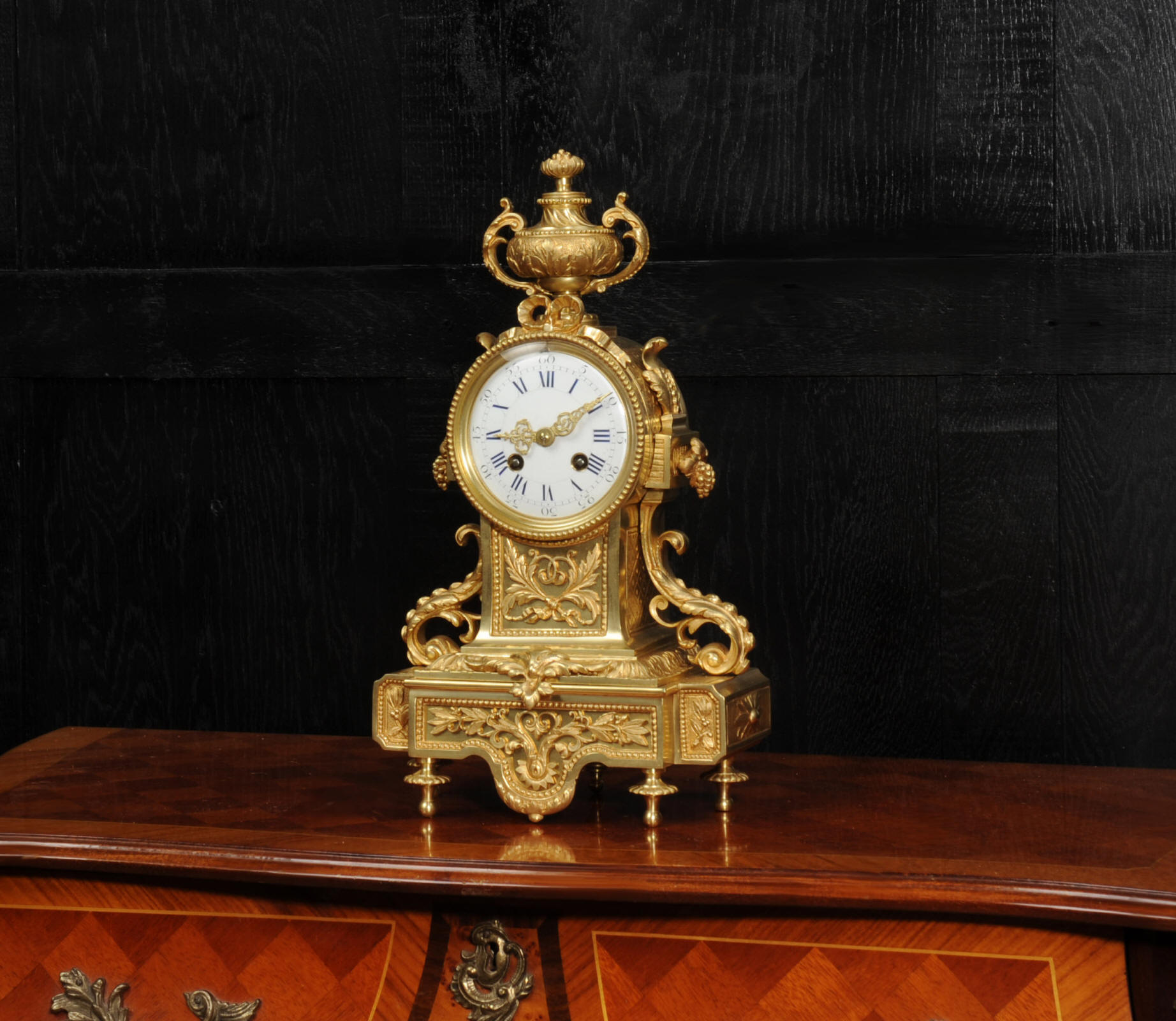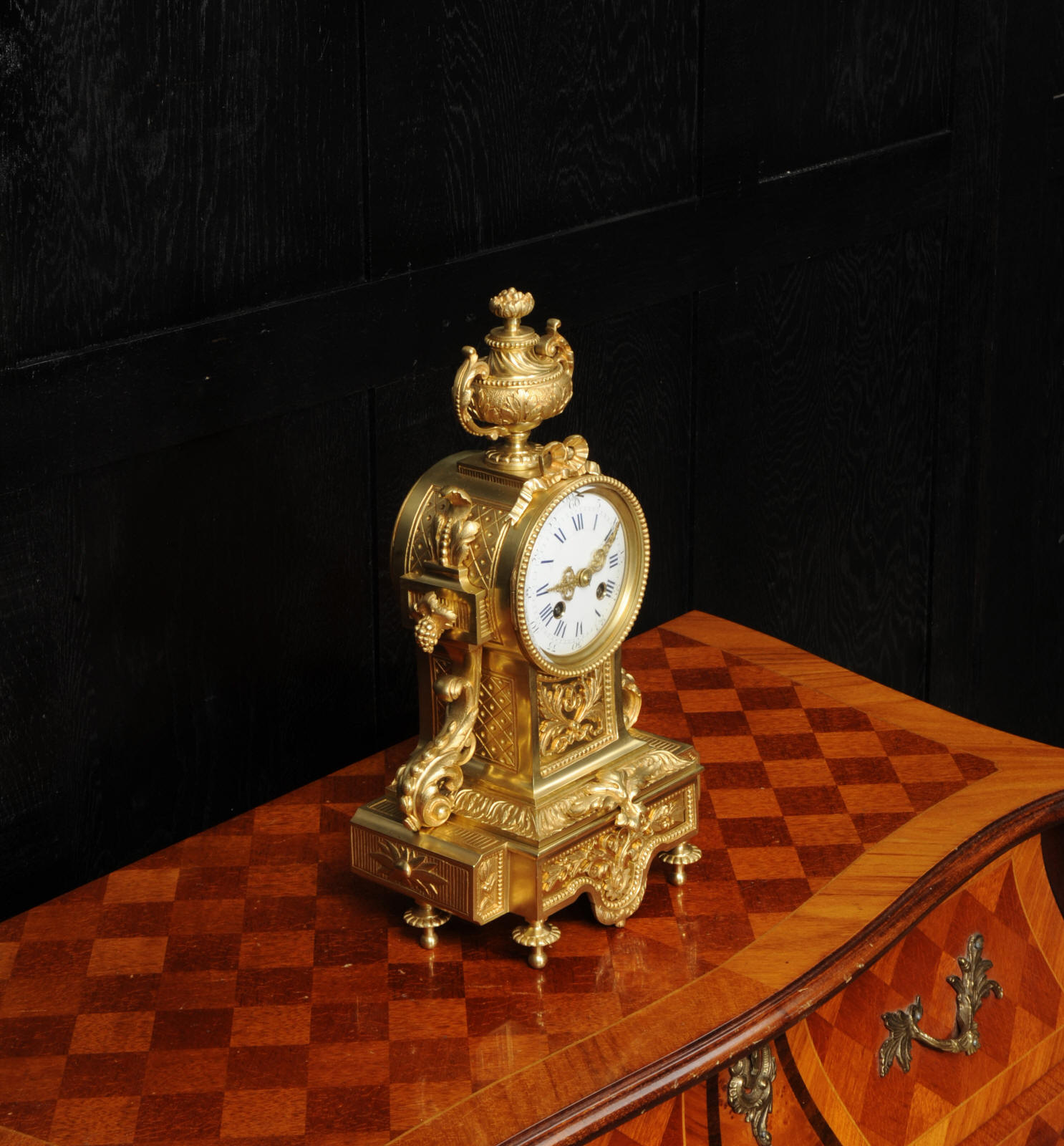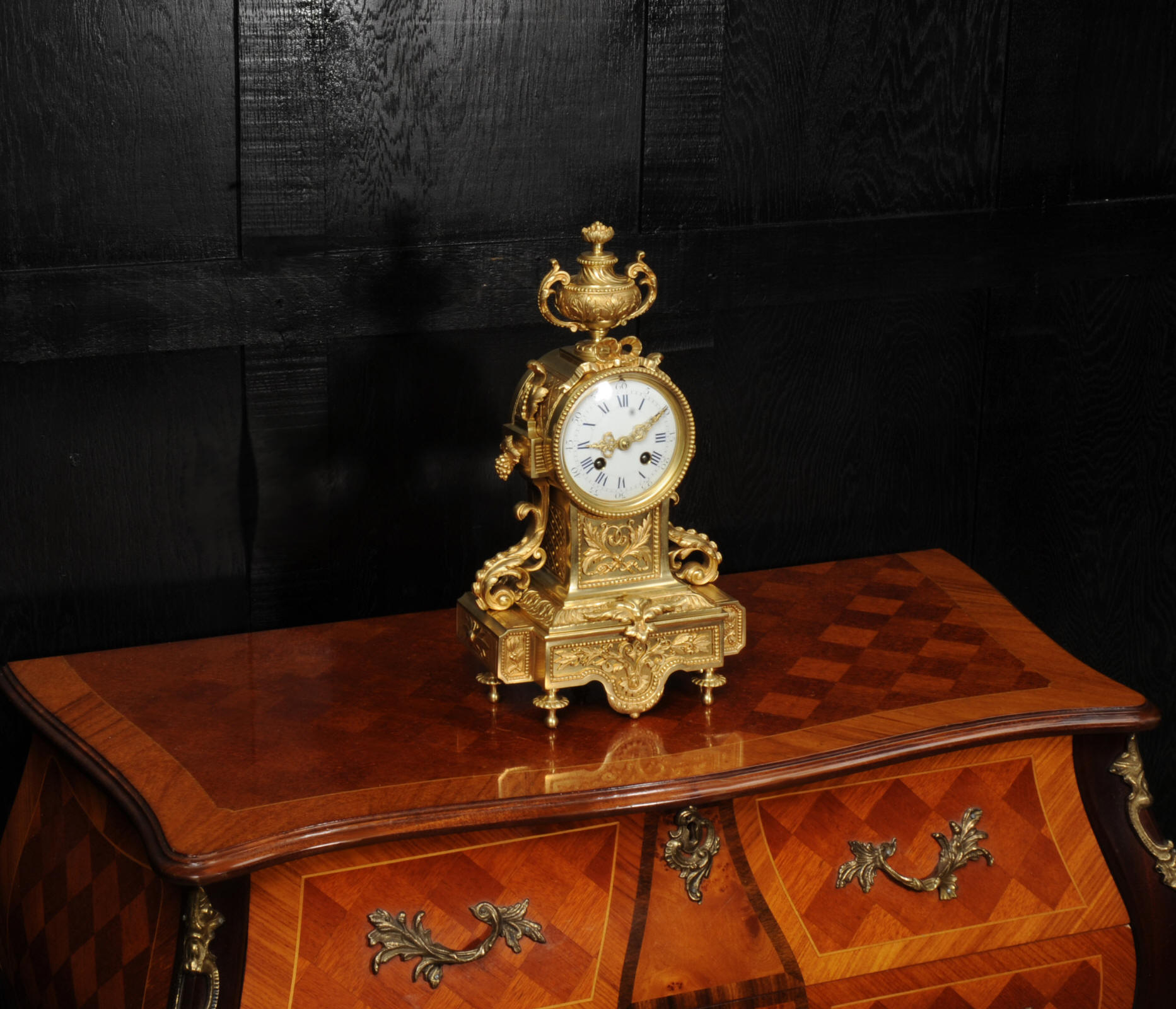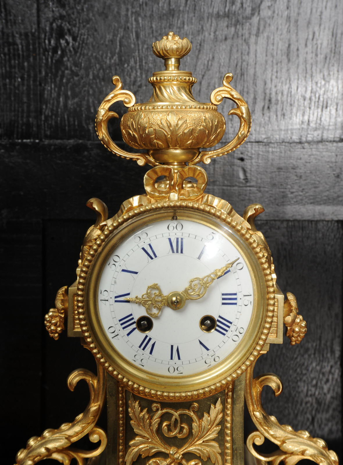 The beautiful dial is porcelain enamel on copper with blue lettering. It is complete with finely cut gilt brass hands and convex glass. The French movement is of high quality and is by A. D. Mougin. It is in excellent clean and running condition having been fully overhauled by our clockmaker. Pendulum is original. It runs for 8 days and strikes the hours and halves on a bell. Click the video to hear the bell and watch the clock running. Condition of the case is excellent, the original gilding is beautifully clean and bright with hardly any wear or discolouration. The dial is also in excellent condition with no damage.