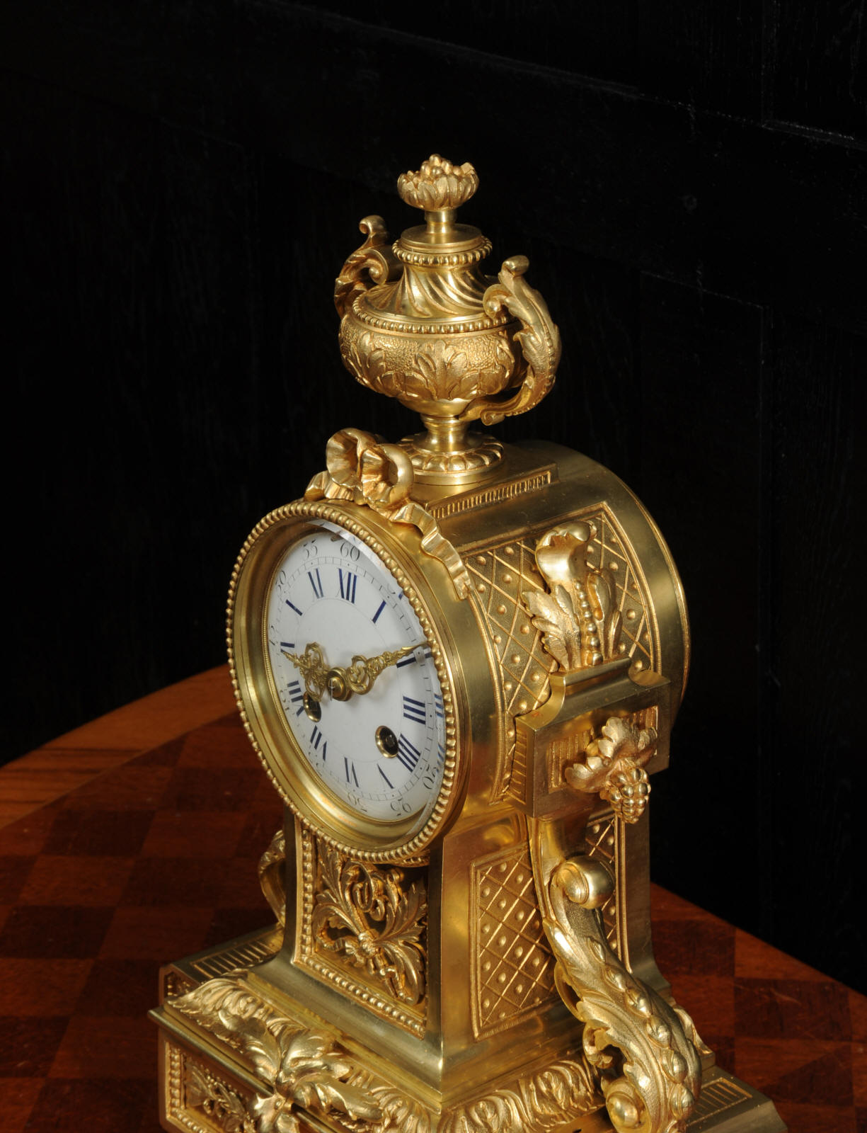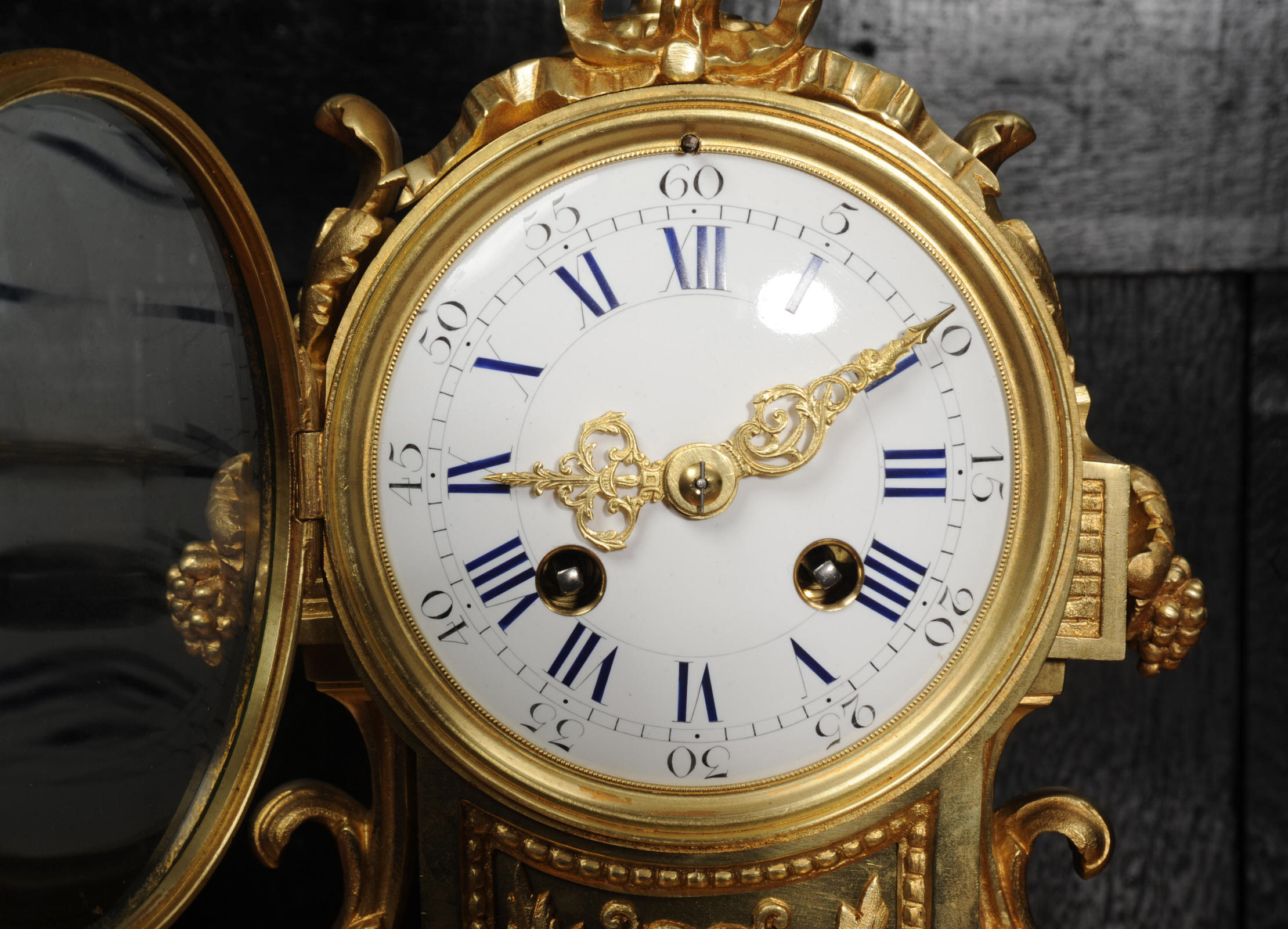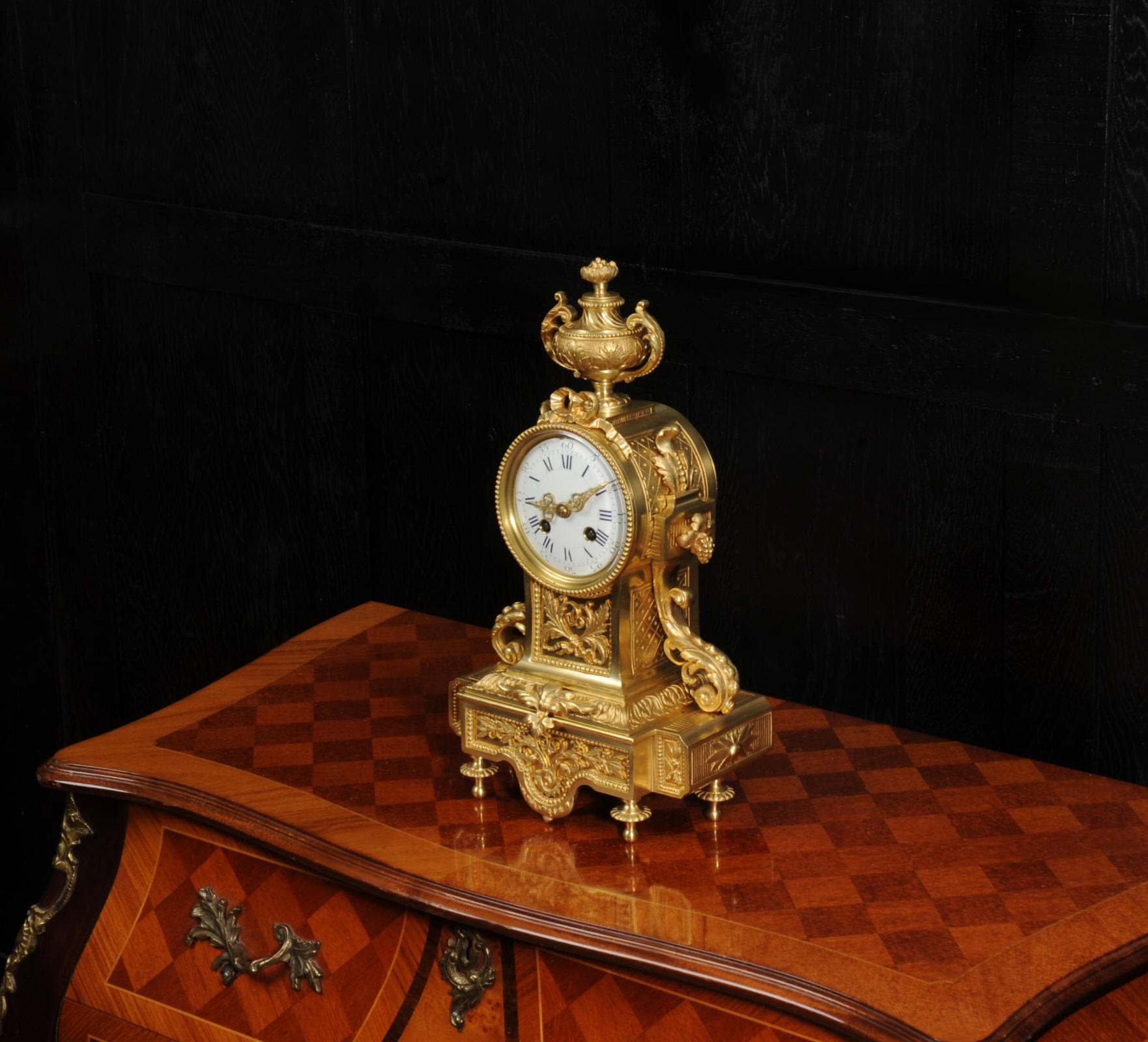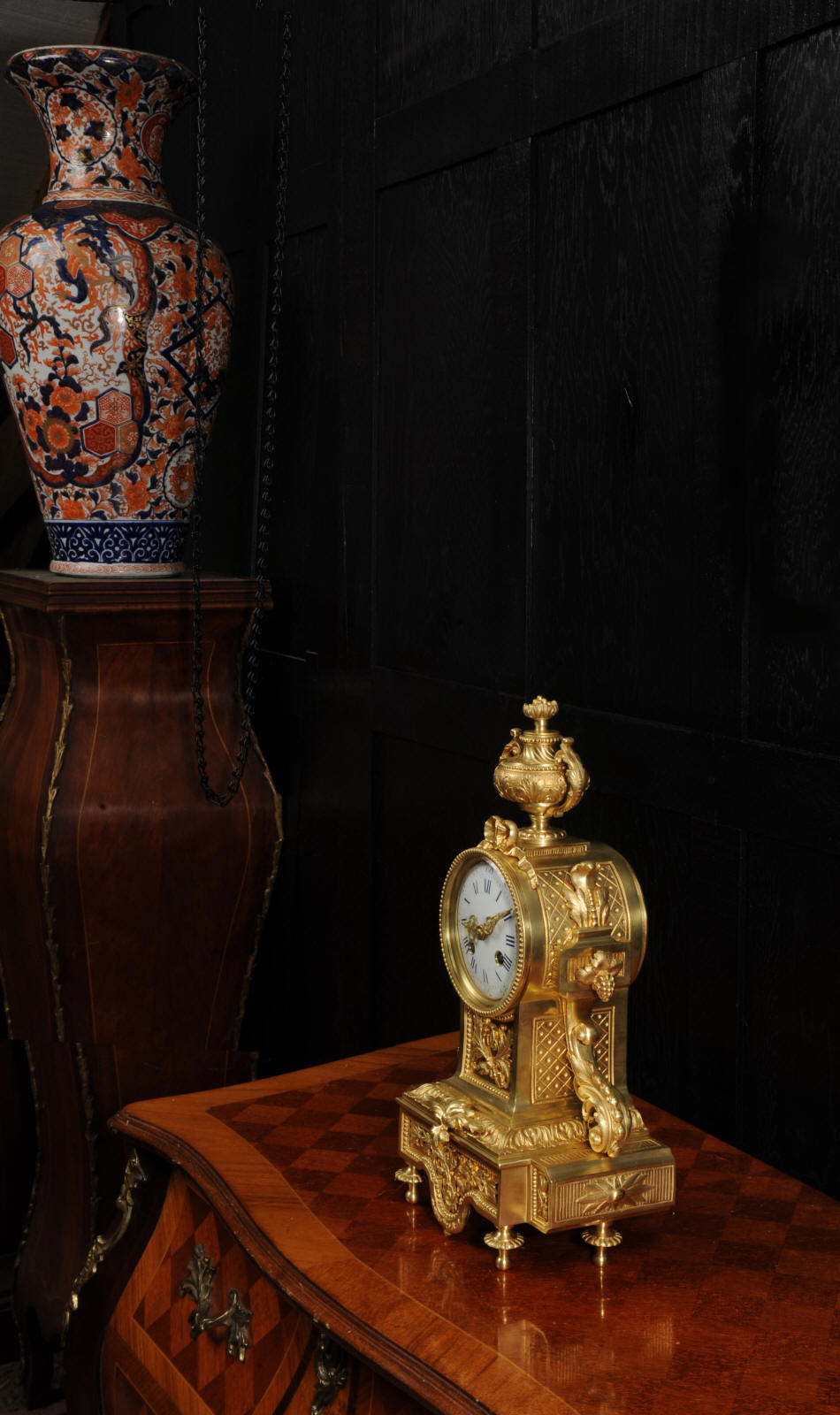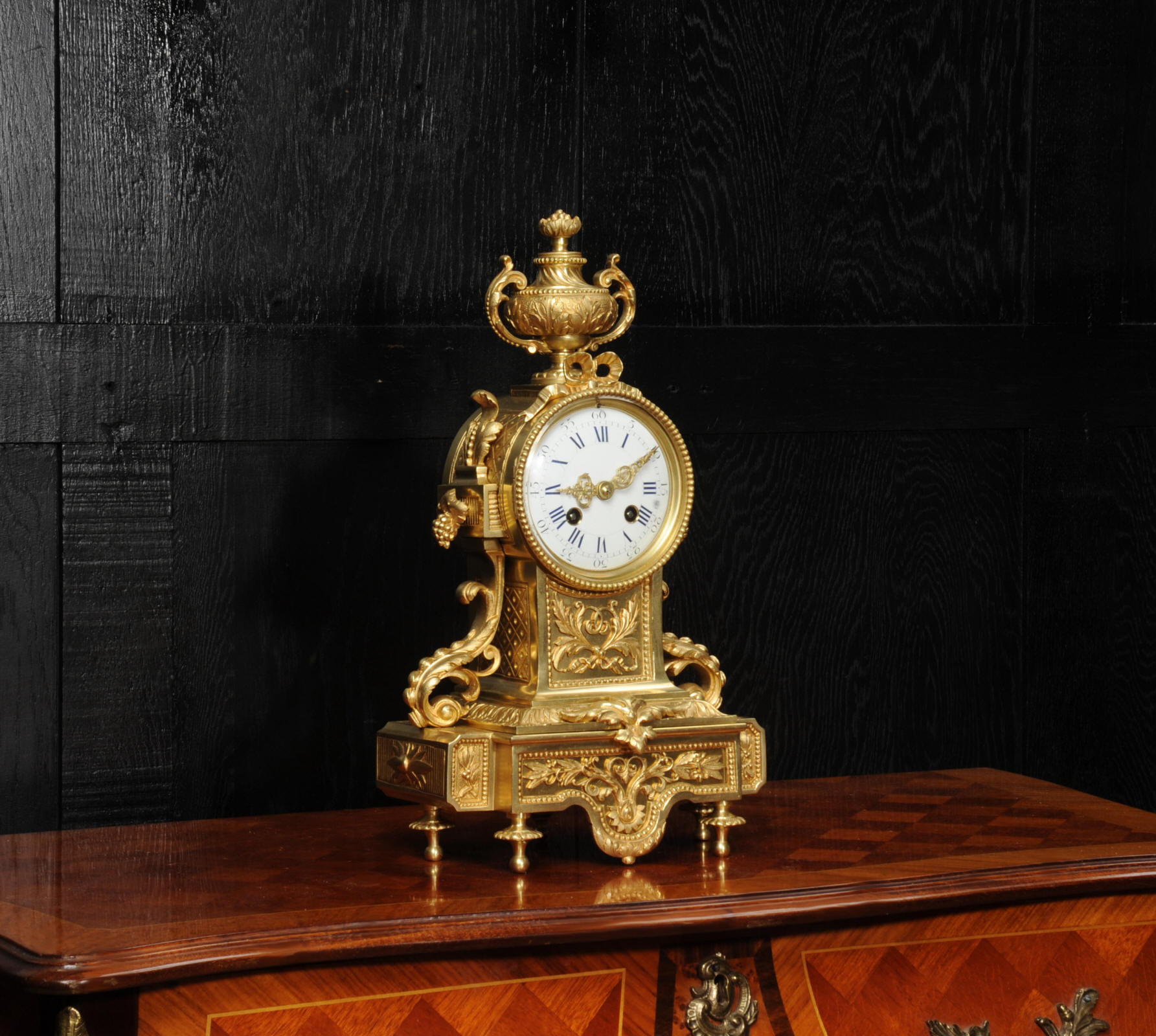The beautiful dial is porcelain enamel on copper with blue lettering. It is complete with finely cut gilt brass hands and convex glass. The French movement is of high quality and is by A. D. Mougin. It is in excellent clean and running condition having been fully overhauled by our clockmaker. Pendulum is original. It runs for 8 days and strikes the hours and halves on a bell. Click the video to hear the bell and watch the clock running. Condition of the case is excellent, the original gilding is beautifully clean and bright with hardly any wear or discolouration. The dial is also in excellent condition with no damage.