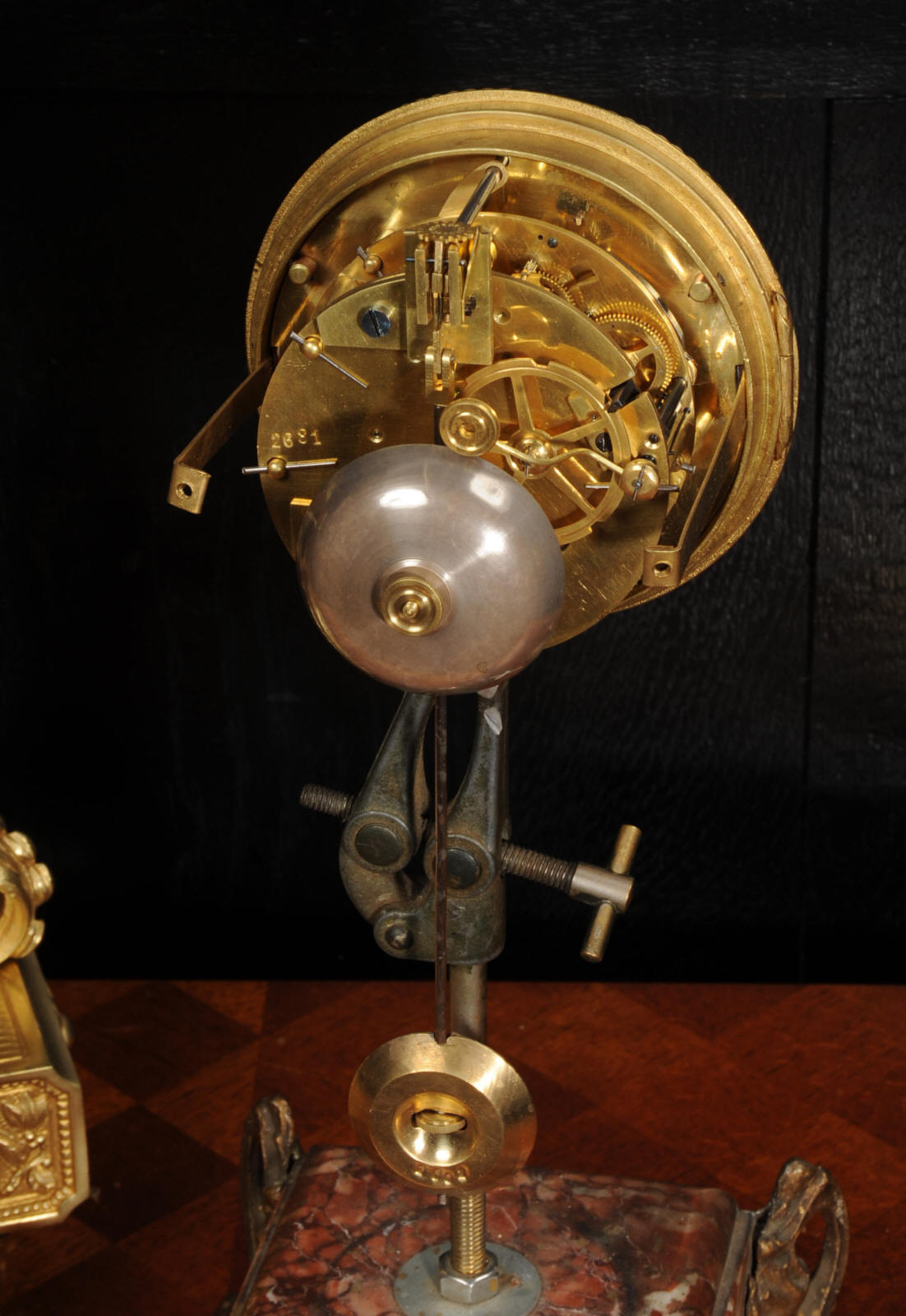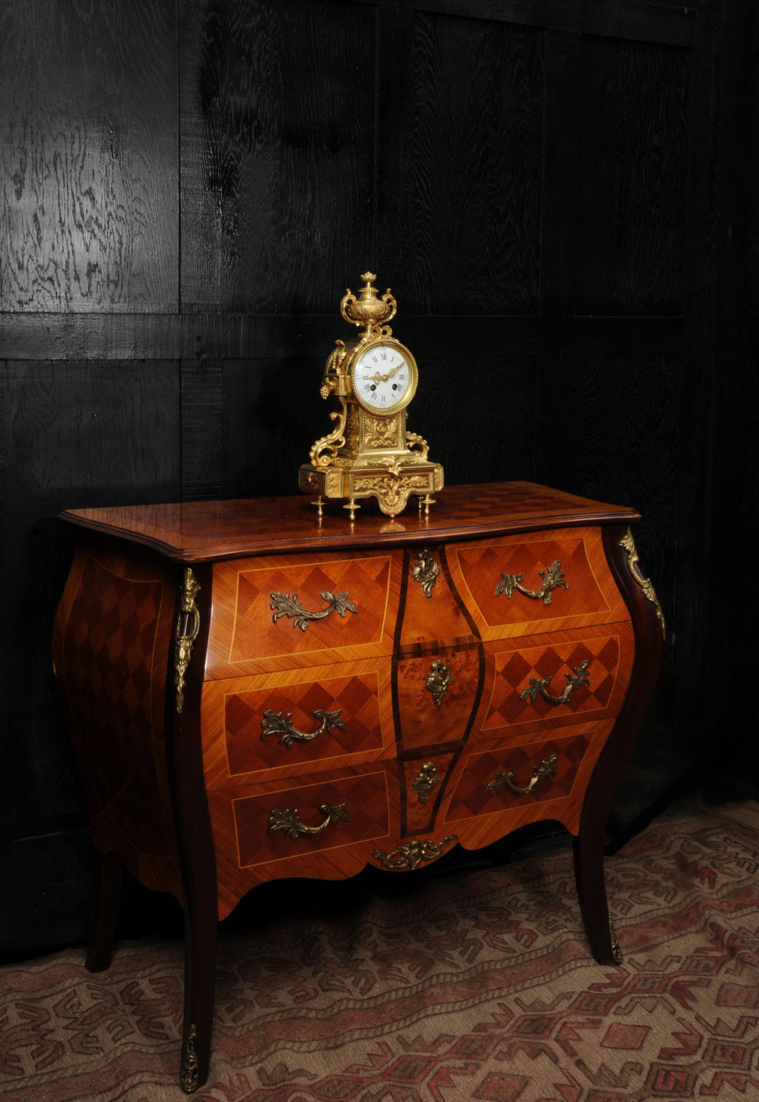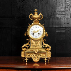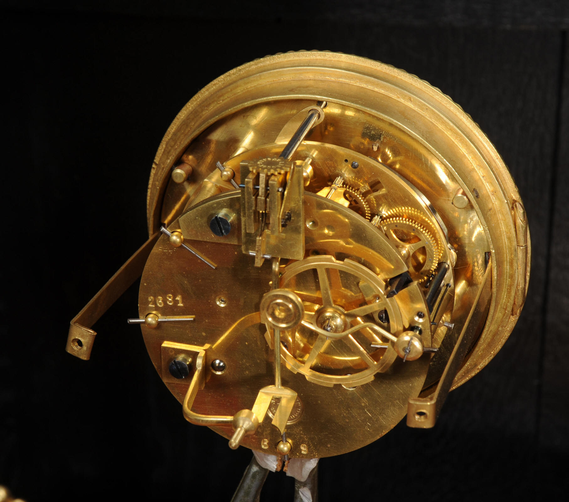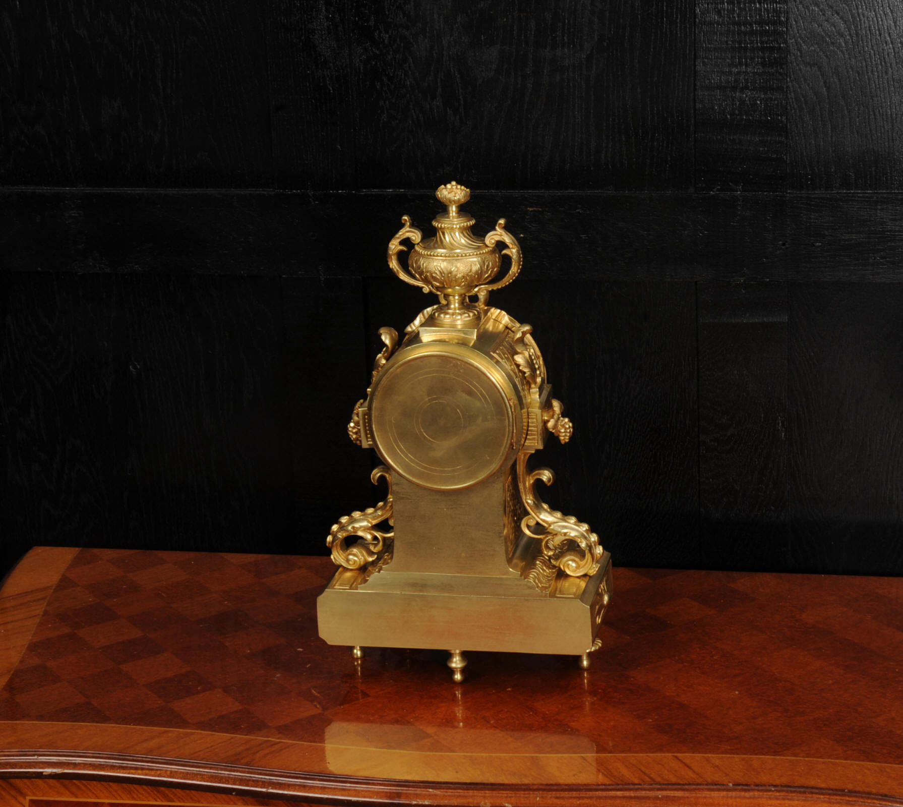 The beautiful dial is porcelain enamel on copper with blue lettering. It is complete with finely cut gilt brass hands and convex glass. The French movement is of high quality and is by A. D. Mougin. It is in excellent clean and running condition having been fully overhauled by our clockmaker. Pendulum is original. It runs for 8 days and strikes the hours and halves on a bell. Click the video to hear the bell and watch the clock running. Condition of the case is excellent, the original gilding is beautifully clean and bright with hardly any wear or discolouration. The dial is also in excellent condition with no damage.