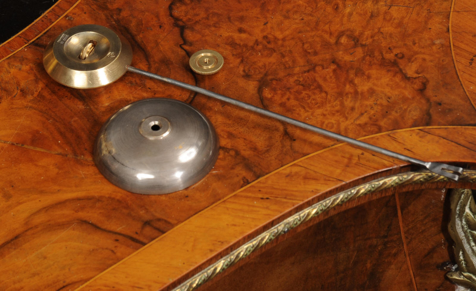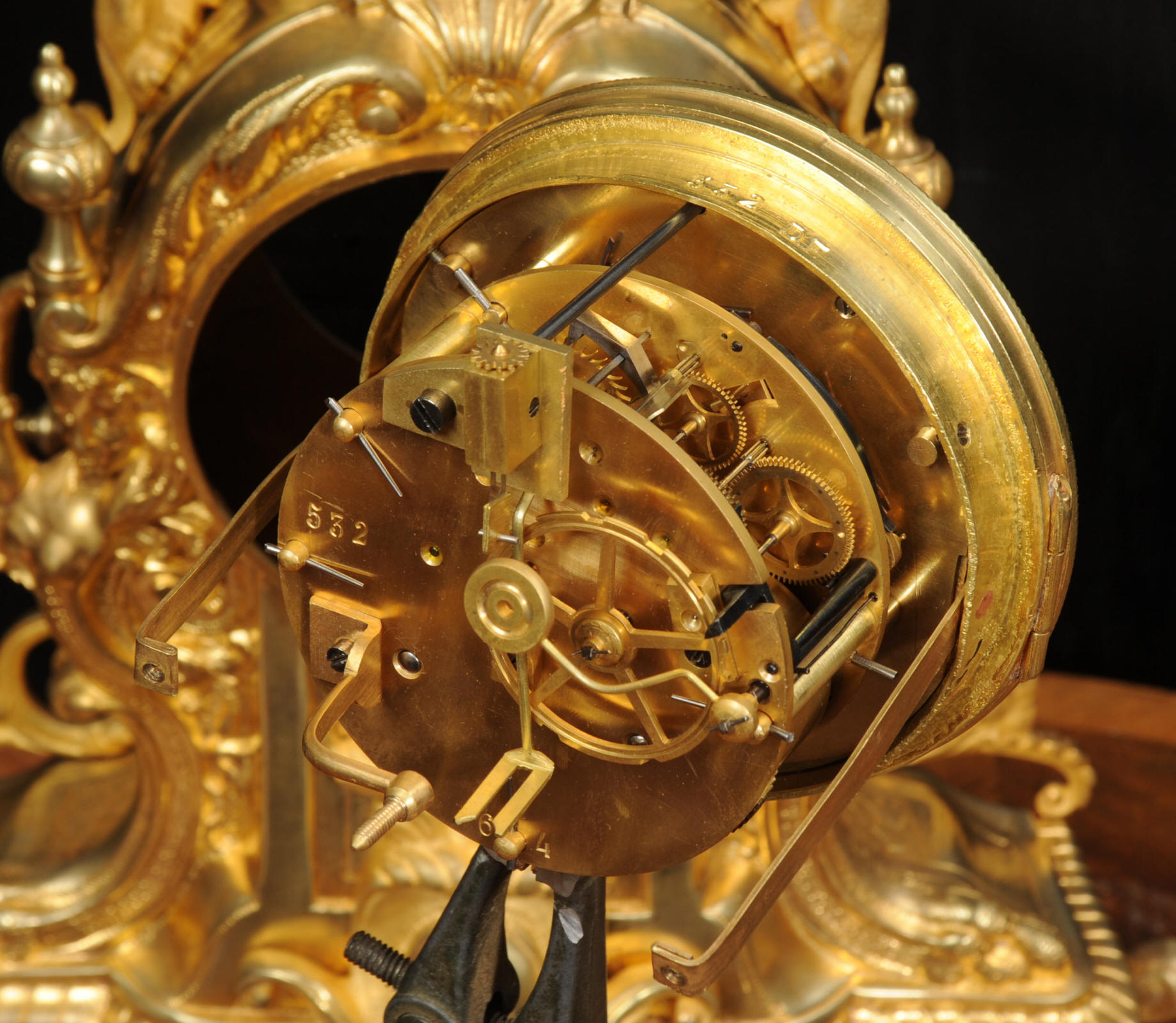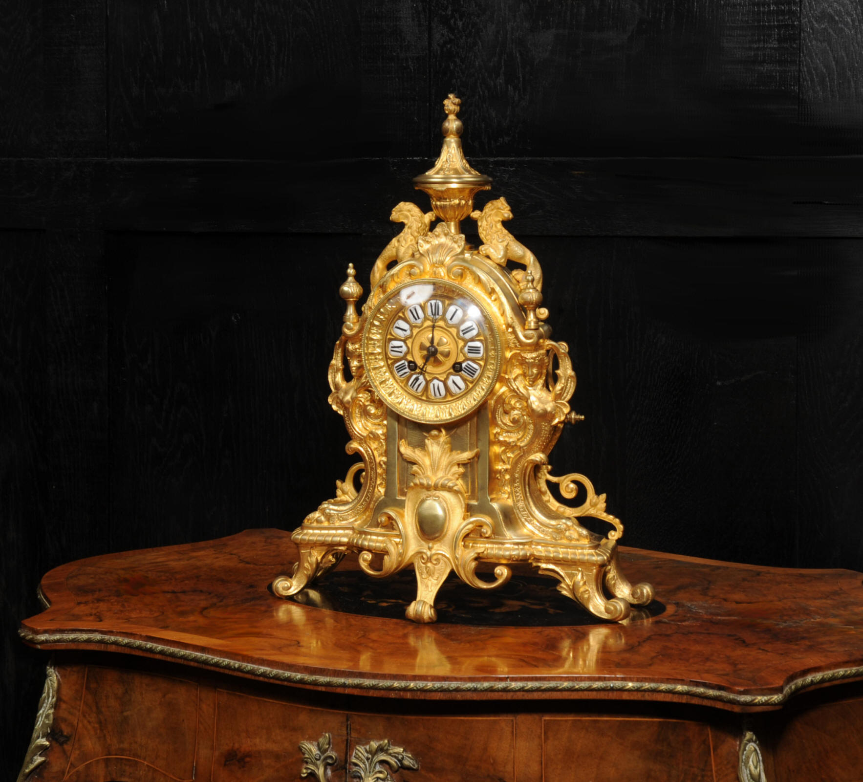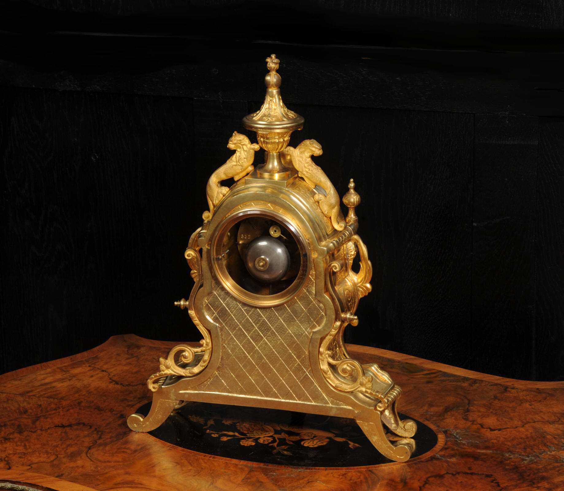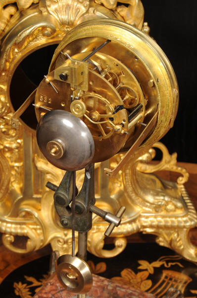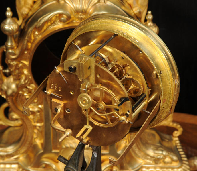 The dial is also bronze ormolu with 12 individual enamel cartouches, blued steel hands and convex glass. The rear door is also glazed to allow the movement to be seen. The French movement is of high quality and is in excellent clean and running condition having been fully overhauled by our clockmaker. Pendulum is a replacement. It runs for 8 days and strikes the hours and halves on a bell. Click the video to hear the bell and watch the clock running.