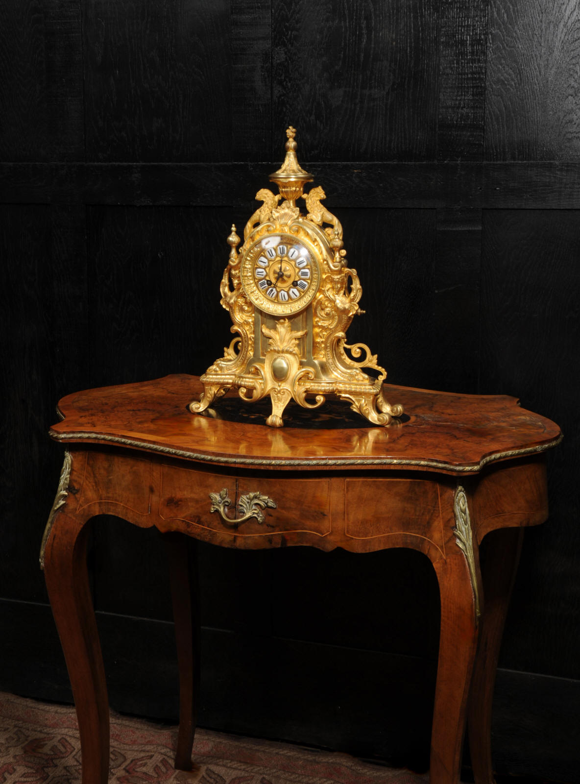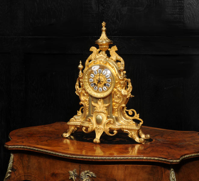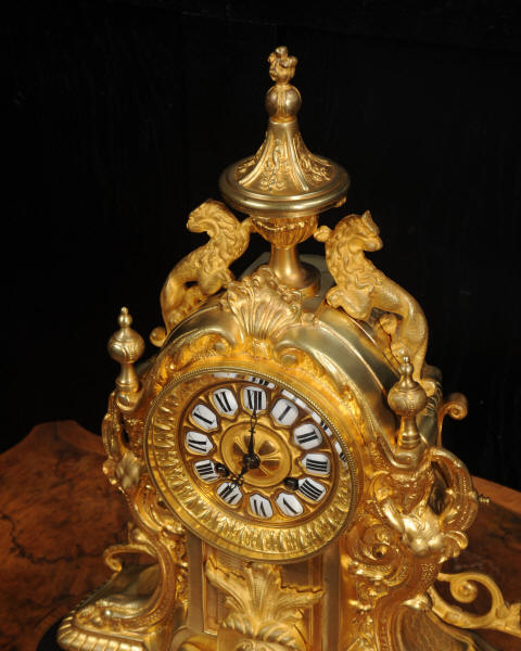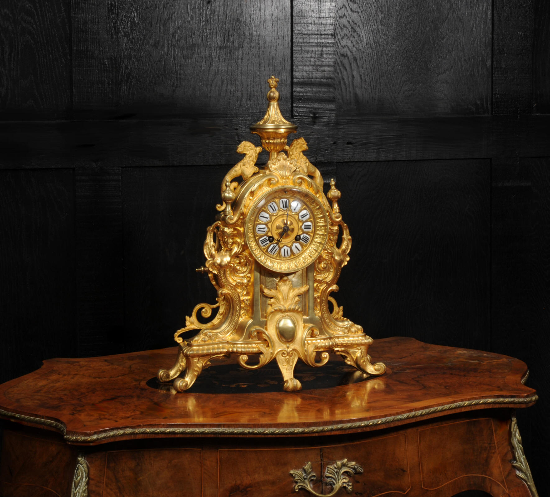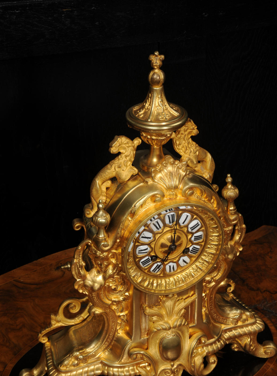 The dial is also bronze ormolu with 12 individual enamel cartouches, blued steel hands and convex glass. The rear door is also glazed to allow the movement to be seen. The French movement is of high quality and is in excellent clean and running condition having been fully overhauled by our clockmaker. Pendulum is a replacement. It runs for 8 days and strikes the hours and halves on a bell. Click the video to hear the bell and watch the clock running.
