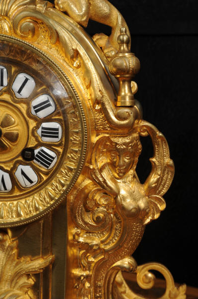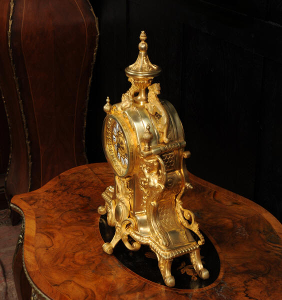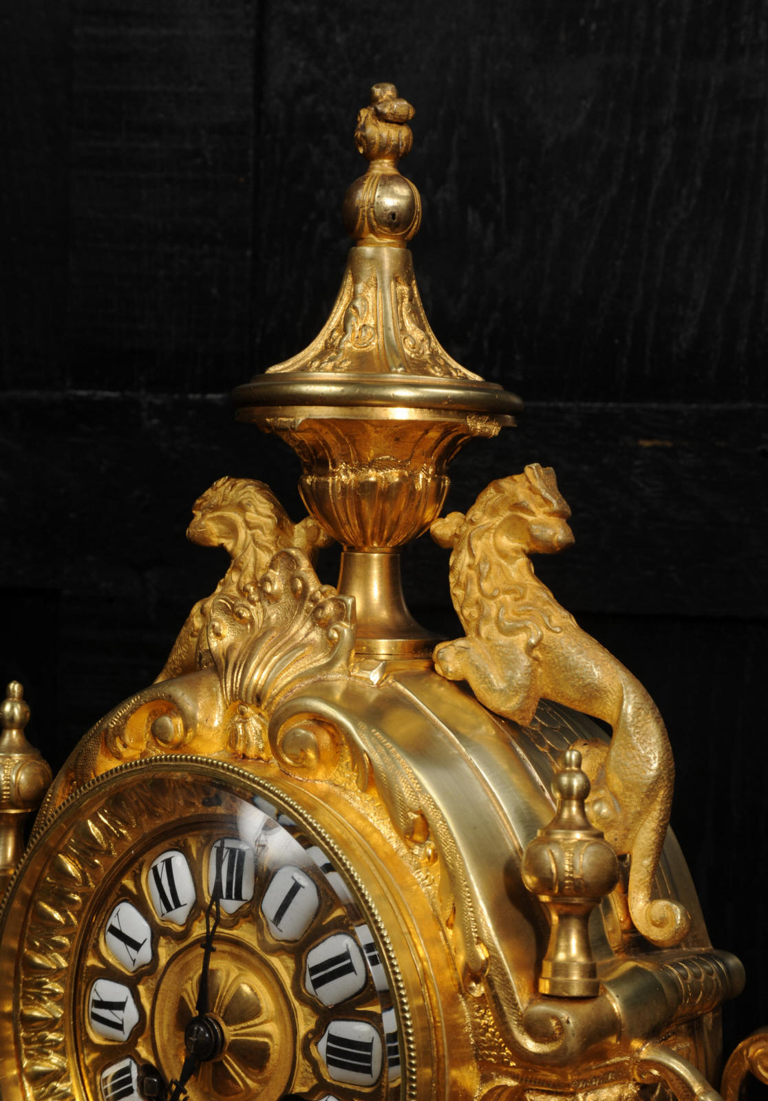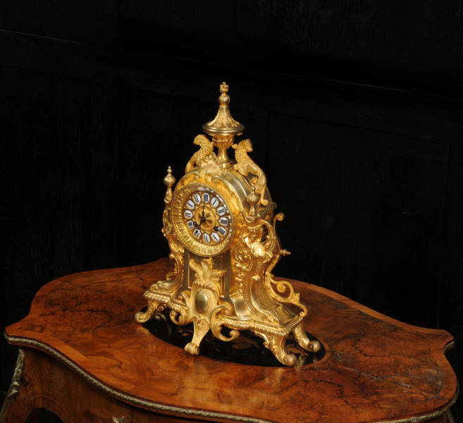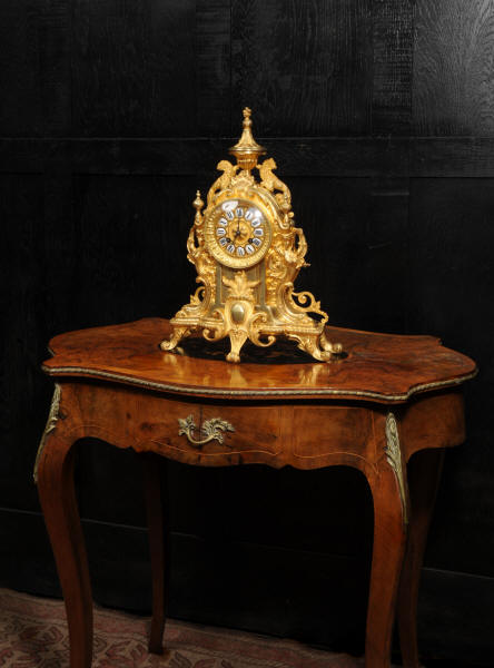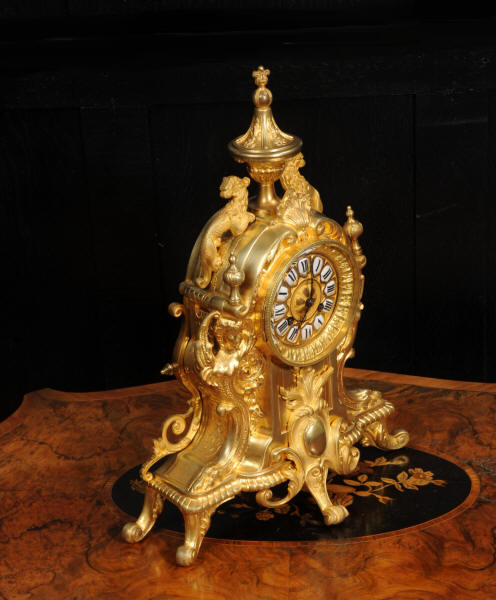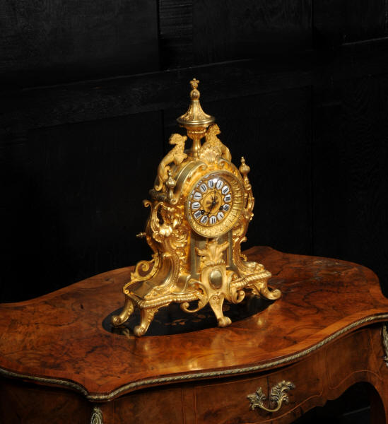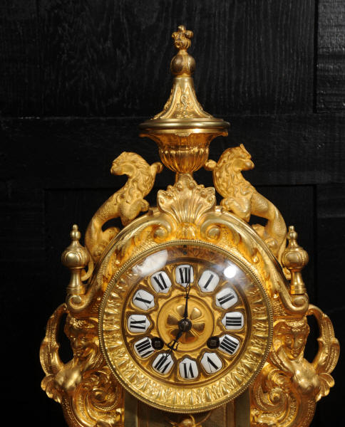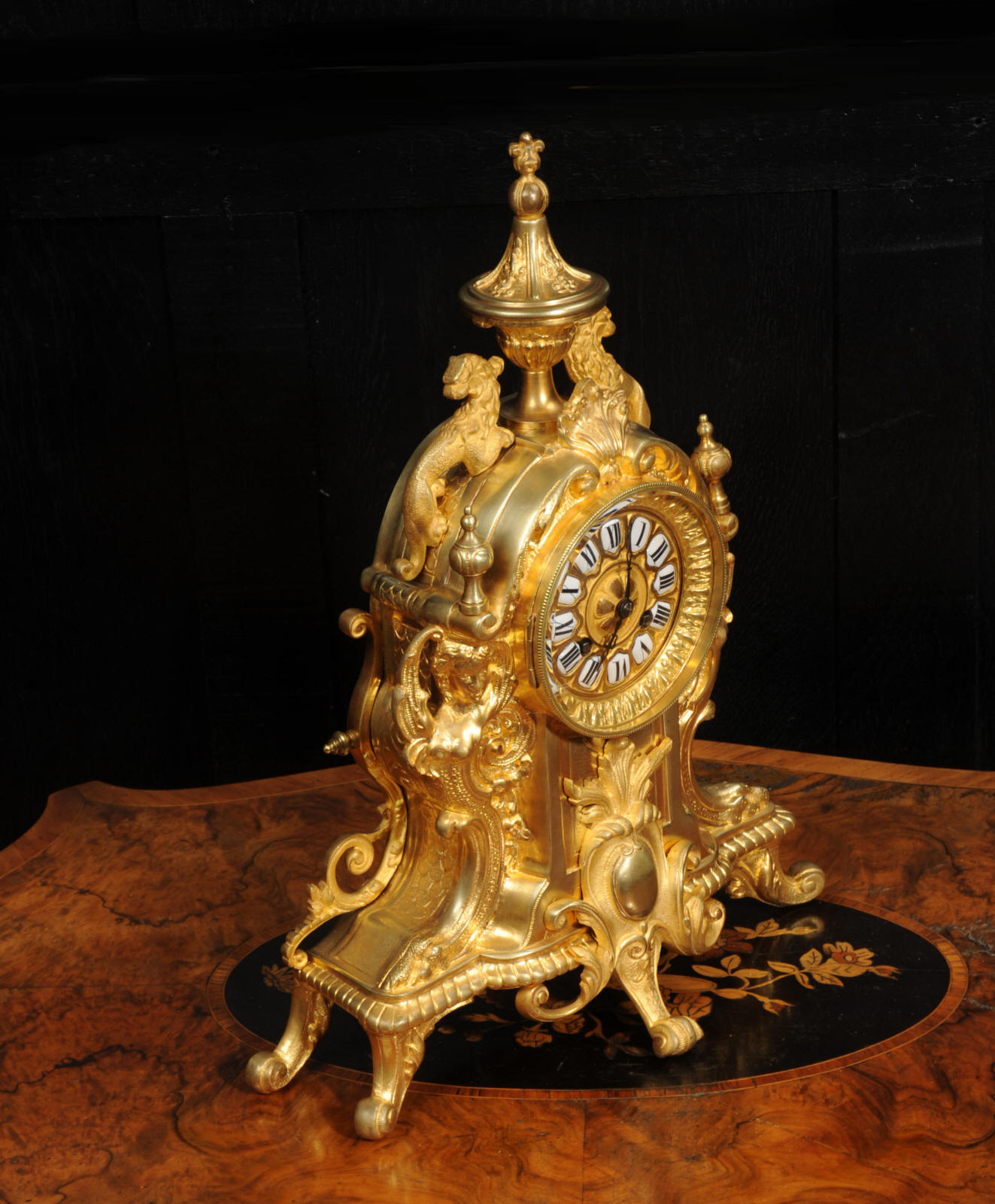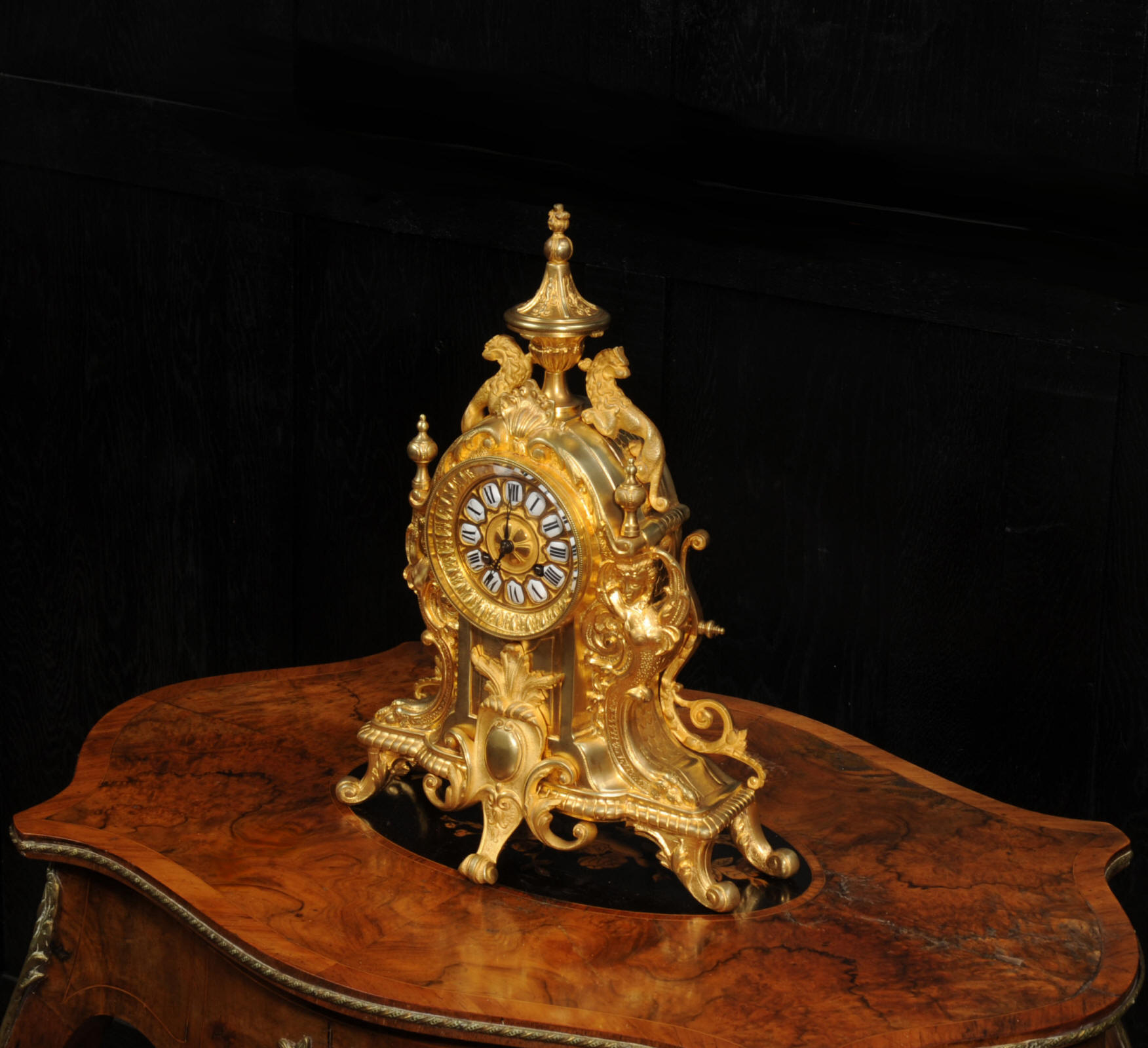 The dial is also bronze ormolu with 12 individual enamel cartouches, blued steel hands and convex glass. The rear door is also glazed to allow the movement to be seen. The French movement is of high quality and is in excellent clean and running condition having been fully overhauled by our clockmaker. Pendulum is a replacement. It runs for 8 days and strikes the hours and halves on a bell. Click the video to hear the bell and watch the clock running.