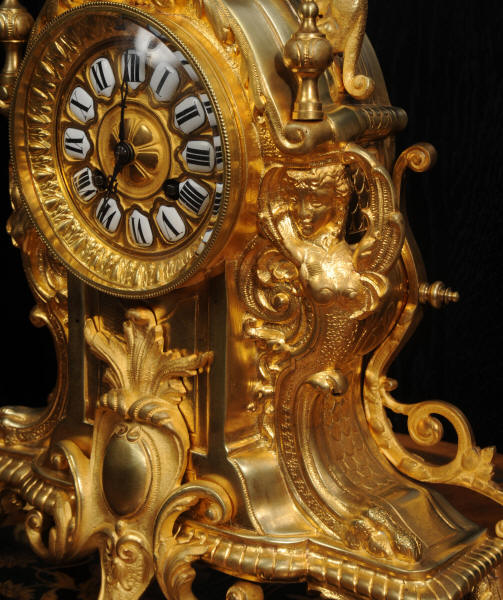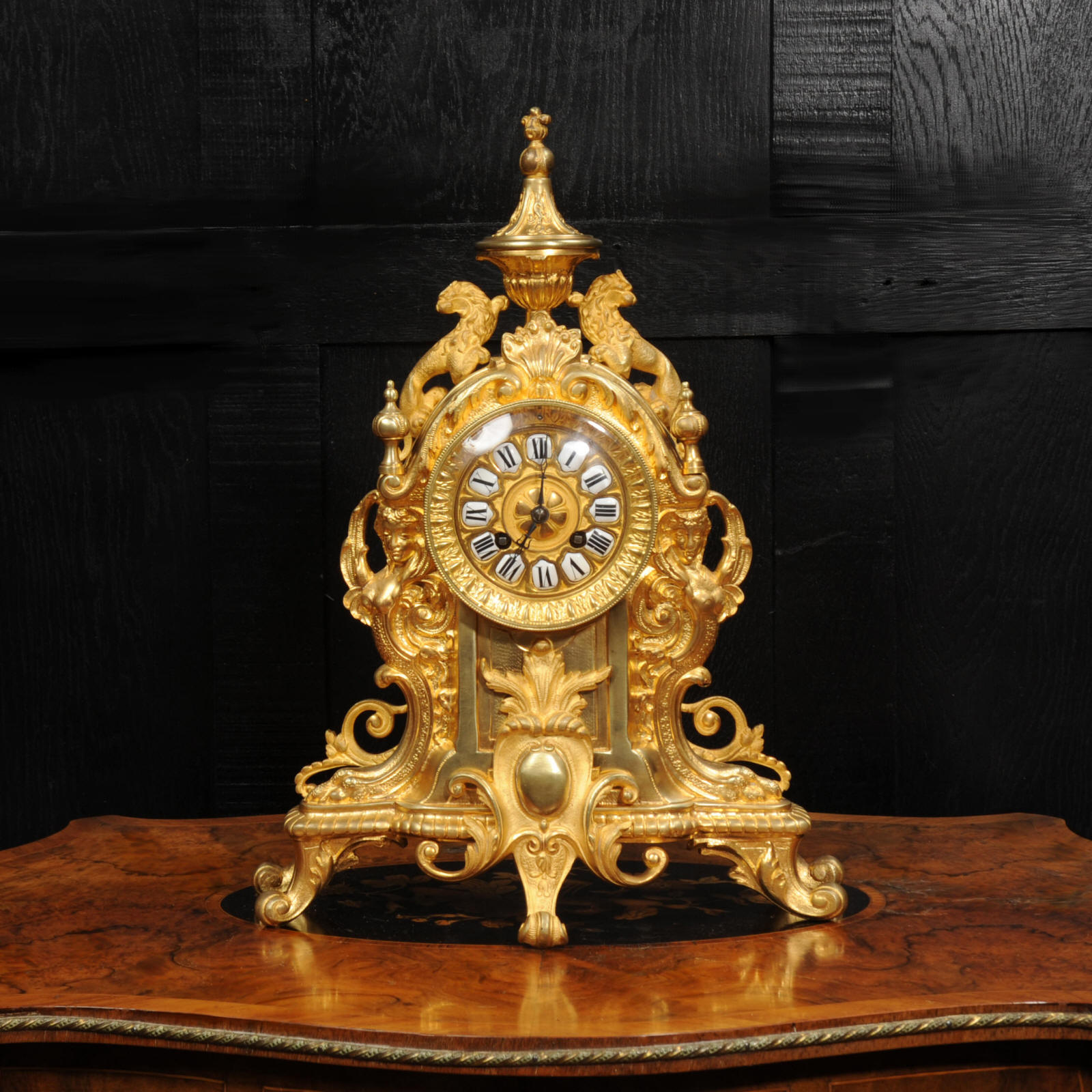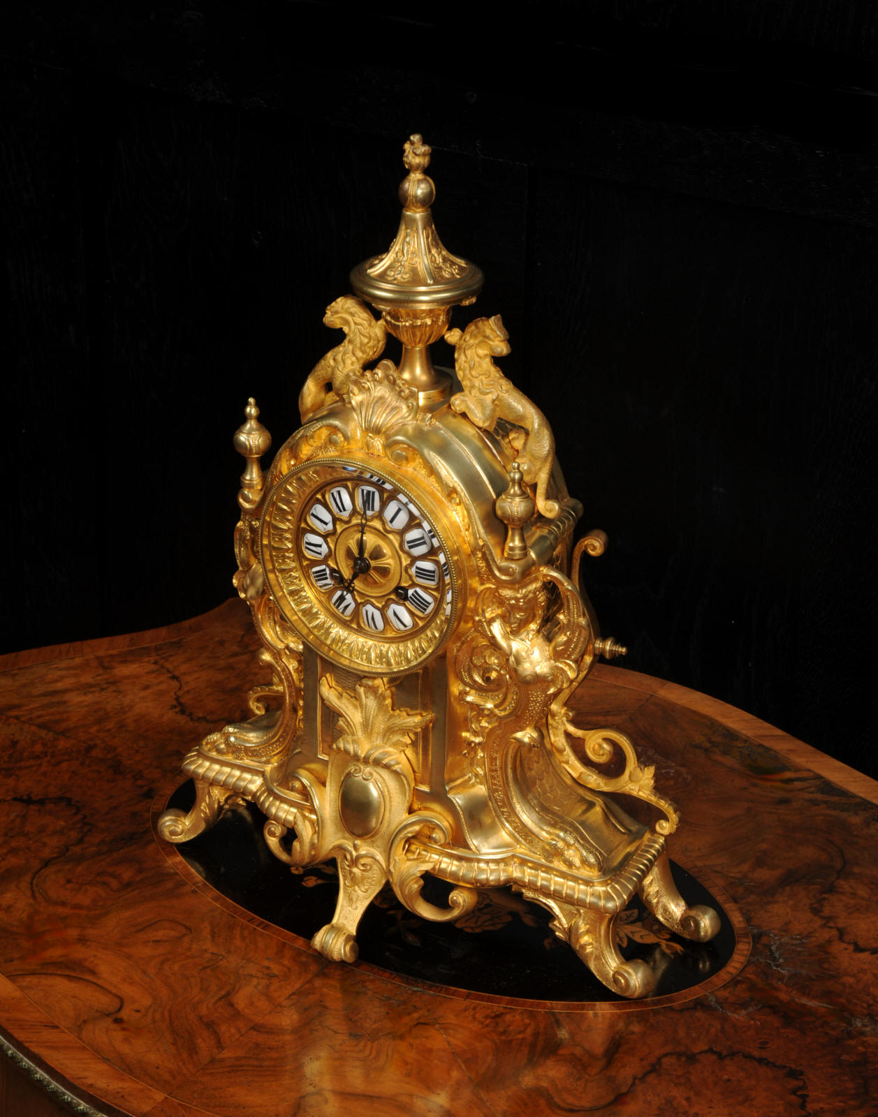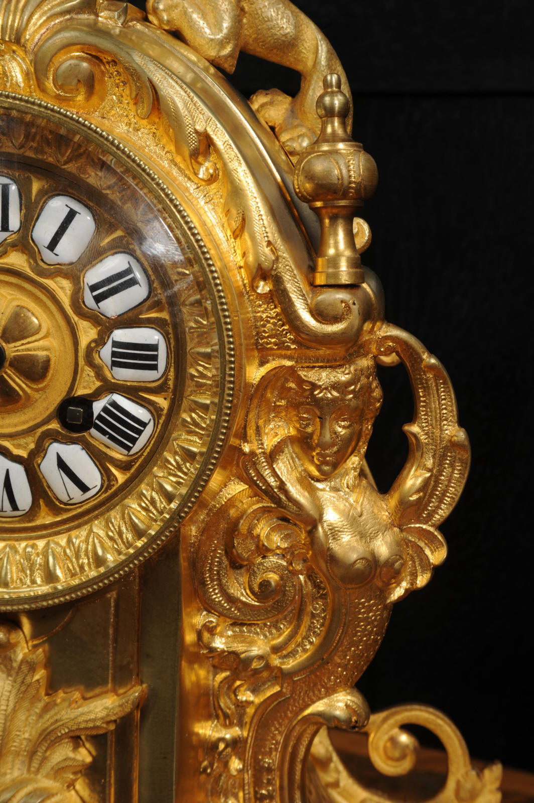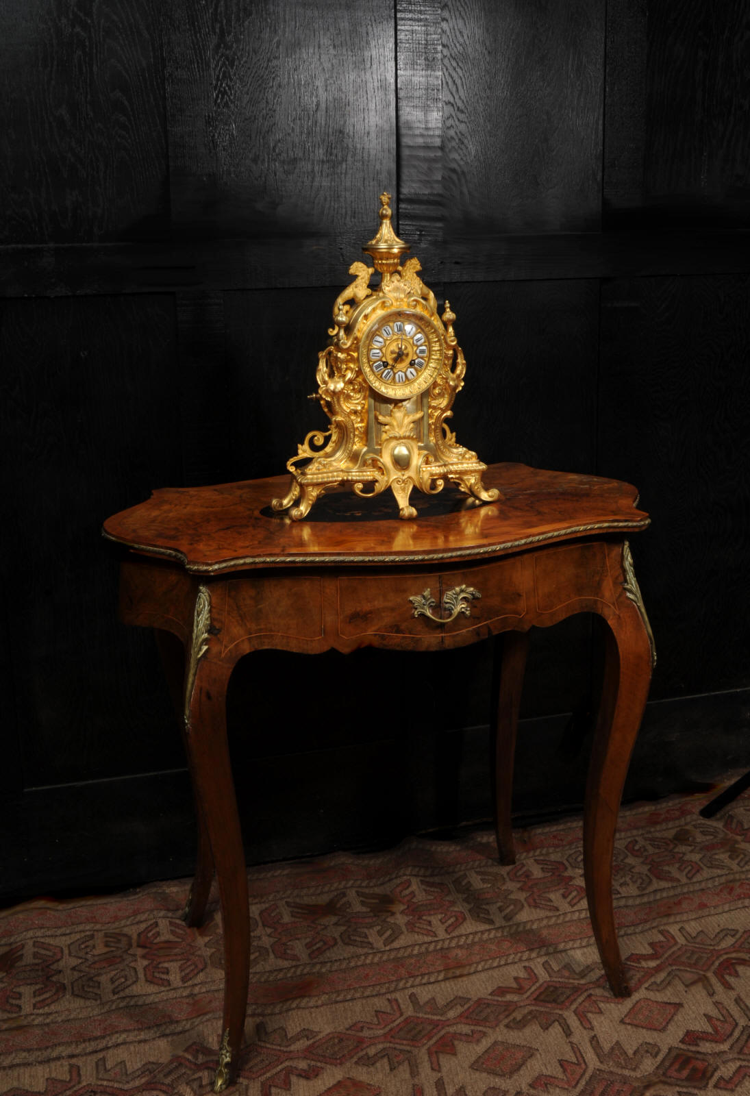 The dial is also bronze ormolu with 12 individual enamel cartouches, blued steel hands and convex glass. The rear door is also glazed to allow the movement to be seen. The French movement is of high quality and is in excellent clean and running condition having been fully overhauled by our clockmaker. Pendulum is a replacement. It runs for 8 days and strikes the hours and halves on a bell. Click the video to hear the bell and watch the clock running.