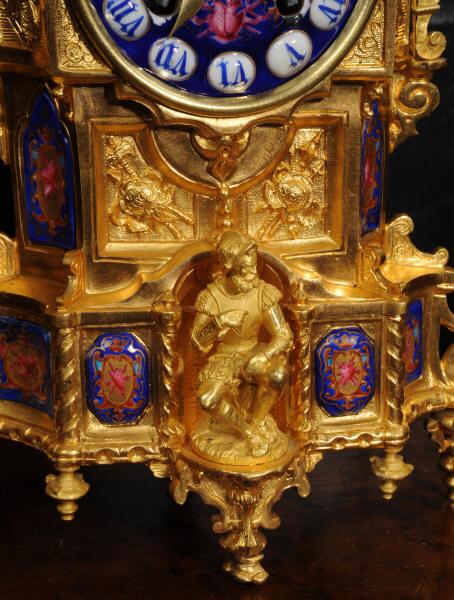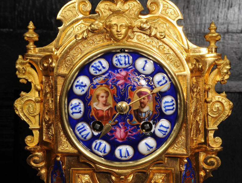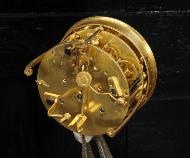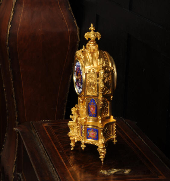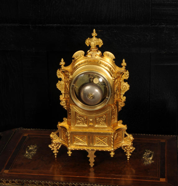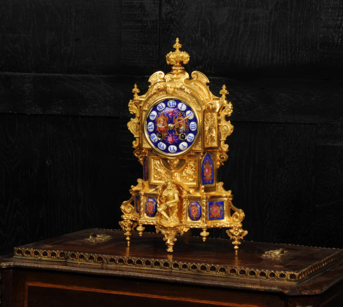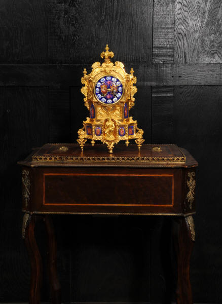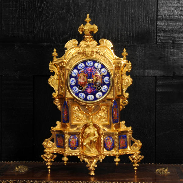 The dial lettered in gothic script and is complete with its original fine brass hands. The rear door is glazed with convex glass to allow the movement to be seen. Please note that this type of clock does not have a front bezel. The French movement is of high quality and is by Vincenti. It is in excellent clean and running condition having been fully overhauled by our clockmaker. Pendulum is original. It runs for 8 days and strikes the hours and halves on a bell. Click the video below to hear the bell and watch the clock running. Condition of the case is excellent, the original gilding is beautifully clean and bright with occasional areas of wear and discolouration. Condition of the porcelain is good, the bottom left panel has some cracking and old restoration. the dial has some chipping around the winding holes.