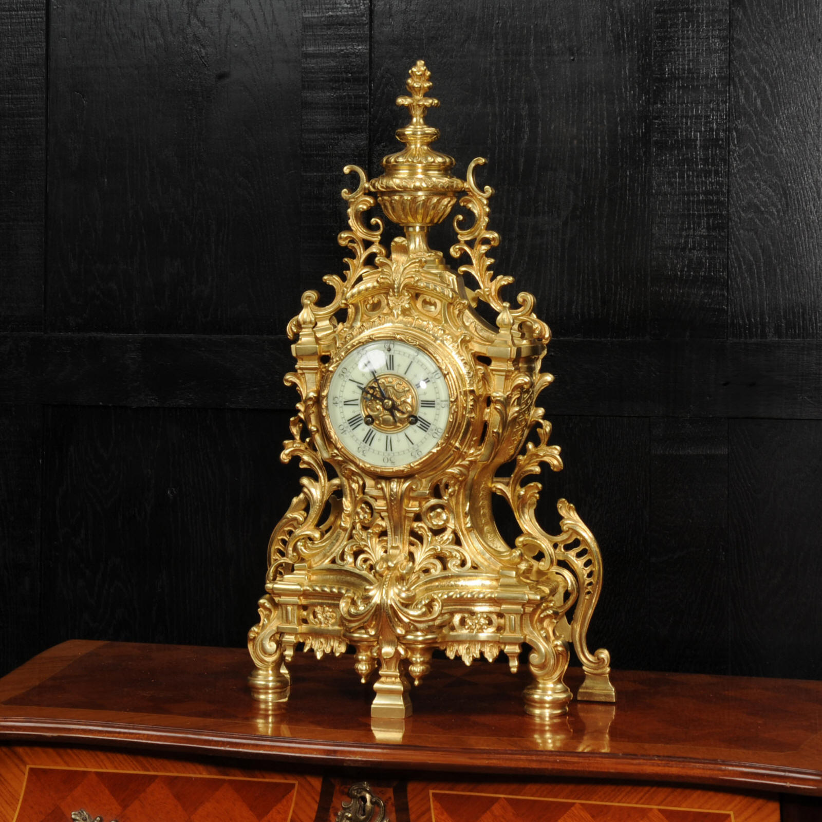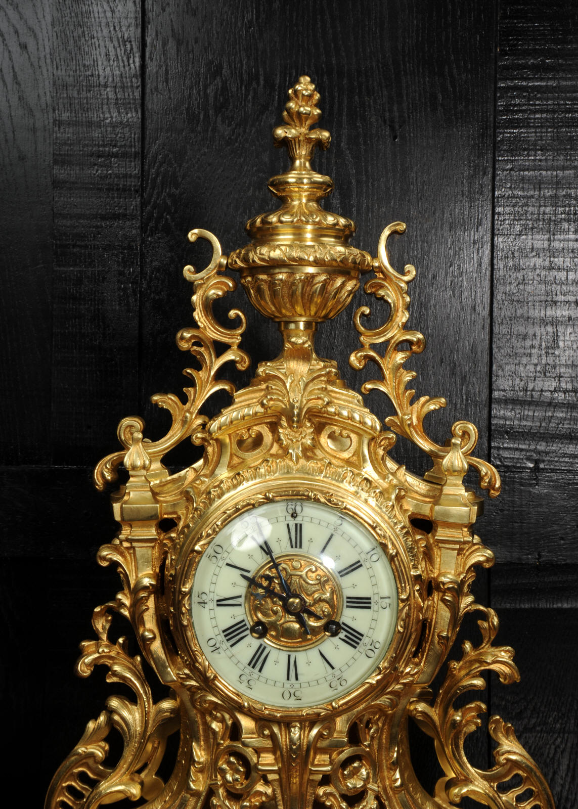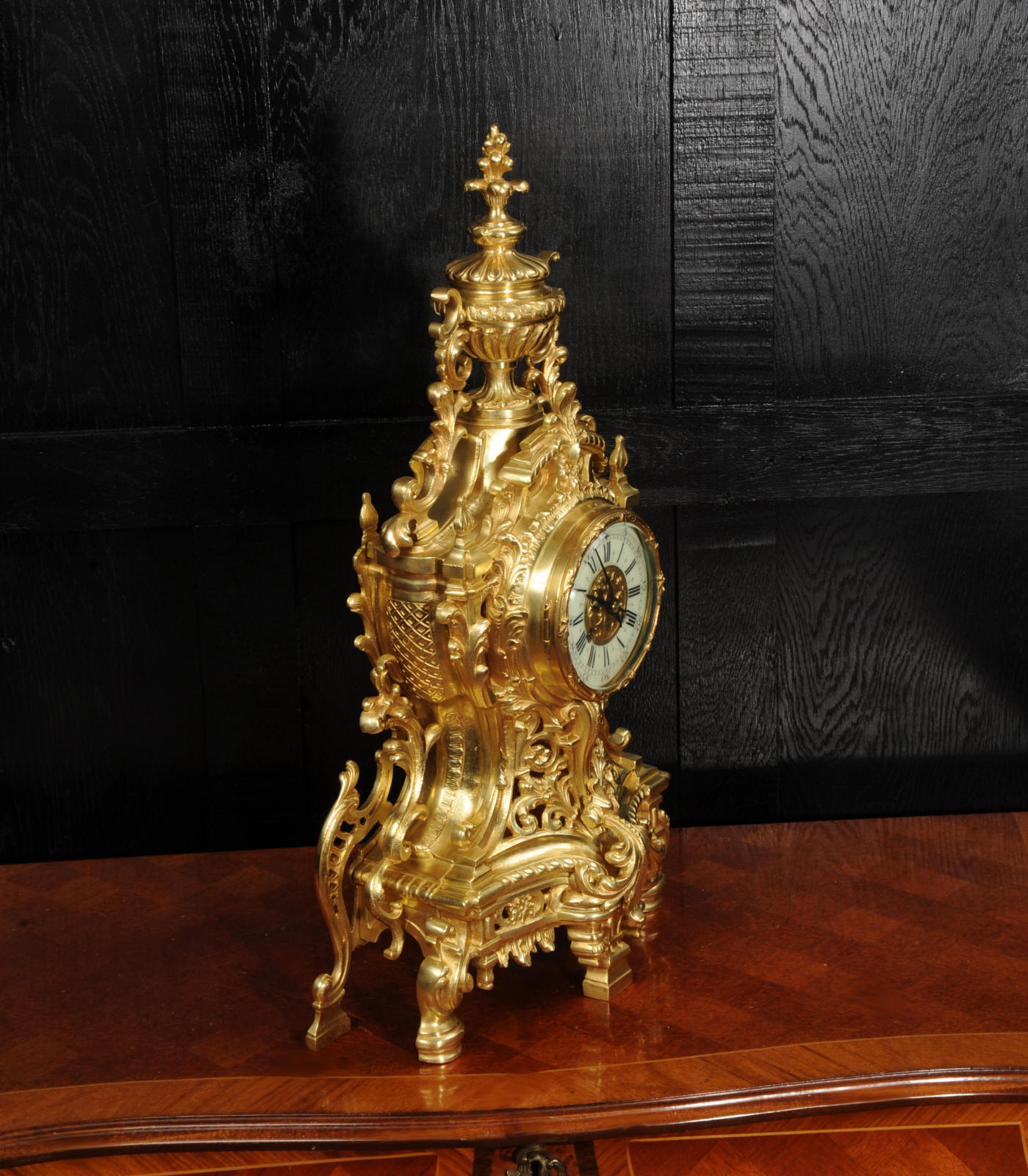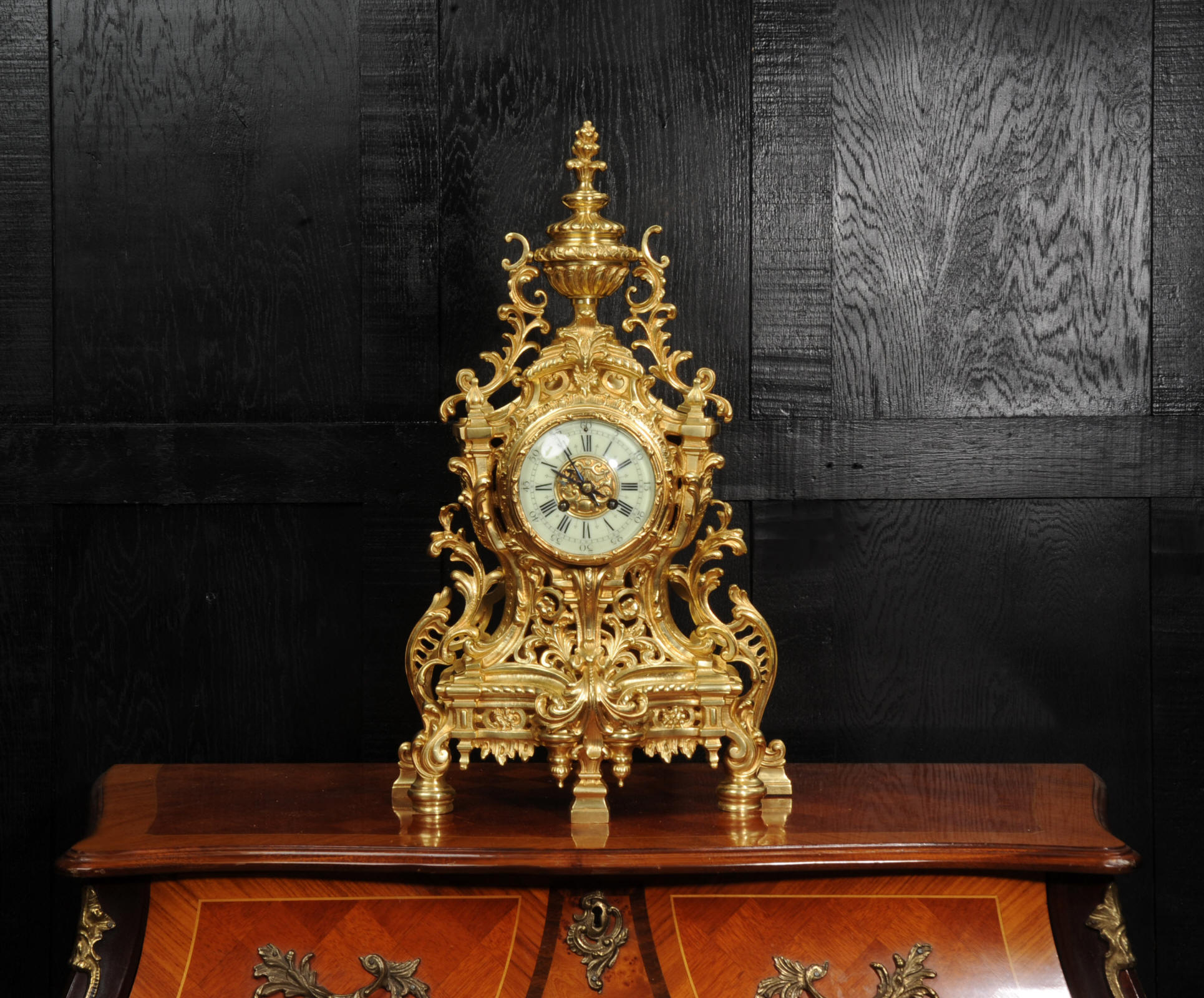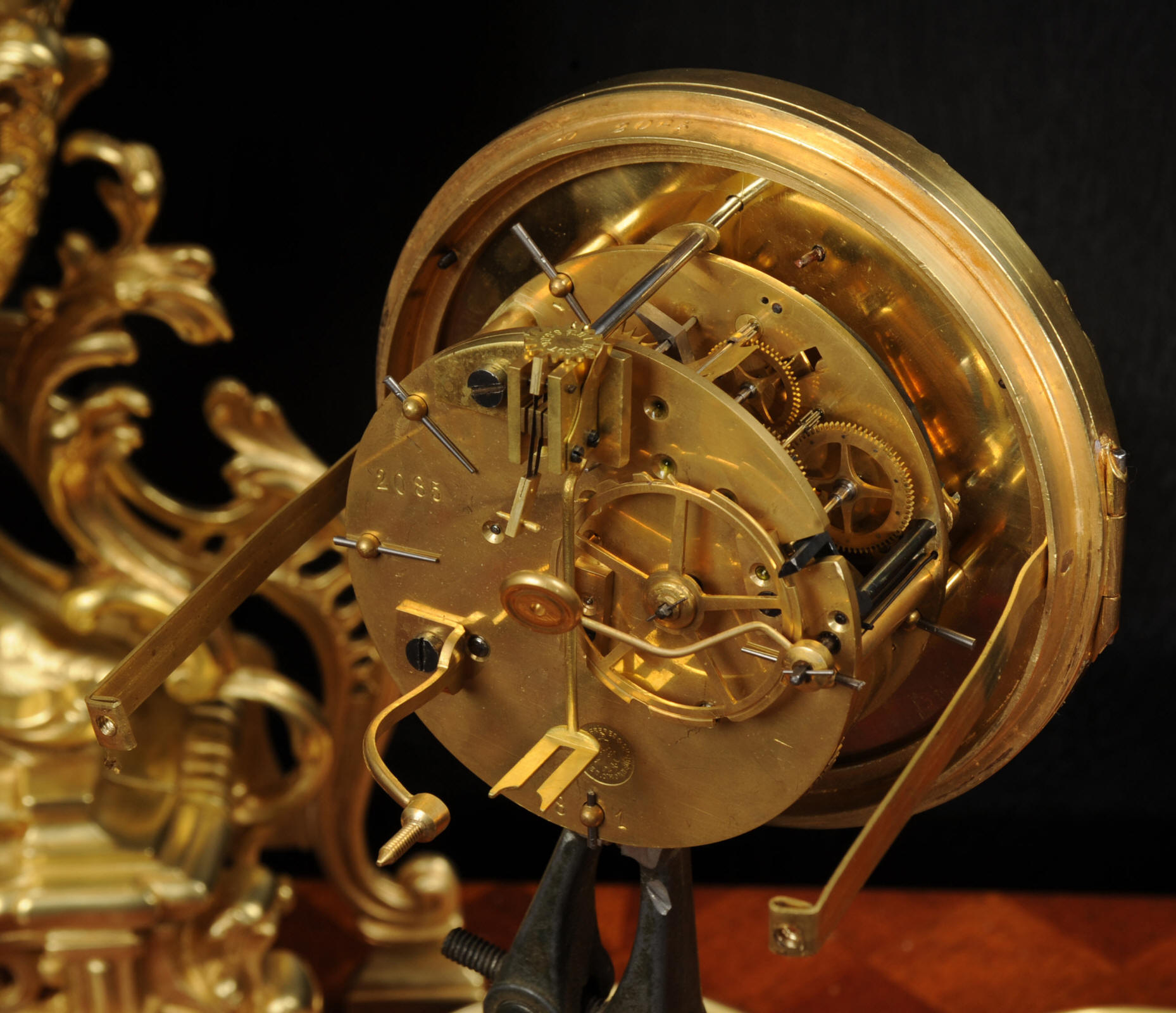 The large dial is porcelain enamel on copper with a gilt bronze centre. It is complete with its original finely cut and blued steel hands and convex glass. The French movement is by Japy Frères and is of high quality. It is in excellent clean and running condition having been fully overhauled by our clockmaker. Pendulum is original. It runs for 8 days and strikes the hours and halves on a bell. Click the video below to hear the bell and watch the clock running. Condition of the case is excellent, the original gilding is beautifully clean and bright with hardly any wear or discolouration. The dial is also excellent with slight chipping to the winding holes and hairline below the number eight.