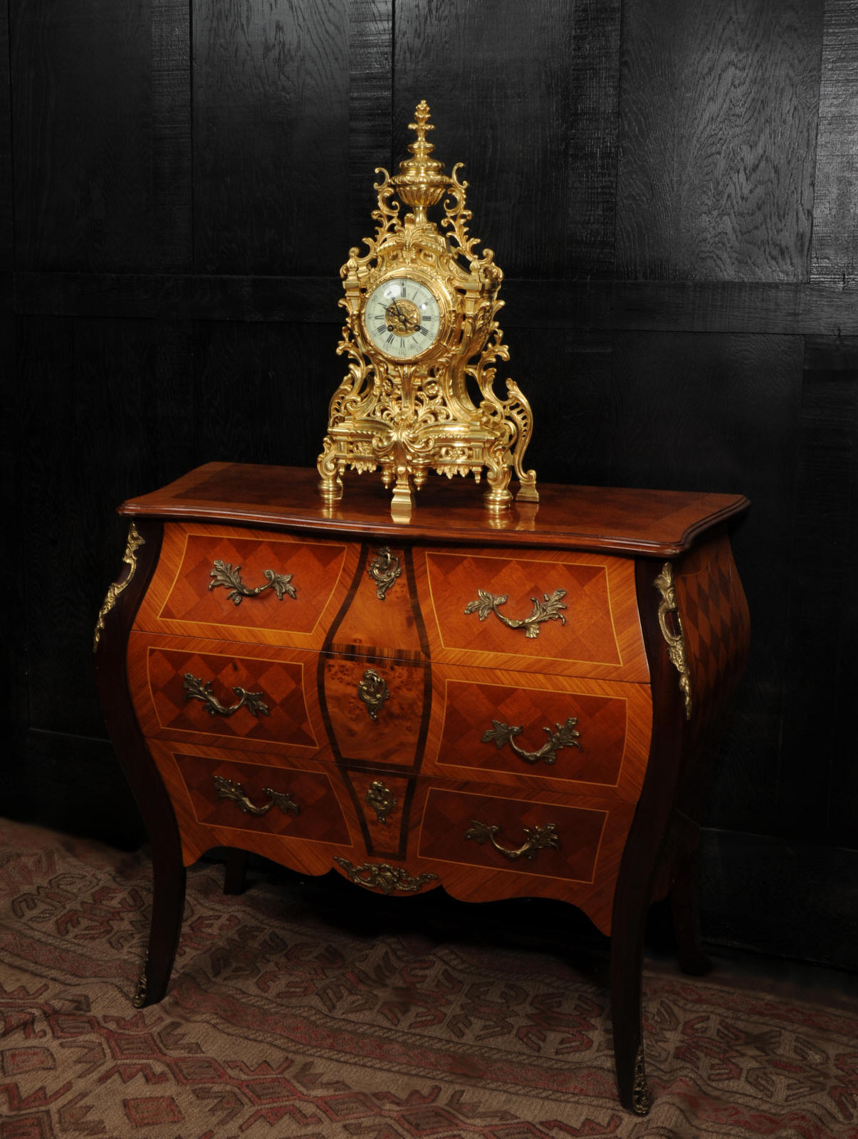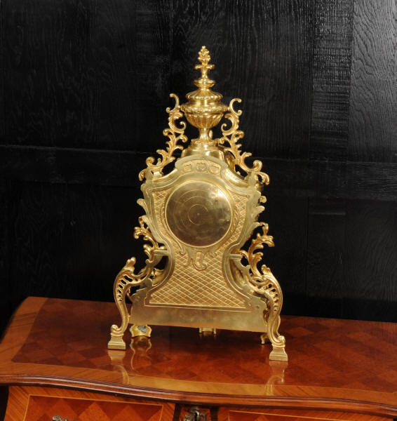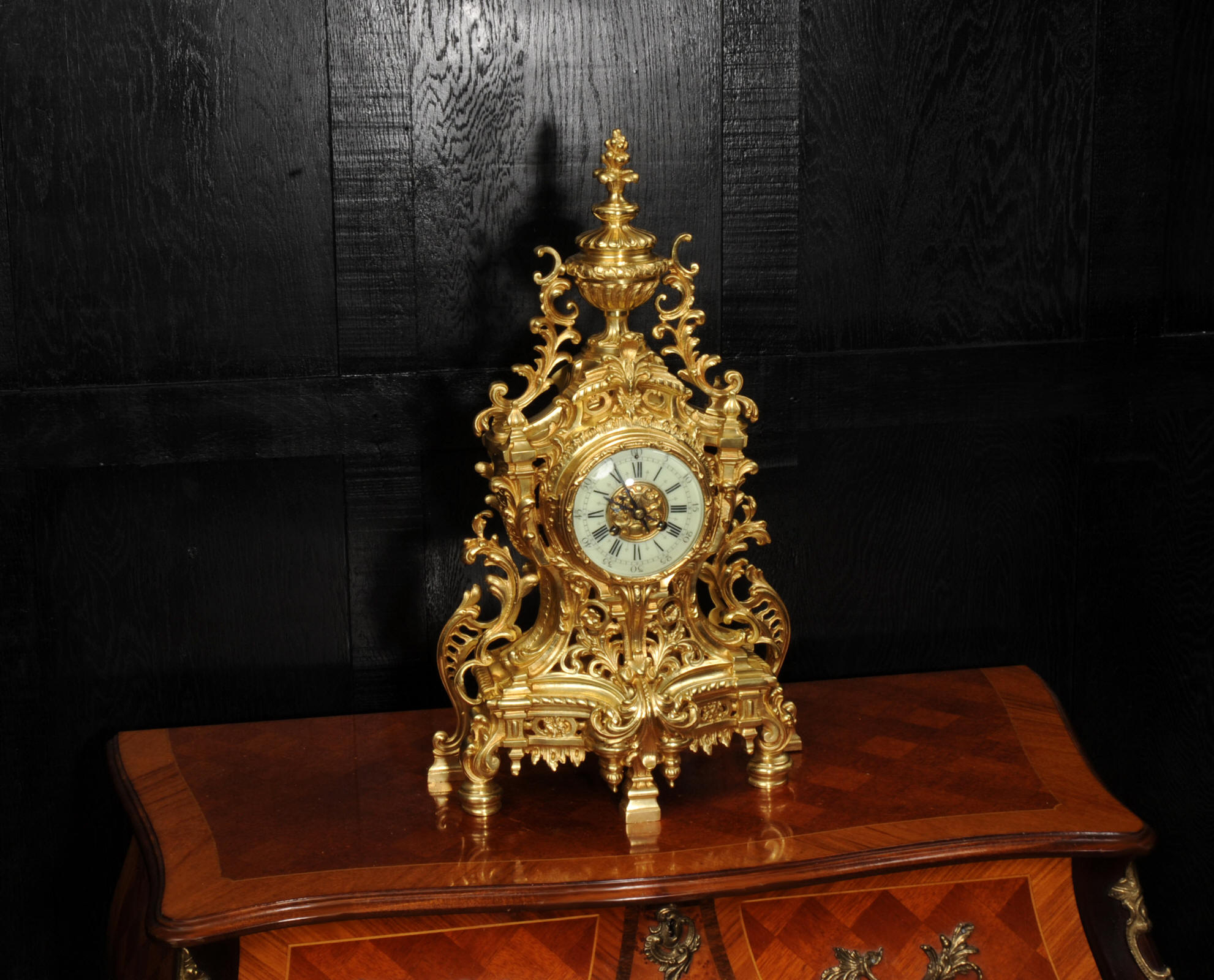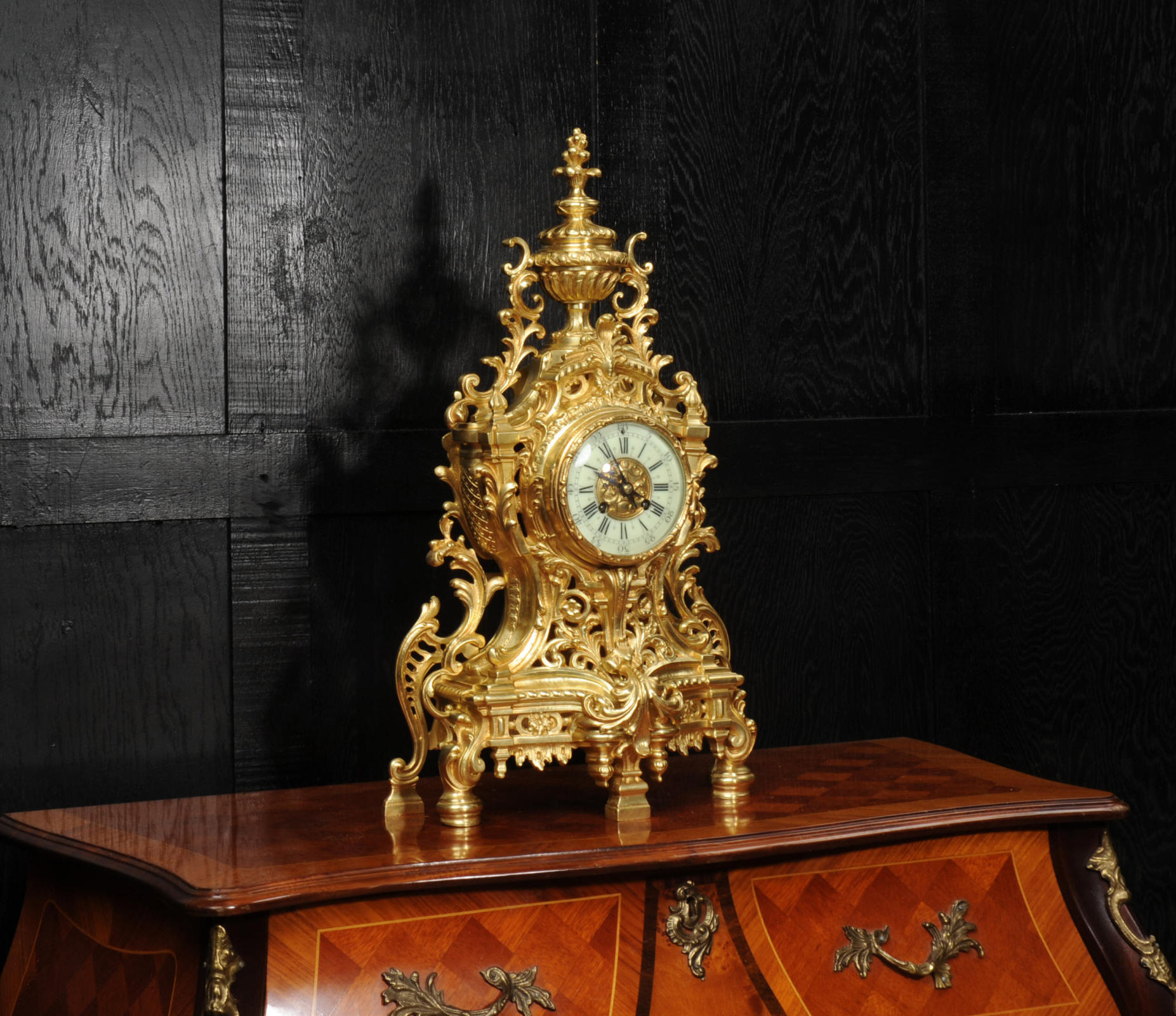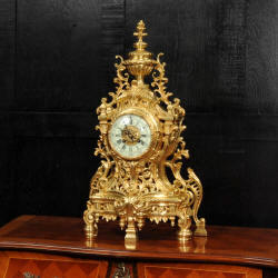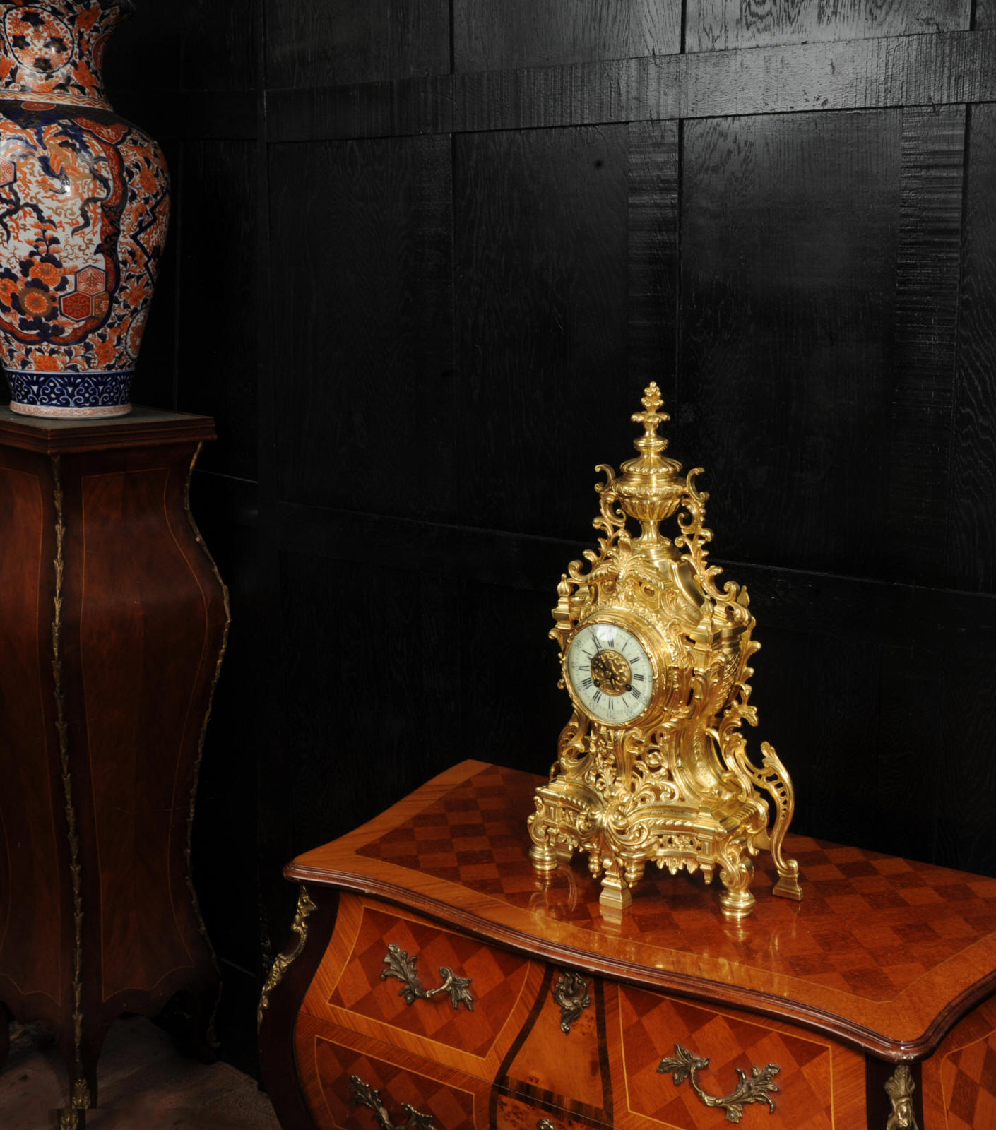 The large dial is porcelain enamel on copper with a gilt bronze centre. It is complete with its original finely cut and blued steel hands and convex glass. The French movement is by Japy Frères and is of high quality. It is in excellent clean and running condition having been fully overhauled by our clockmaker. Pendulum is original. It runs for 8 days and strikes the hours and halves on a bell. Click the video below to hear the bell and watch the clock running. Condition of the case is excellent, the original gilding is beautifully clean and bright with hardly any wear or discolouration. The dial is also excellent with slight chipping to the winding holes and hairline below the number eight.