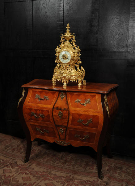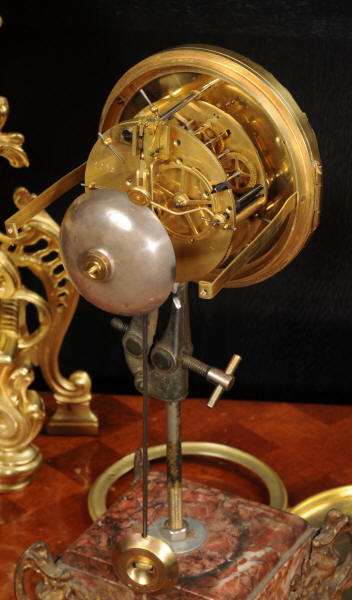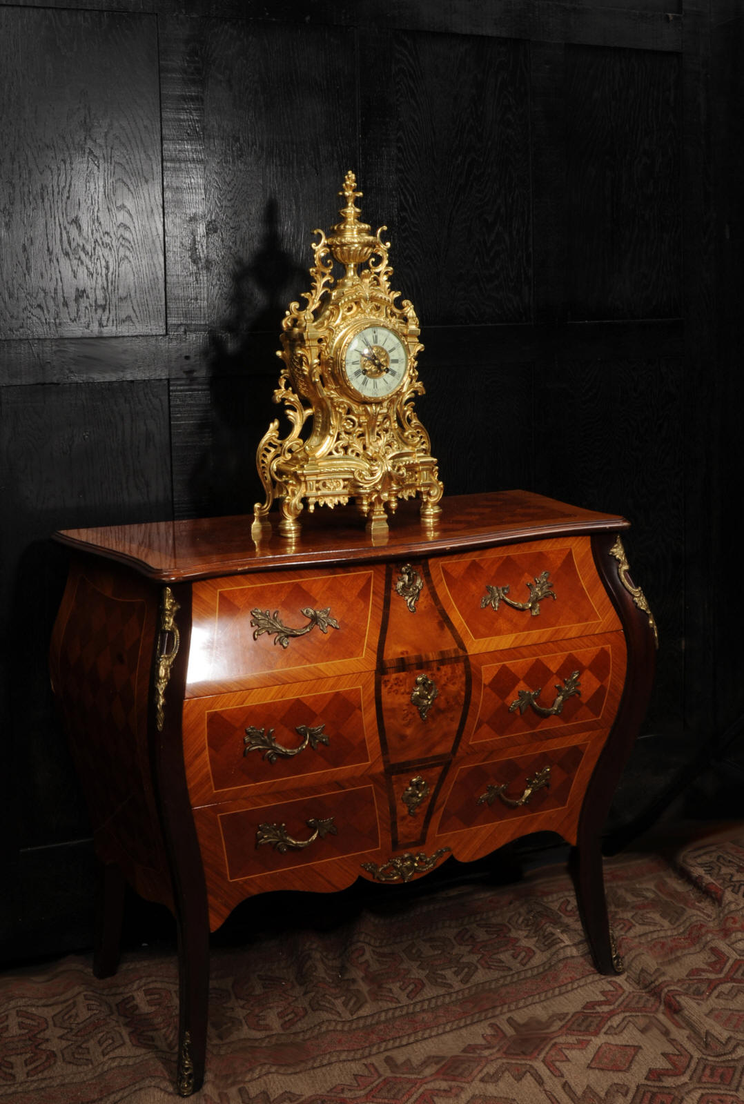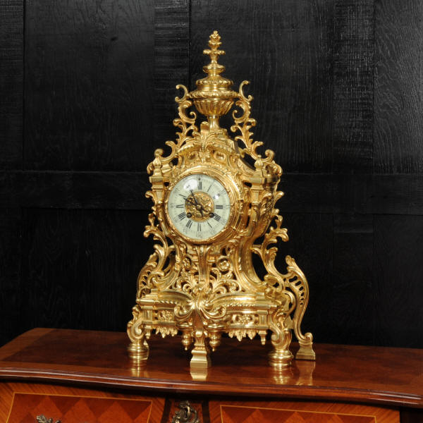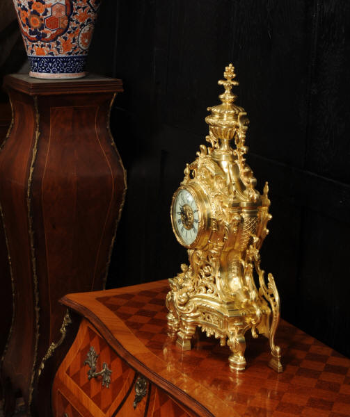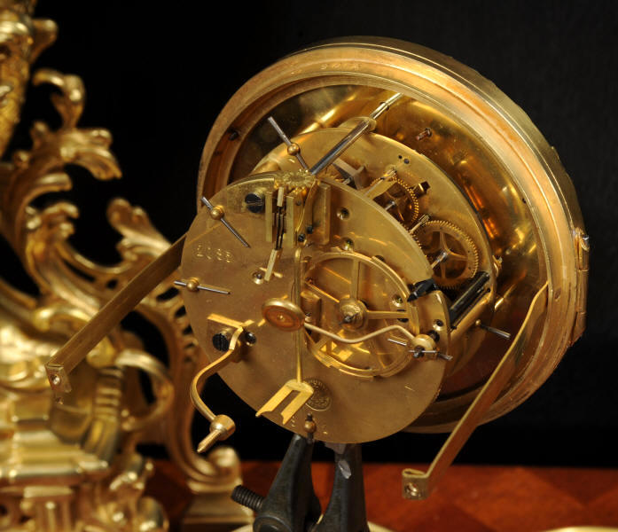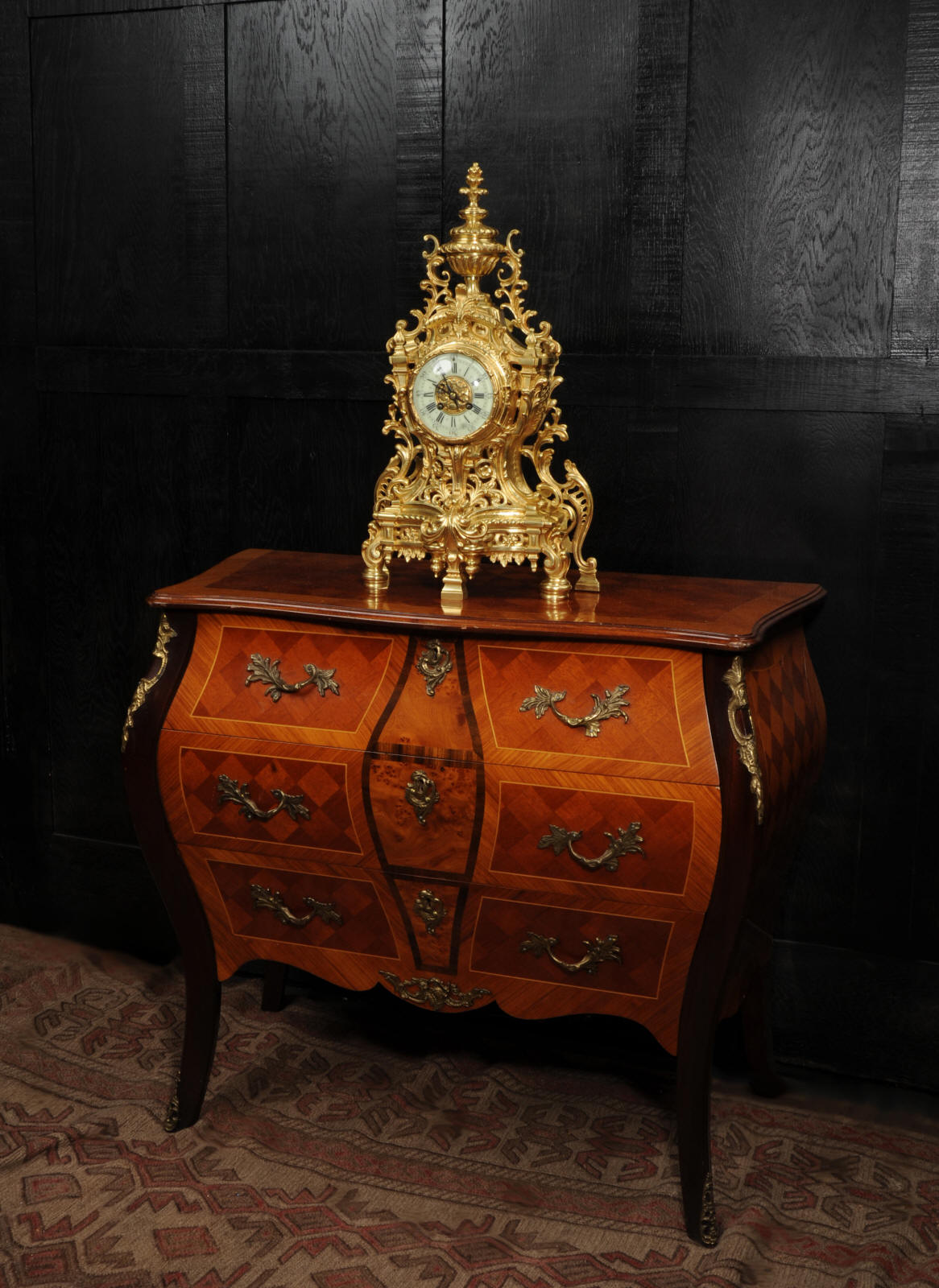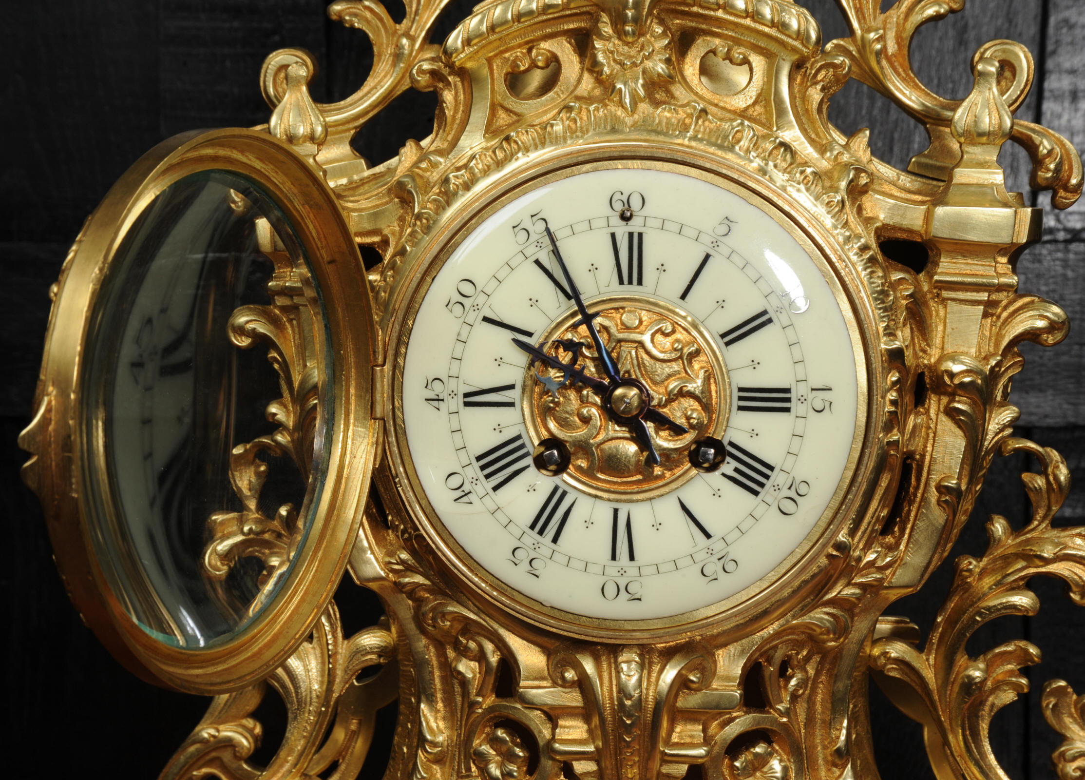 The large dial is porcelain enamel on copper with a gilt bronze centre. It is complete with its original finely cut and blued steel hands and convex glass. The French movement is by Japy Frères and is of high quality. It is in excellent clean and running condition having been fully overhauled by our clockmaker. Pendulum is original. It runs for 8 days and strikes the hours and halves on a bell. Click the video below to hear the bell and watch the clock running. Condition of the case is excellent, the original gilding is beautifully clean and bright with hardly any wear or discolouration. The dial is also excellent with slight chipping to the winding holes and hairline below the number eight.