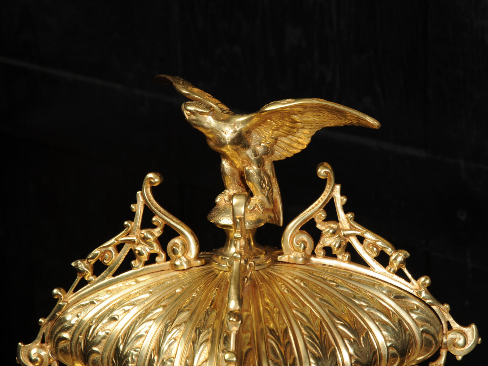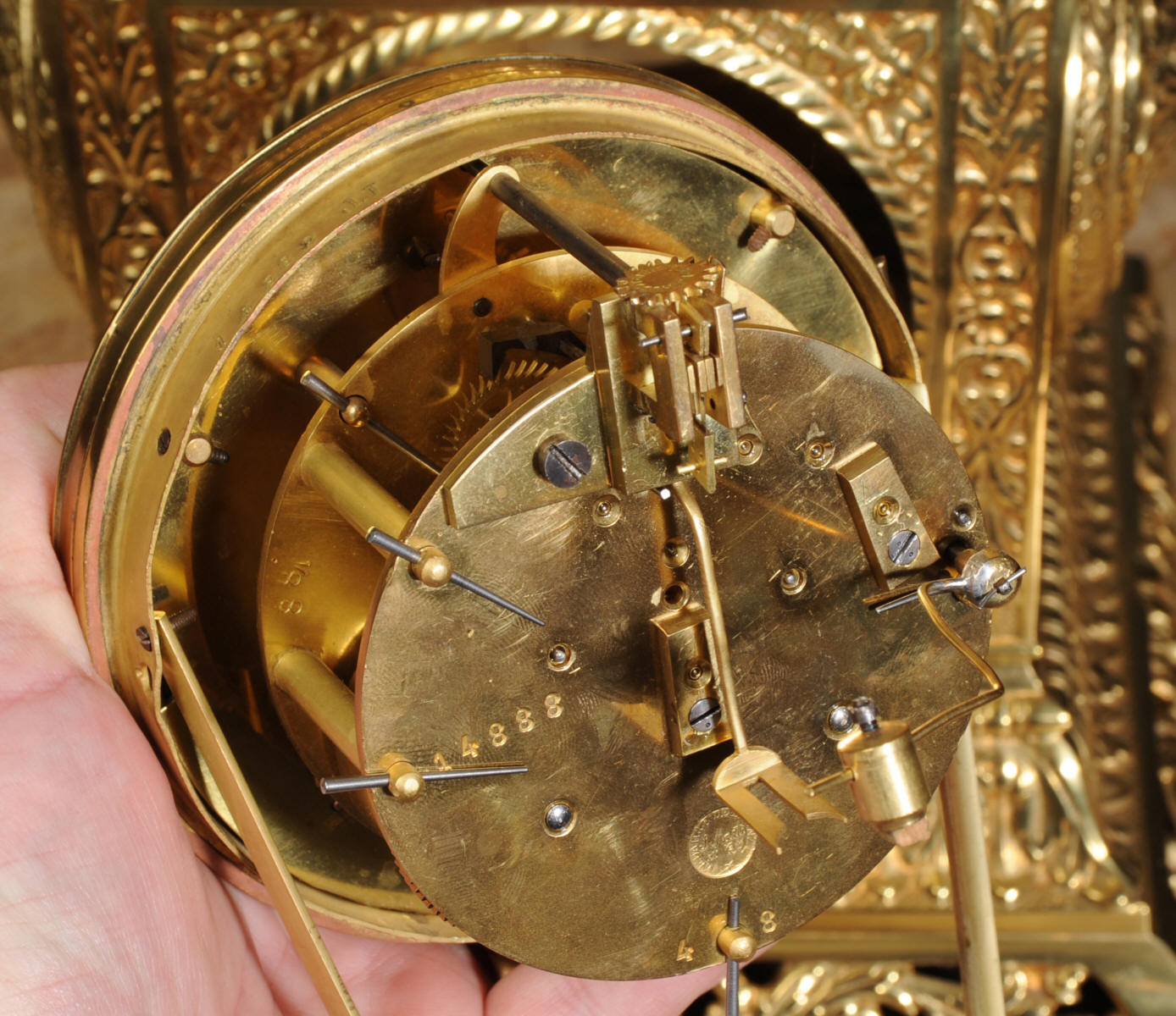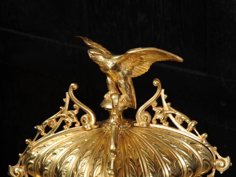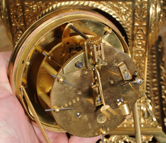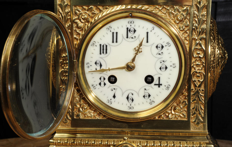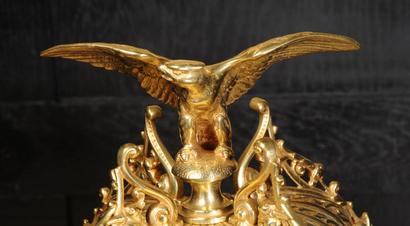 The dial enamel on copper with a separate minute ring and finely fretted brass hands. The French movement is of high quality and has the Samuel Marti mark on the movement backplate. It is in excellent clean and running condition having been fully overhauled by our clockmaker. Pendulum is original. It runs for 8 days and strikes the hours and halves on a sonorous gong. Click the video clip below to hear the gong and watch the clock running! Condition of the case is excellent, the original gilding is beautifully clean and bright with hardly any wear or discolouration and there are no losses. The dial is also in excellent condition just some faint hairlines near the number two. The clock displays beautifully as you can see below.