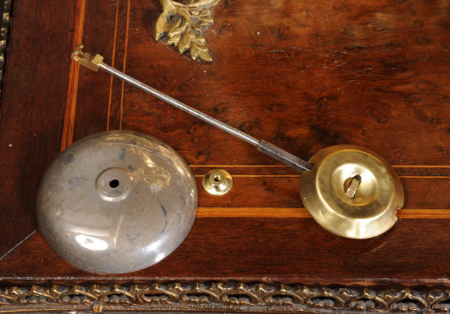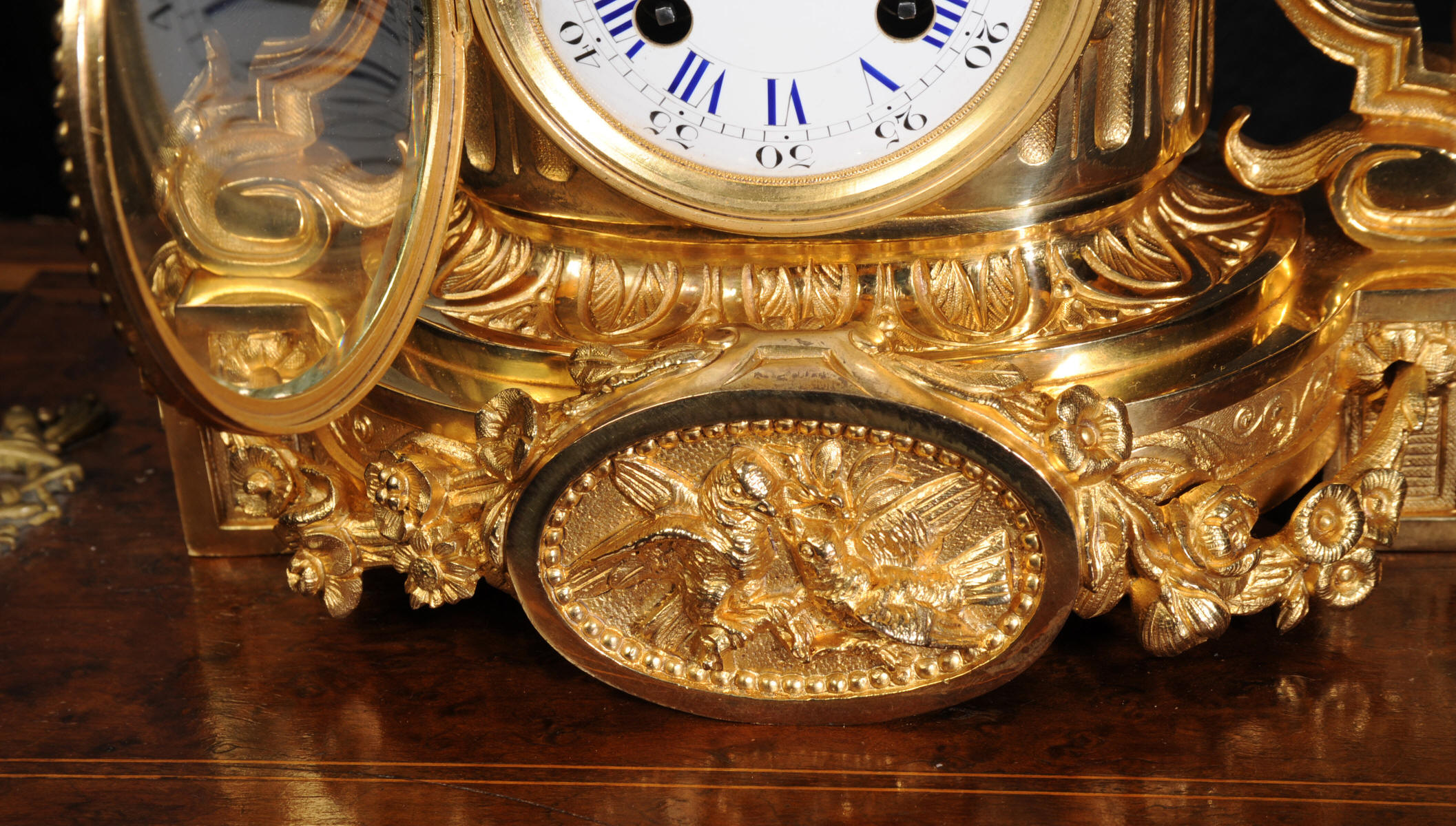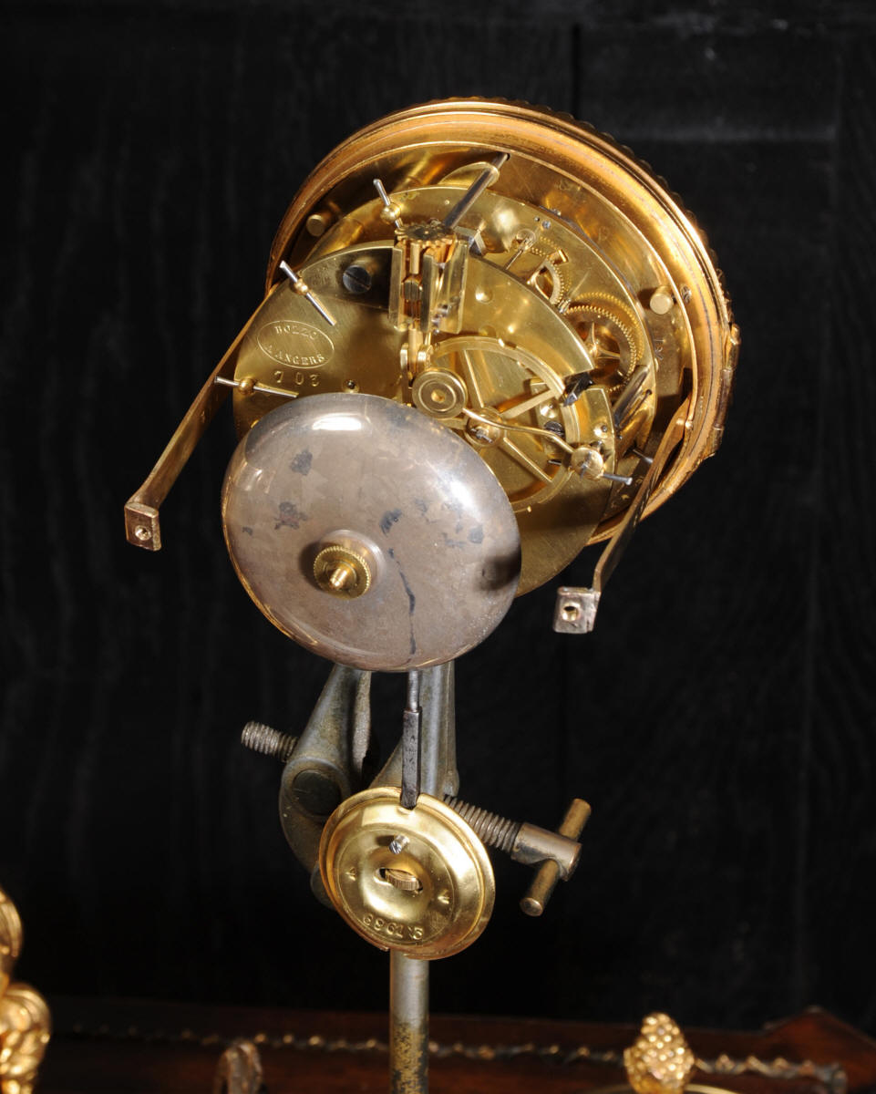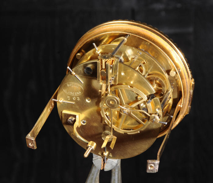 The dial is enamel on copper with separate minute ring and delicate fretted hands. The rear door is glazed to allow the movement to be seen. The French movement is by Japy Frères and is of high quality. On the back plate is the clockmaker's mark and also that of the retailer Bozzo Frères of Angers. Bozzo Frères are listed in Tardy* as working in Niort in 1850. It is in excellent clean and running condition having been fully overhauled by our clockmaker. Pendulum is an old replacement. It runs for 8 days and strikes the hours and halves on a bell. Click the video clip below to hear the bell and watch the clock running! Condition of the case is excellent, the original gilding is beautifully clean and bright with hardly any wear or discolouration and there are no losses. The dial is also in excellent condition just some tiny nibbles next to the winding holes and a small chip near the '45'. A lovely clock in excellent original condition.