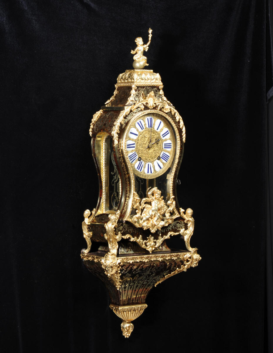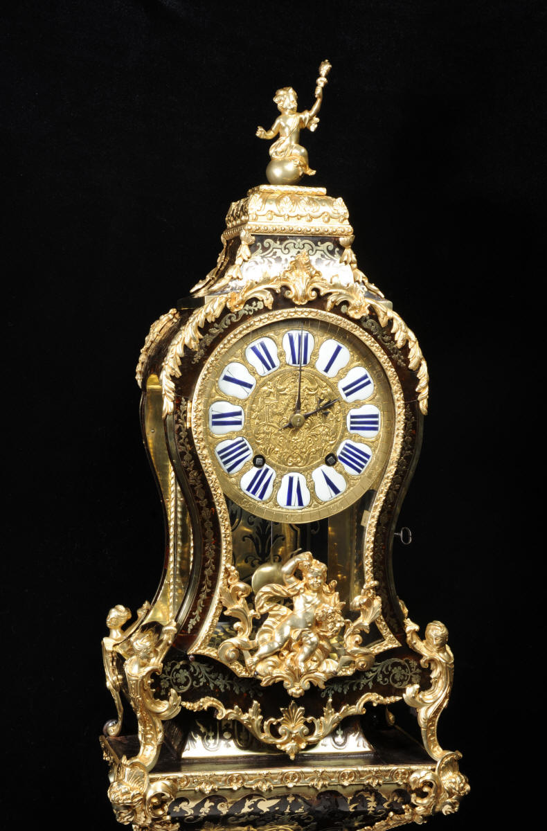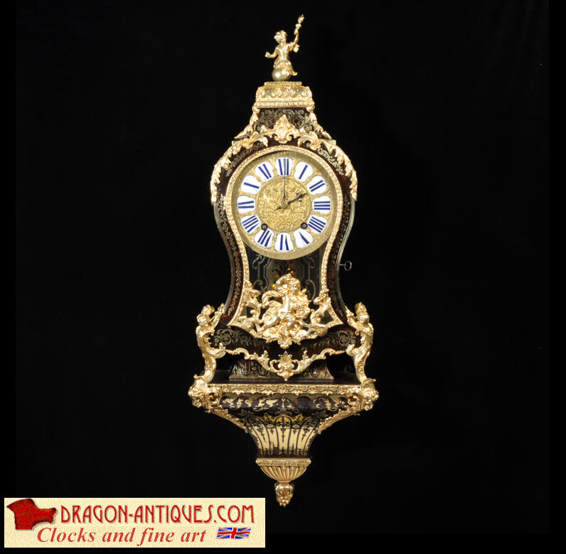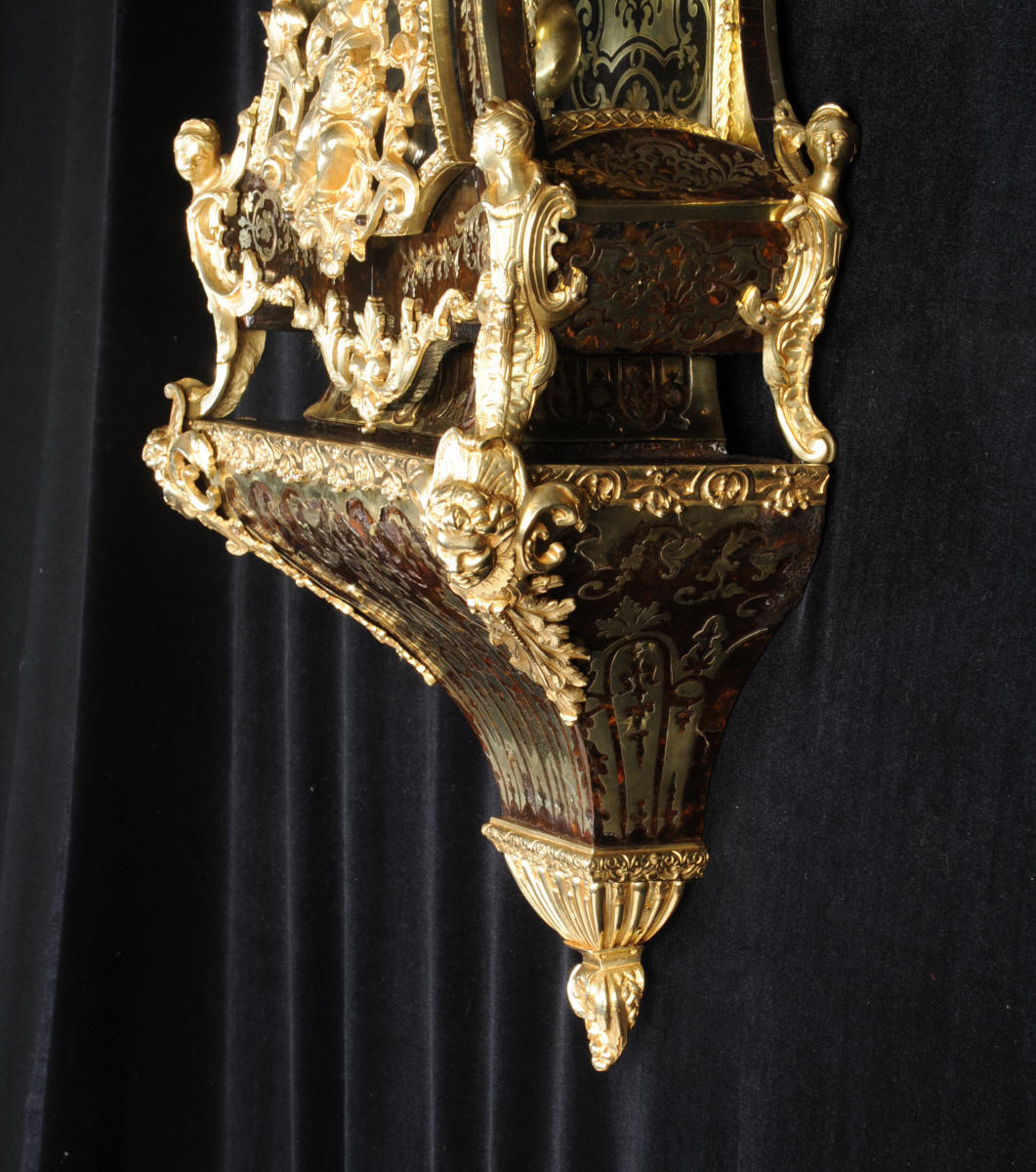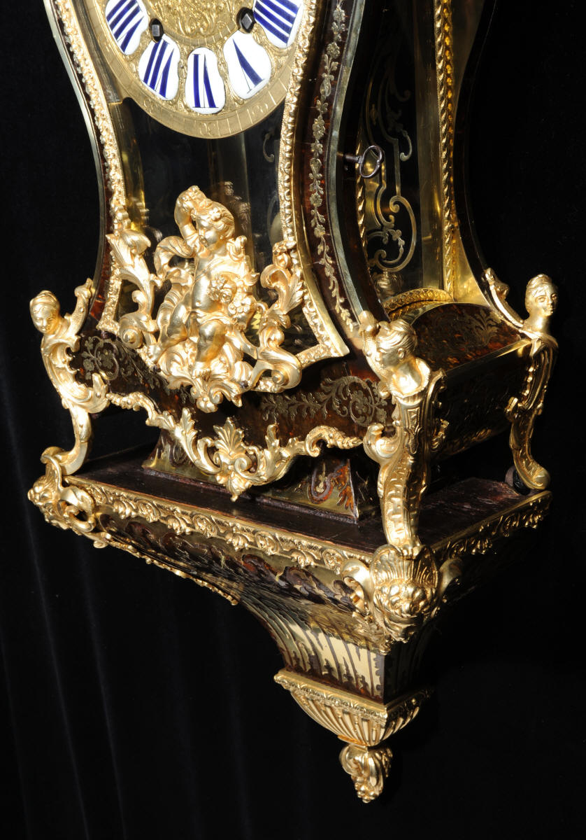 To the top is a cherub torch bearer, seated on a globe, bringing enlightenment to the world. The clock is glazed to three sides allowing the pendulum to be seen swinging within the case. To the front door is an apron mount depicting a cherub with a basket of flowers. The door is locked to the right hand side with an original iron key. The floor of the case is veneered with chequered shell and brass to produce a trompe l’oeil effect. Beautiful and elaborate Boulle work also decorates the inside of the back door. The clock sits upon elaborate scrolled feet with goddess masks. The bracket is original and features goddess masks applied to the corners and contra-partie boulle work to the three sides. The large dial is mounted with 12 individual blue on white enamel cartouches with foliate cast centre and the original finely cut blued steel hands. The fine French movement is by Admyrauld of Paris, most likely the father Louis Henri Admyrauld who is listed in Tardy (with the spelling of Admyrault) as becoming master in 1724 and moving to rue de la Comedie-Francaise in Paris in 1748. It is of excellent quality, a five pillar movement with original verge escapement that runs nicely. It strikes a large and most likely original bell underneath the removable top of the case every hour and half. We have fully overhauled and tested the movement, it runs for 8 days. it is complete with probably the original iron key complete with a Sotheby's lot number from 1994. Click the video clip below to hear the bell and watch the clock running! Condition of the clock case is very good, we have carefully cleaned both the Boulle marquetry and the ormolu mounts, the aim of conserving the clock rather than restoring to as new condition. There is some slight loss of brass inlay, mostly to the right hand shoulder, a few old, localised shell replacements and some loss of veneer to the inside of the back door, at the bottom. The bracket has some loss and lifting of inlay and some loss of shell, but considering the age of the piece is acceptable. Bronze mounts are complete with a good finish, there are a couple of cracks / breaks. Glass to the left hand side is original hand blown glass with bubbles and scratches. The front and right hand glass has been replaced at some time. The dial is excellent with no damage. A beautiful and rare clock to add to your collection.