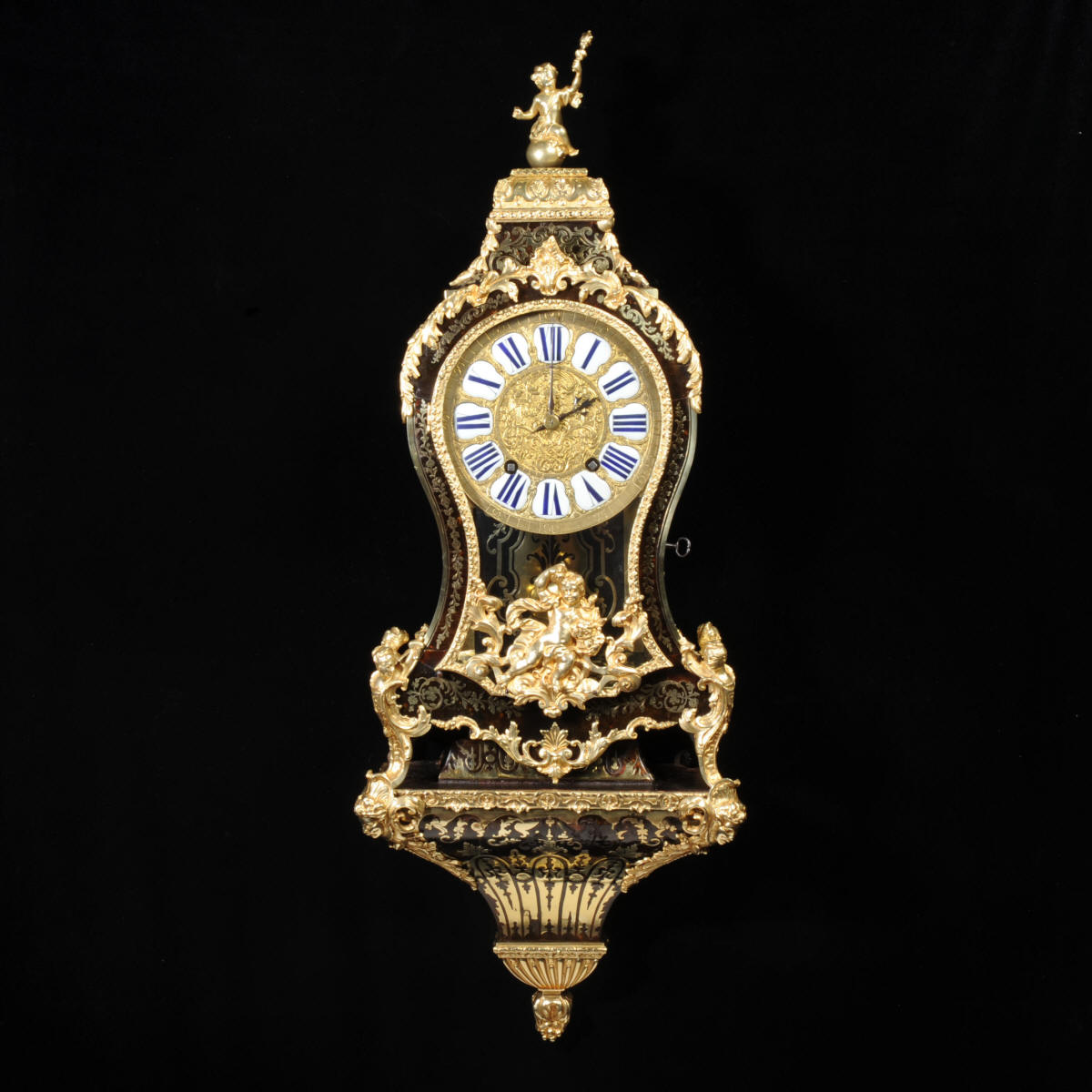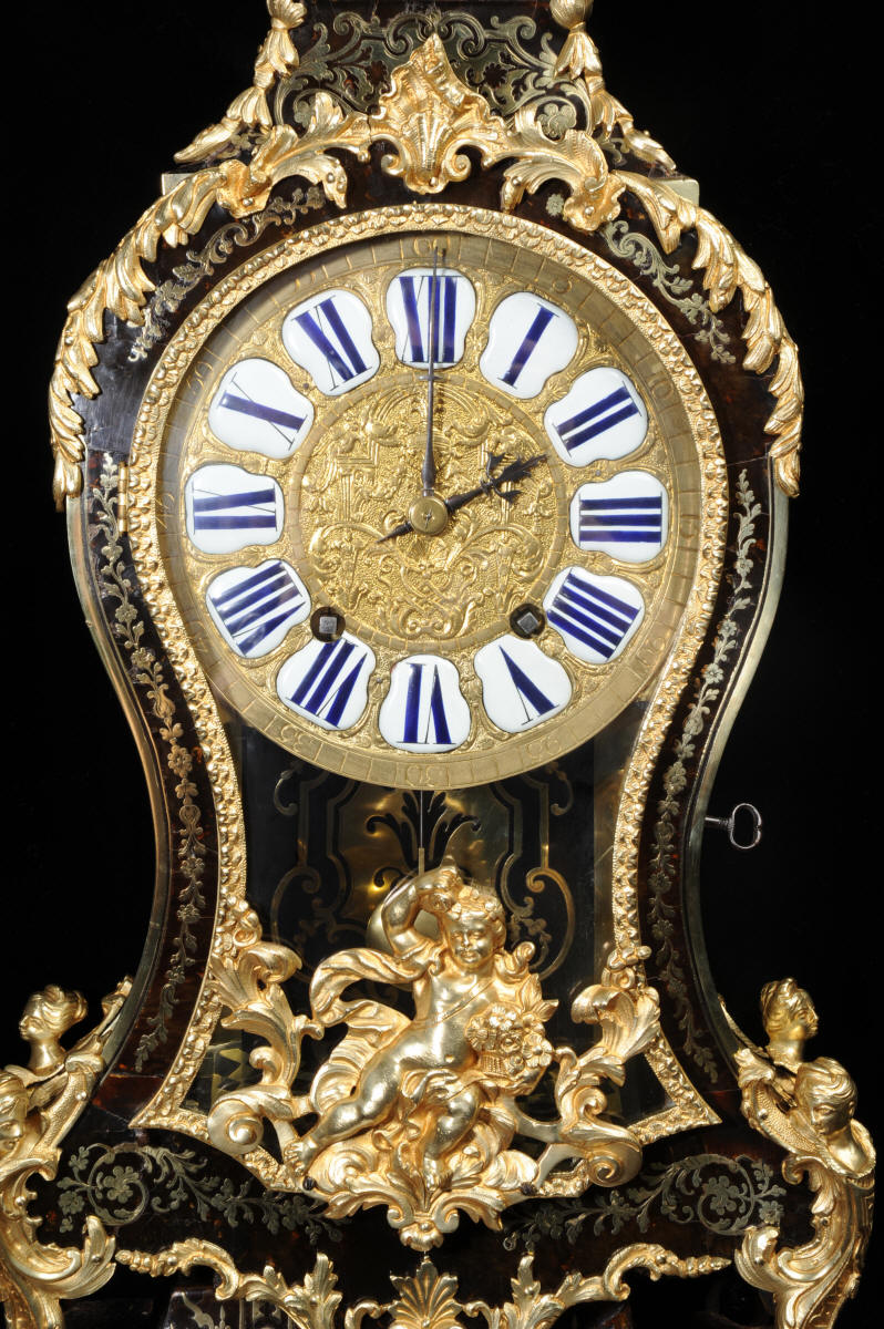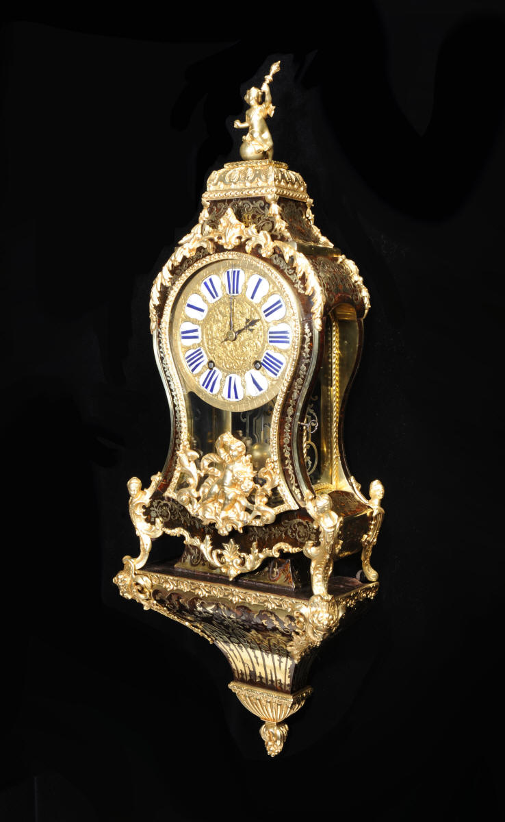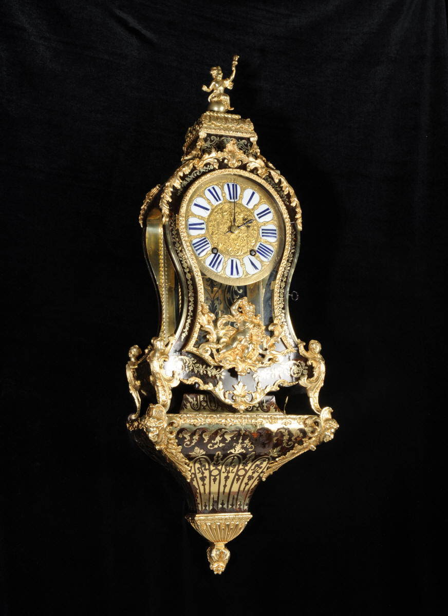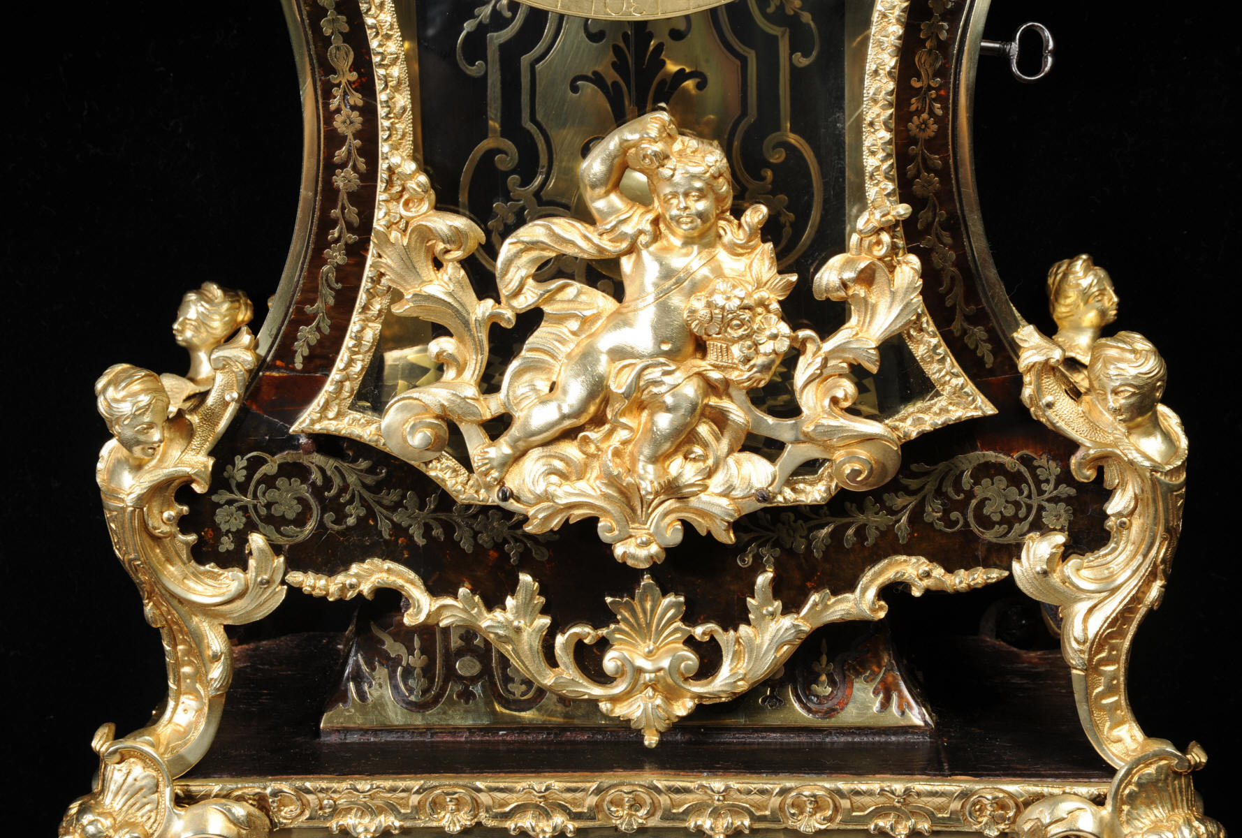 To the top is a cherub torch bearer, seated on a globe, bringing enlightenment to the world. The clock is glazed to three sides allowing the pendulum to be seen swinging within the case. To the front door is an apron mount depicting a cherub with a basket of flowers. The door is locked to the right hand side with an original iron key. The floor of the case is veneered with chequered shell and brass to produce a trompe l’oeil effect. Beautiful and elaborate Boulle work also decorates the inside of the back door. The clock sits upon elaborate scrolled feet with goddess masks. The bracket is original and features goddess masks applied to the corners and contra-partie boulle work to the three sides. The large dial is mounted with 12 individual blue on white enamel cartouches with foliate cast centre and the original finely cut blued steel hands. The fine French movement is by Admyrauld of Paris, most likely the father Louis Henri Admyrauld who is listed in Tardy (with the spelling of Admyrault) as becoming master in 1724 and moving to rue de la Comedie-Francaise in Paris in 1748. It is of excellent quality, a five pillar movement with original verge escapement that runs nicely. It strikes a large and most likely original bell underneath the removable top of the case every hour and half. We have fully overhauled and tested the movement, it runs for 8 days. it is complete with probably the original iron key complete with a Sotheby's lot number from 1994. Click the video clip below to hear the bell and watch the clock running! Condition of the clock case is very good, we have carefully cleaned both the Boulle marquetry and the ormolu mounts, the aim of conserving the clock rather than restoring to as new condition. There is some slight loss of brass inlay, mostly to the right hand shoulder, a few old, localised shell replacements and some loss of veneer to the inside of the back door, at the bottom. The bracket has some loss and lifting of inlay and some loss of shell, but considering the age of the piece is acceptable. Bronze mounts are complete with a good finish, there are a couple of cracks / breaks. Glass to the left hand side is original hand blown glass with bubbles and scratches. The front and right hand glass has been replaced at some time. The dial is excellent with no damage. A beautiful and rare clock to add to your collection.
