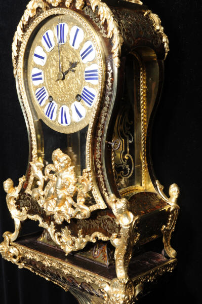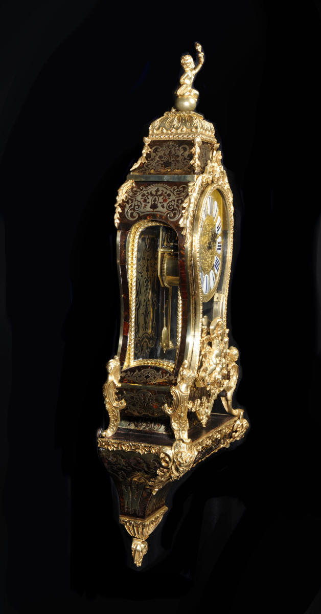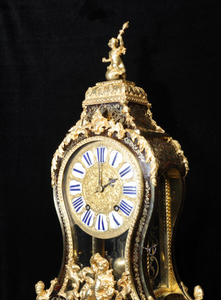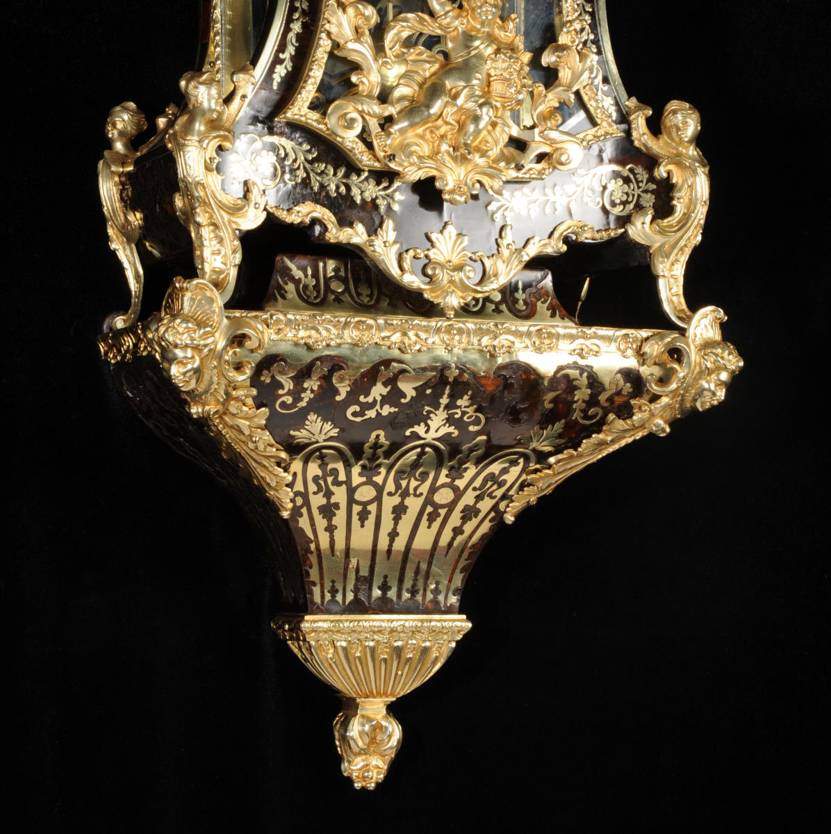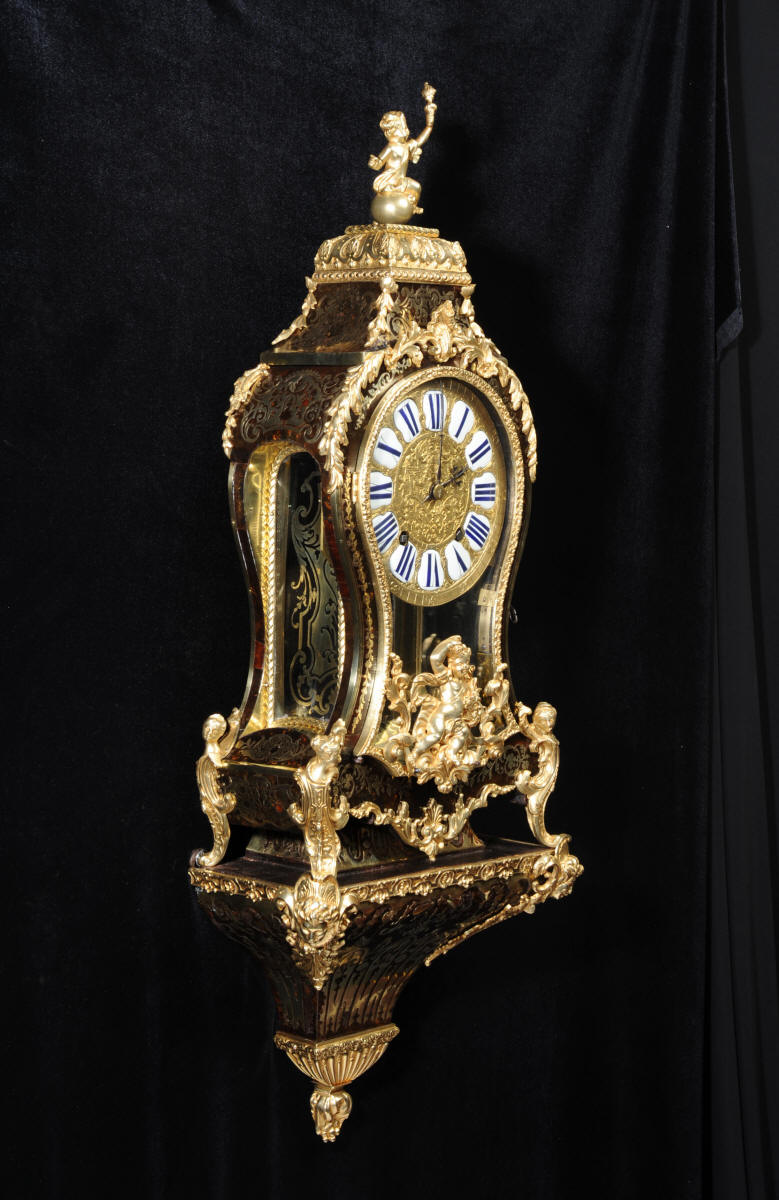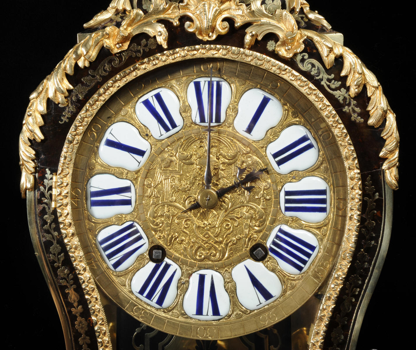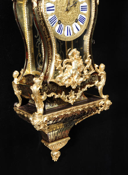 To the top is a cherub torch bearer, seated on a globe, bringing enlightenment to the world. The clock is glazed to three sides allowing the pendulum to be seen swinging within the case. To the front door is an apron mount depicting a cherub with a basket of flowers. The door is locked to the right hand side with an original iron key. The floor of the case is veneered with chequered shell and brass to produce a trompe l’oeil effect. Beautiful and elaborate Boulle work also decorates the inside of the back door. The clock sits upon elaborate scrolled feet with goddess masks. The bracket is original and features goddess masks applied to the corners and contra-partie boulle work to the three sides. The large dial is mounted with 12 individual blue on white enamel cartouches with foliate cast centre and the original finely cut blued steel hands. The fine French movement is by Admyrauld of Paris, most likely the father Louis Henri Admyrauld who is listed in Tardy (with the spelling of Admyrault) as becoming master in 1724 and moving to rue de la Comedie-Francaise in Paris in 1748. It is of excellent quality, a five pillar movement with original verge escapement that runs nicely. It strikes a large and most likely original bell underneath the removable top of the case every hour and half. We have fully overhauled and tested the movement, it runs for 8 days. it is complete with probably the original iron key complete with a Sotheby's lot number from 1994. Click the video clip below to hear the bell and watch the clock running! Condition of the clock case is very good, we have carefully cleaned both the Boulle marquetry and the ormolu mounts, the aim of conserving the clock rather than restoring to as new condition. There is some slight loss of brass inlay, mostly to the right hand shoulder, a few old, localised shell replacements and some loss of veneer to the inside of the back door, at the bottom. The bracket has some loss and lifting of inlay and some loss of shell, but considering the age of the piece is acceptable. Bronze mounts are complete with a good finish, there are a couple of cracks / breaks. Glass to the left hand side is original hand blown glass with bubbles and scratches. The front and right hand glass has been replaced at some time. The dial is excellent with no damage. A beautiful and rare clock to add to your collection.