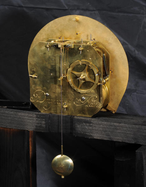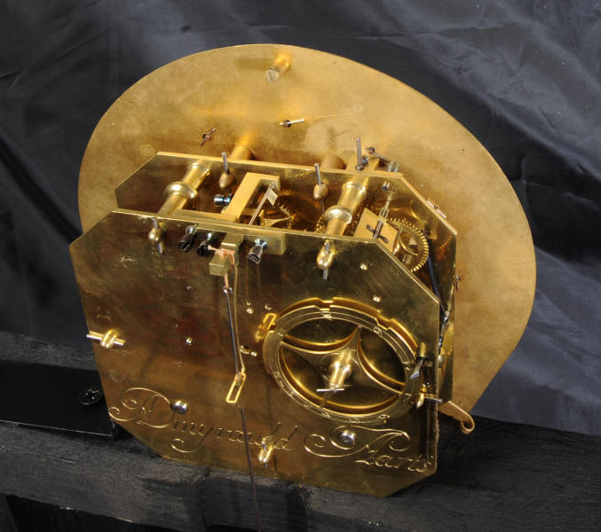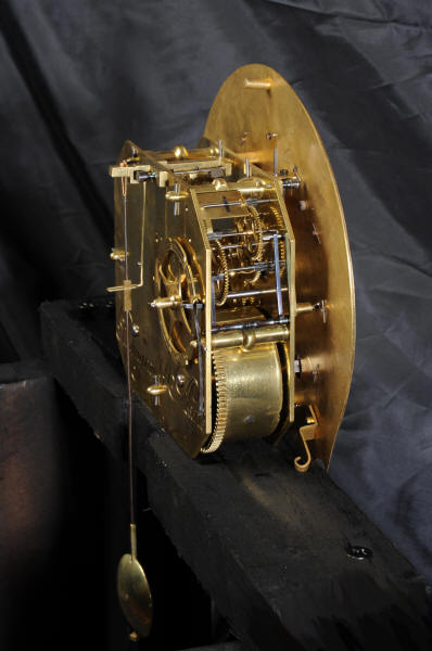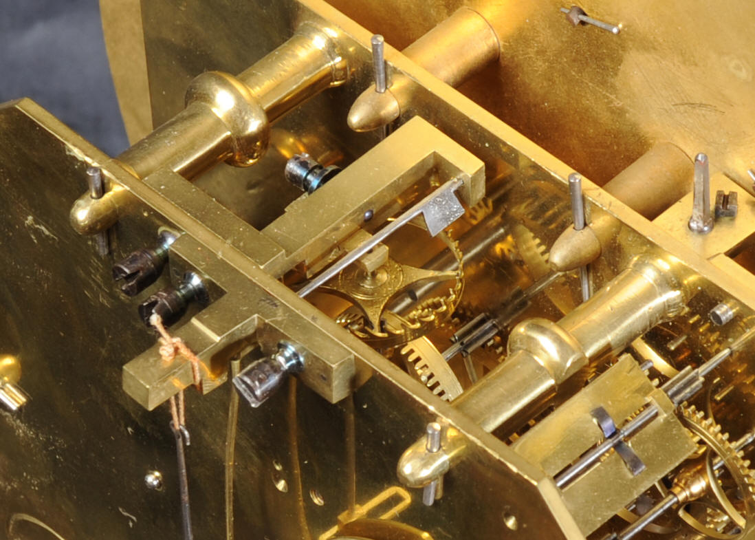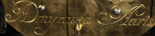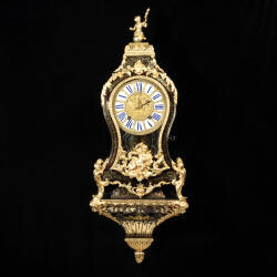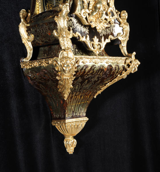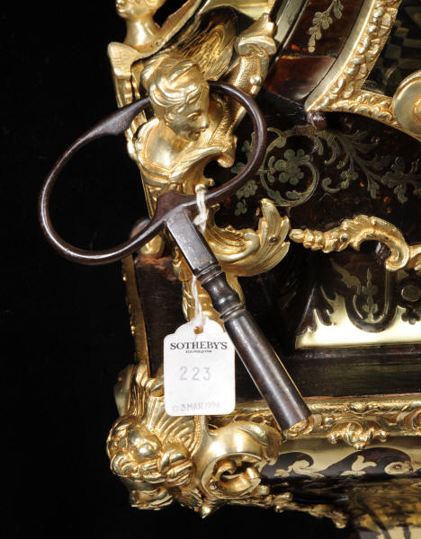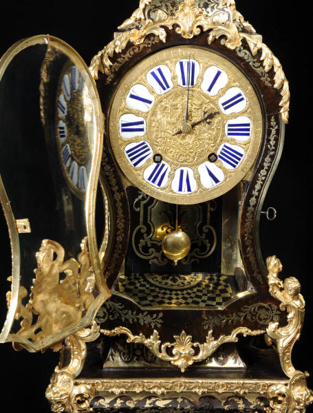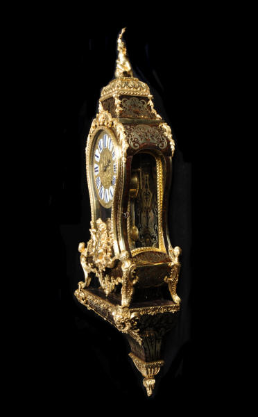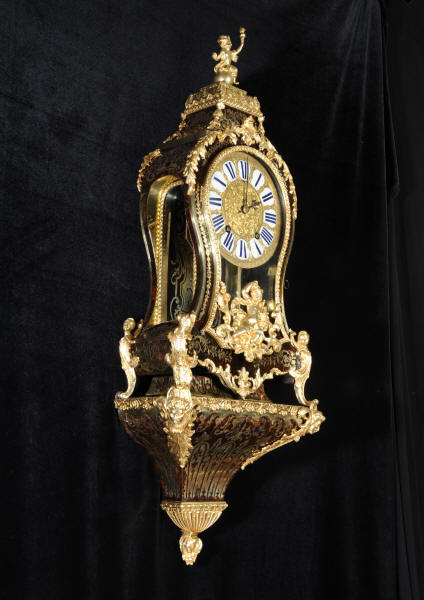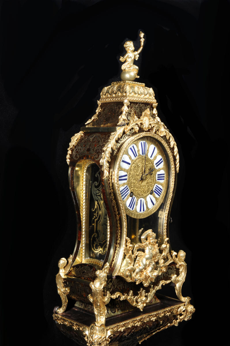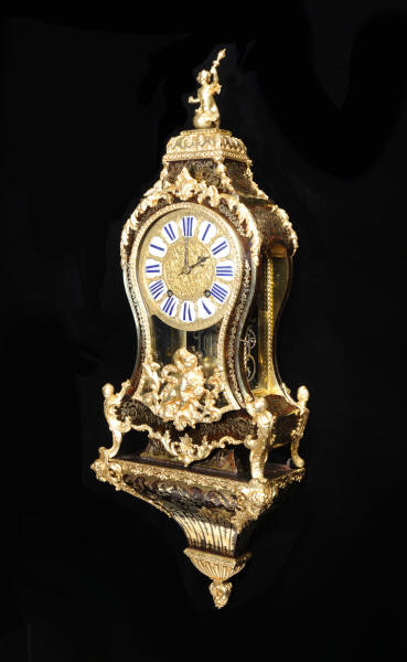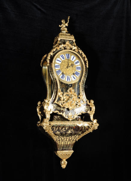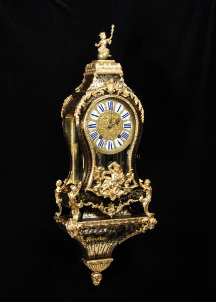 To the top is a cherub torch bearer, seated on a globe, bringing enlightenment to the world. The clock is glazed to three sides allowing the pendulum to be seen swinging within the case. To the front door is an apron mount depicting a cherub with a basket of flowers. The door is locked to the right hand side with an original iron key. The floor of the case is veneered with chequered shell and brass to produce a trompe l’oeil effect. Beautiful and elaborate Boulle work also decorates the inside of the back door. The clock sits upon elaborate scrolled feet with goddess masks. The bracket is original and features goddess masks applied to the corners and contra-partie boulle work to the three sides. The large dial is mounted with 12 individual blue on white enamel cartouches with foliate cast centre and the original finely cut blued steel hands. The fine French movement is by Admyrauld of Paris, most likely the father Louis Henri Admyrauld who is listed in Tardy (with the spelling of Admyrault) as becoming master in 1724 and moving to rue de la Comedie-Francaise in Paris in 1748. It is of excellent quality, a five pillar movement with original verge escapement that runs nicely. It strikes a large and most likely original bell underneath the removable top of the case every hour and half. We have fully overhauled and tested the movement, it runs for 8 days. it is complete with probably the original iron key complete with a Sotheby's lot number from 1994. Click the video clip below to hear the bell and watch the clock running! Condition of the clock case is very good, we have carefully cleaned both the Boulle marquetry and the ormolu mounts, the aim of conserving the clock rather than restoring to as new condition. There is some slight loss of brass inlay, mostly to the right hand shoulder, a few old, localised shell replacements and some loss of veneer to the inside of the back door, at the bottom. The bracket has some loss and lifting of inlay and some loss of shell, but considering the age of the piece is acceptable. Bronze mounts are complete with a good finish, there are a couple of cracks / breaks. Glass to the left hand side is original hand blown glass with bubbles and scratches. The front and right hand glass has been replaced at some time. The dial is excellent with no damage. A beautiful and rare clock to add to your collection.