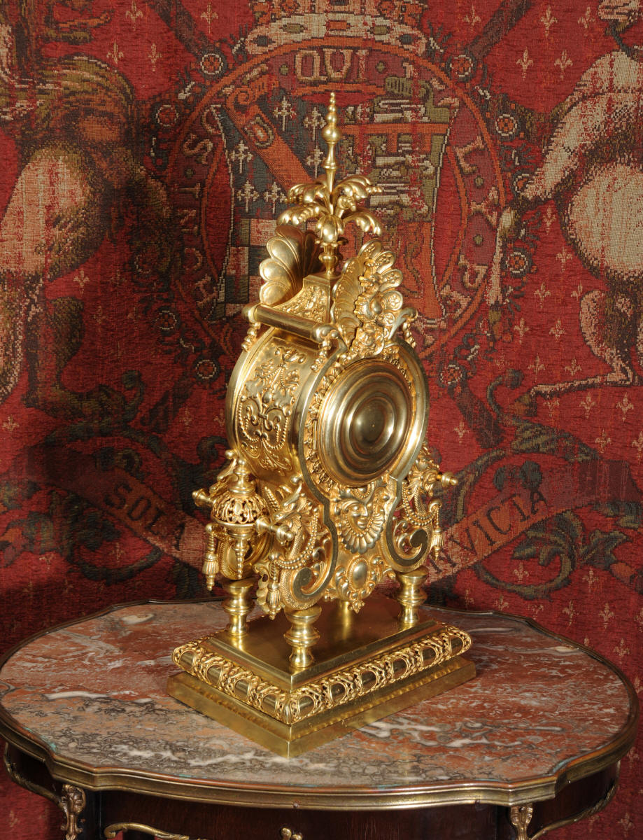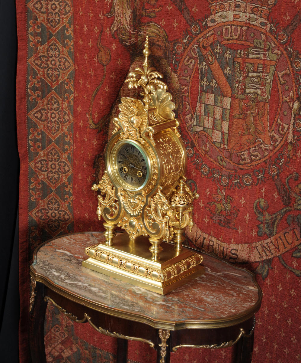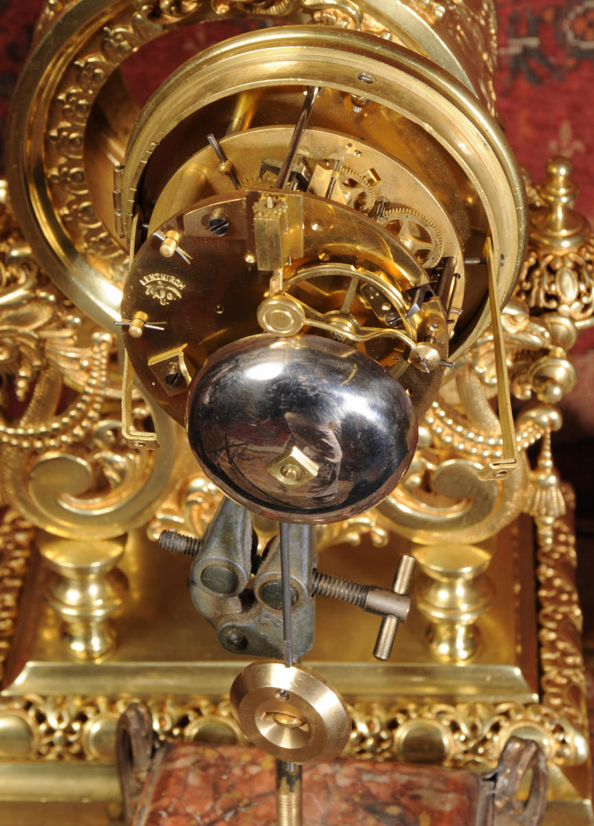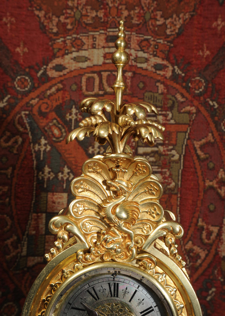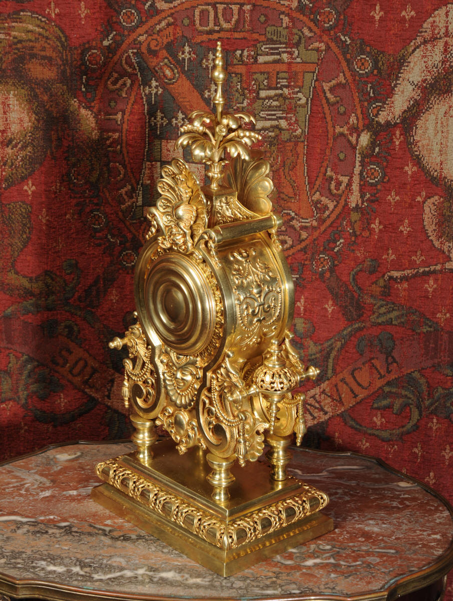 The stunning dial is bronze with an engraved silvered chapter ring. The Lenzkirch movement is of French design and we can date this from the serial number 549365 to the year 1881. It is in excellent and fully running condition, we have overhauled and thoroughly tested it in our workshop. It strikes a bell at the hours and the halves and runs for 8 days. The pendulum is a replacement. Please see the video below. Condition of the case is excellent, the original gilding is beautifully clean and bright with hardly any wear or discolouration and there are no losses. The dial is also in excellent condition This is a stunning clock in beautiful condition.