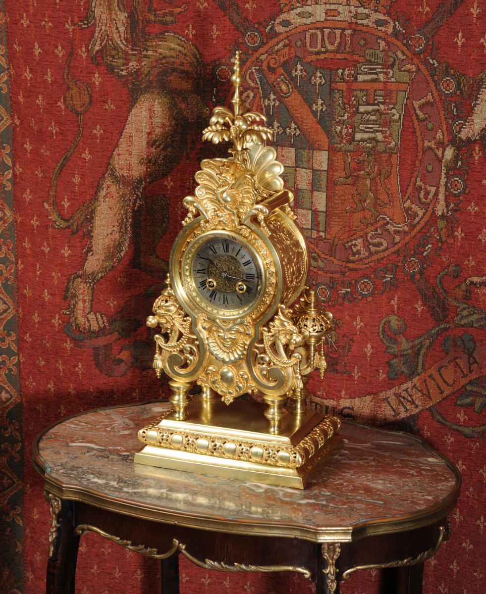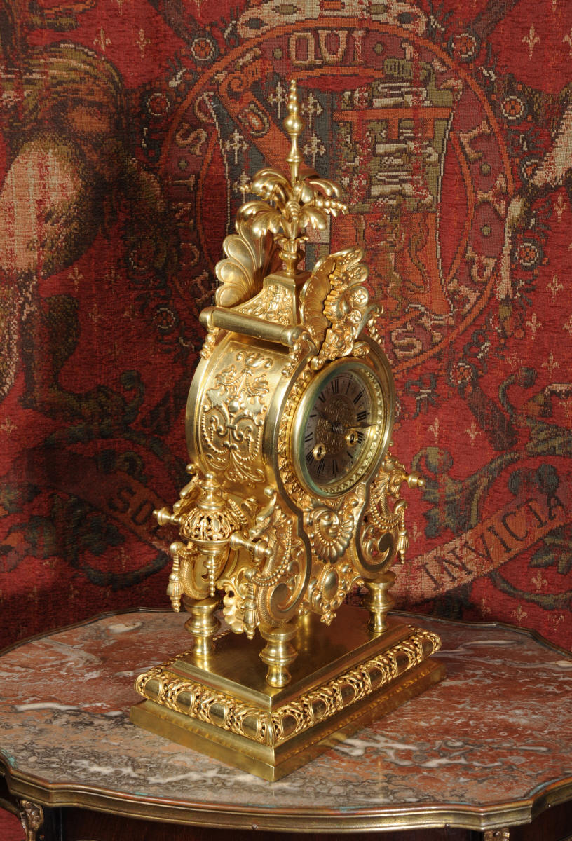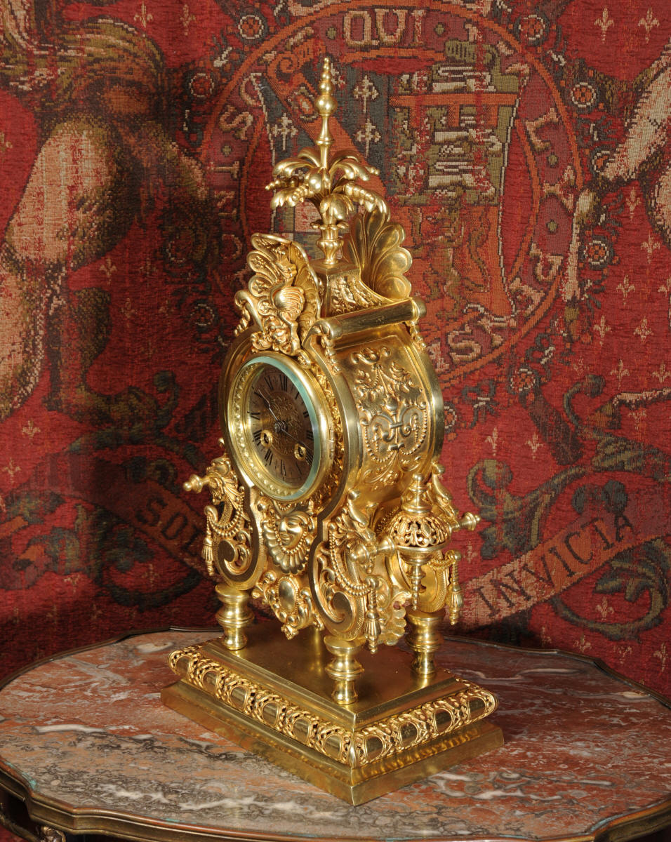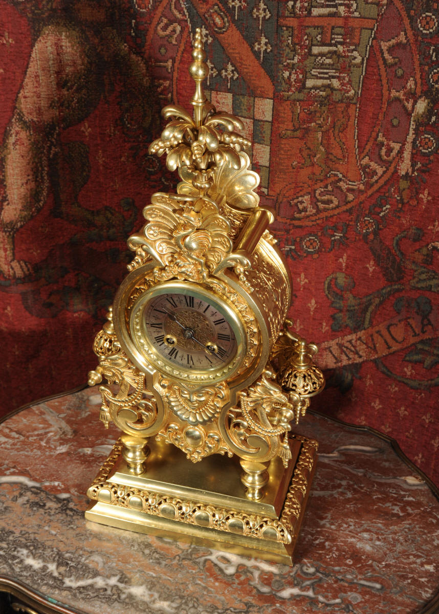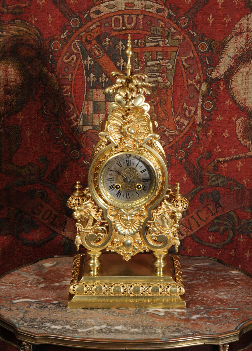 The stunning dial is bronze with an engraved silvered chapter ring. The Lenzkirch movement is of French design and we can date this from the serial number 549365 to the year 1881. It is in excellent and fully running condition, we have overhauled and thoroughly tested it in our workshop. It strikes a bell at the hours and the halves and runs for 8 days. The pendulum is a replacement. Please see the video below. Condition of the case is excellent, the original gilding is beautifully clean and bright with hardly any wear or discolouration and there are no losses. The dial is also in excellent condition This is a stunning clock in beautiful condition.