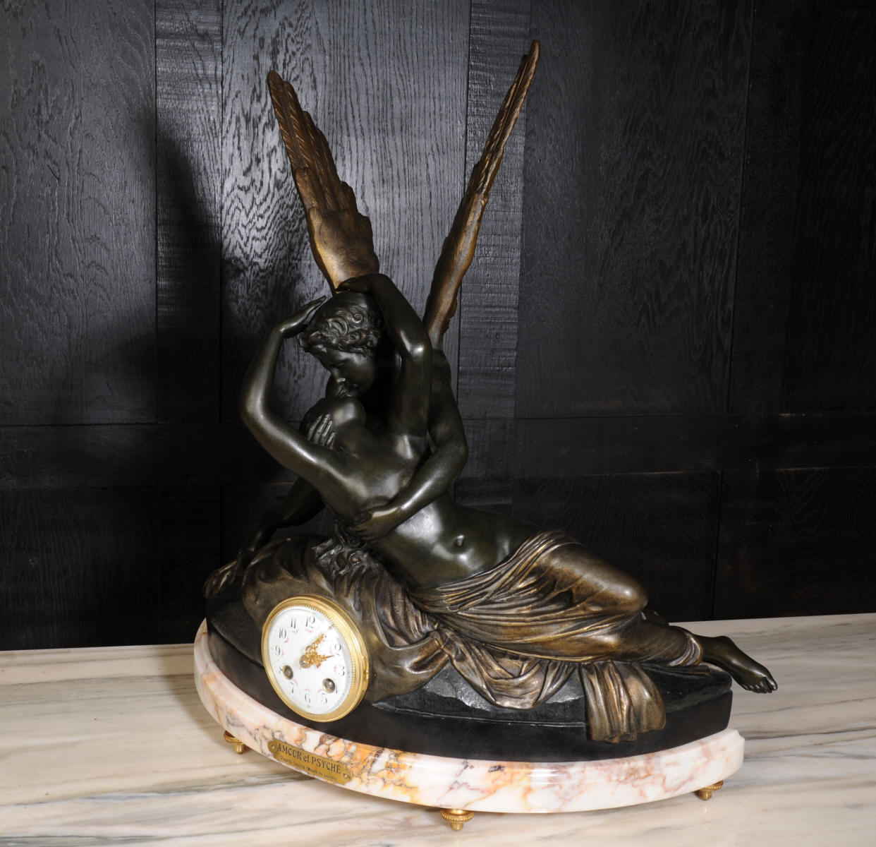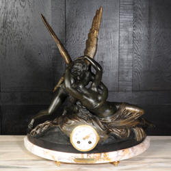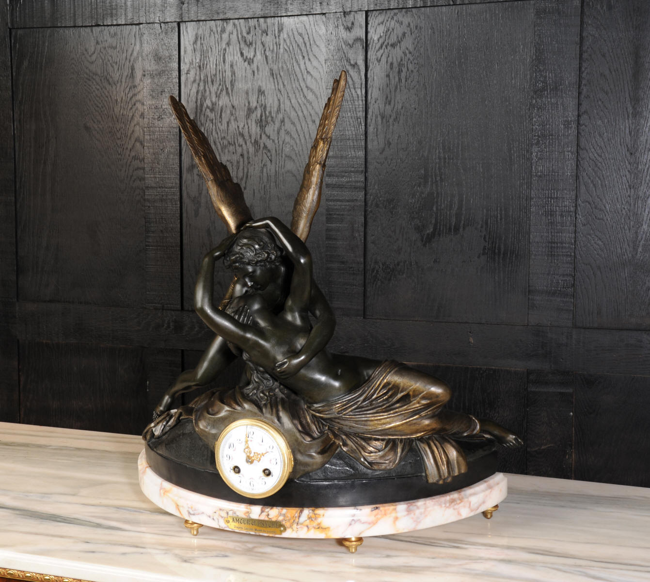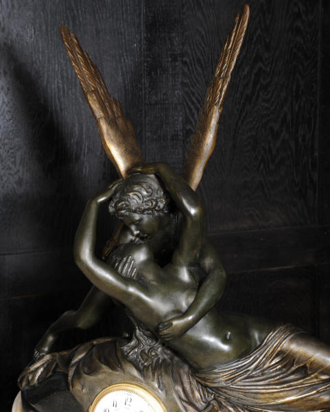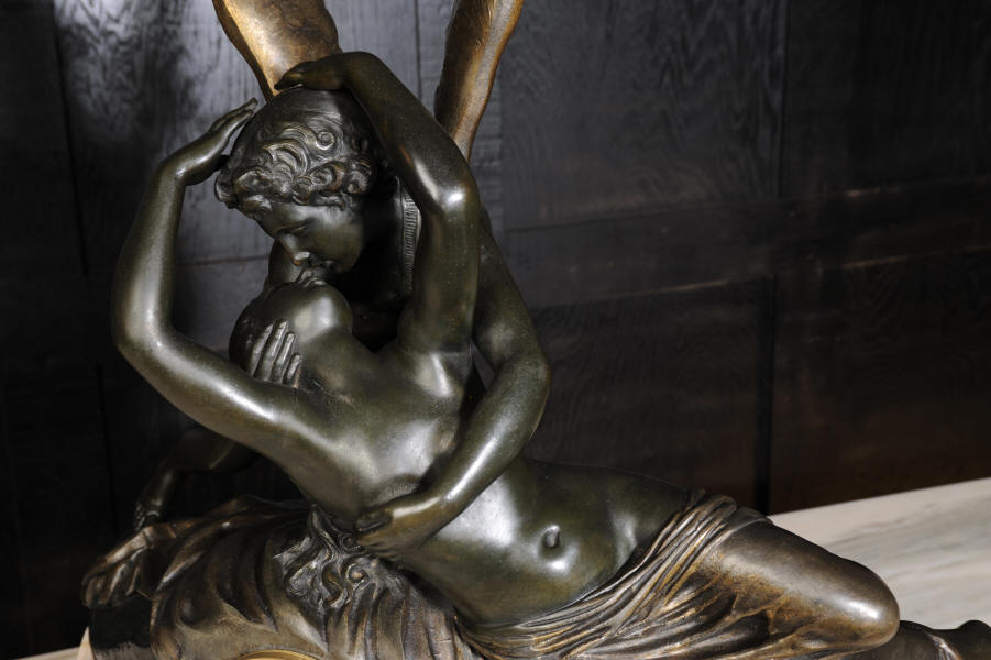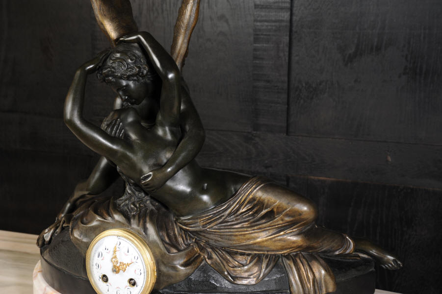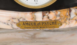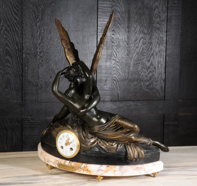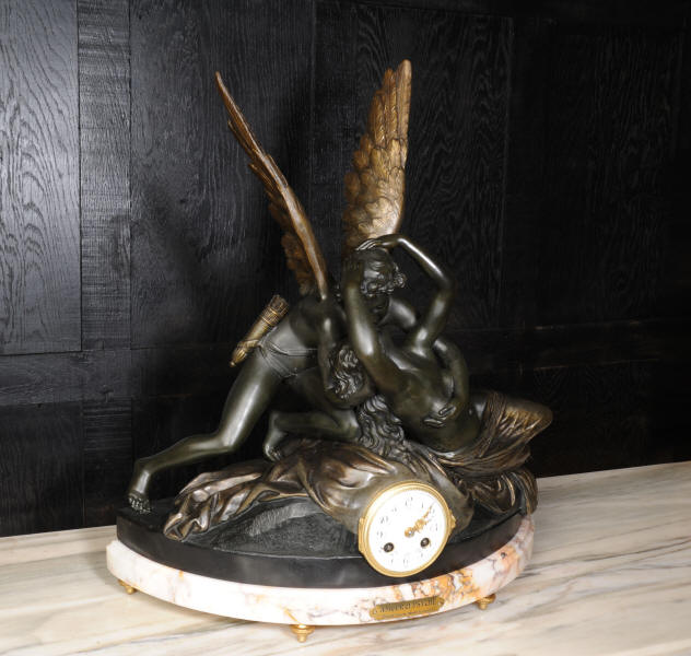 This winged young man who has just landed on a rock where a girl lies unconscious, is the god Eros – Cupid in Latin – and can be recognized by his wings and his quiver filled with arrows. The girl’s name is Psyche. Cupid’s mother Venus, goddess of Beauty, demanded that Psyche bring back a flask from the Underworld, strictly forbidding her to open it. But Psyche’s curiosity got the better of her; and no sooner had she had breathed in the terrible fumes than she fell into a deep, deathlike sleep. Seeing her lying motionless, Cupid rushed to her and touched her gently with the tip of his arrow, to make sure she was not dead. This is the moment caught by the sculptor: Cupid lifts his beloved Psyche in a tender embrace, his face close to hers. Psyche lets herself sink slowly backwards, languorously taking her lover’s head between her hands. Canova took his inspiration from a legend recounted by Latin author Apuleius in the Metamorphoses At the close of the tale the gods decide in council to grant Cupid Psyche’s hand in marriage, according her immortality and making her the goddess of the Soul. From the Musée du Louvre website. The dial is enamel on copper with exquisitely painted floral swags between the numerals and original finely fretted gilt brass hands. The French movement is by Japy Freres and is of the maker's usual high quality. The Japy Freres mark is on the movement backplate. It is in excellent clean and running condition having been fully overhauled by our clockmaker. Pendulum is a replacement. It runs for 8 days and strikes the hours and halves on a bell. Click the video clip below to hear the bell and watch the clock running! Condition of the case is excellent, the original patination is very good with just some slight wear in places, especially near the dial. The marble is also excellent with only tiny nibbles. The dial has no damage. A truly stunning clock to add to your collection.