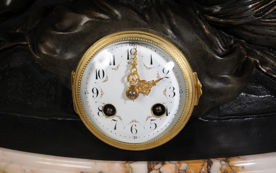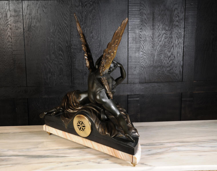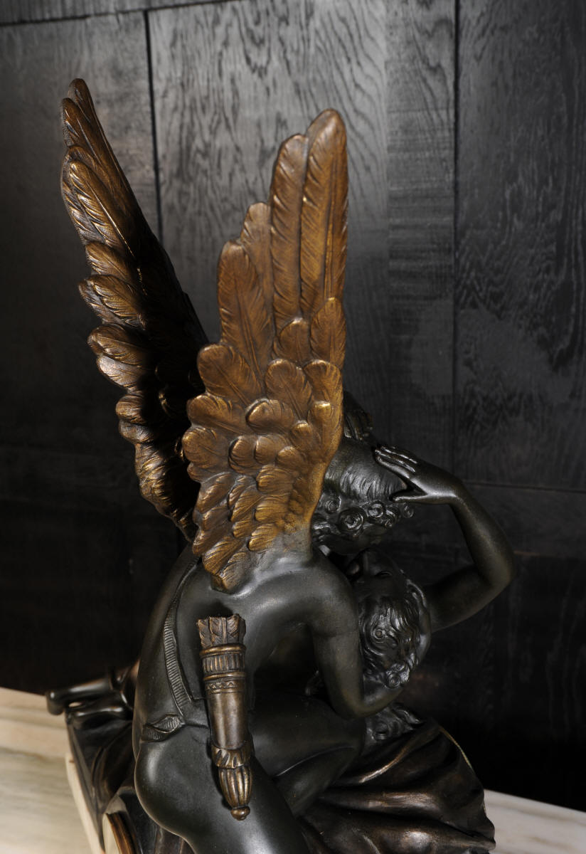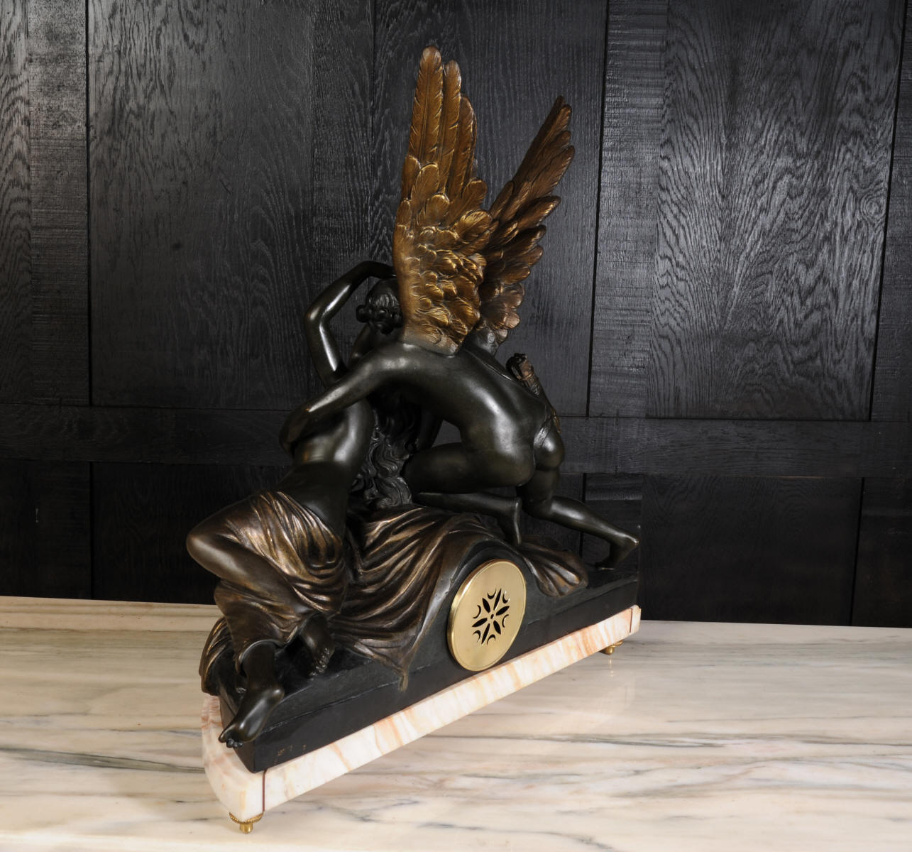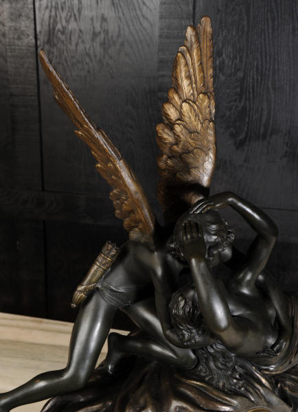 This winged young man who has just landed on a rock where a girl lies unconscious, is the god Eros – Cupid in Latin – and can be recognized by his wings and his quiver filled with arrows. The girl’s name is Psyche. Cupid’s mother Venus, goddess of Beauty, demanded that Psyche bring back a flask from the Underworld, strictly forbidding her to open it. But Psyche’s curiosity got the better of her; and no sooner had she had breathed in the terrible fumes than she fell into a deep, deathlike sleep. Seeing her lying motionless, Cupid rushed to her and touched her gently with the tip of his arrow, to make sure she was not dead. This is the moment caught by the sculptor: Cupid lifts his beloved Psyche in a tender embrace, his face close to hers. Psyche lets herself sink slowly backwards, languorously taking her lover’s head between her hands. Canova took his inspiration from a legend recounted by Latin author Apuleius in the Metamorphoses At the close of the tale the gods decide in council to grant Cupid Psyche’s hand in marriage, according her immortality and making her the goddess of the Soul. From the Musée du Louvre website. The dial is enamel on copper with exquisitely painted floral swags between the numerals and original finely fretted gilt brass hands. The French movement is by Japy Freres and is of the maker's usual high quality. The Japy Freres mark is on the movement backplate. It is in excellent clean and running condition having been fully overhauled by our clockmaker. Pendulum is a replacement. It runs for 8 days and strikes the hours and halves on a bell. Click the video clip below to hear the bell and watch the clock running! Condition of the case is excellent, the original patination is very good with just some slight wear in places, especially near the dial. The marble is also excellent with only tiny nibbles. The dial has no damage. A truly stunning clock to add to your collection.
