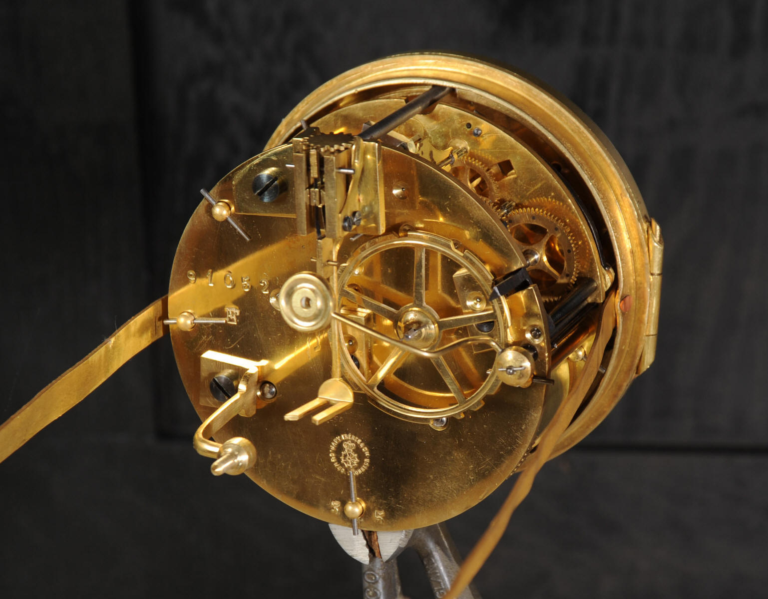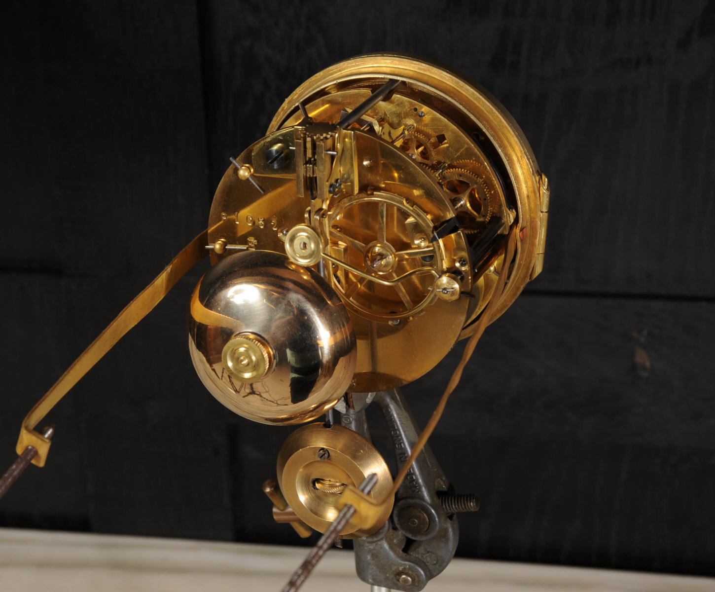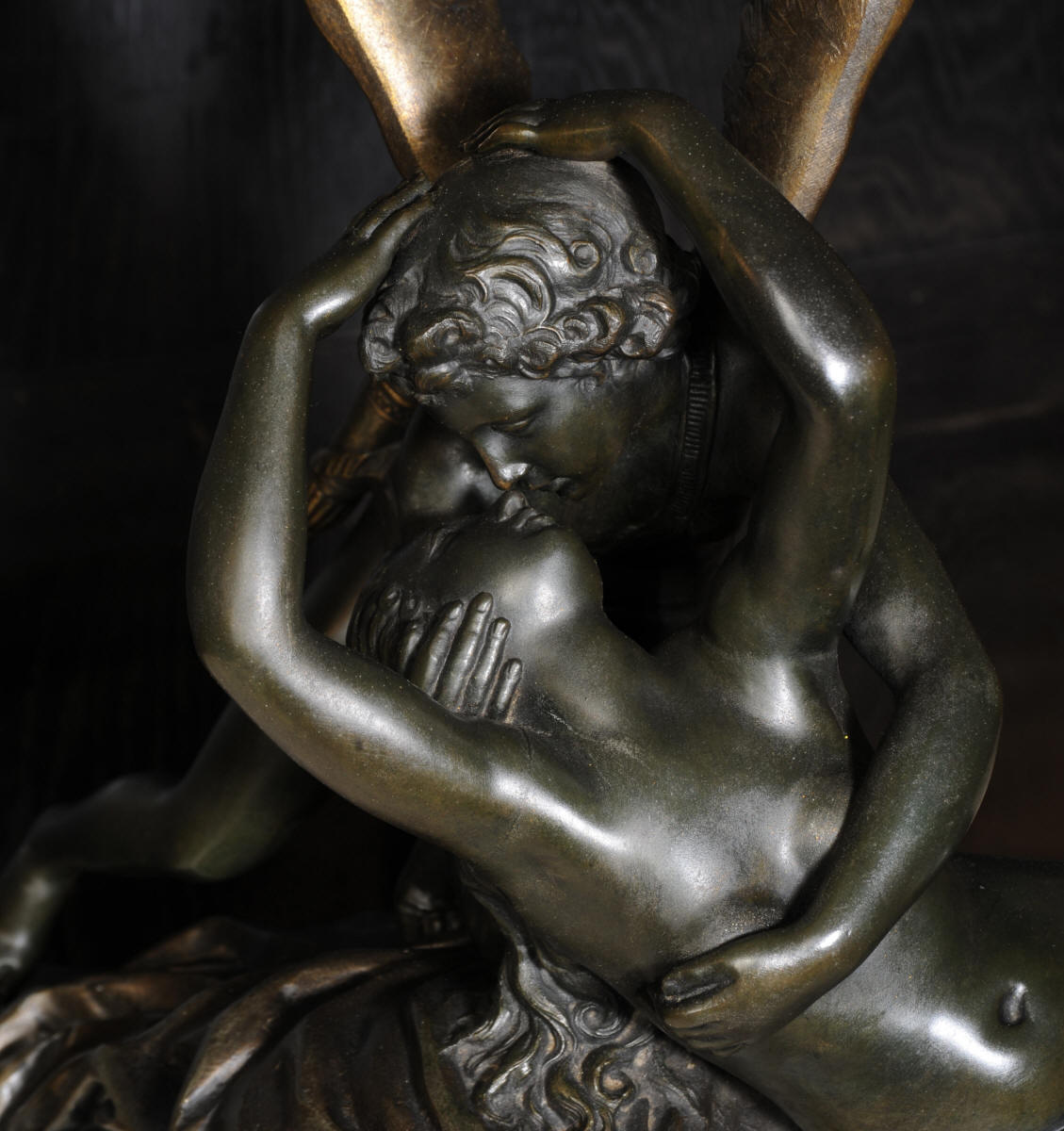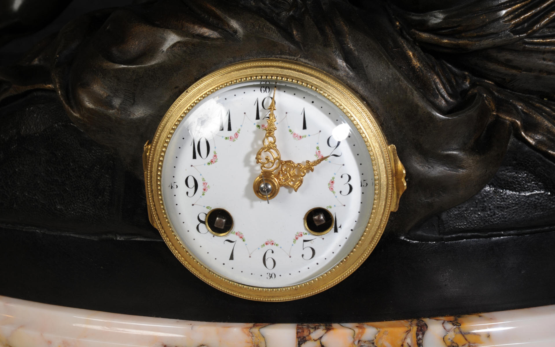 This winged young man who has just landed on a rock where a girl lies unconscious, is the god Eros – Cupid in Latin – and can be recognized by his wings and his quiver filled with arrows. The girl’s name is Psyche. Cupid’s mother Venus, goddess of Beauty, demanded that Psyche bring back a flask from the Underworld, strictly forbidding her to open it. But Psyche’s curiosity got the better of her; and no sooner had she had breathed in the terrible fumes than she fell into a deep, deathlike sleep. Seeing her lying motionless, Cupid rushed to her and touched her gently with the tip of his arrow, to make sure she was not dead. This is the moment caught by the sculptor: Cupid lifts his beloved Psyche in a tender embrace, his face close to hers. Psyche lets herself sink slowly backwards, languorously taking her lover’s head between her hands. Canova took his inspiration from a legend recounted by Latin author Apuleius in the Metamorphoses At the close of the tale the gods decide in council to grant Cupid Psyche’s hand in marriage, according her immortality and making her the goddess of the Soul. From the Musée du Louvre website. The dial is enamel on copper with exquisitely painted floral swags between the numerals and original finely fretted gilt brass hands. The French movement is by Japy Freres and is of the maker's usual high quality. The Japy Freres mark is on the movement backplate. It is in excellent clean and running condition having been fully overhauled by our clockmaker. Pendulum is a replacement. It runs for 8 days and strikes the hours and halves on a bell. Click the video clip below to hear the bell and watch the clock running! Condition of the case is excellent, the original patination is very good with just some slight wear in places, especially near the dial. The marble is also excellent with only tiny nibbles. The dial has no damage. A truly stunning clock to add to your collection.