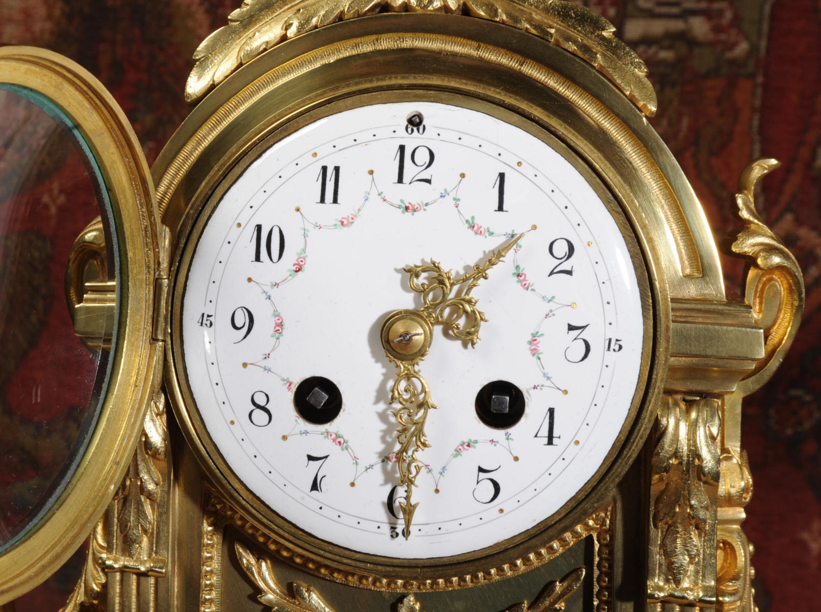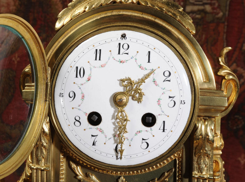 The stunning dial is enamel on copper, delicately painted with floral swags between the numbers. It is complete with original finely fretted gilt brass hands and convex glass.