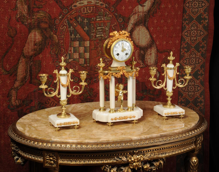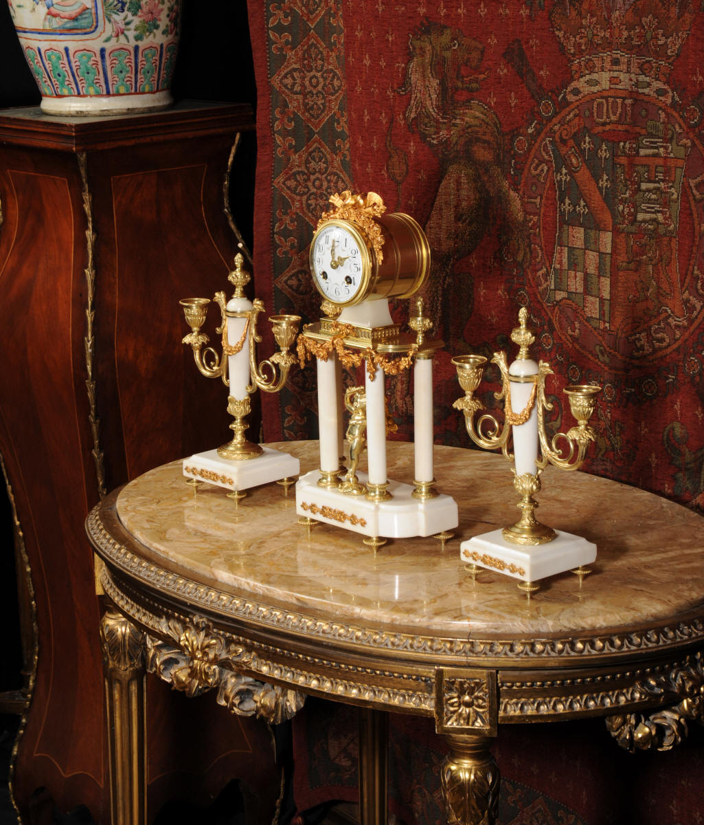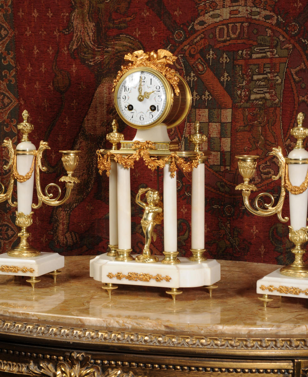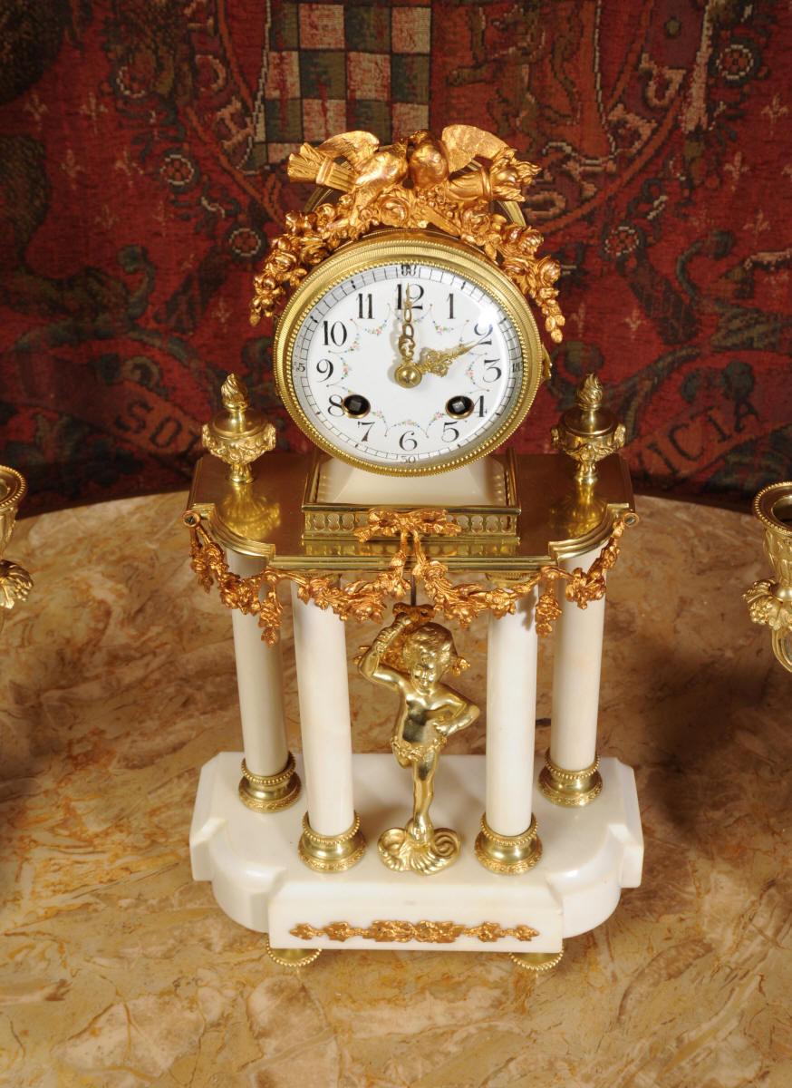 Antique Clock Set ~ Ormolu and White Marble