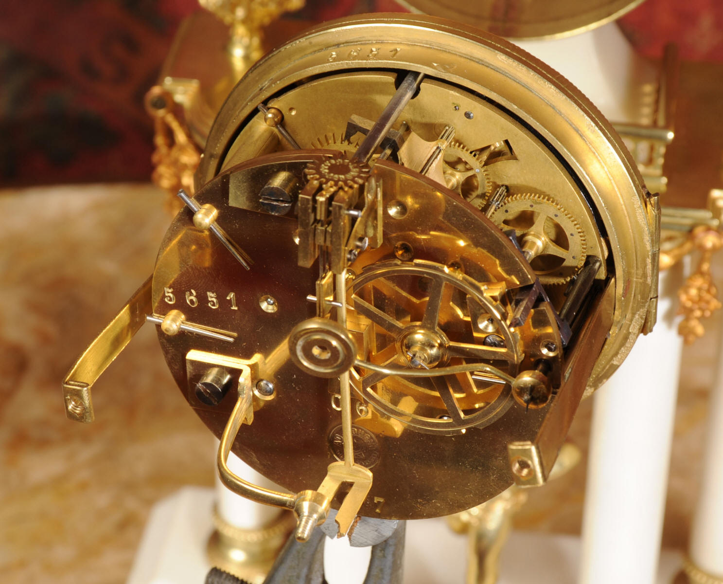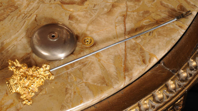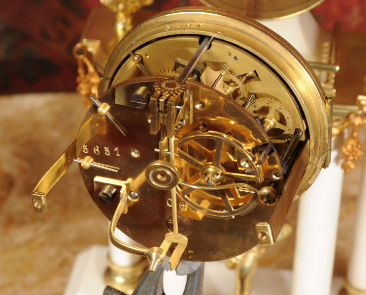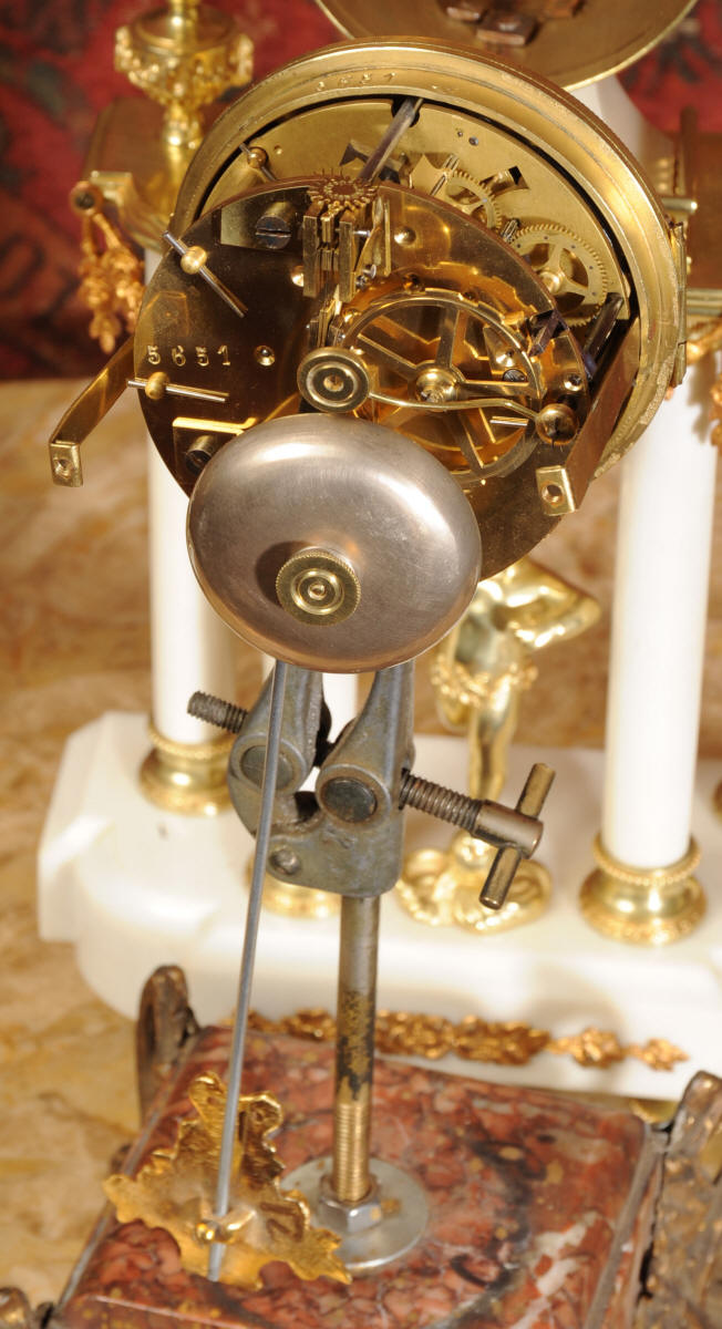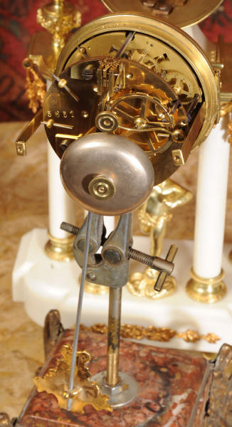 The French movement is by A. D. Mougin and is of high quality. It is in excellent clean and running condition having been fully overhauled by our clockmaker. The ormolu Pendulum is a replacement. It runs for 8 days and strikes the hours and halves on a bell. Click the video clip below to hear the bell and watch the clock running!