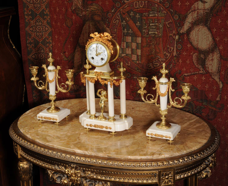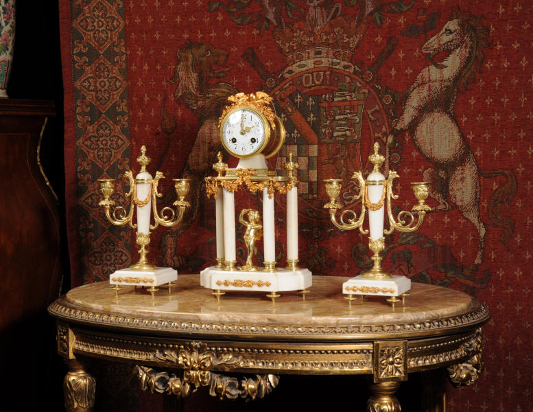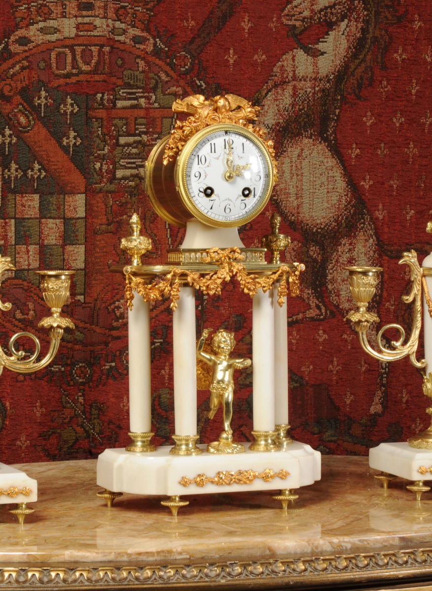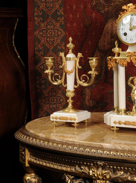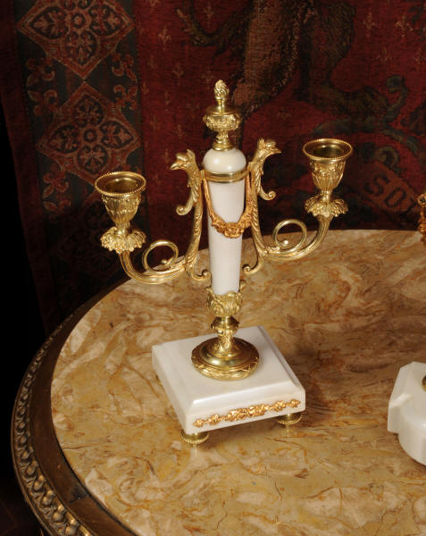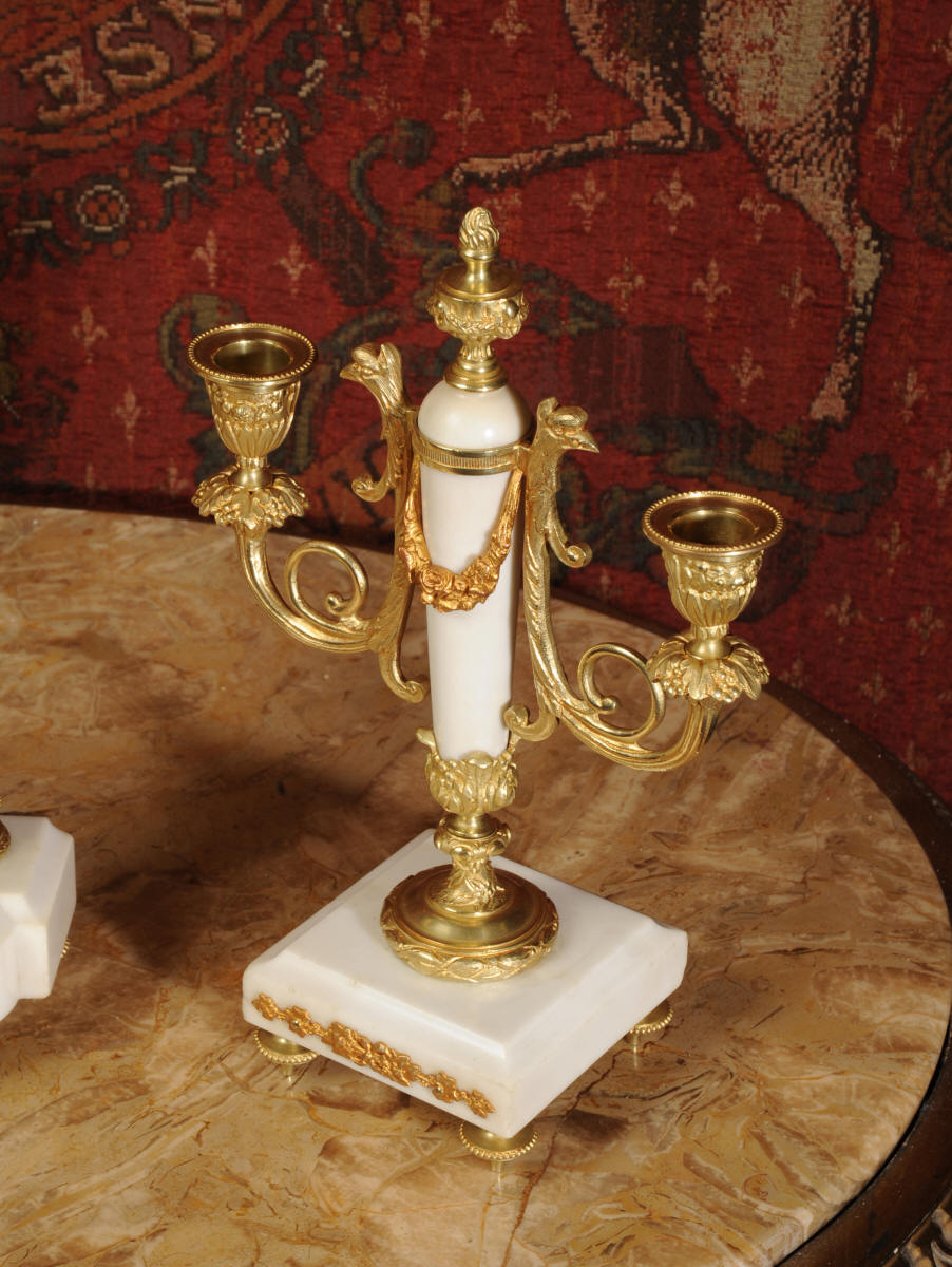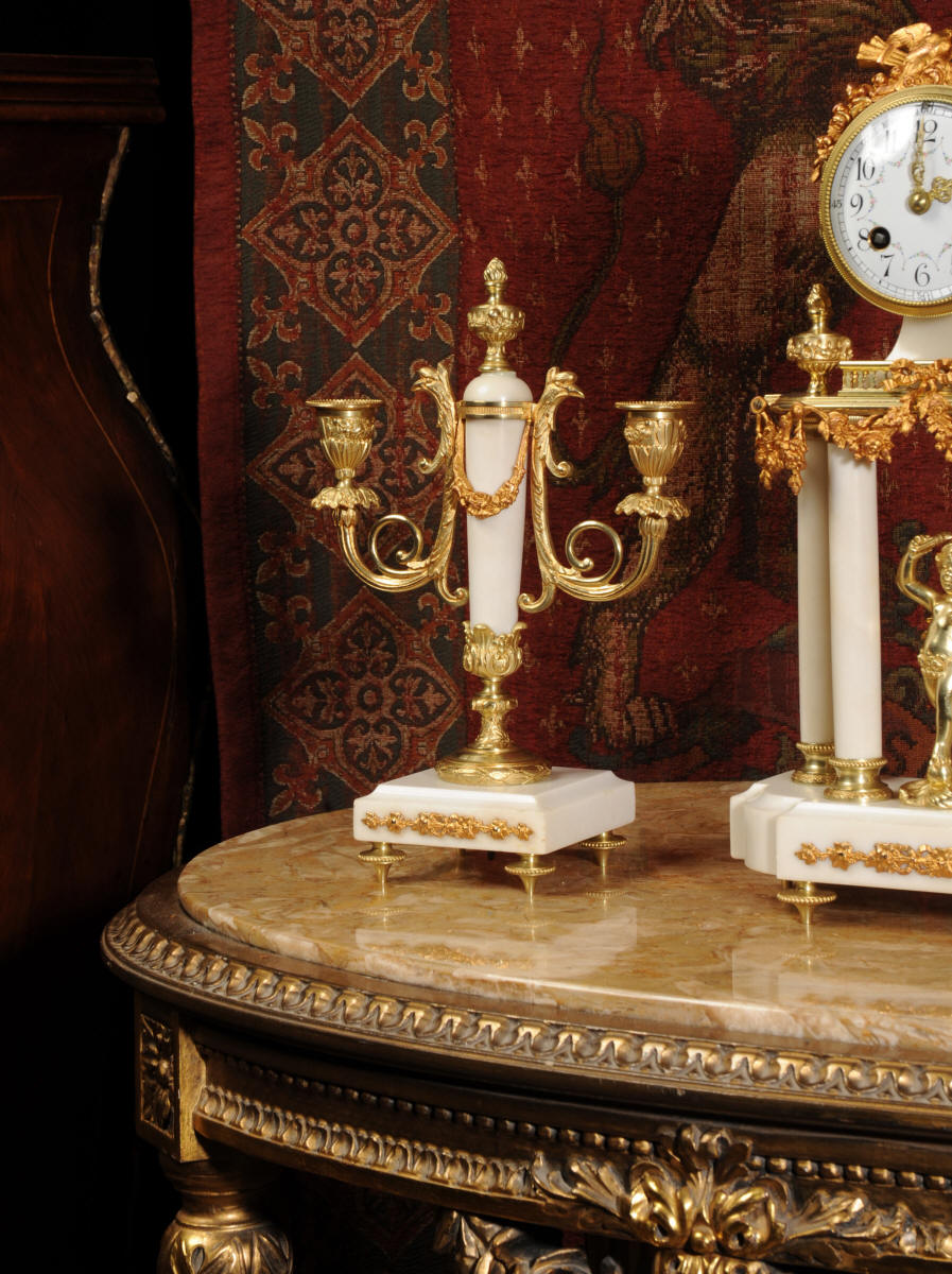 Condition of the case is excellent, the original gilding is beautifully clean and bright with hardly any wear or discolouration and there are no losses. The marble has discoloured in places to a mellow off-white and there are some nibbles to the edges and a knocked corner to the left hand side rear of the base of the clock. The dial is also in excellent condition with no chips or scratches, just some very slight fading to the lettering. The set makes a stunning display as you can see below.