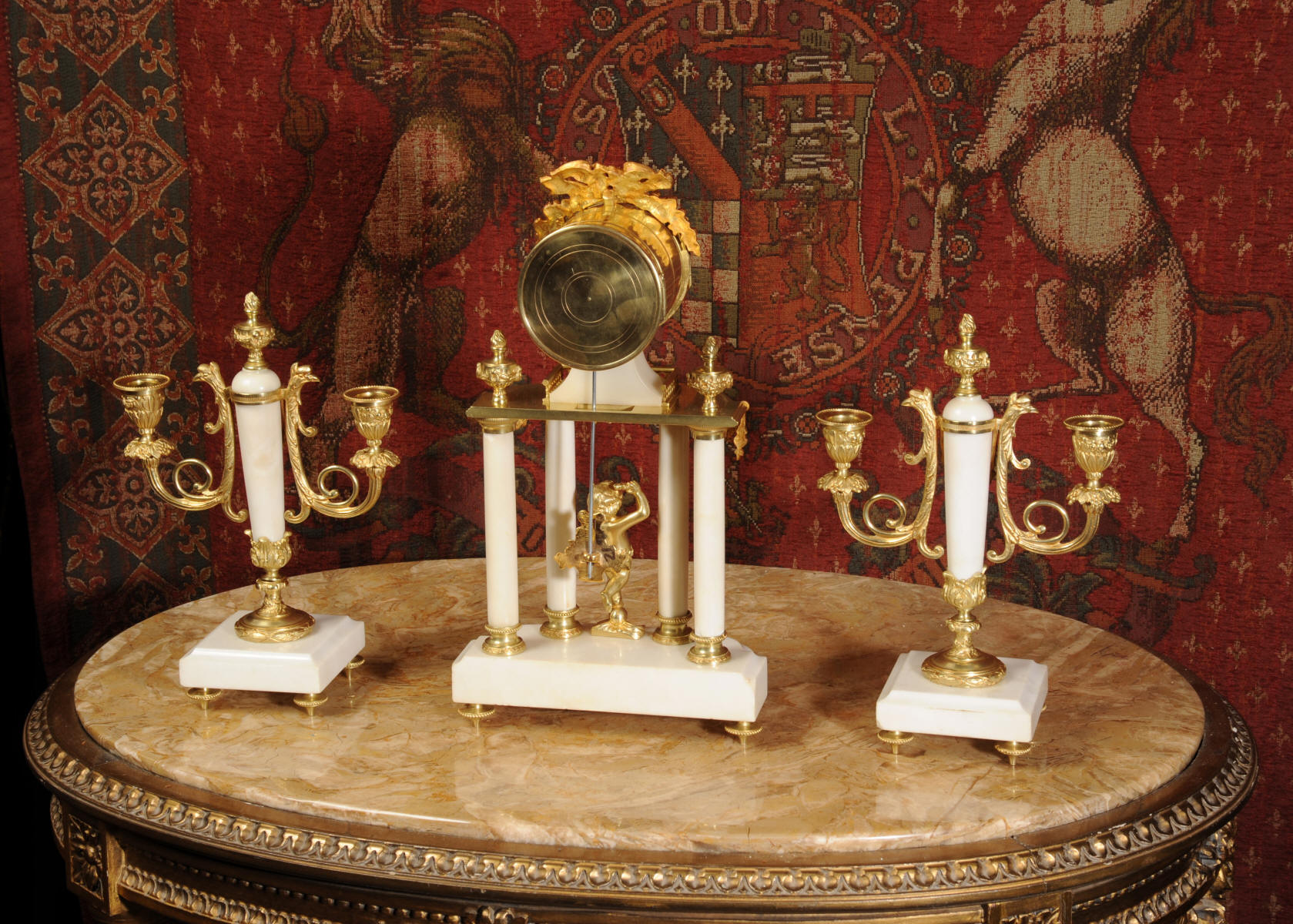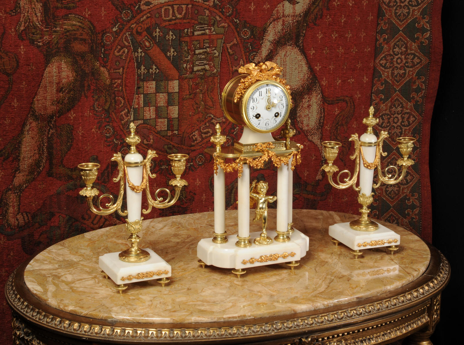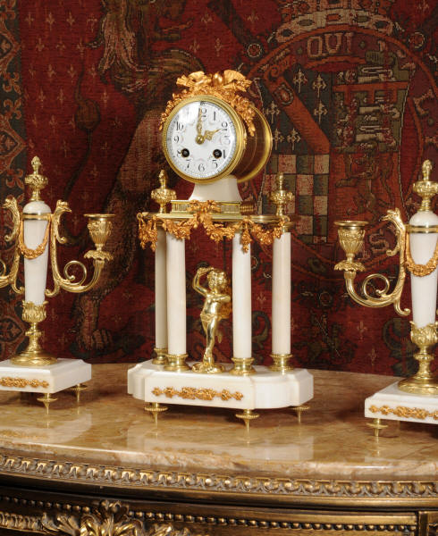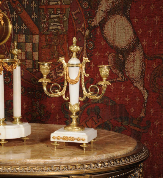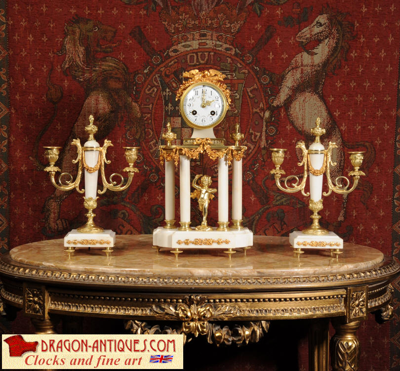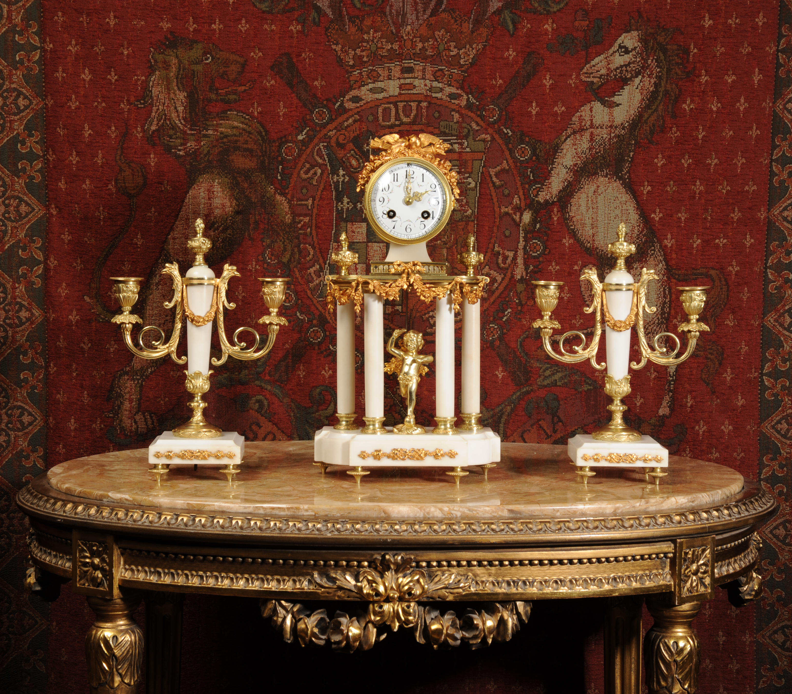 Condition of the case is excellent, the original gilding is beautifully clean and bright with hardly any wear or discolouration and there are no losses. The marble has discoloured in places to a mellow off-white and there are some nibbles to the edges and a knocked corner to the left hand side rear of the base of the clock. The dial is also in excellent condition with no chips or scratches, just some very slight fading to the lettering. The set makes a stunning display as you can see below.