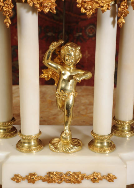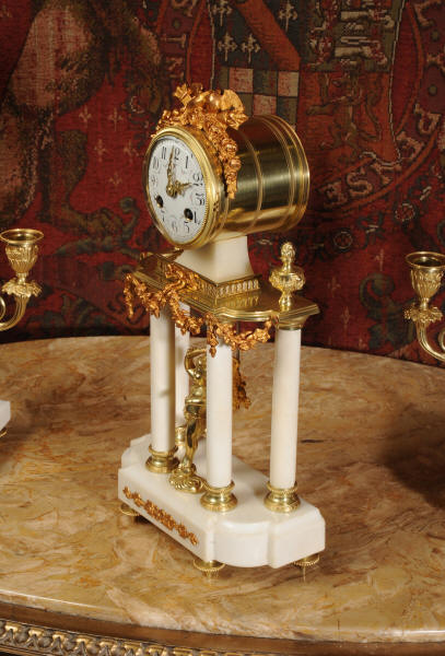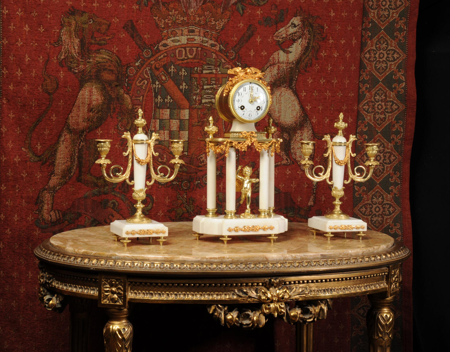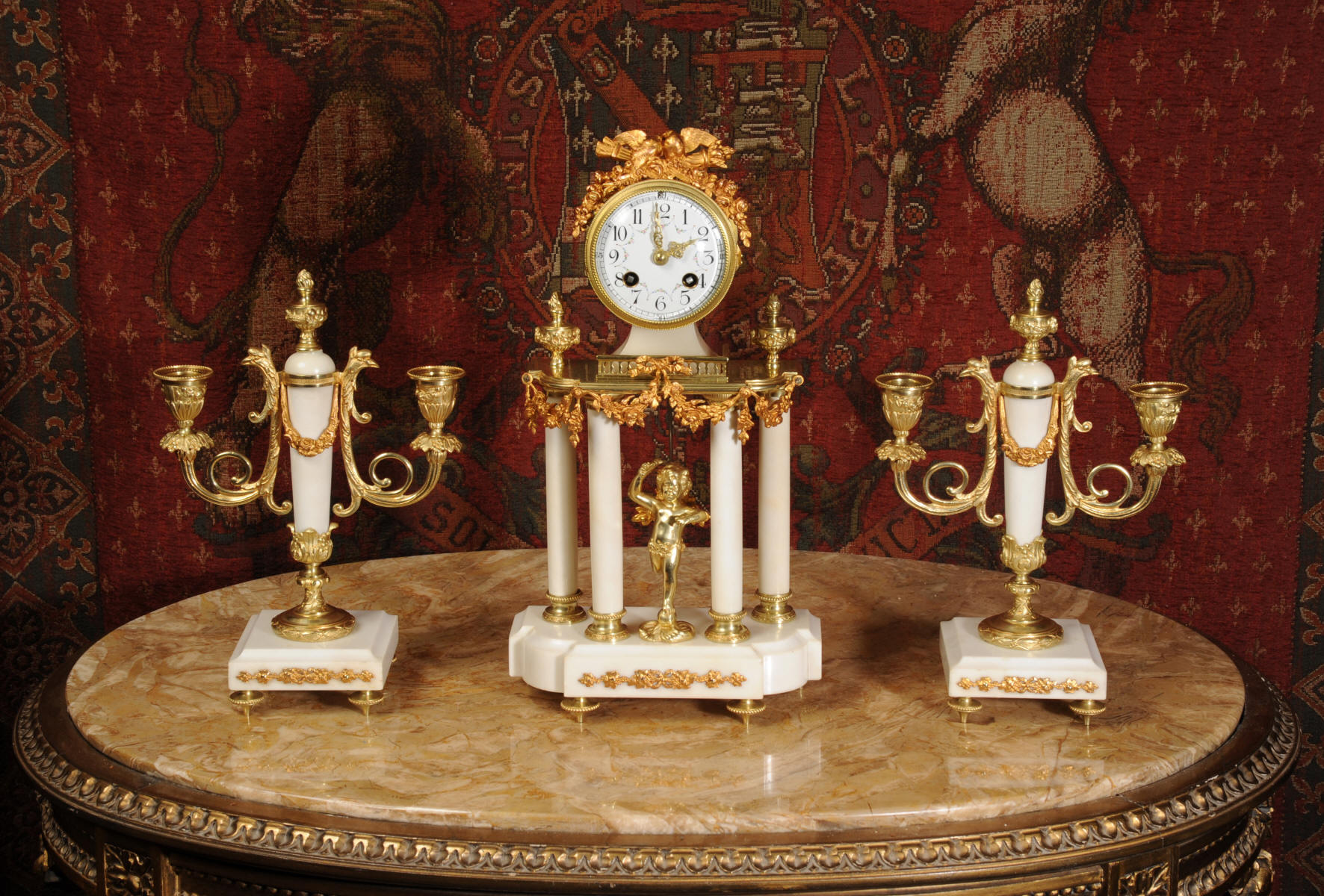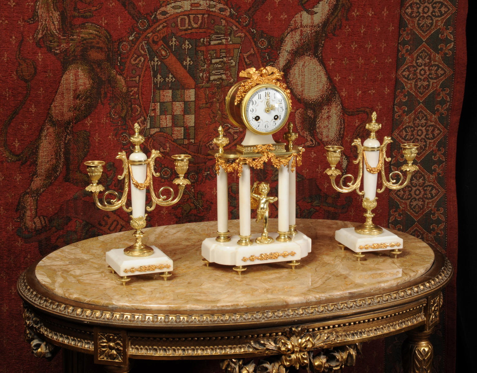 Condition of the case is excellent, the original gilding is beautifully clean and bright with hardly any wear or discolouration and there are no losses. The marble has discoloured in places to a mellow off-white and there are some nibbles to the edges and a knocked corner to the left hand side rear of the base of the clock. The dial is also in excellent condition with no chips or scratches, just some very slight fading to the lettering. The set makes a stunning display as you can see below.