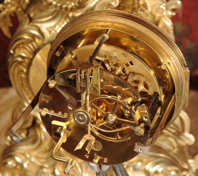 The French movement is by Samuel Marti and is of high quality. It is in excellent clean and running condition having been fully overhauled by our clockmaker. Pendulum is an old replacement. It runs for 8 days and strikes the hours and halves on a bell. Click the video clip below to hear the bell and watch the clock running!