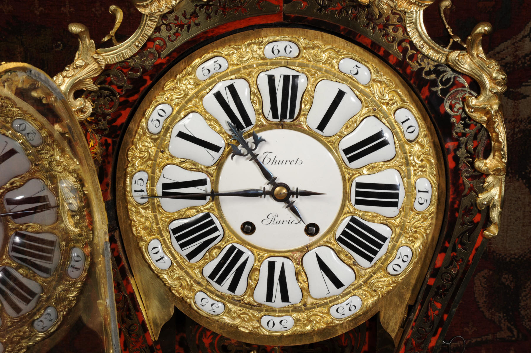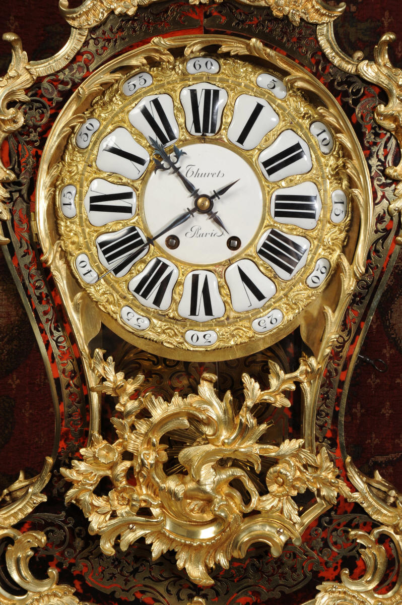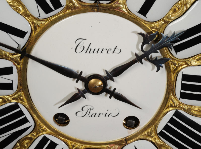 The dial is ormolu mounted with 24 individual enamel cartouches for the hours and minutes and one to the centre which is signed for the Paris retailer, Binet &Thuret, listed by Tardy Dictionnaire Des Horlogers Francais as working in the Rue Notre Dame de Nazareth in 1870. It is fitted with the original beautifully hand cut and blued steel hands.