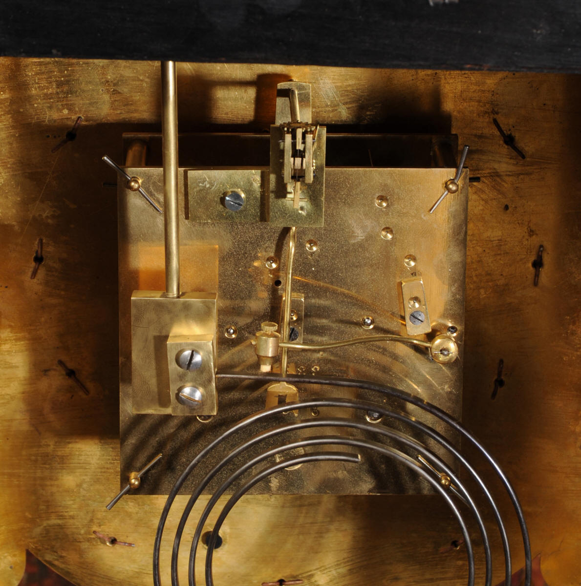 The French movement is by Vincenti et Cie and is of the highest quality. It is the large square plated version of the Pendule de Paris movement and has the benefit of rack striking. It is in excellent clean and running condition having been fully overhauled by our clockmaker. The large ormolu Pendulum is original. It runs for 8 days on one wind and strikes the hours and halves on a coiled gong. Click the video clip below to hear the gong and watch the clock running!