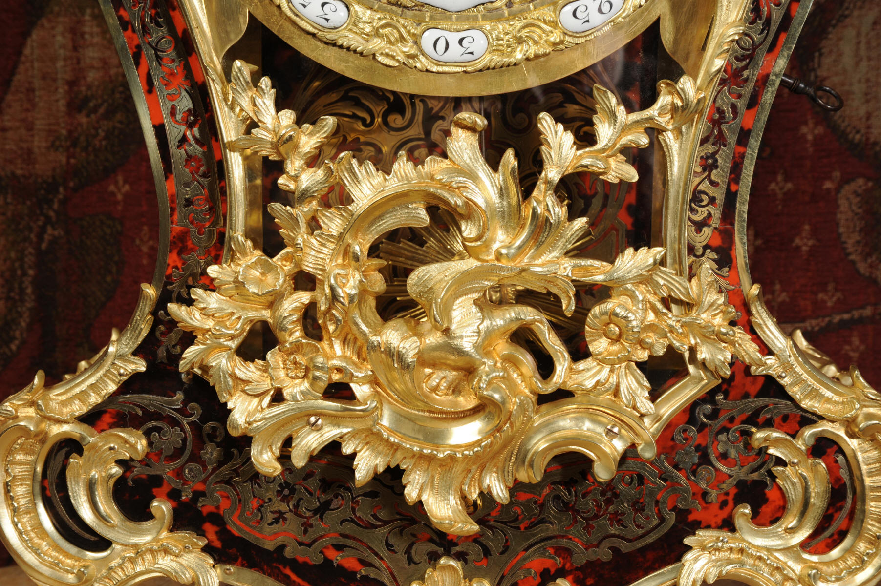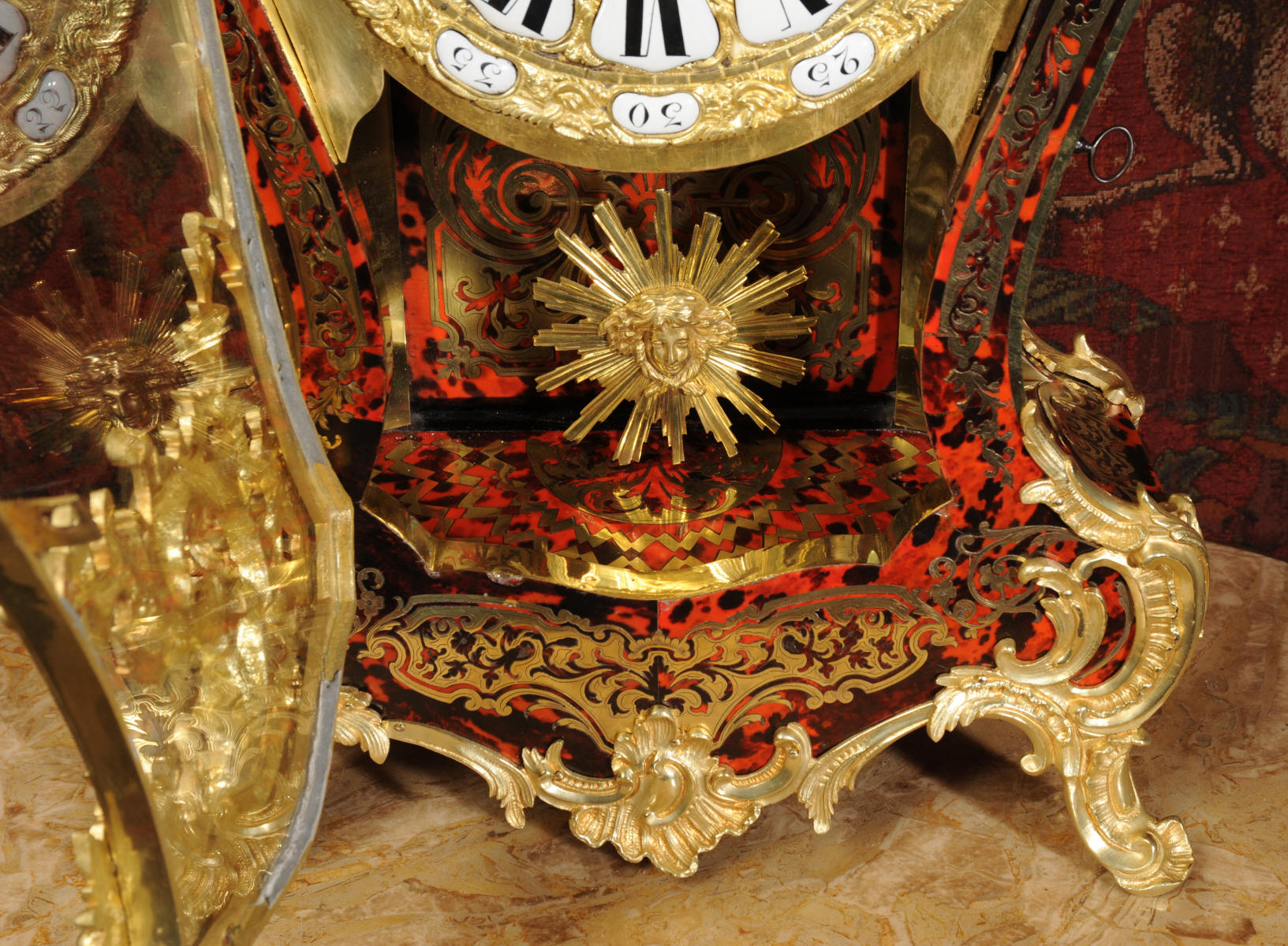 Condition of the case is excellent, the shell veneer is excellent with only very very minor losses. Brass inlay is also excellent, no losses and only some very very slight lifting in places. Ormolu is also excellent, clean, bright. Dial is also excellent with just some slight chipping around the right hand winding. The front door lock is fully working with original key.
