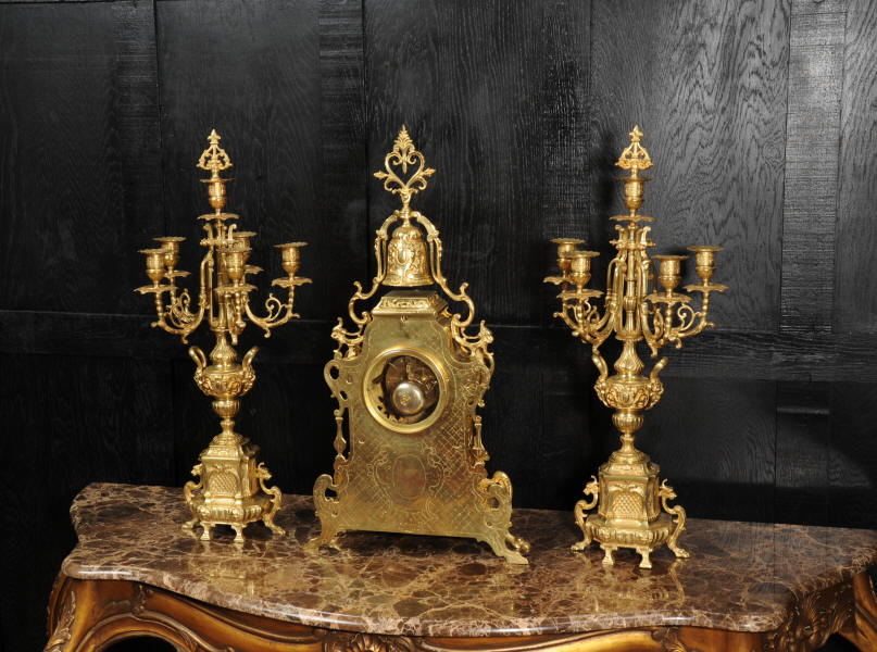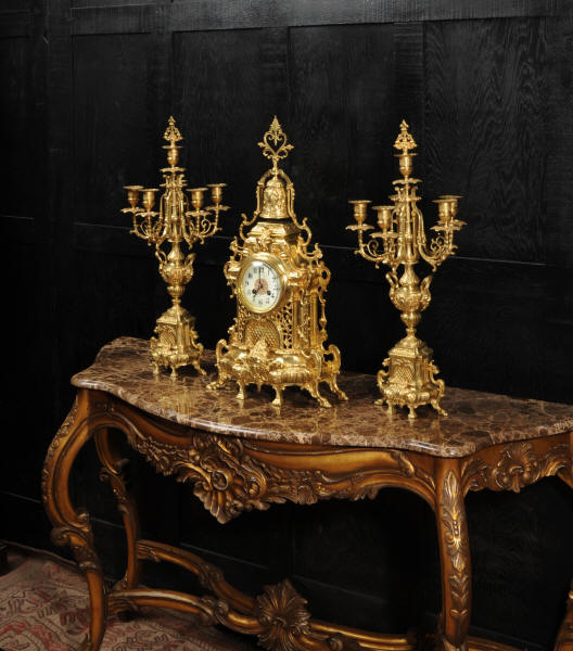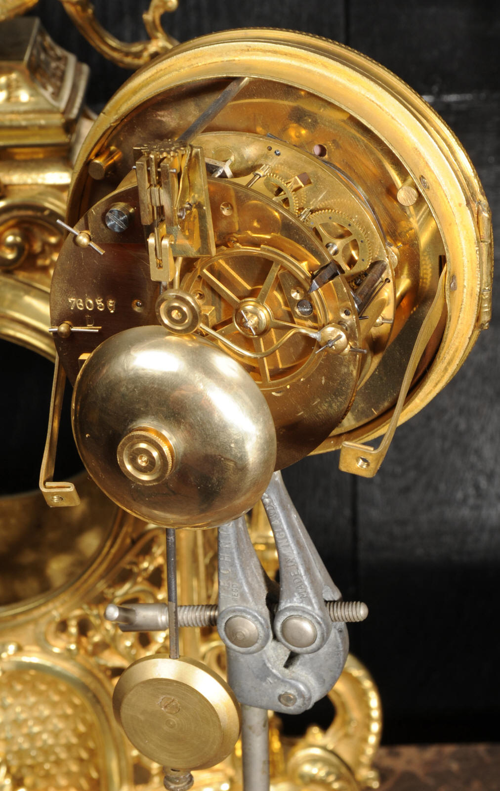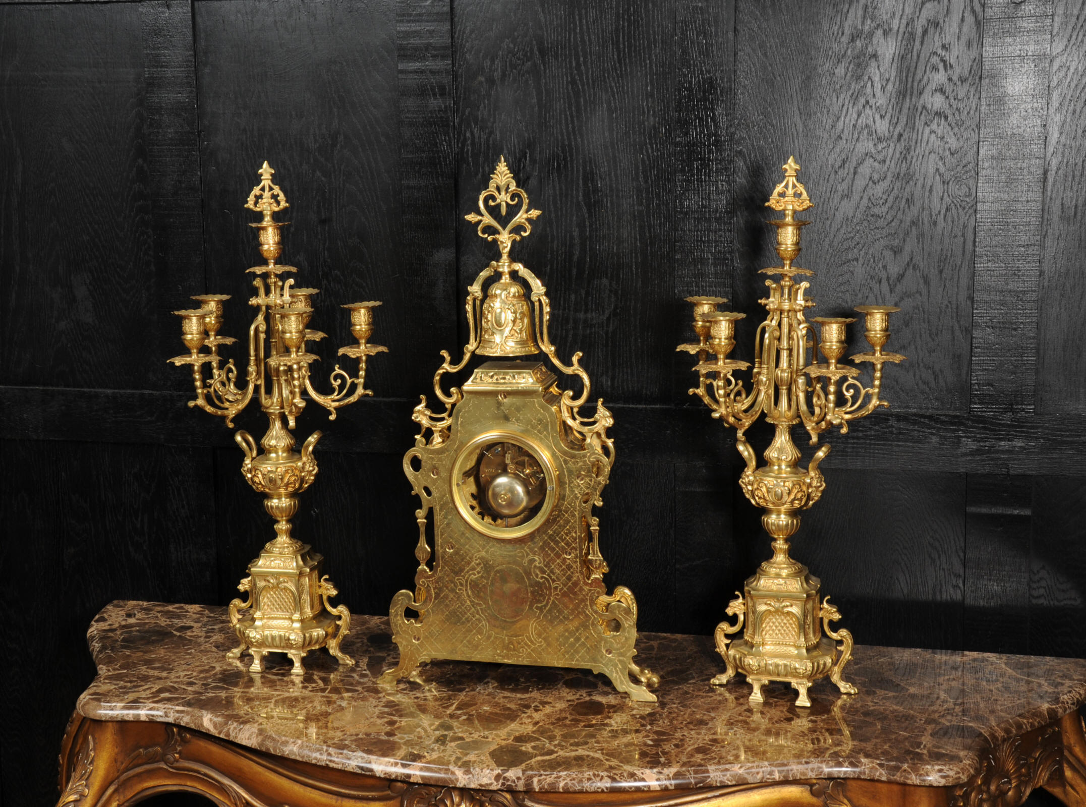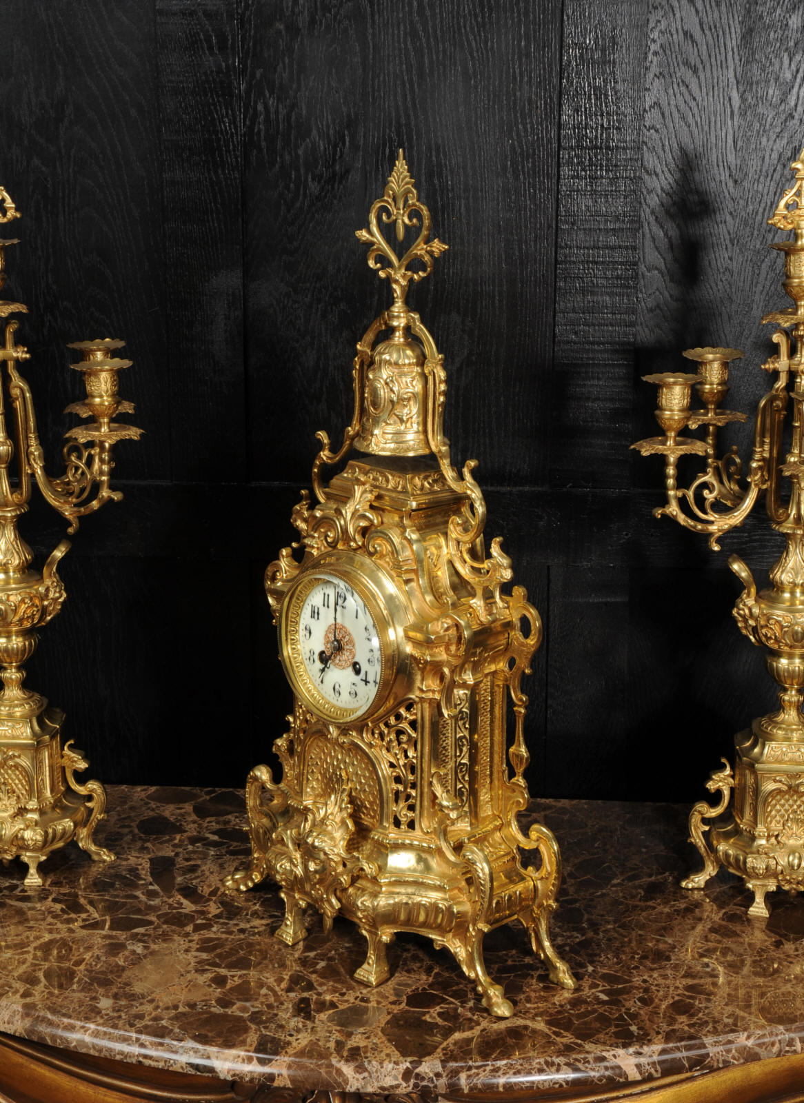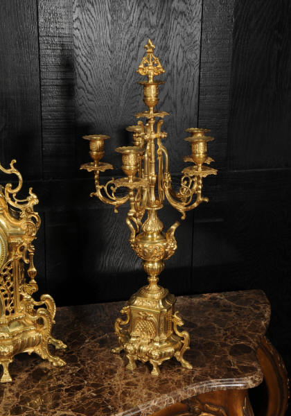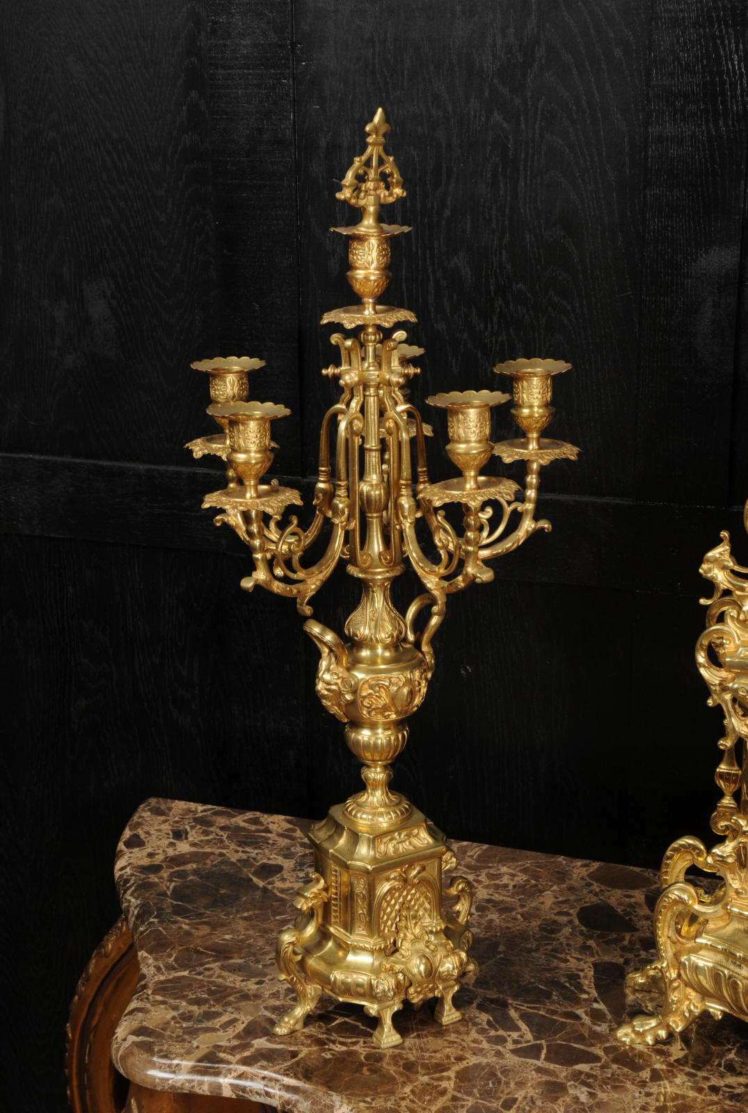 Candelabra are conforming in style with 5 branches formed as foliage. The set has it's original snuffers which stow in the central nozzles when not in use. The dial is porcelain on copper with a bronze centre and it's original blued steel hands. The rear door is also glazed to allow the movement to be seen. The Antique French movement is by Japy Frères and is of of excellent quality. It runs for 8 days on one wind and strikes half-hourly on a bell. It has been fully restored in our workshop and is on excellent clean and running condition. The pendulum is a replacement. Click the video clip below to see and hear the movement working. Condition of the case is excellent, gilding is bright with a clean finish, there is some very minor wear and discolouration in places. The candelabra are slightly distorted and one nozzle has an old repair. One front foot has a slight twist, possibly from new. The dial is also in good condition, there is a small chip near the right hand winding hole and some faint hairlines. The glass has a small chip to the edge of the glass.