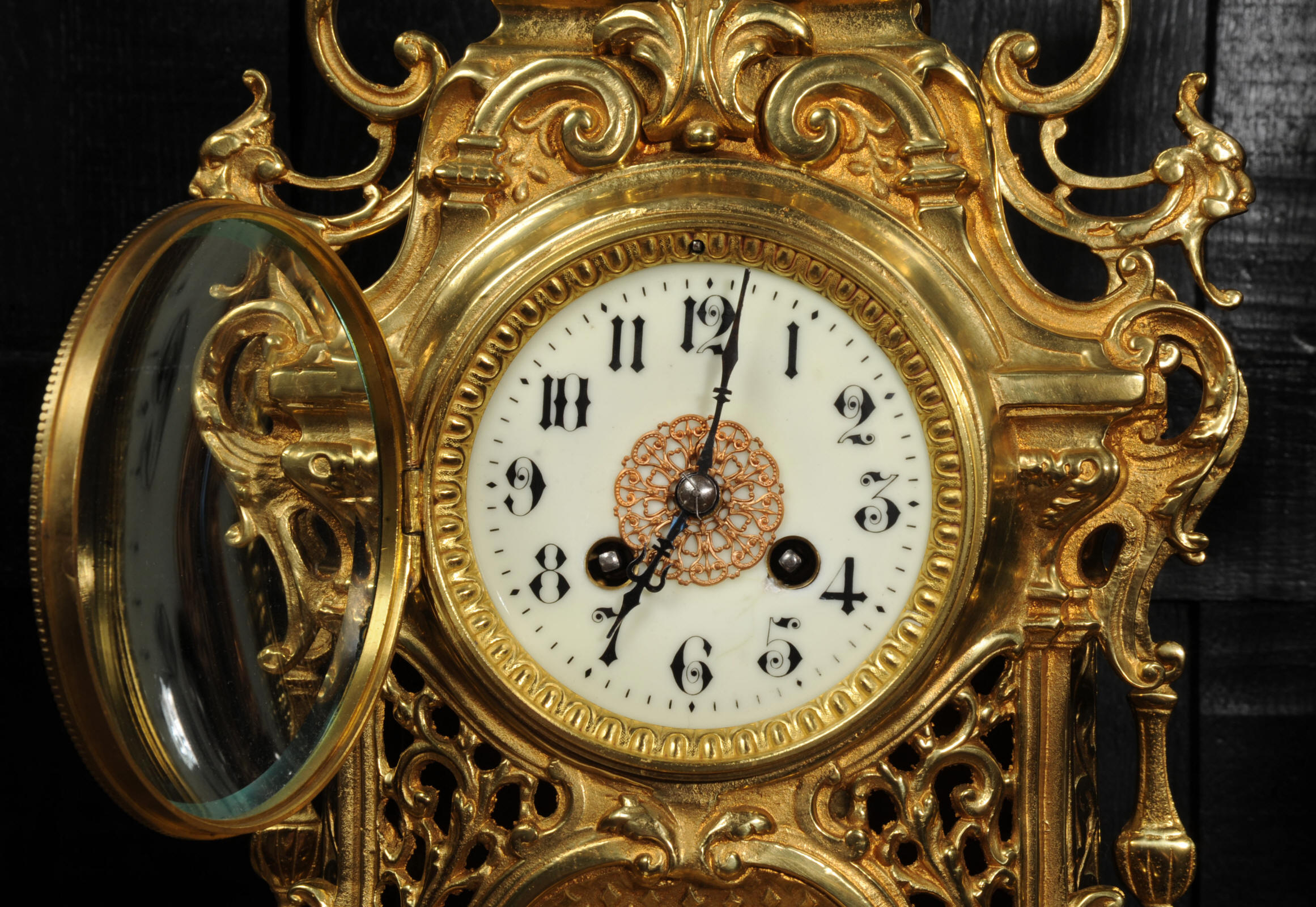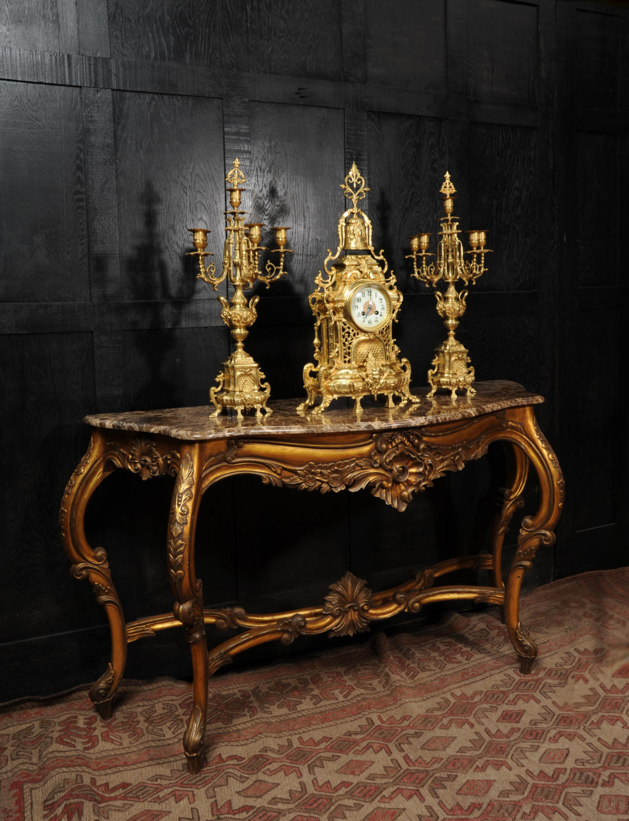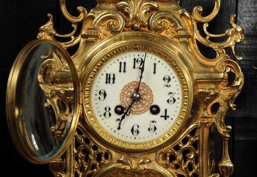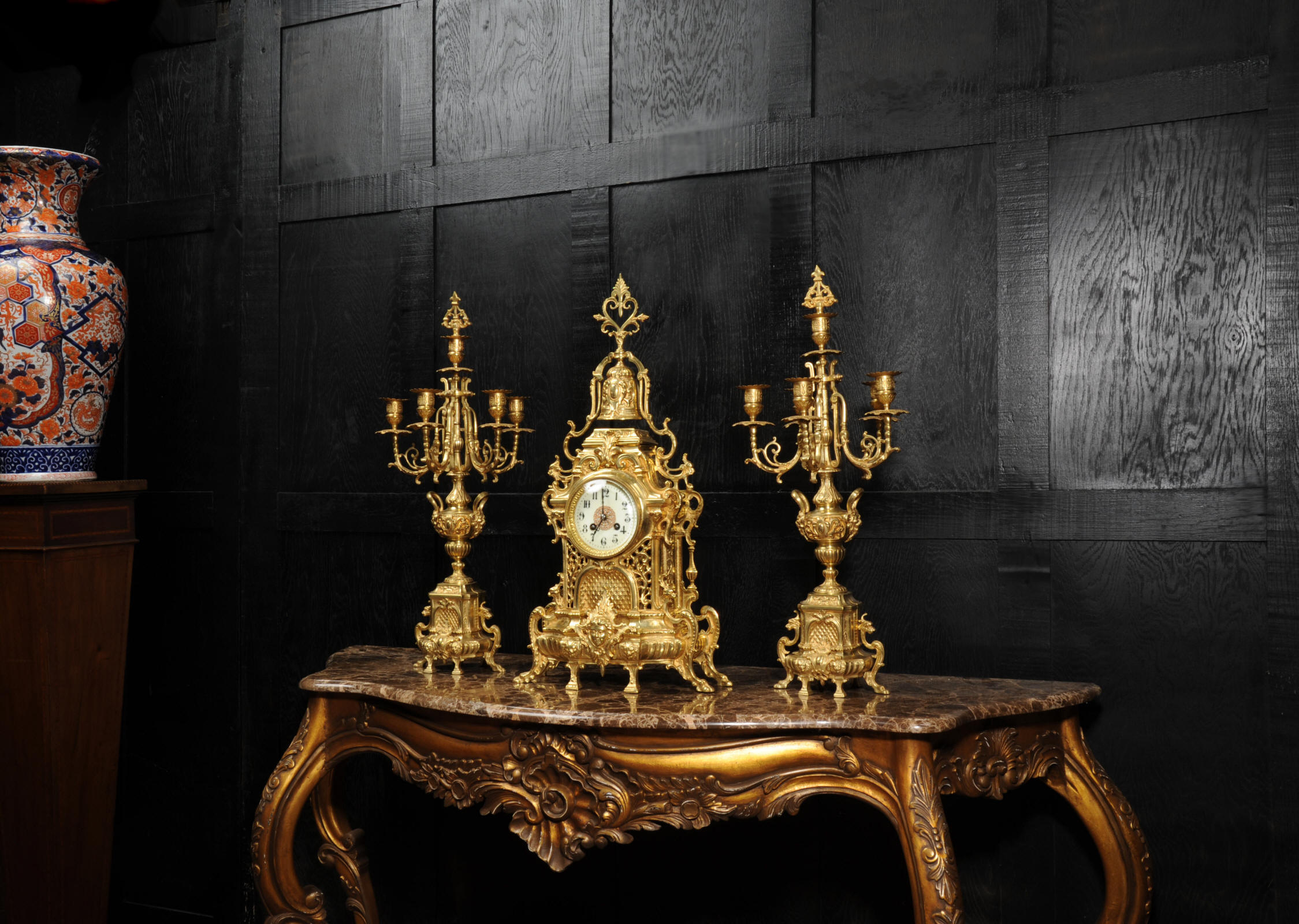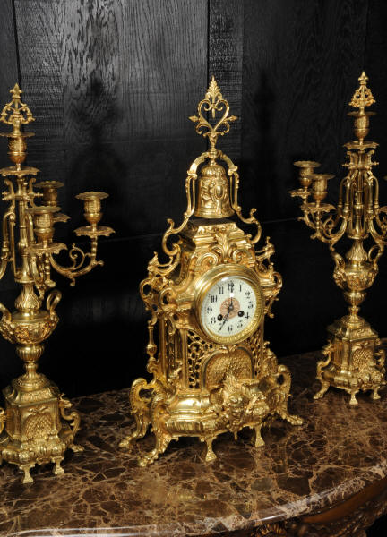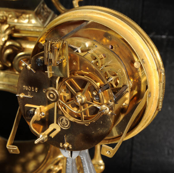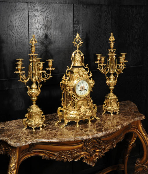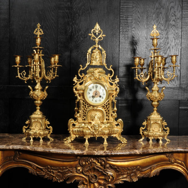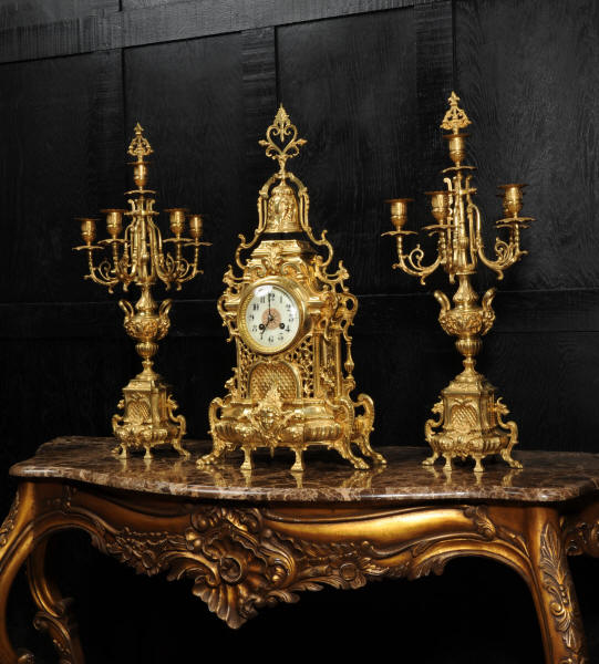 Candelabra are conforming in style with 5 branches formed as foliage. The set has it's original snuffers which stow in the central nozzles when not in use. The dial is porcelain on copper with a bronze centre and it's original blued steel hands. The rear door is also glazed to allow the movement to be seen. The Antique French movement is by Japy Frères and is of of excellent quality. It runs for 8 days on one wind and strikes half-hourly on a bell. It has been fully restored in our workshop and is on excellent clean and running condition. The pendulum is a replacement. Click the video clip below to see and hear the movement working. Condition of the case is excellent, gilding is bright with a clean finish, there is some very minor wear and discolouration in places. The candelabra are slightly distorted and one nozzle has an old repair. One front foot has a slight twist, possibly from new. The dial is also in good condition, there is a small chip near the right hand winding hole and some faint hairlines. The glass has a small chip to the edge of the glass.