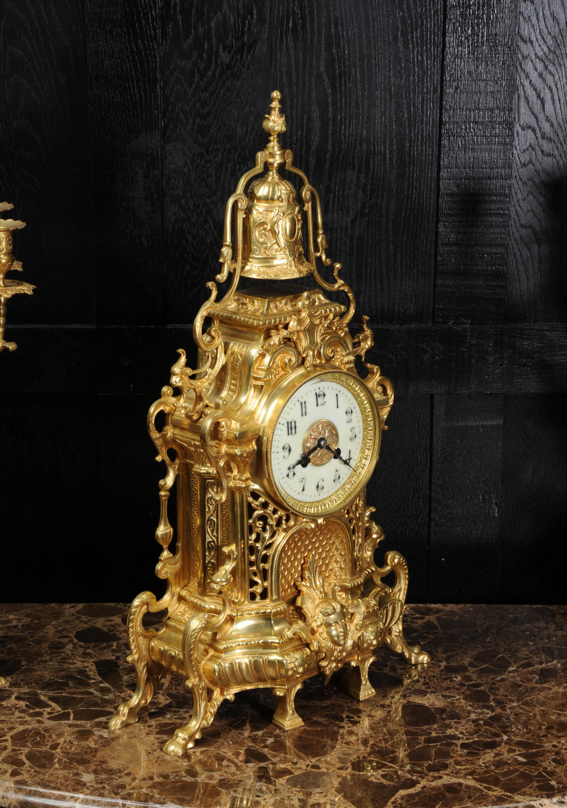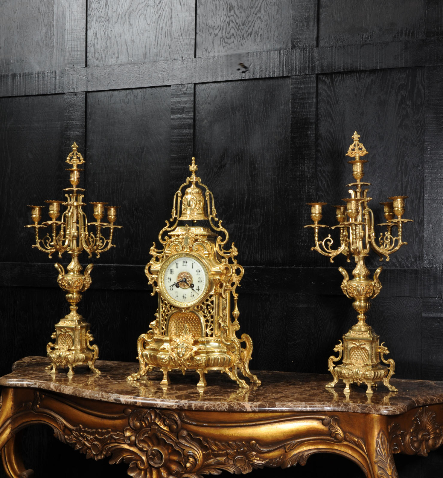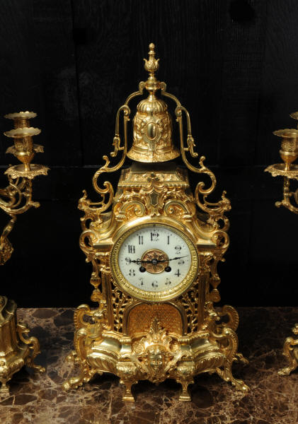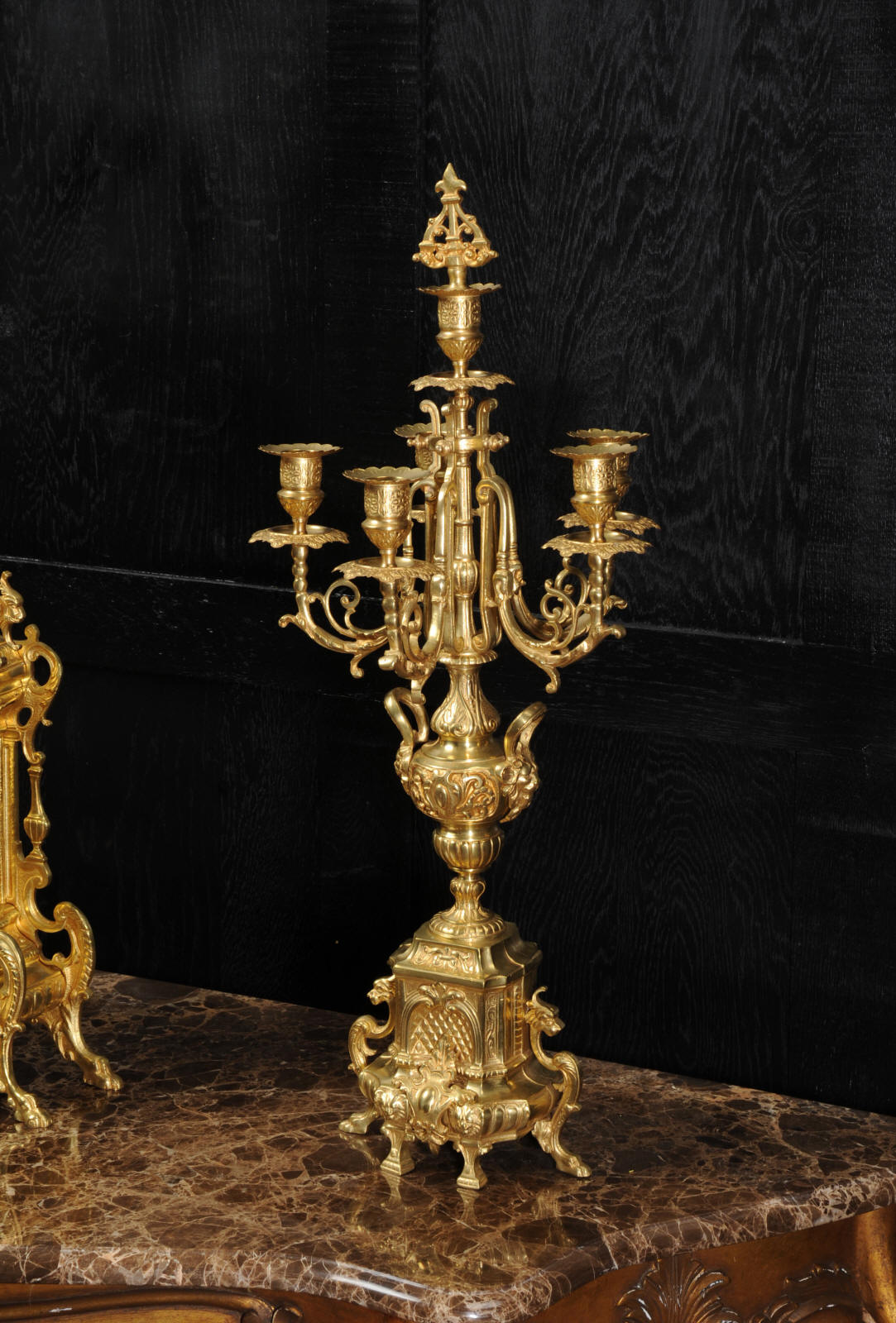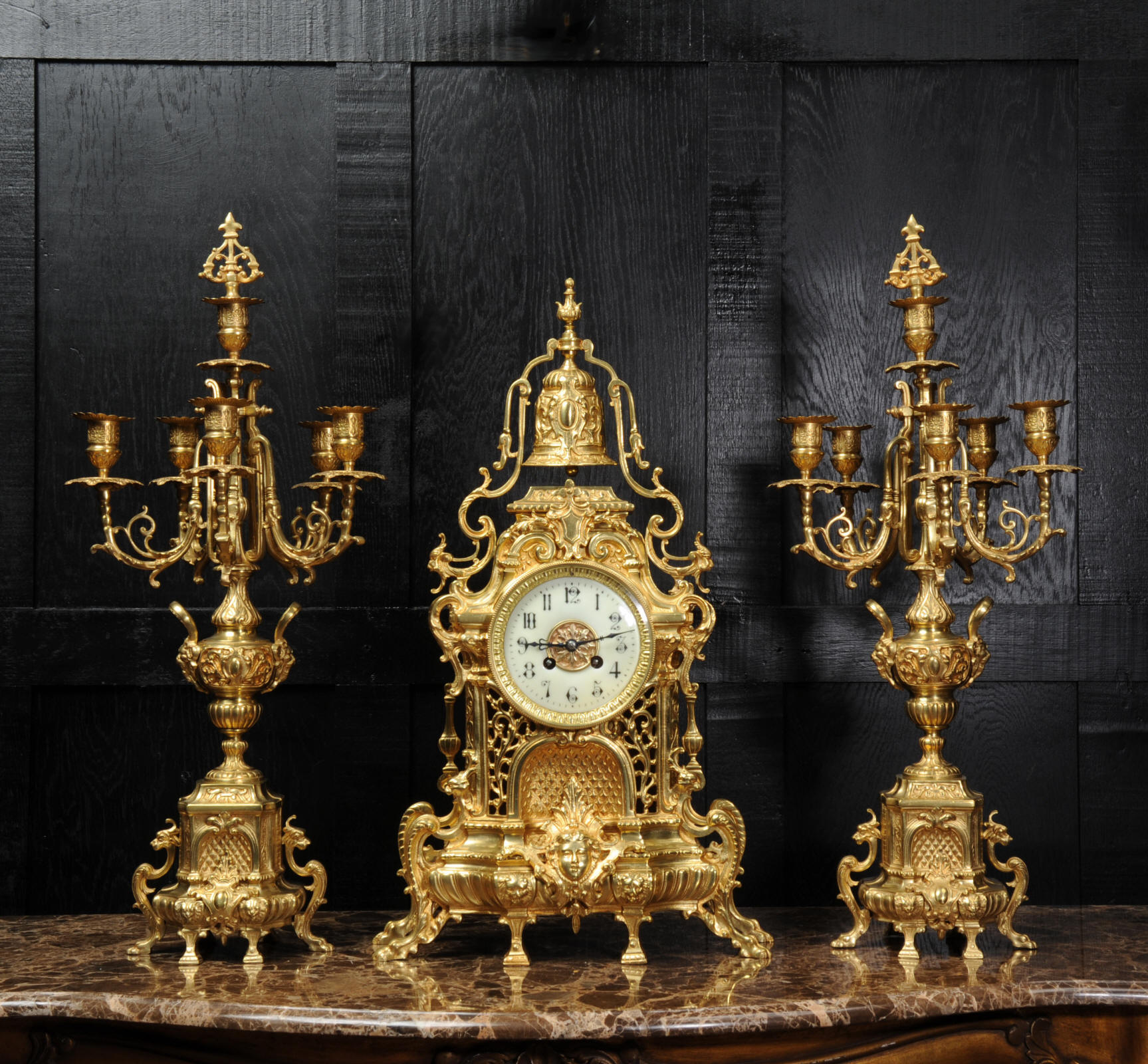Candelabra are conforming in style with 5 branches formed as foliage. The set has it's original snuffers which stow in the central nozzles when not in use. The dial is porcelain on copper with a bronze centre and it's original blued steel hands. The Antique French movement is by Japy Freres and is of of excellent quality. It runs for 8 days on one wind and strikes half-hourly on a bell. It has been fully restored in our workshop and is on excellent clean and running condition. The pendulum is a replacement. Click the video clip below to see and hear the movement working. Condition of the case is excellent, gilding is bright with a clean finish, there is some very minor wear and discolouration in places. The candelabra are slightly distorted and one nozzle has an old repair. The dial is also in good condition, there is a small crack near the left hand winding hole and some faint hairlines. The glass has a light scratch.