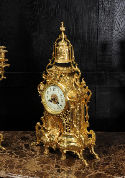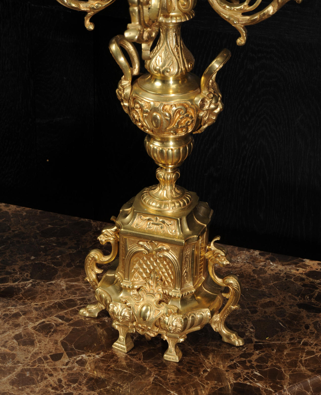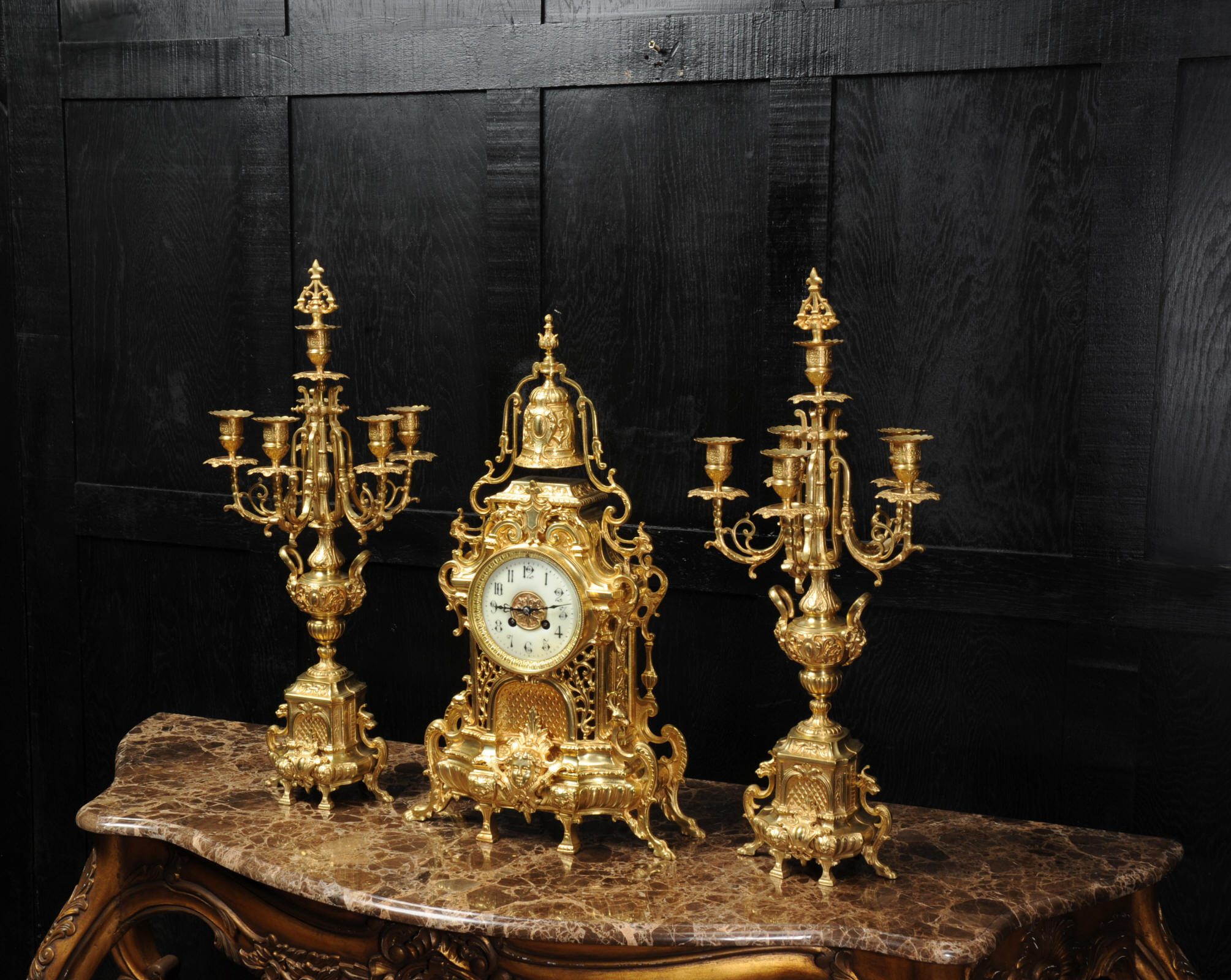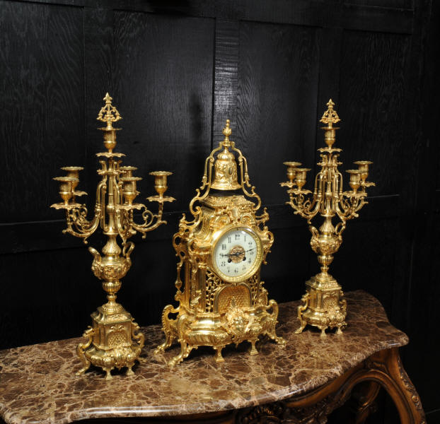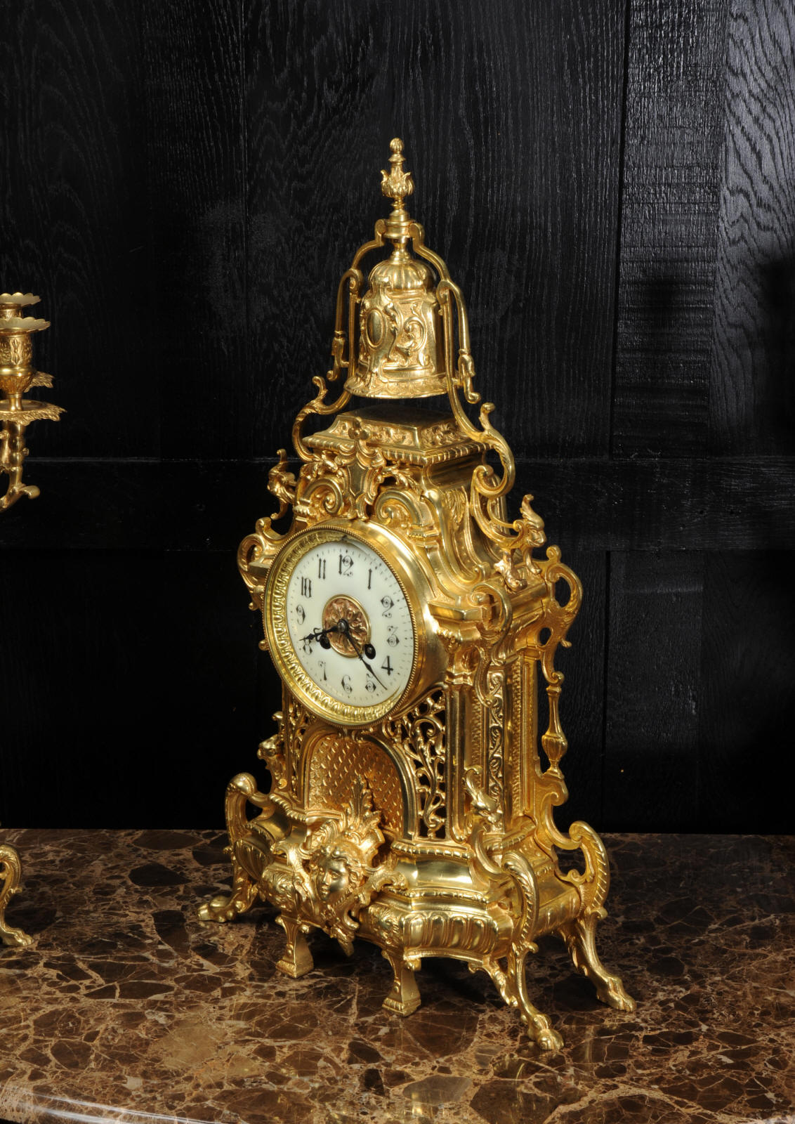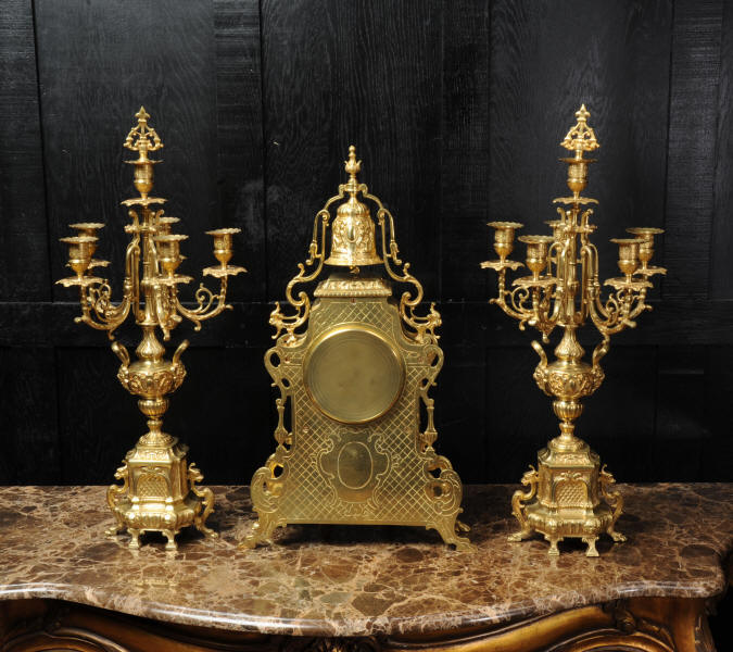 Candelabra are conforming in style with 5 branches formed as foliage. The set has it's original snuffers which stow in the central nozzles when not in use. The dial is porcelain on copper with a bronze centre and it's original blued steel hands. The Antique French movement is by Japy Freres and is of of excellent quality. It runs for 8 days on one wind and strikes half-hourly on a bell. It has been fully restored in our workshop and is on excellent clean and running condition. The pendulum is a replacement. Click the video clip below to see and hear the movement working. Condition of the case is excellent, gilding is bright with a clean finish, there is some very minor wear and discolouration in places. The candelabra are slightly distorted and one nozzle has an old repair. The dial is also in good condition, there is a small crack near the left hand winding hole and some faint hairlines. The glass has a light scratch.