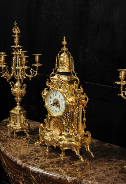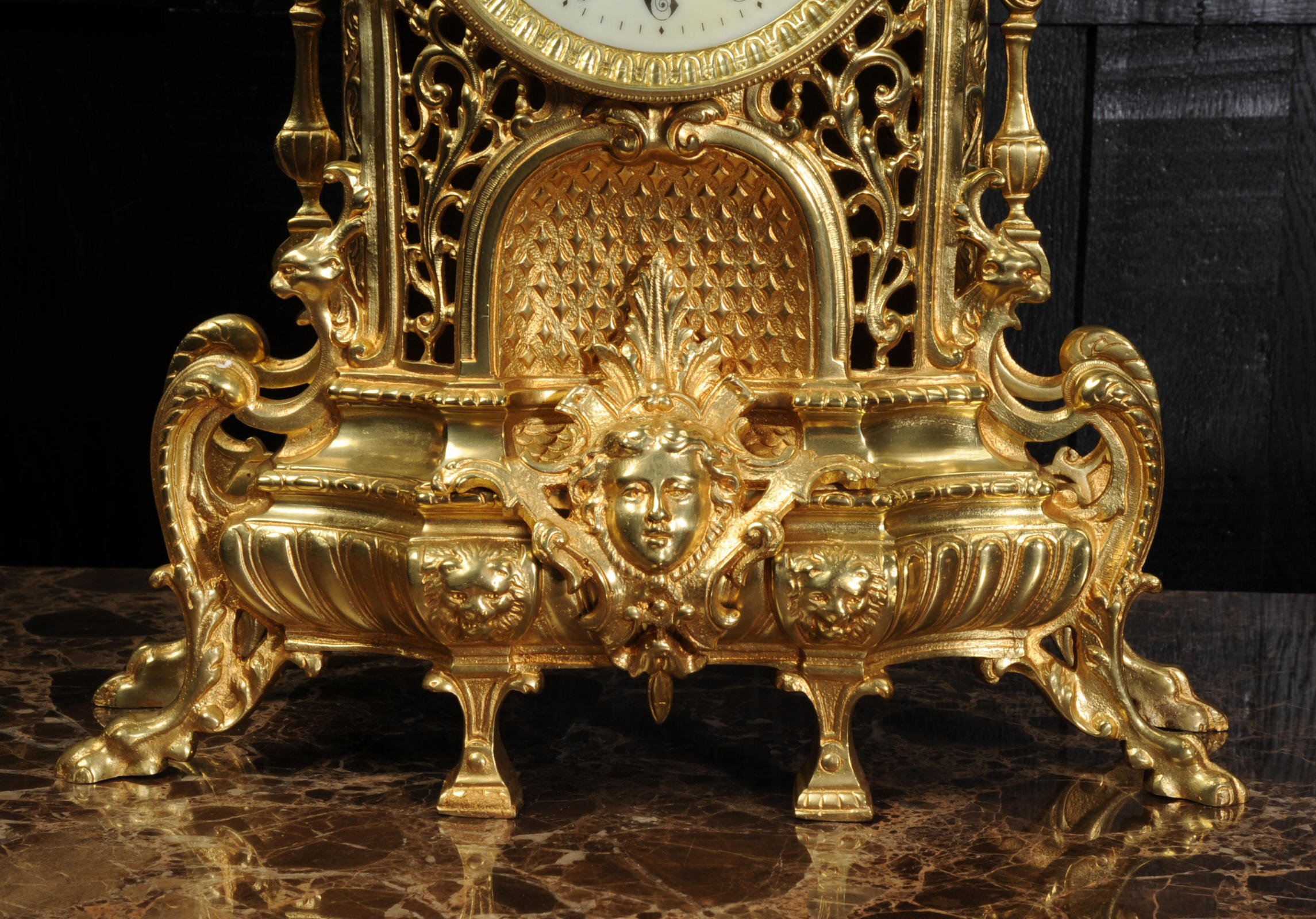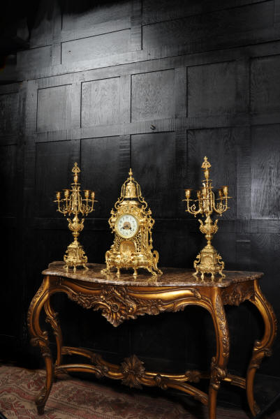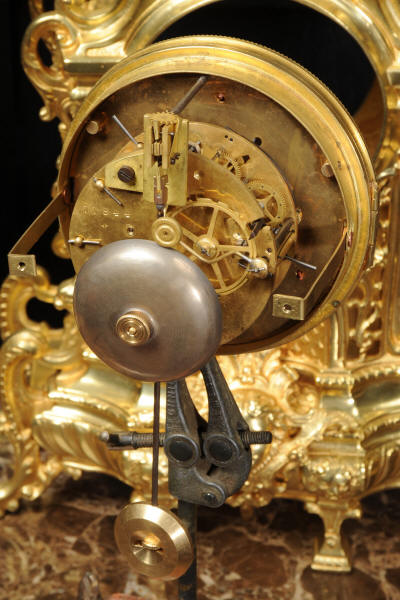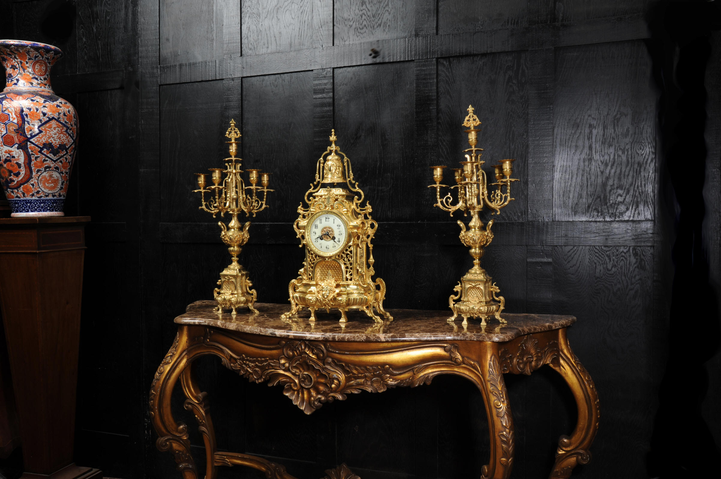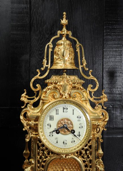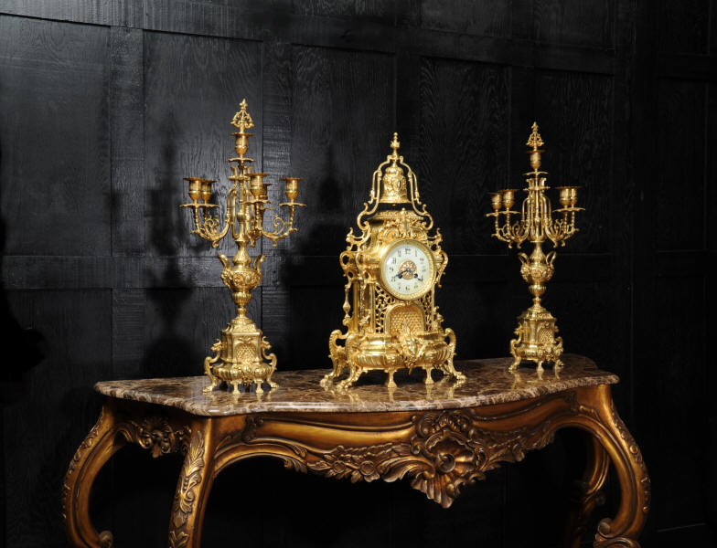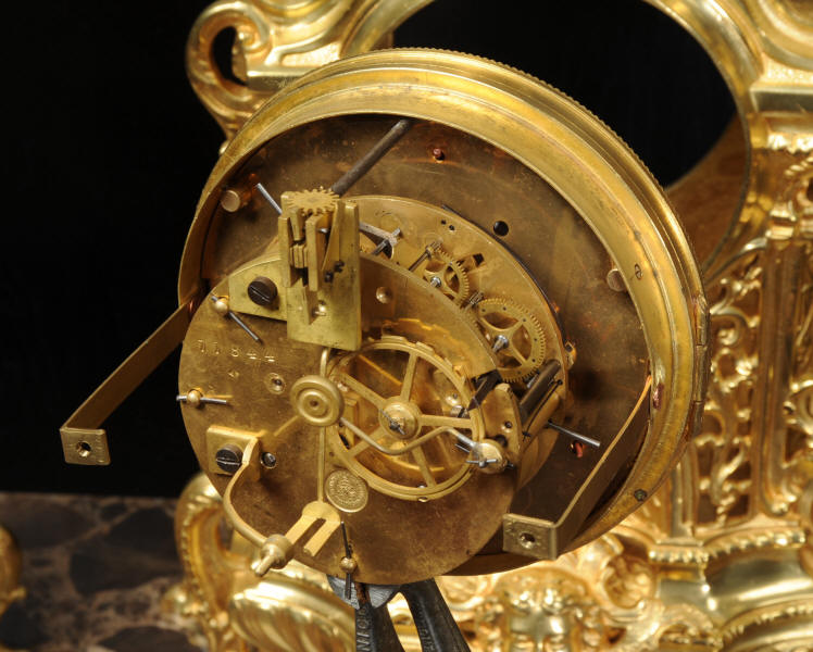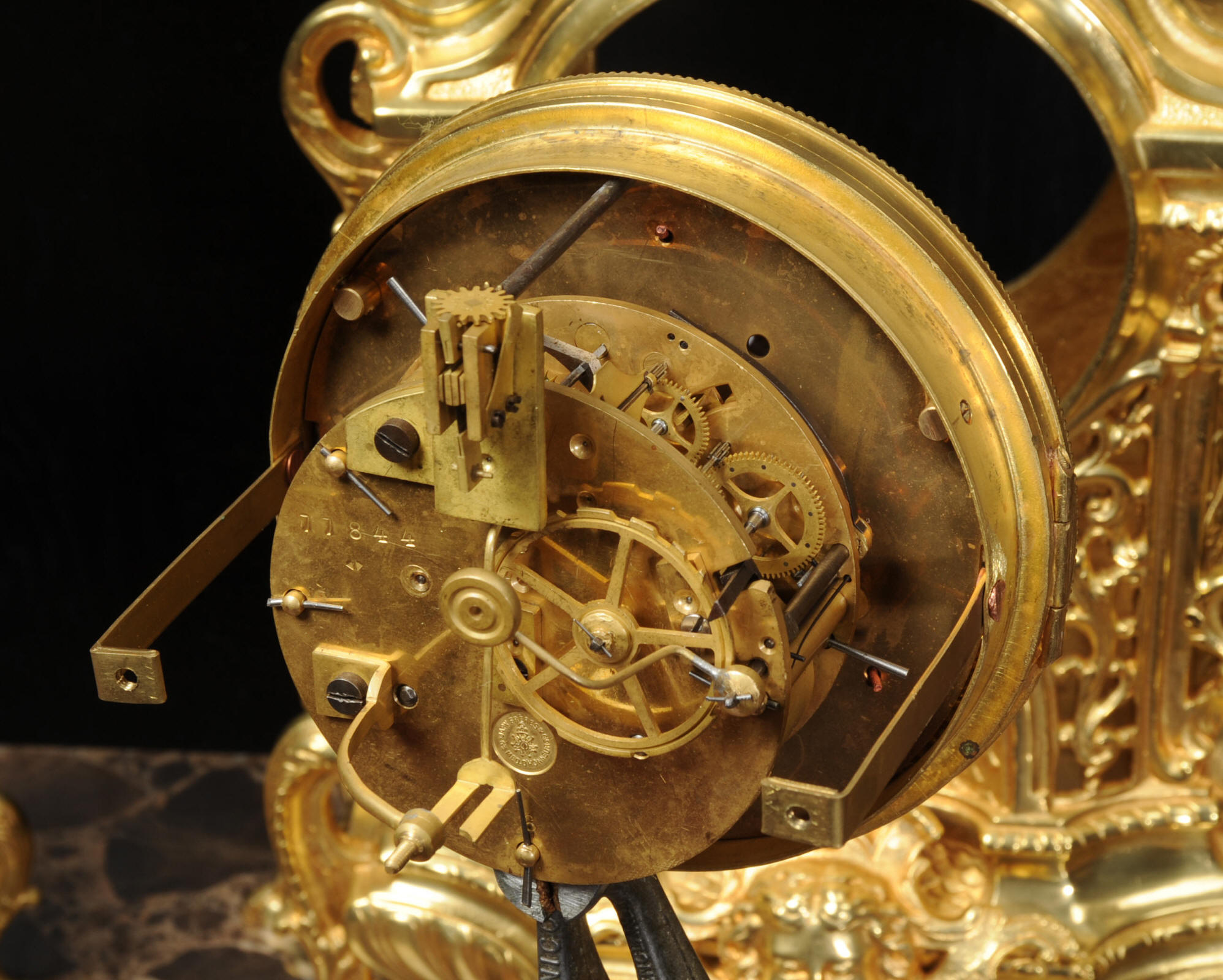 Candelabra are conforming in style with 5 branches formed as foliage. The set has it's original snuffers which stow in the central nozzles when not in use. The dial is porcelain on copper with a bronze centre and it's original blued steel hands. The Antique French movement is by Japy Freres and is of of excellent quality. It runs for 8 days on one wind and strikes half-hourly on a bell. It has been fully restored in our workshop and is on excellent clean and running condition. The pendulum is a replacement. Click the video clip below to see and hear the movement working. Condition of the case is excellent, gilding is bright with a clean finish, there is some very minor wear and discolouration in places. The candelabra are slightly distorted and one nozzle has an old repair. The dial is also in good condition, there is a small crack near the left hand winding hole and some faint hairlines. The glass has a light scratch.