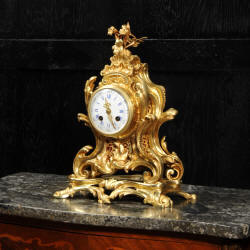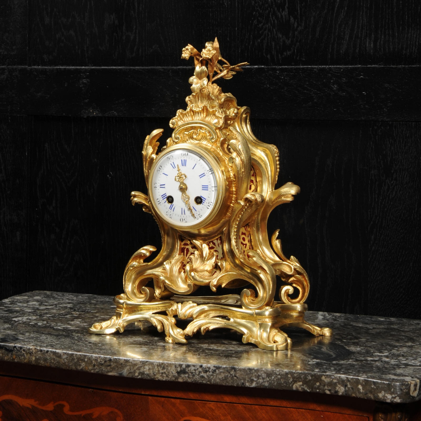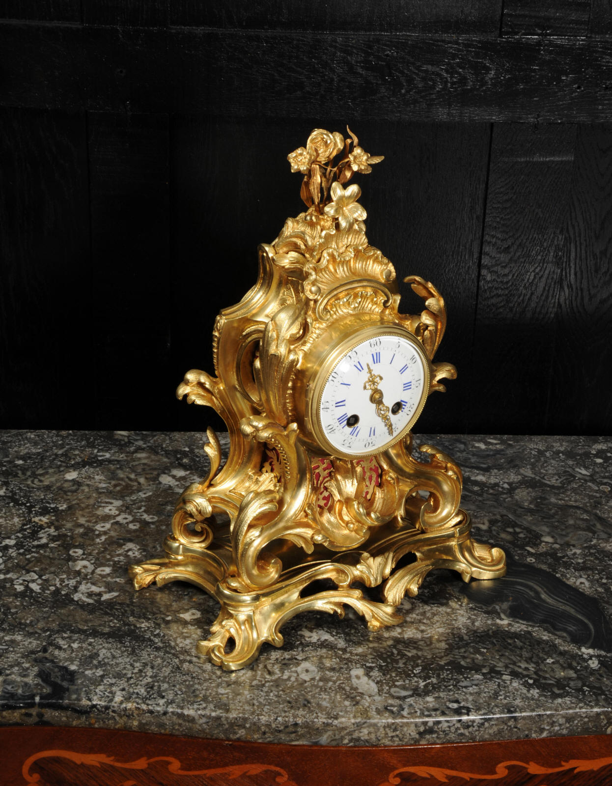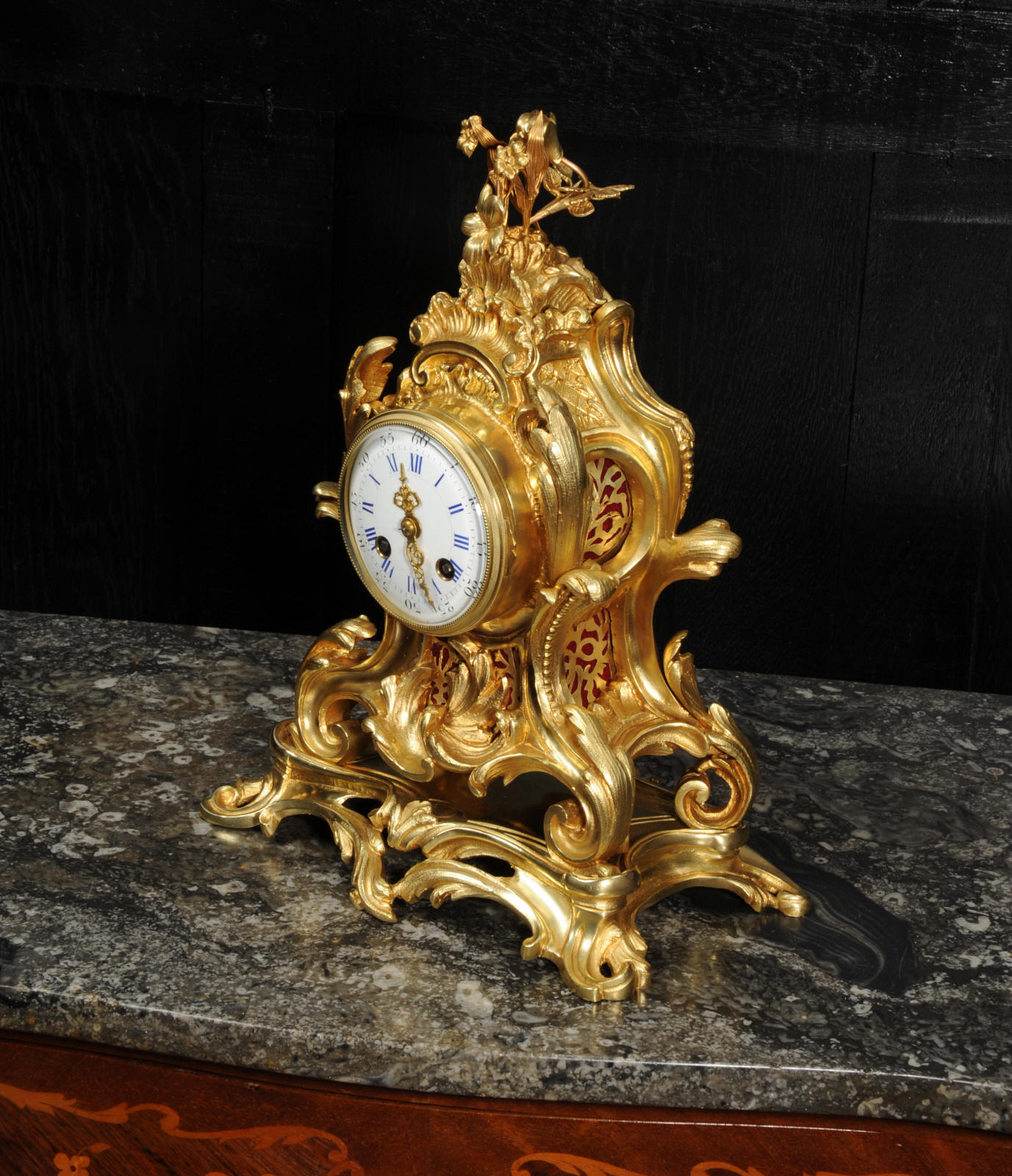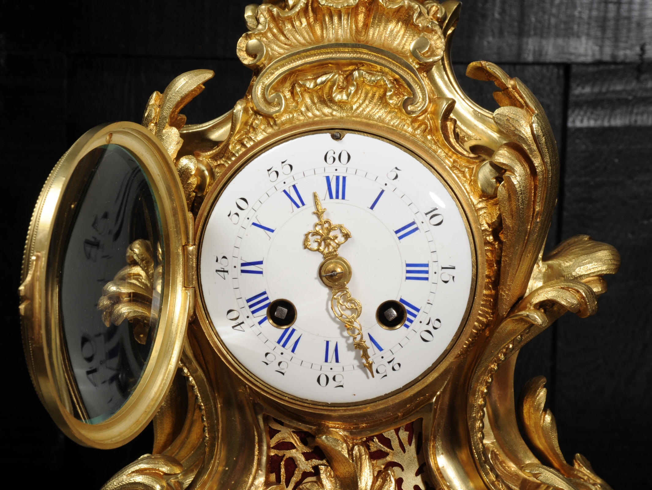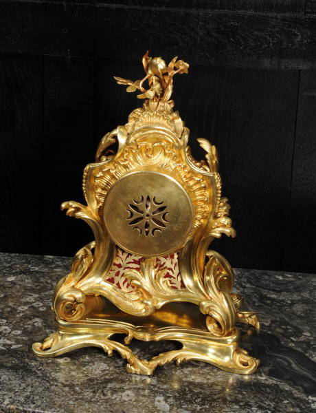 Panels backed with red fabric lighten the design to each side. The dial is porcelain enamel on copper with finely fretted gilt brass hands. The French movement is of high quality and is by A. D. Mougin. It is in excellent clean and running condition having been fully overhauled by our clockmaker. Pendulum is a replacement. It runs for 8 days and strikes the hours and halves on a bell. Click the video clip below to hear the bell and watch the clock running! Condition of the case is excellent, the original gilding is beautifully clean and bright with hardly any wear or discolouration. The dial is also in excellent condition with no damage. We have replaced the red fabric with fresh.