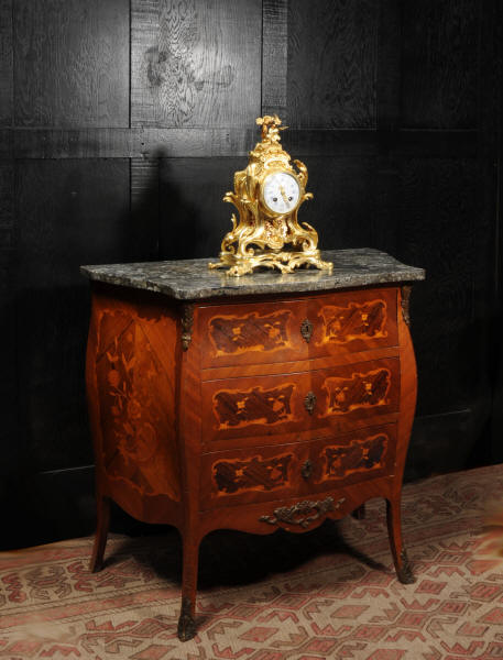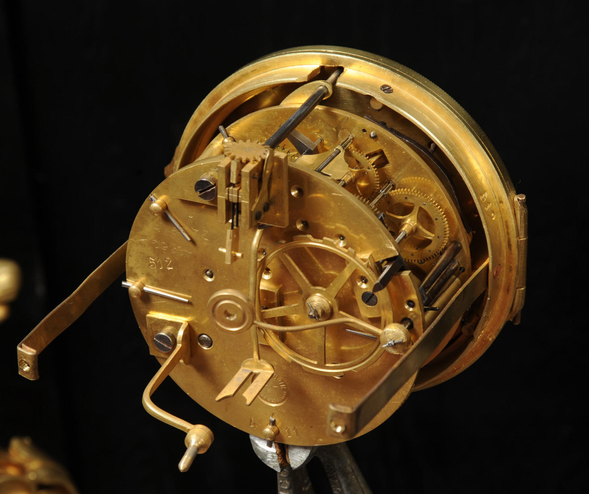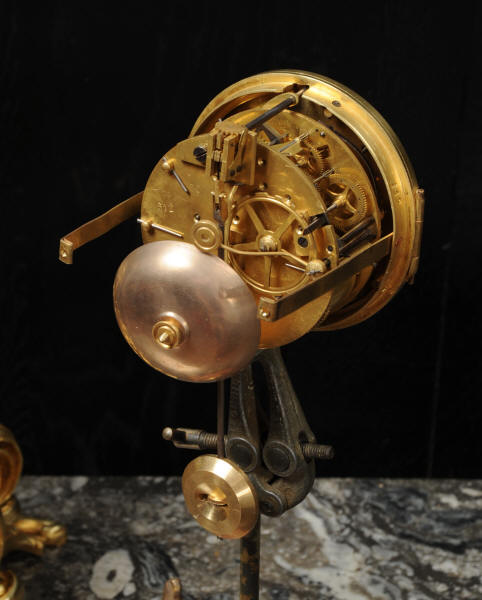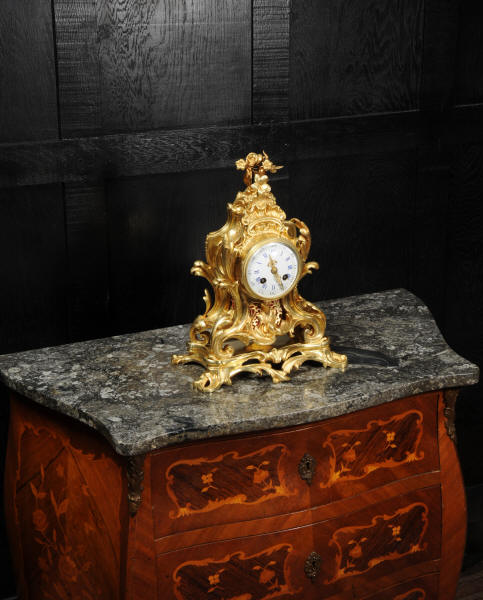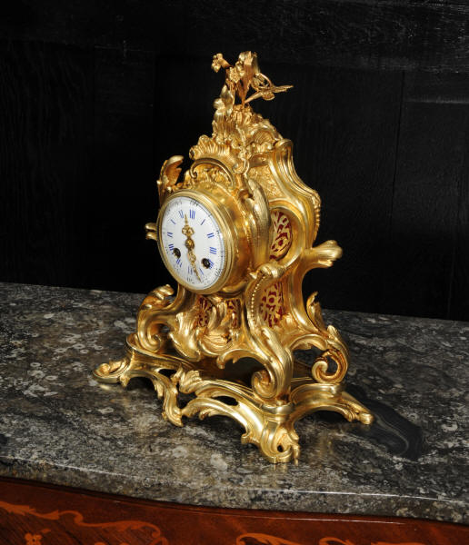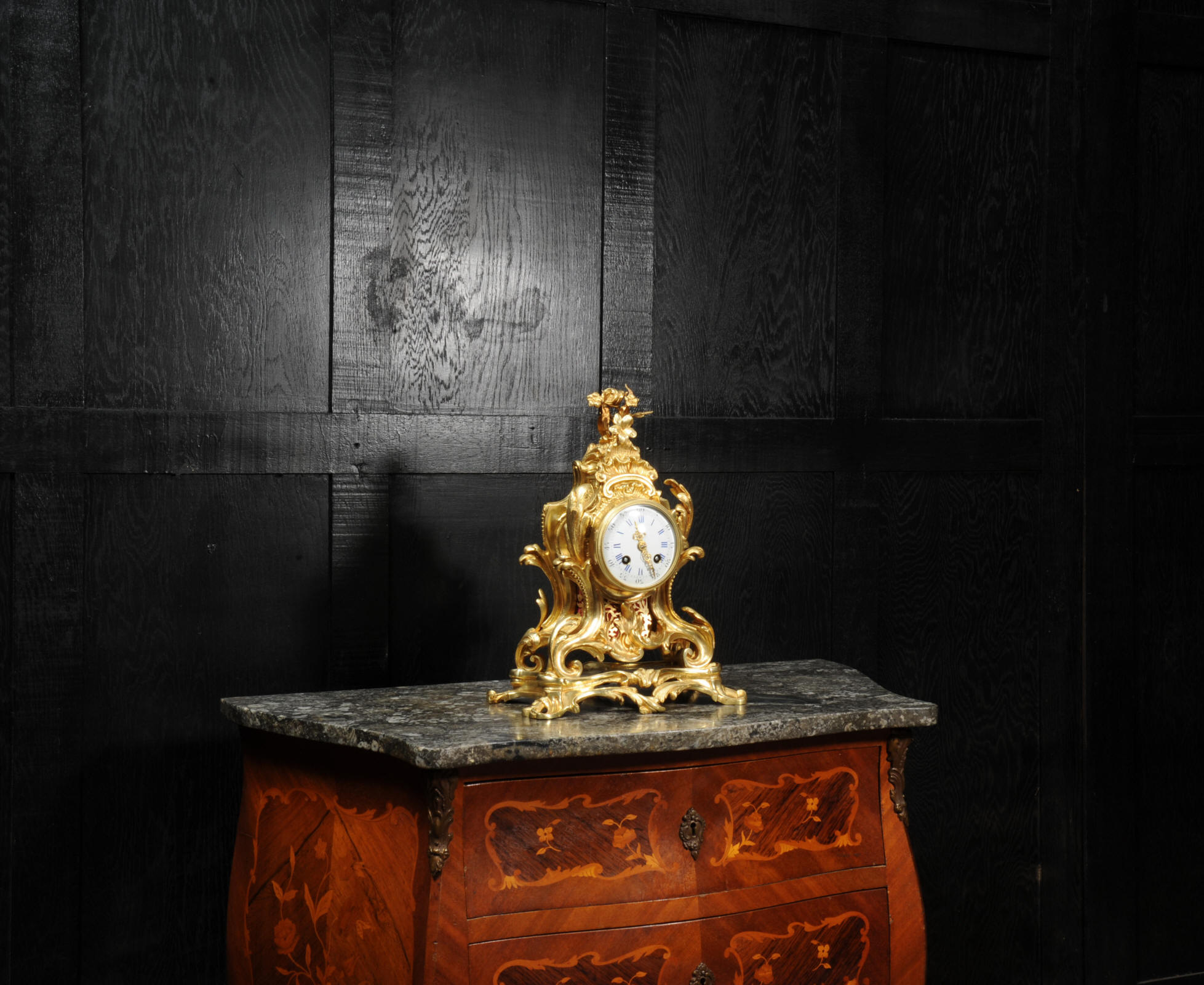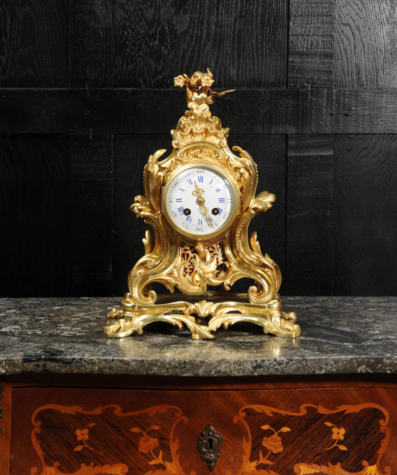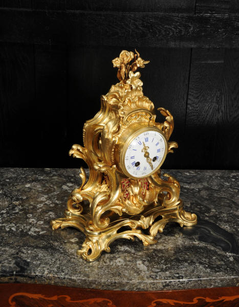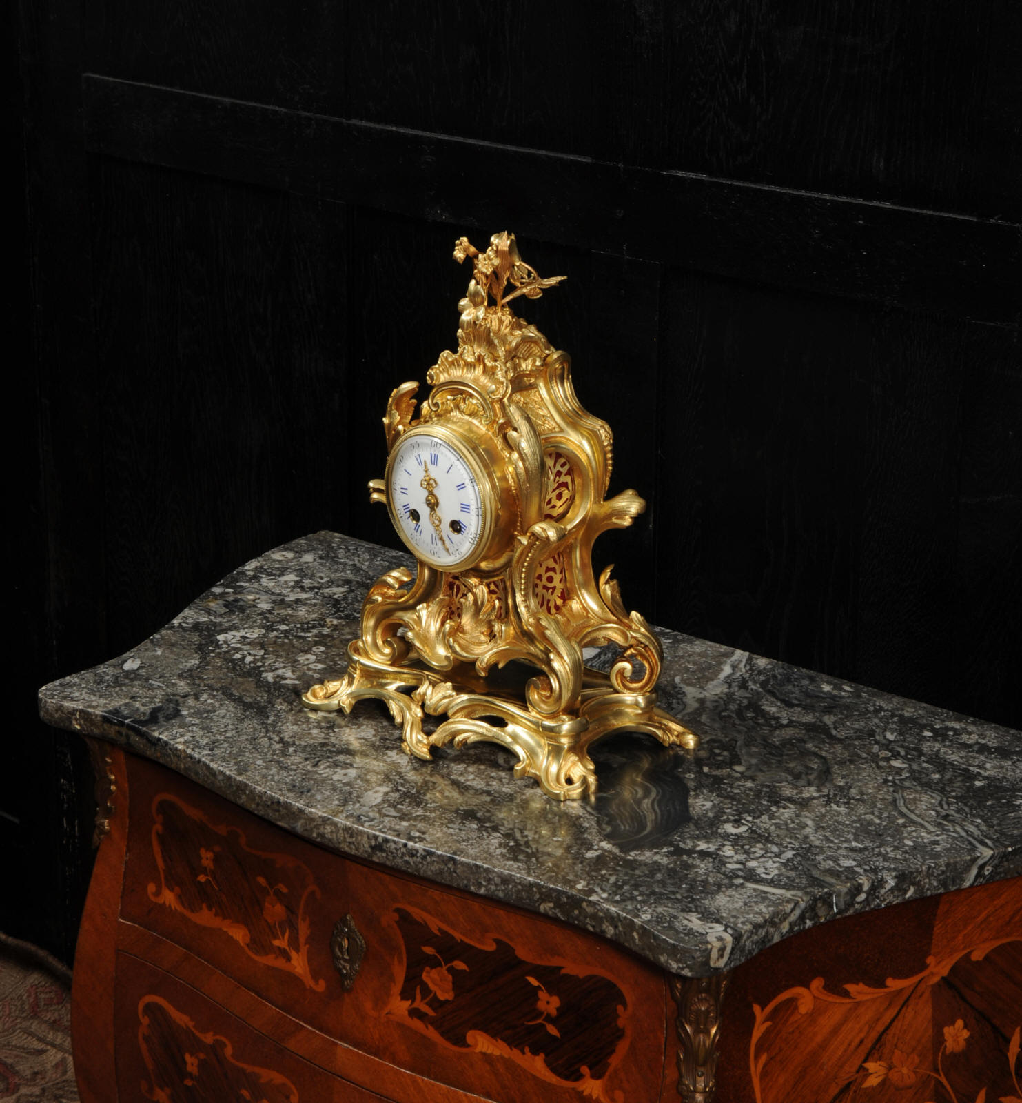 Panels backed with red fabric lighten the design to each side. The dial is porcelain enamel on copper with finely fretted gilt brass hands. The French movement is of high quality and is by A. D. Mougin. It is in excellent clean and running condition having been fully overhauled by our clockmaker. Pendulum is a replacement. It runs for 8 days and strikes the hours and halves on a bell. Click the video clip below to hear the bell and watch the clock running! Condition of the case is excellent, the original gilding is beautifully clean and bright with hardly any wear or discolouration. The dial is also in excellent condition with no damage. We have replaced the red fabric with fresh.