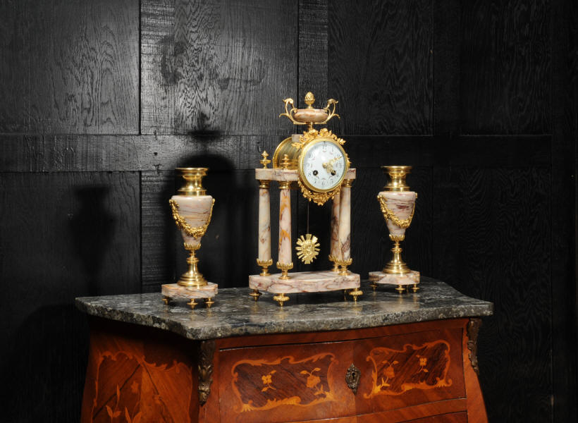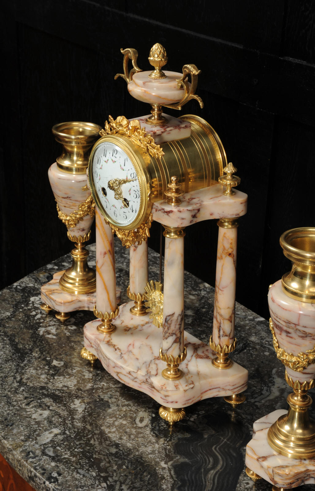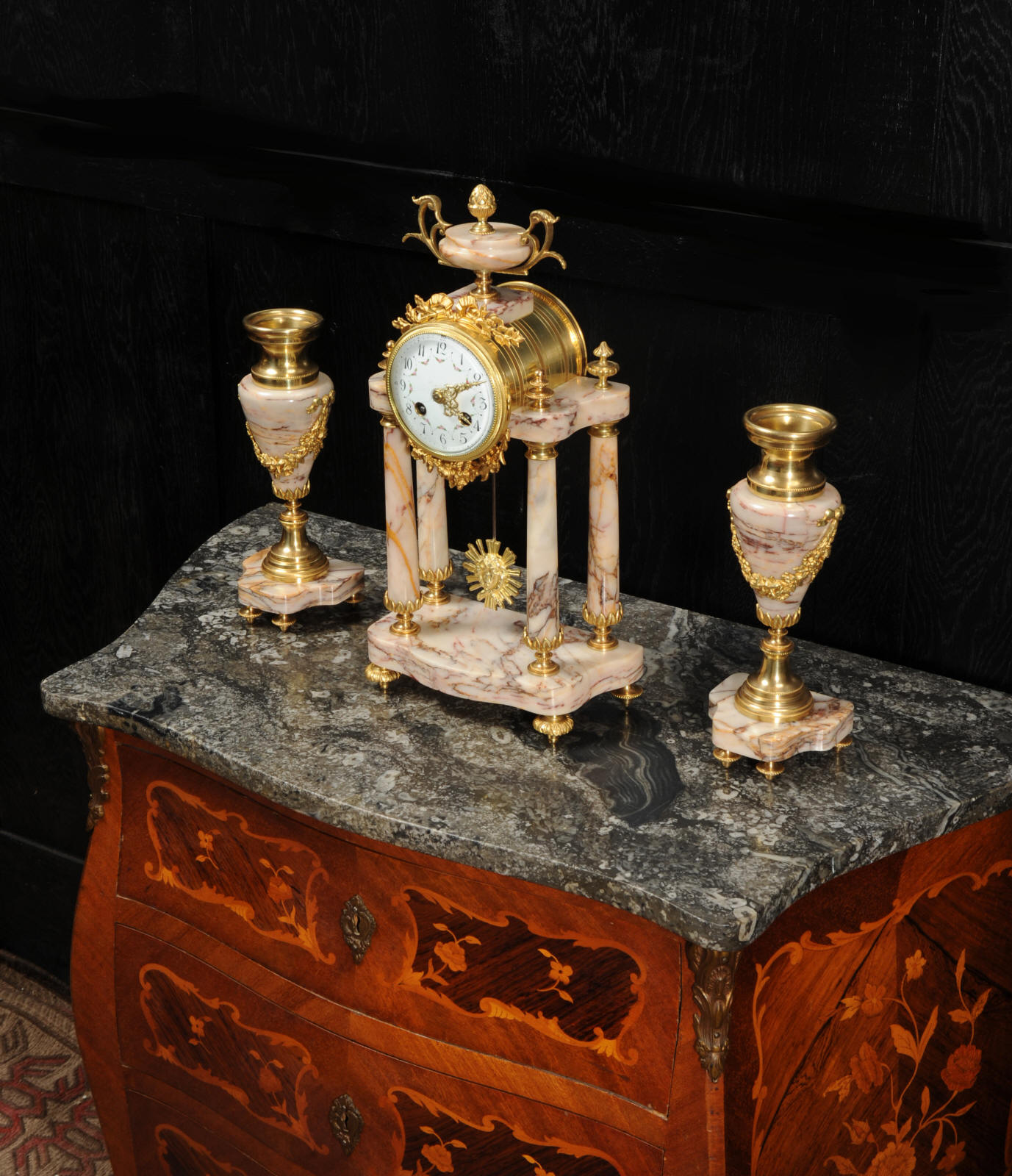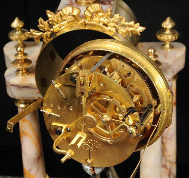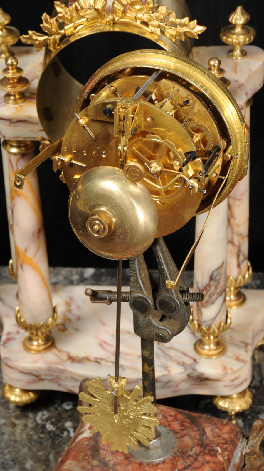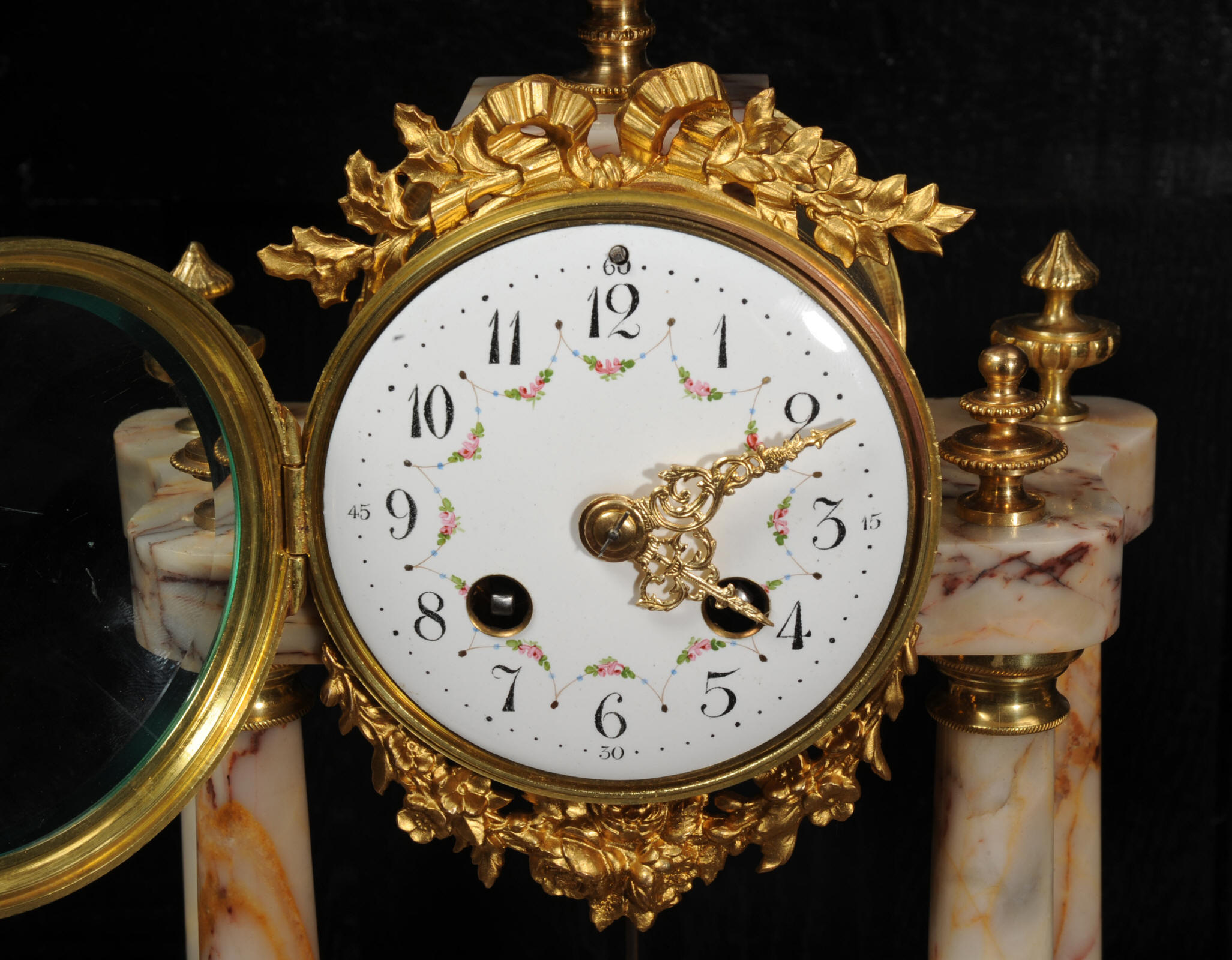 The dial is prettily painted with floral swags between the numbers on porcelain enamel. It is complete with it's original finely fretted gilt brass hands and convex glass. The rear door is also glazed to allow the movement to be seen. The French movement is of high quality and is in excellent clean and running condition having been fully overhauled by our clockmaker. Ormolu sunburst pendulum is original. It runs for 8 days and strikes the hours and halves on a bell. Click the video clip below to hear the bell and watch the clock running! Condition of the ormolu is excellent, beautifully clean and bright some discolouration and wear. The dial is also in excellent condition with no damaged. Marble has some and nibbles to the edges and the rear right hand column has an old repair.