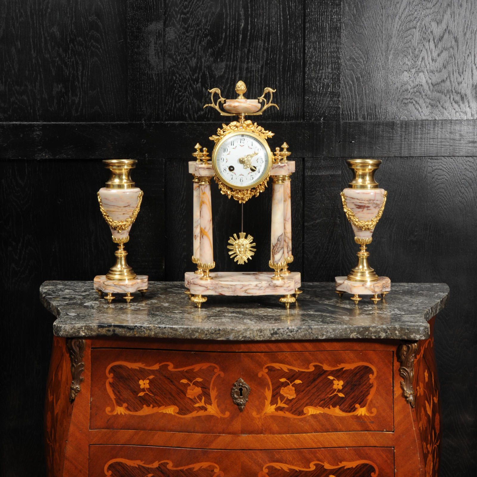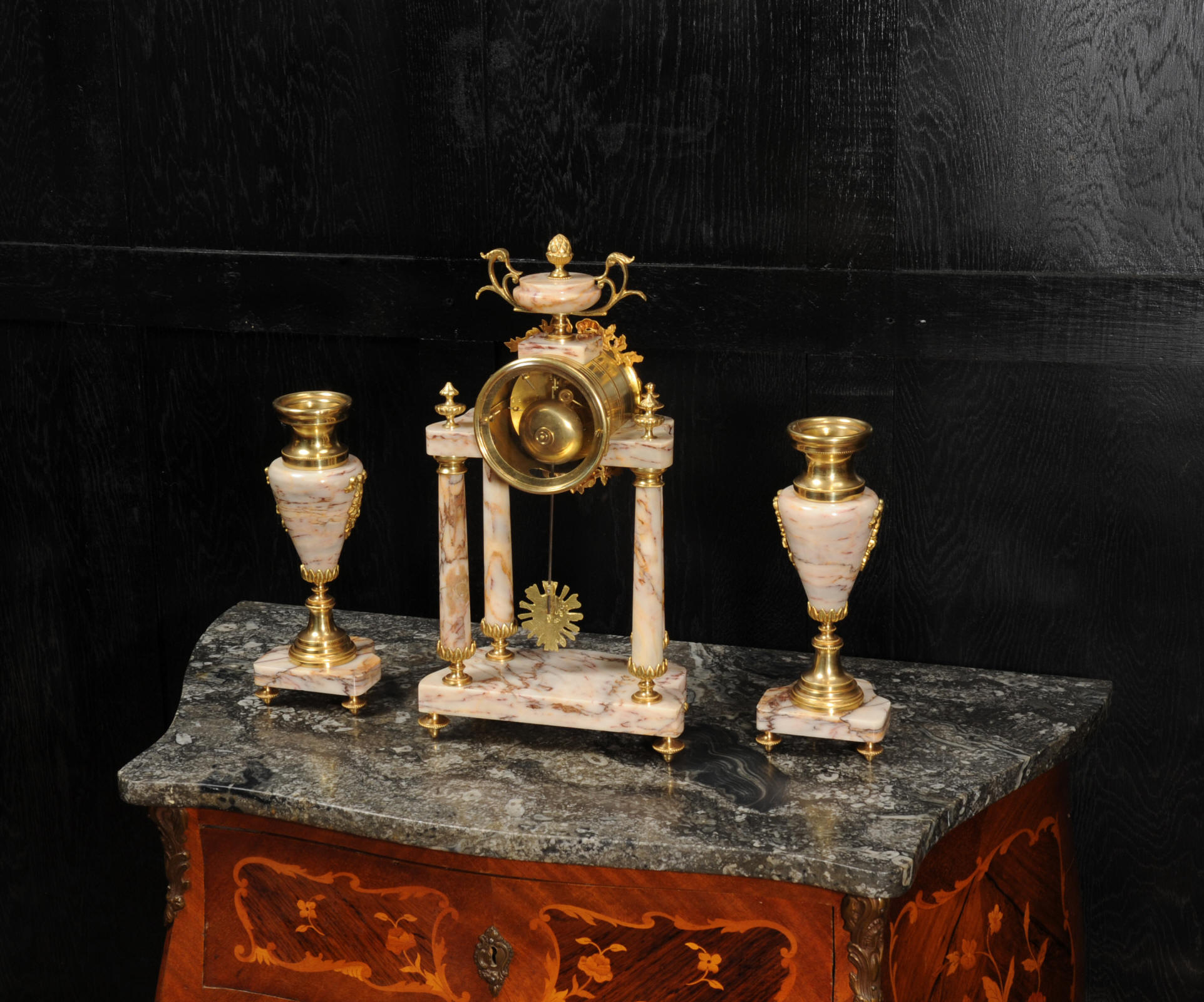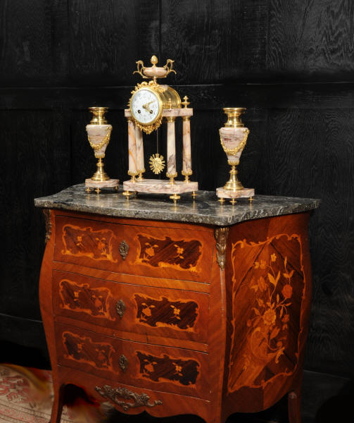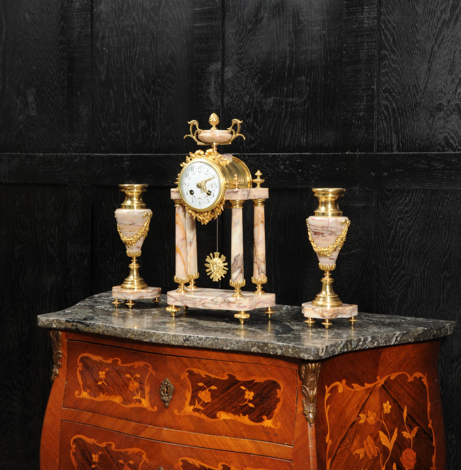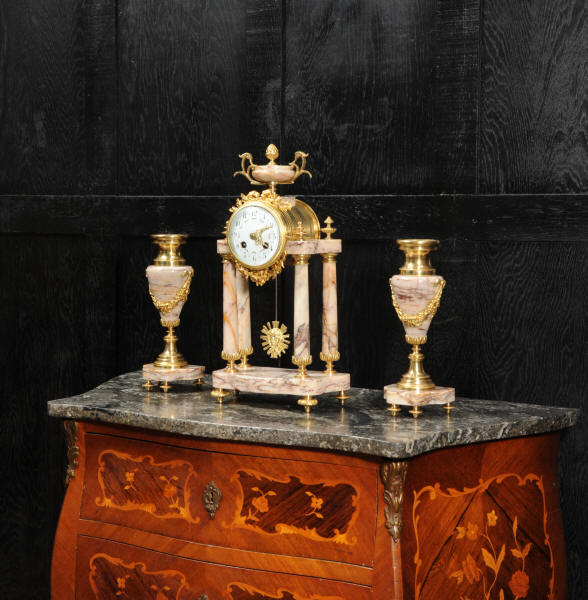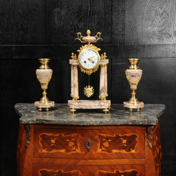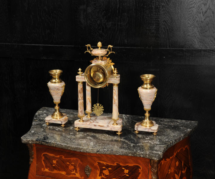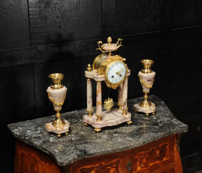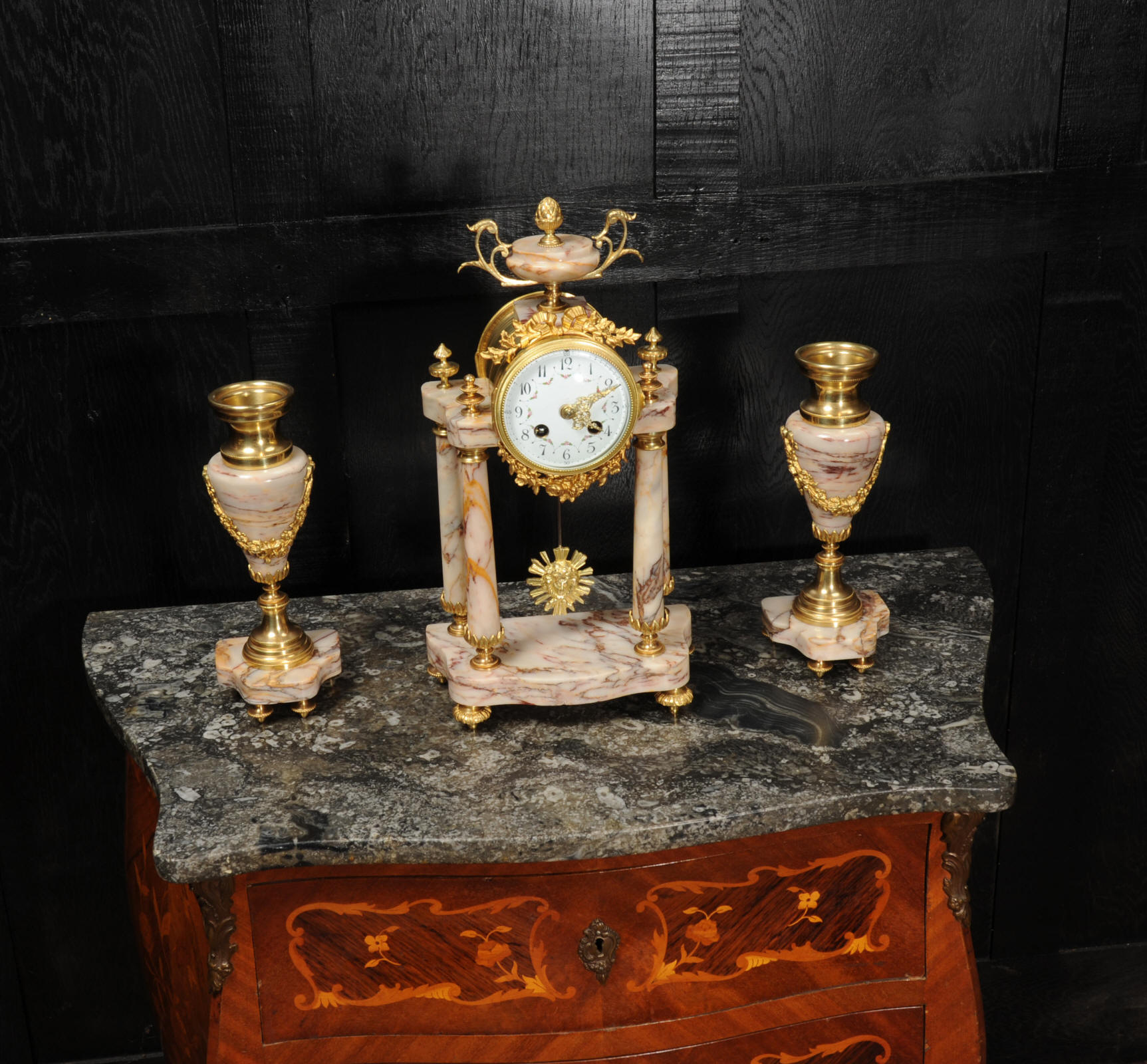 The dial is prettily painted with floral swags between the numbers on porcelain enamel. It is complete with it's original finely fretted gilt brass hands and convex glass. The rear door is also glazed to allow the movement to be seen. The French movement is of high quality and is in excellent clean and running condition having been fully overhauled by our clockmaker. Ormolu sunburst pendulum is original. It runs for 8 days and strikes the hours and halves on a bell. Click the video clip below to hear the bell and watch the clock running! Condition of the ormolu is excellent, beautifully clean and bright some discolouration and wear. The dial is also in excellent condition with no damaged. Marble has some and nibbles to the edges and the rear right hand column has an old repair.